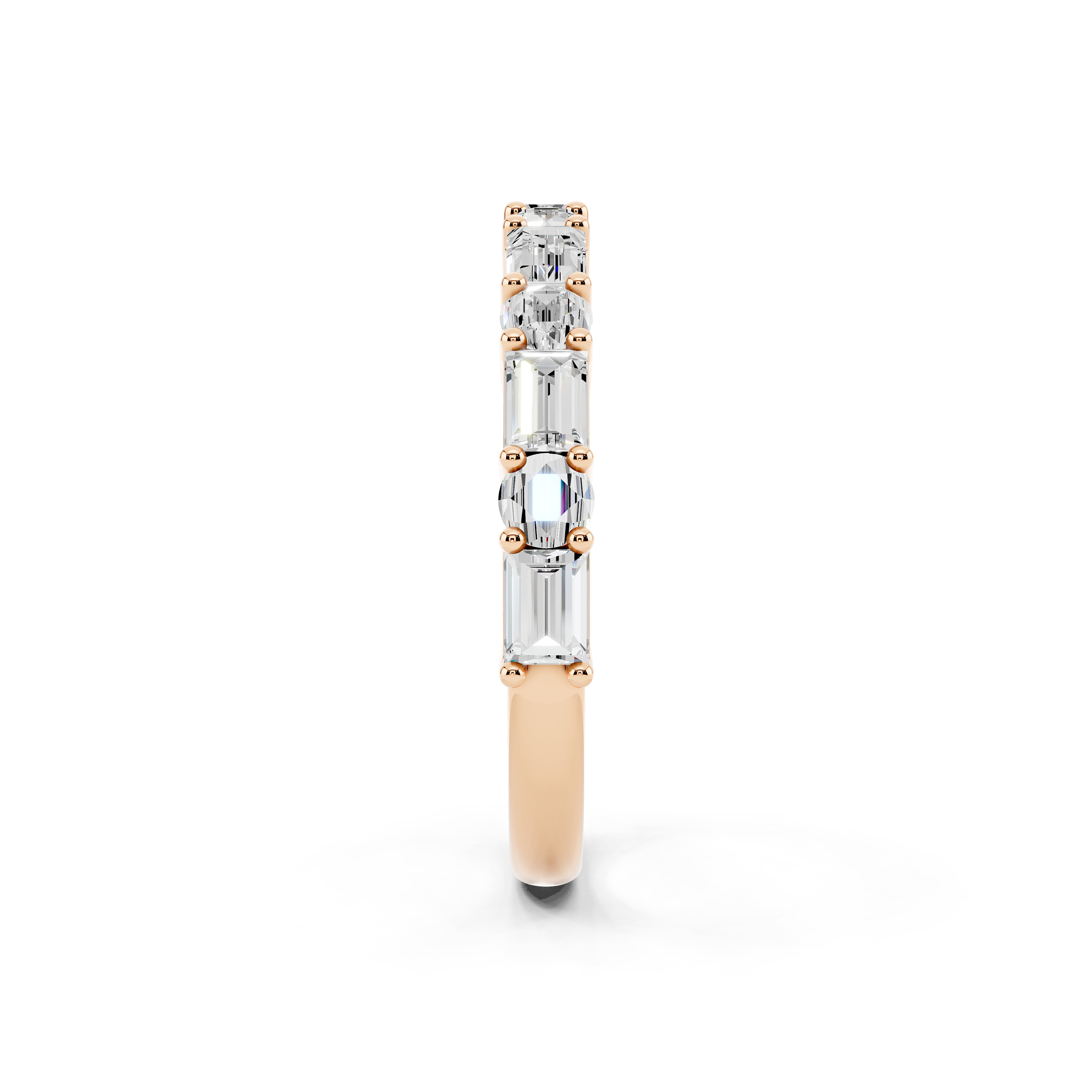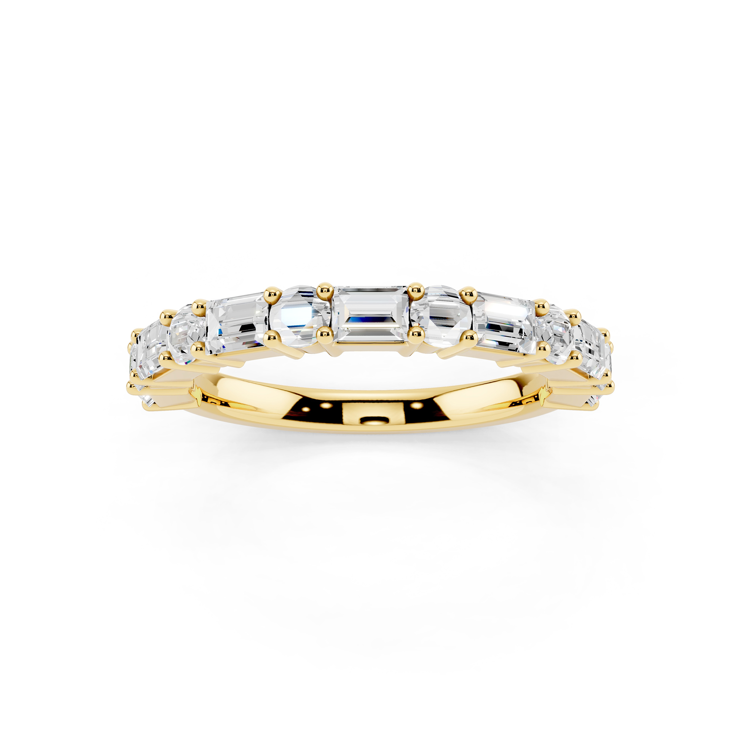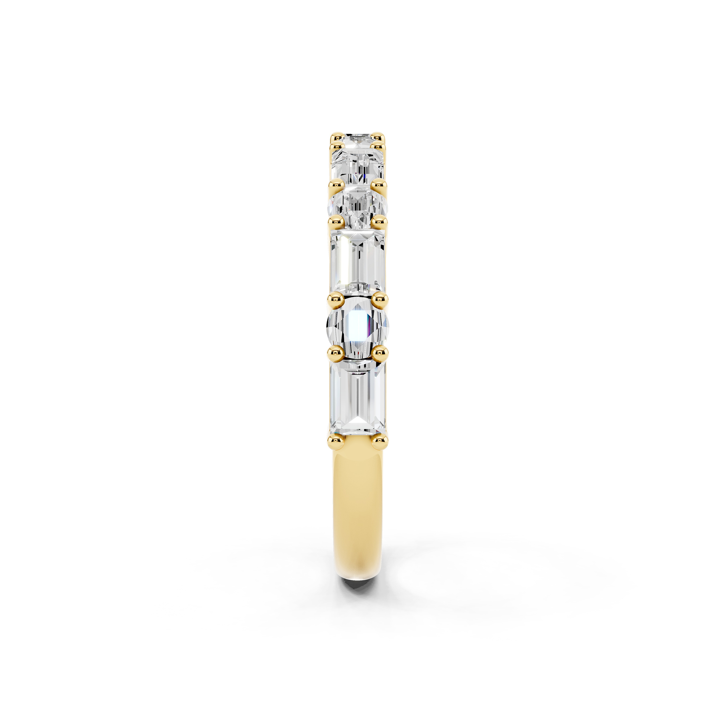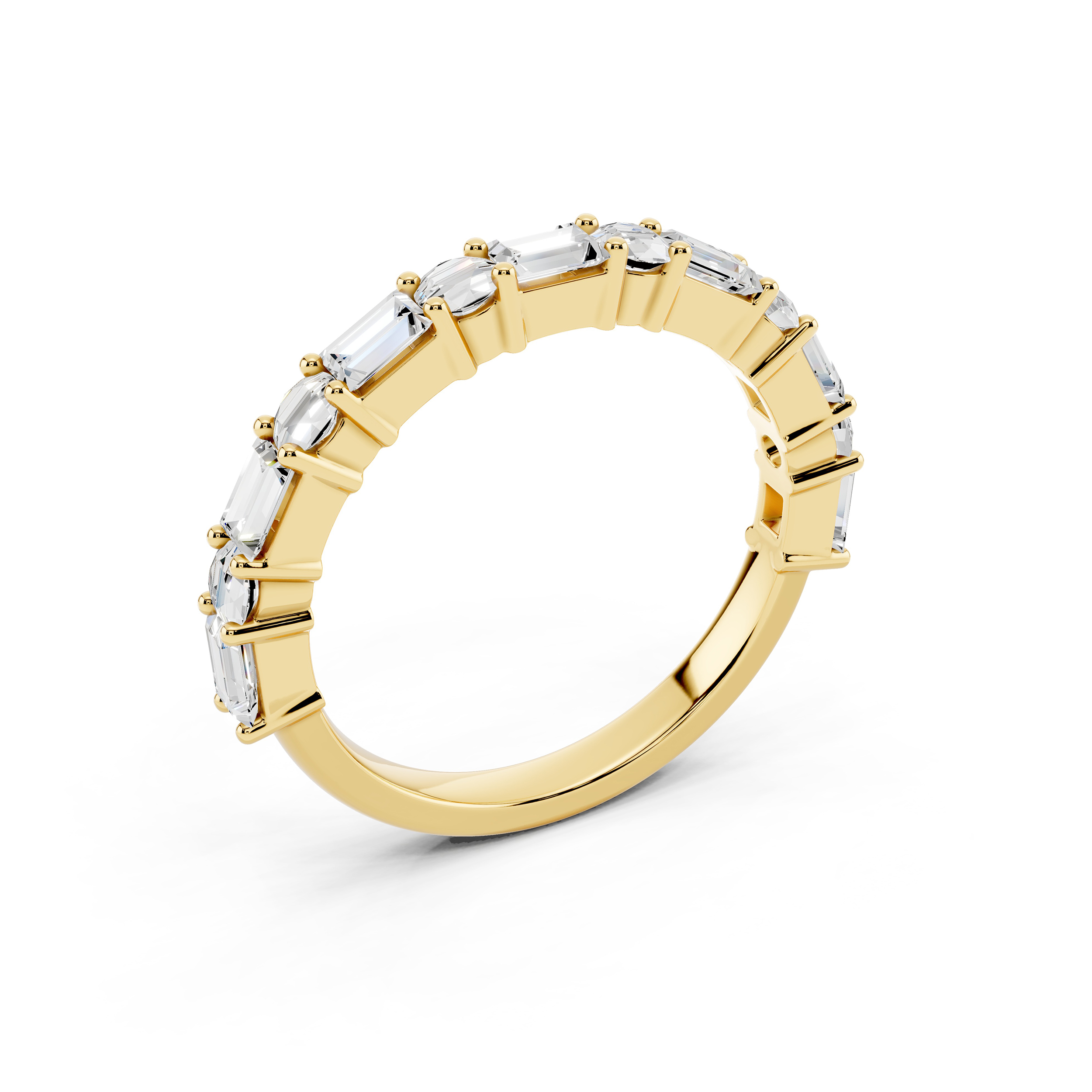 A graceful band featuring a series of vertically-set emerald-cut stones that exude quiet sophistication. Each stone is meticulously aligned for a sleek, modern look, offering a perfect blend of structure and sparkle. Ideal for stacking or standing alone as a refined statement.