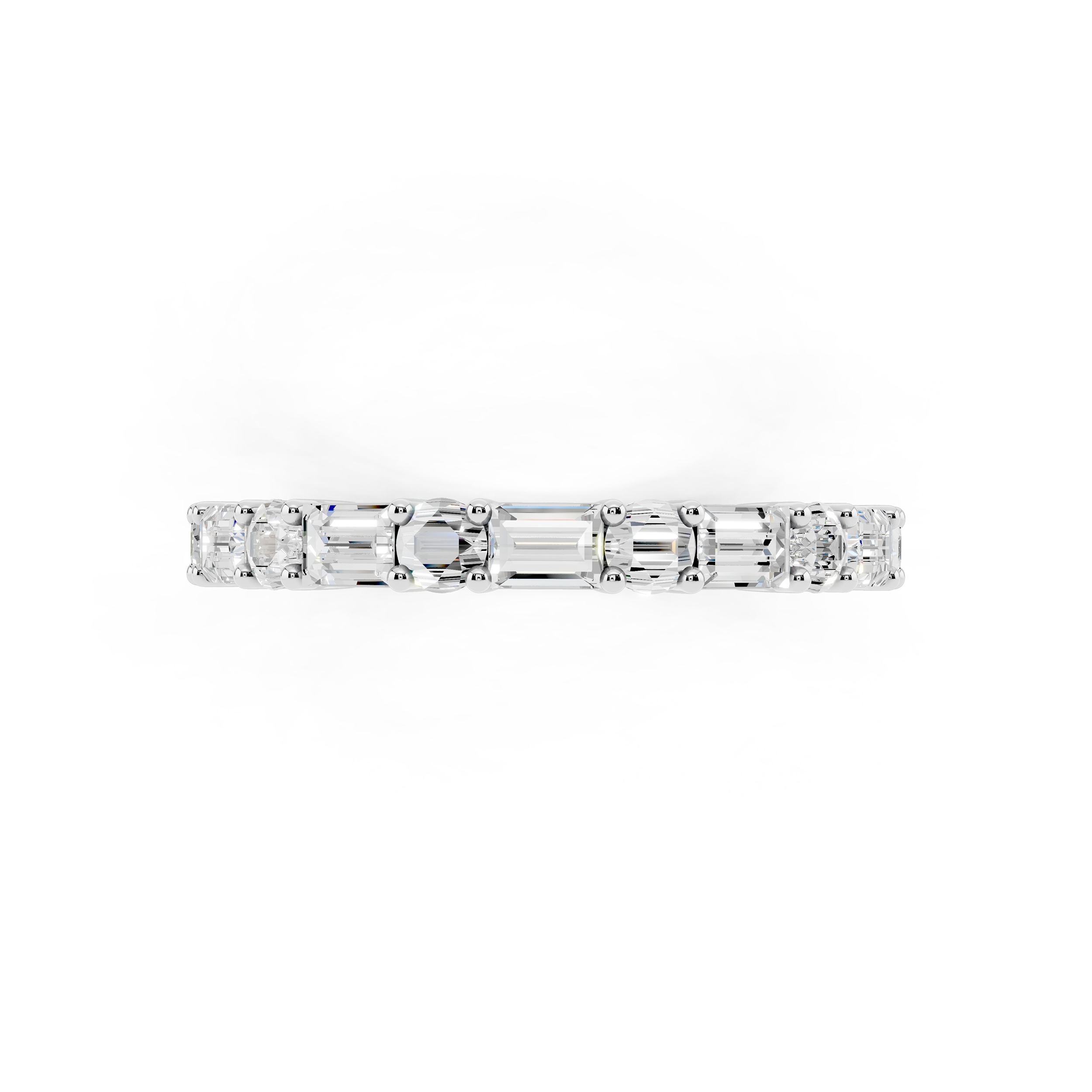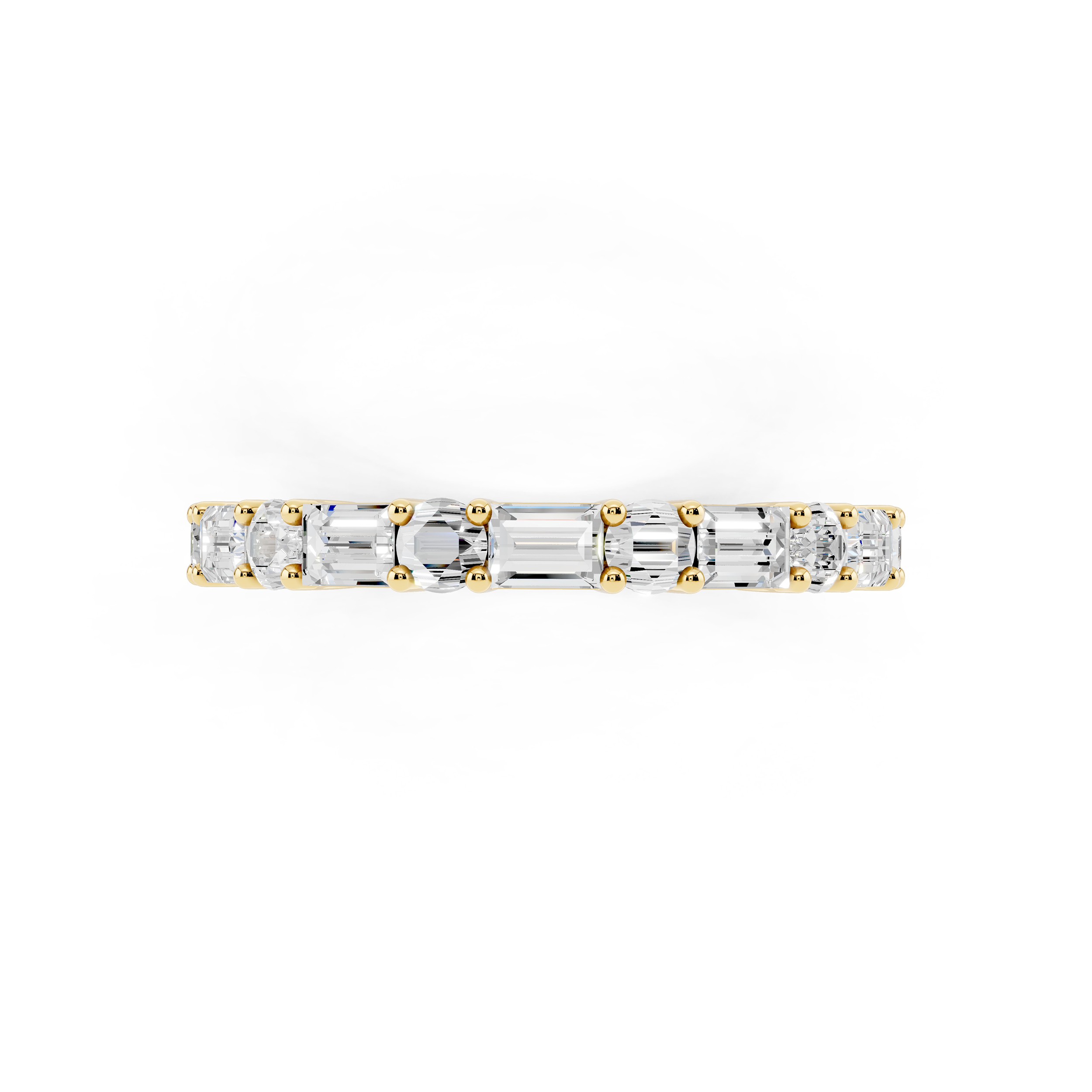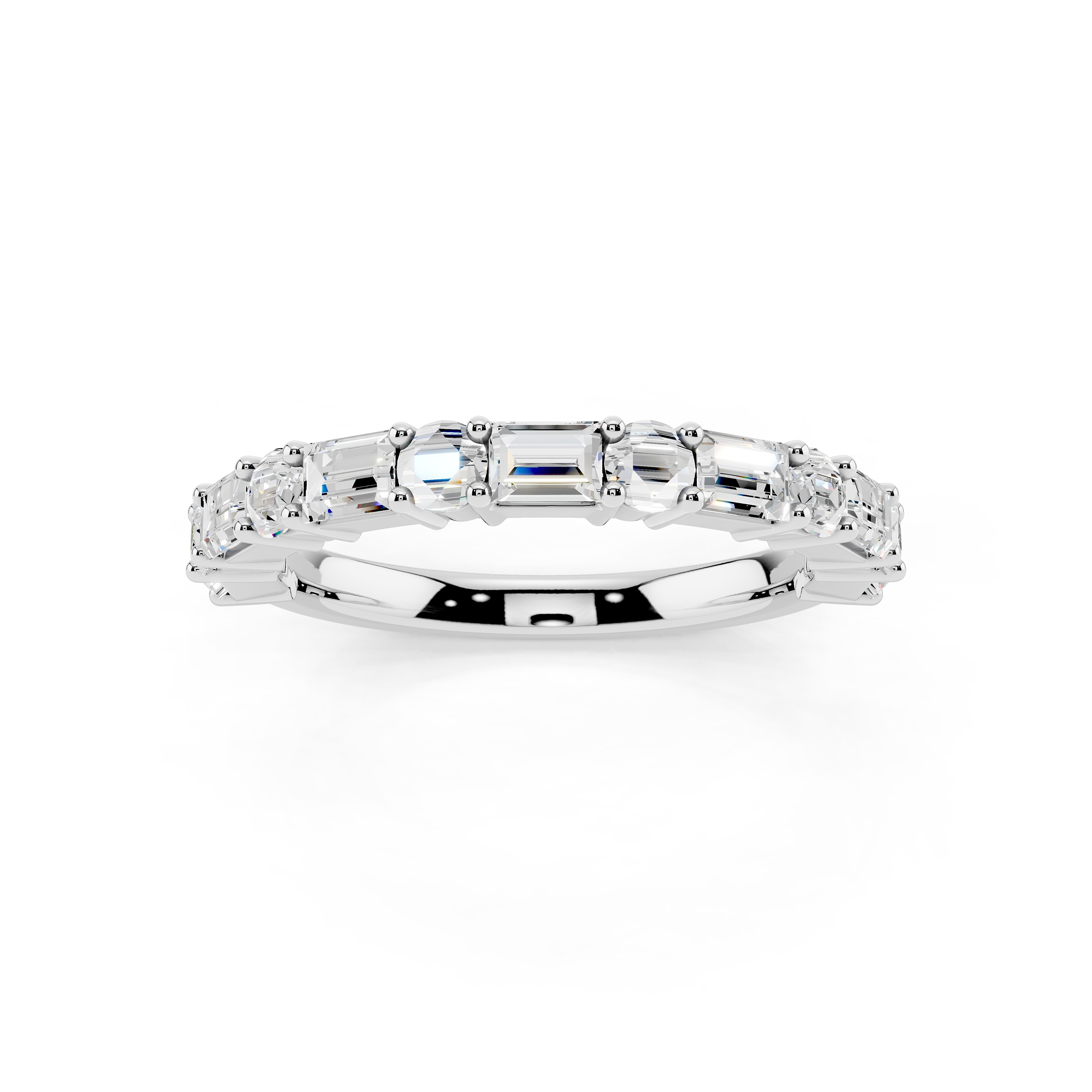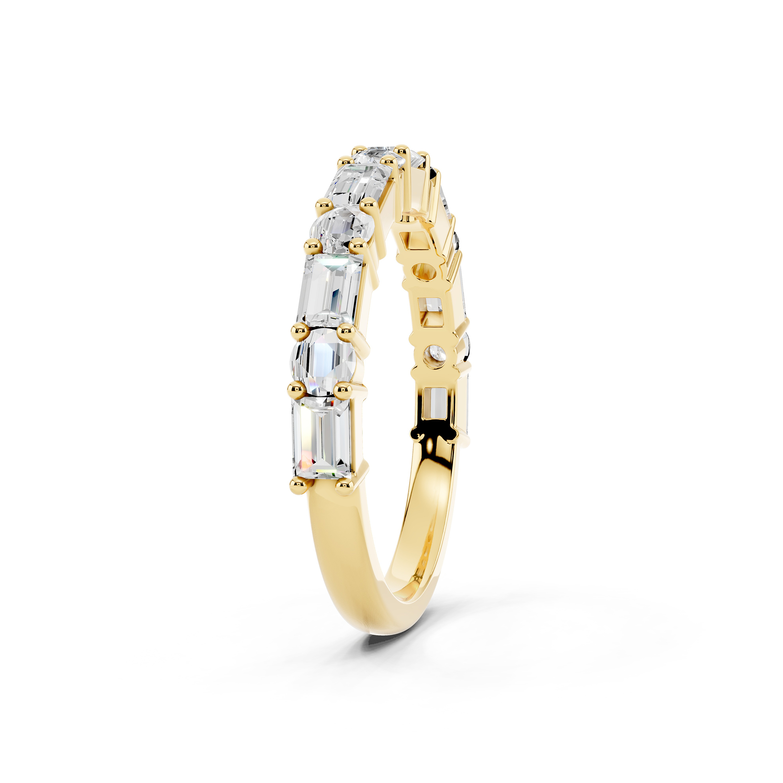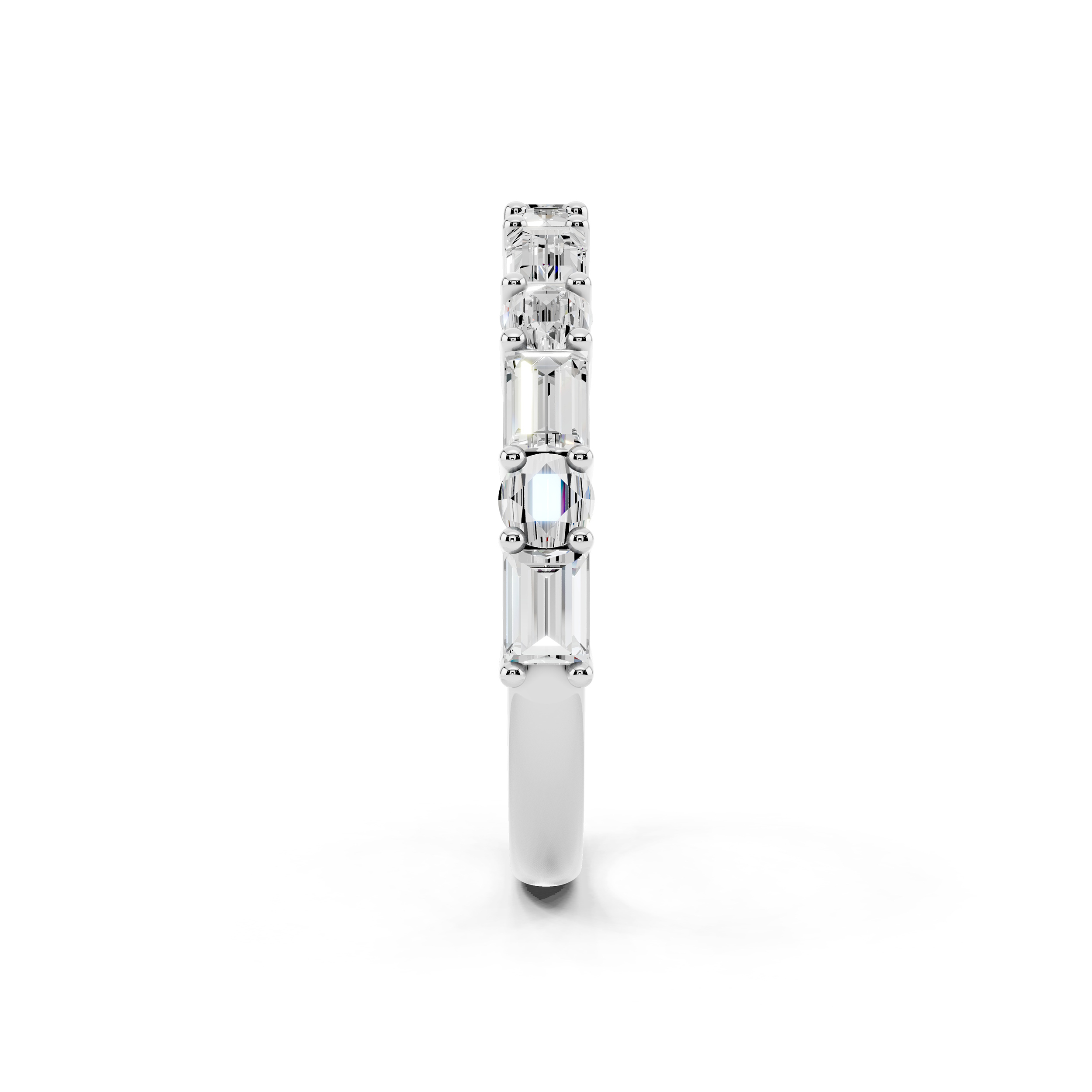 A graceful band featuring a series of vertically-set emerald-cut stones that exude quiet sophistication. Each stone is meticulously aligned for a sleek, modern look, offering a perfect blend of structure and sparkle. Ideal for stacking or standing alone as a refined statement.
