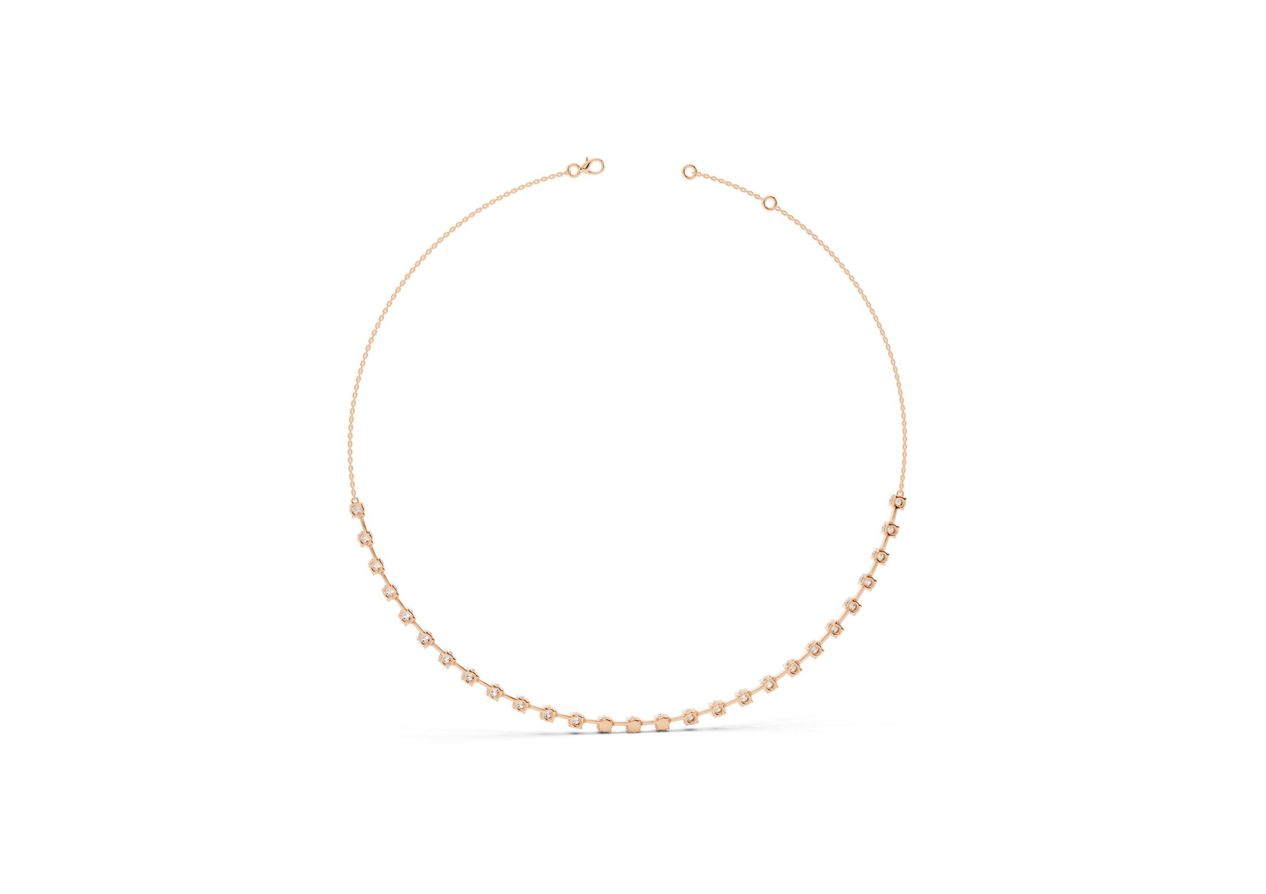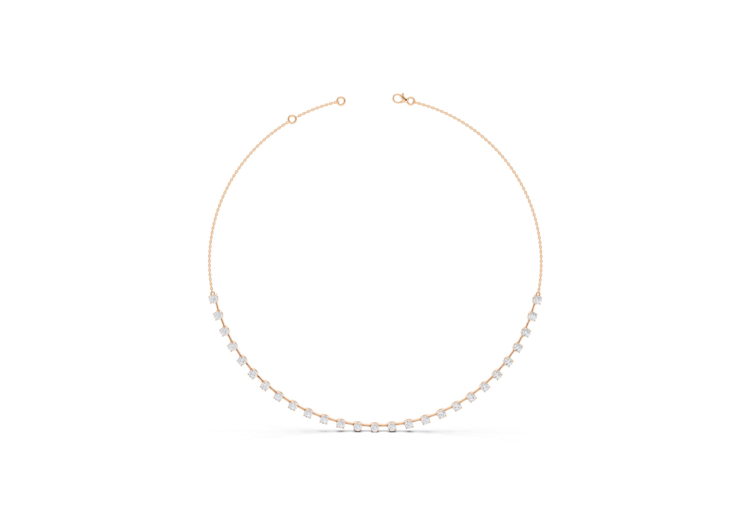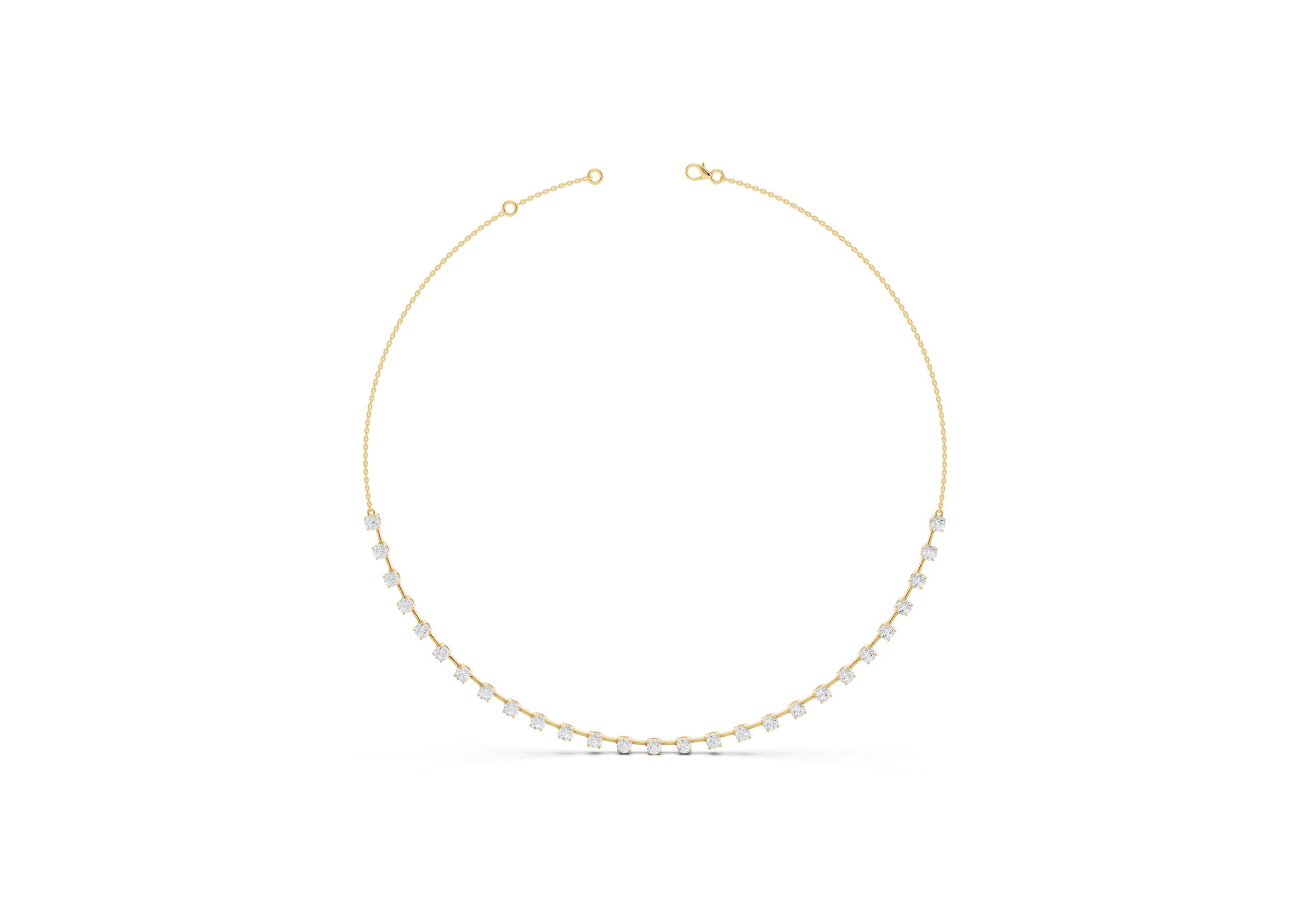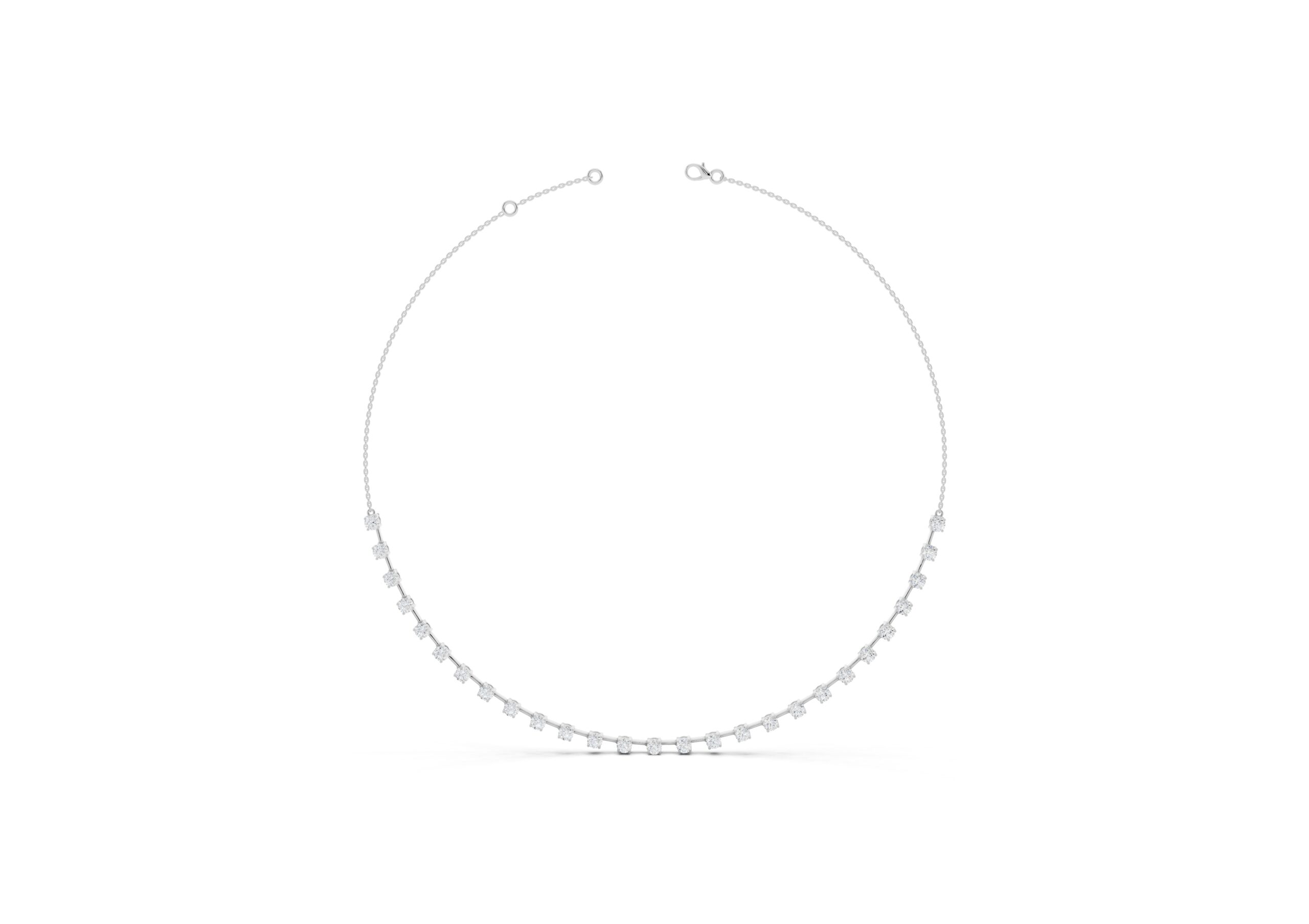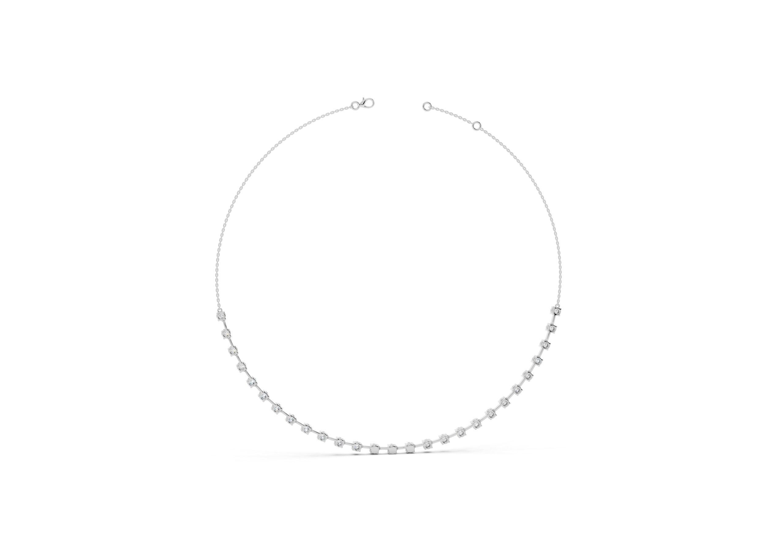 Minimal yet luminous, this necklace features a precise arrangement of round diamonds set along a fine, barely-there chain — creating the illusion of floating brilliance. The soft arc of stones traces the collarbone with effortless elegance, making it an ideal piece for both layering and standalone sophistication. Lightweight, refined, and quietly radiant — it’s modern minimalism, perfected.