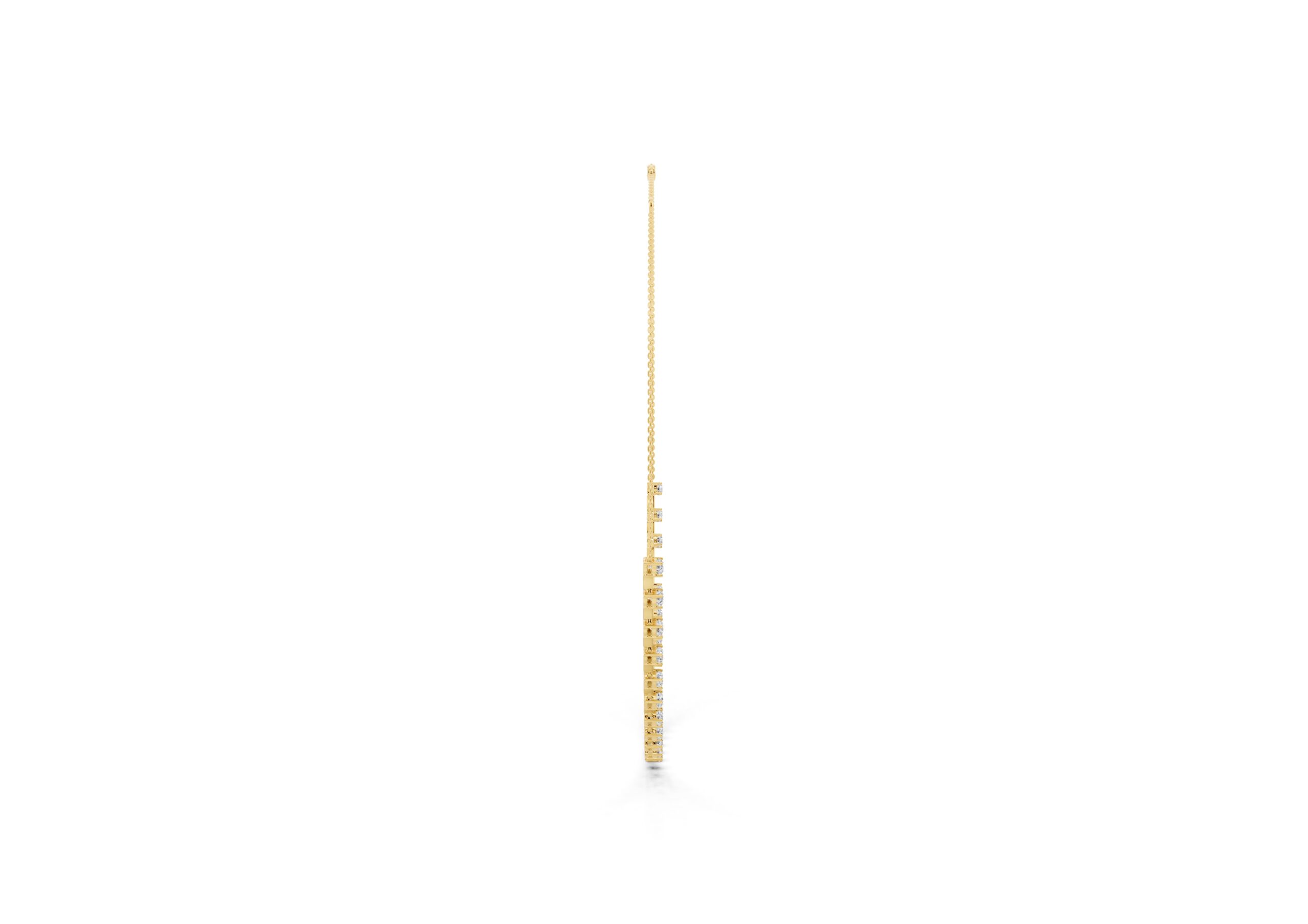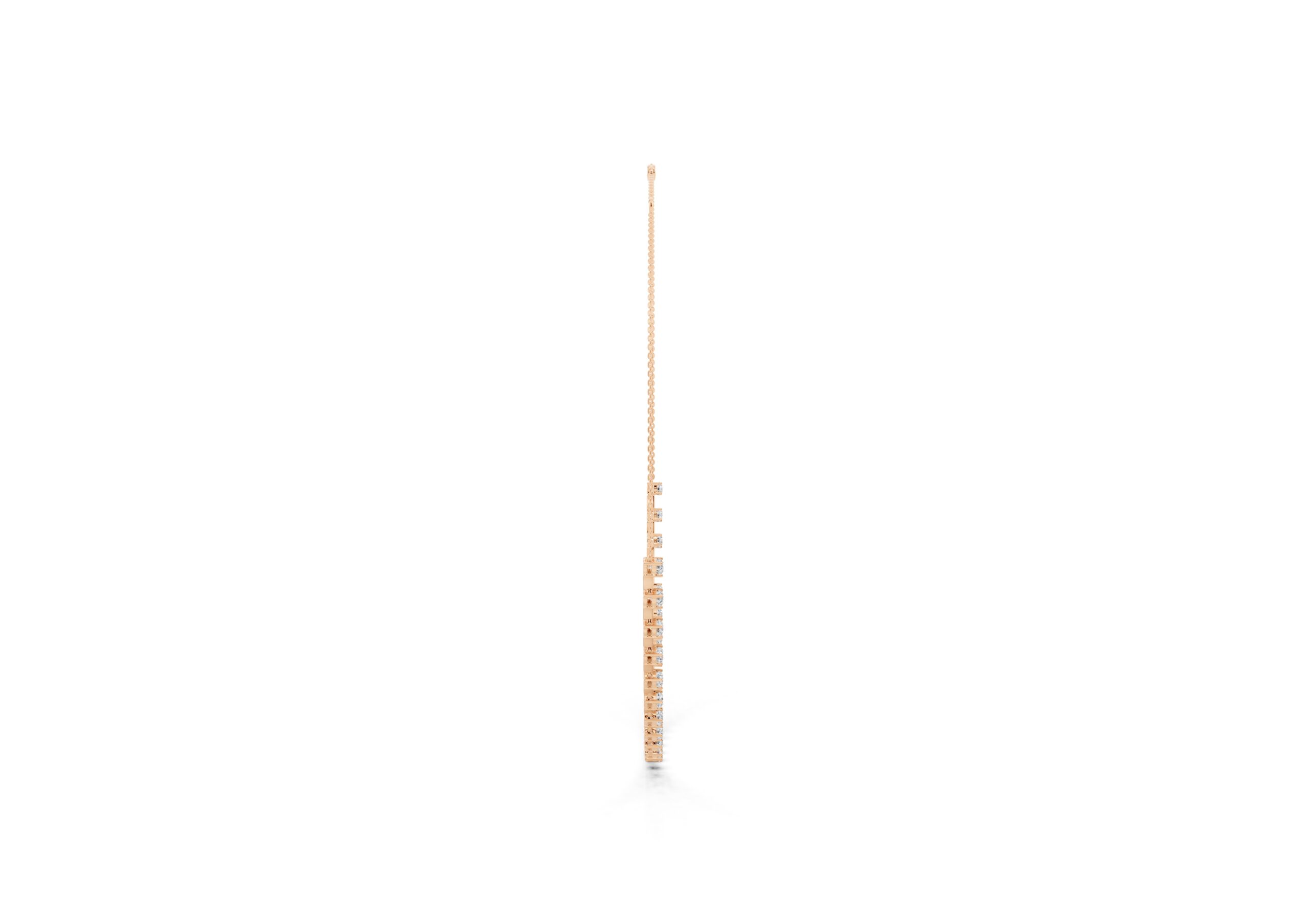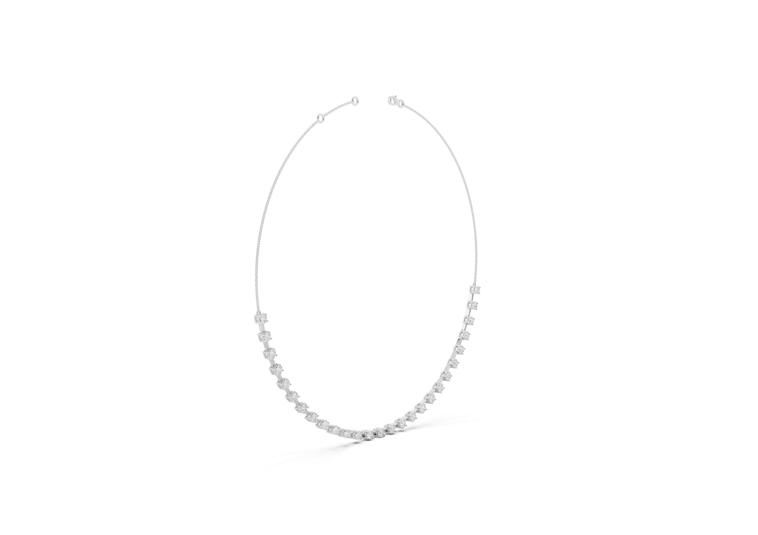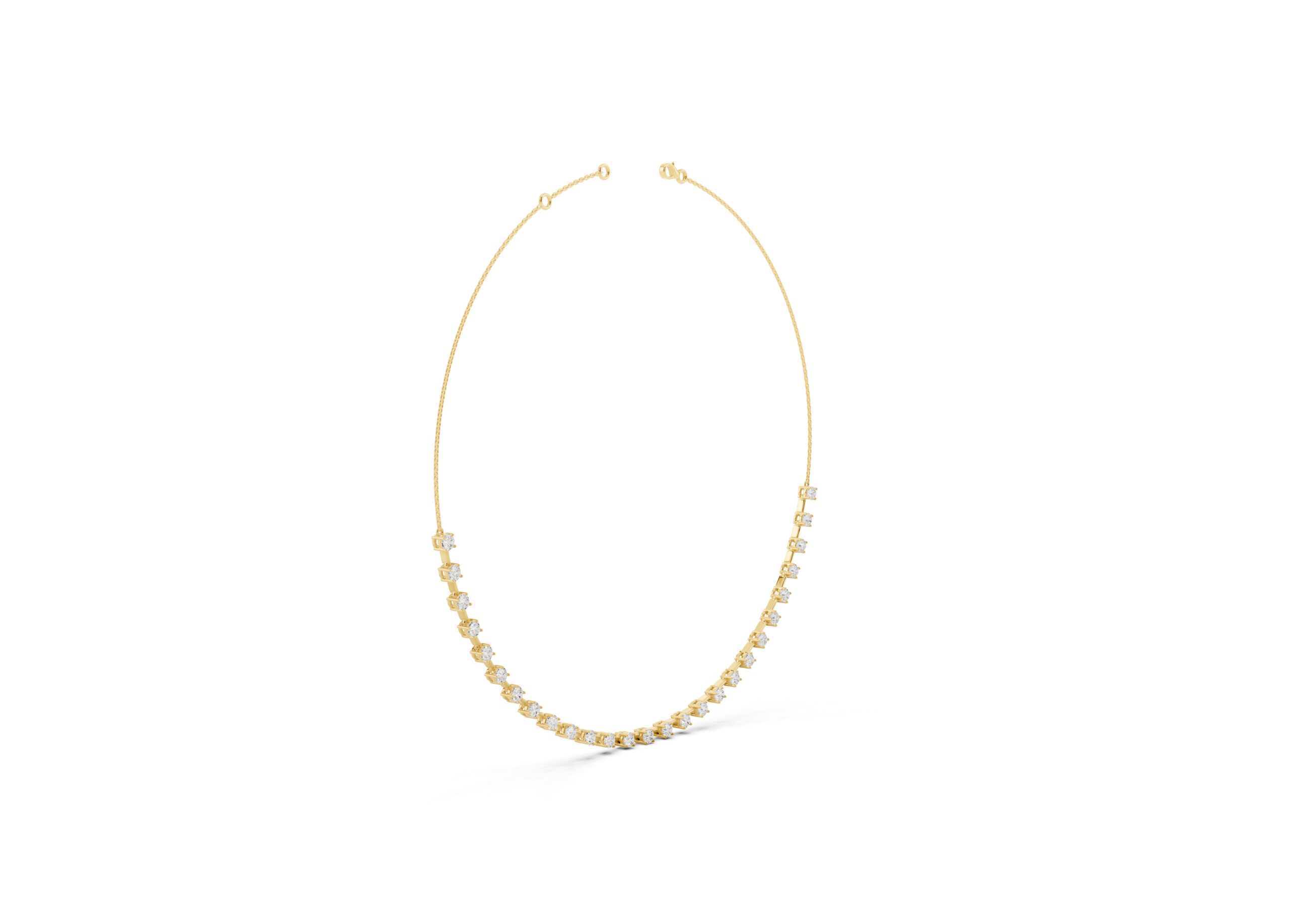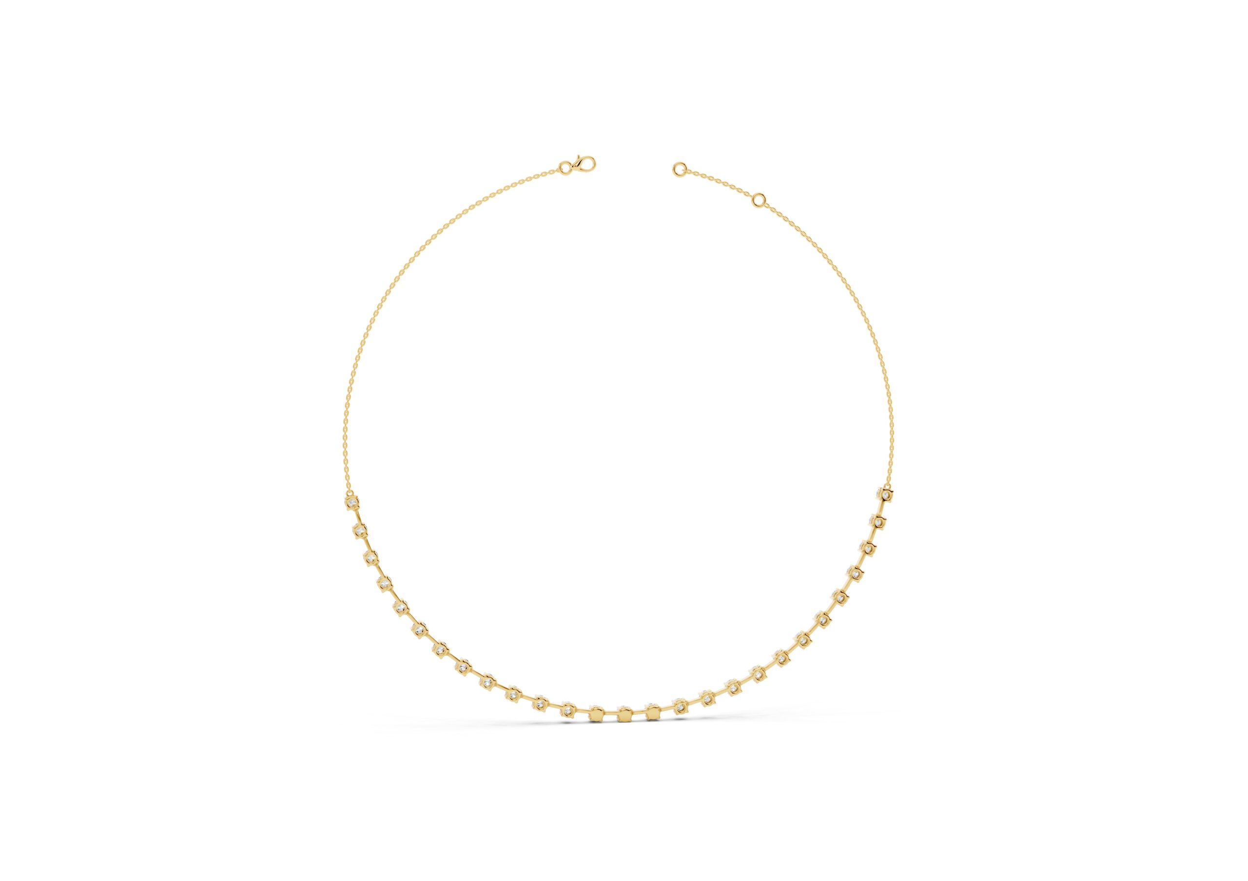 Minimal yet luminous, this necklace features a precise arrangement of round diamonds set along a fine, barely-there chain — creating the illusion of floating brilliance. The soft arc of stones traces the collarbone with effortless elegance, making it an ideal piece for both layering and standalone sophistication. Lightweight, refined, and quietly radiant — it’s modern minimalism, perfected.