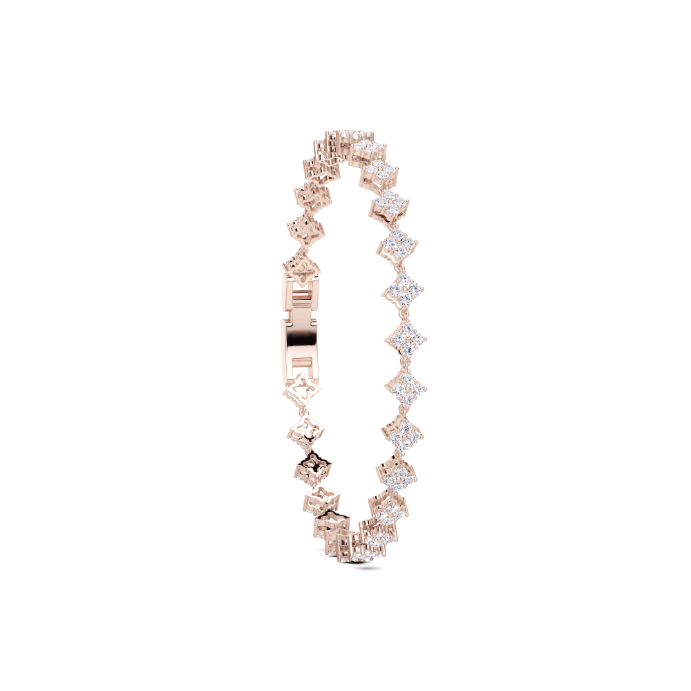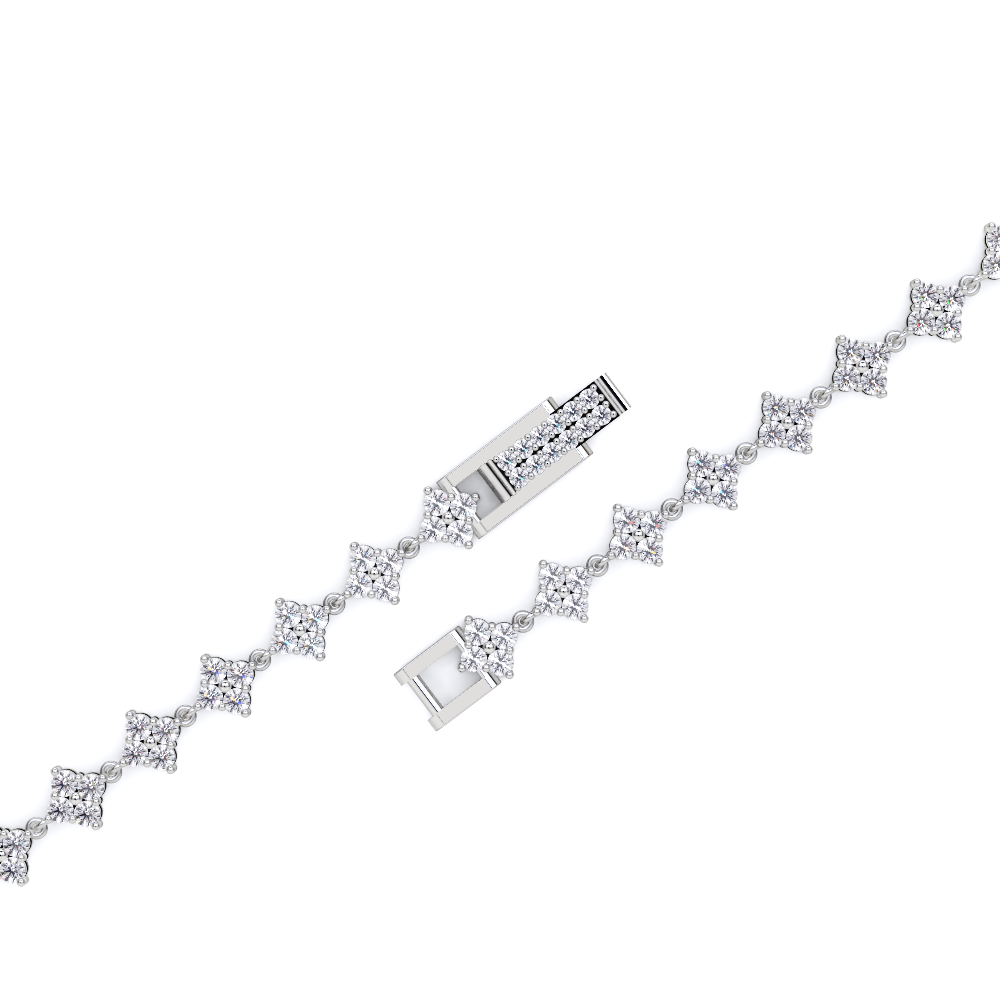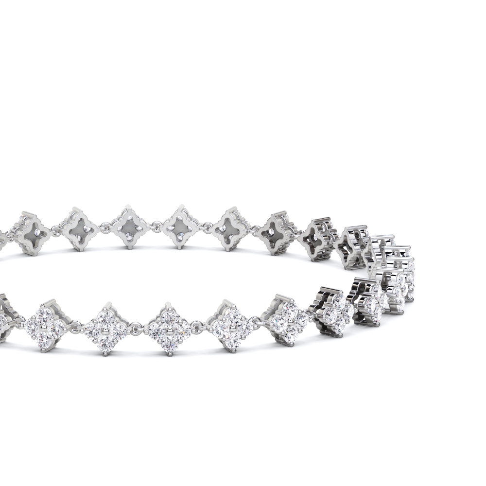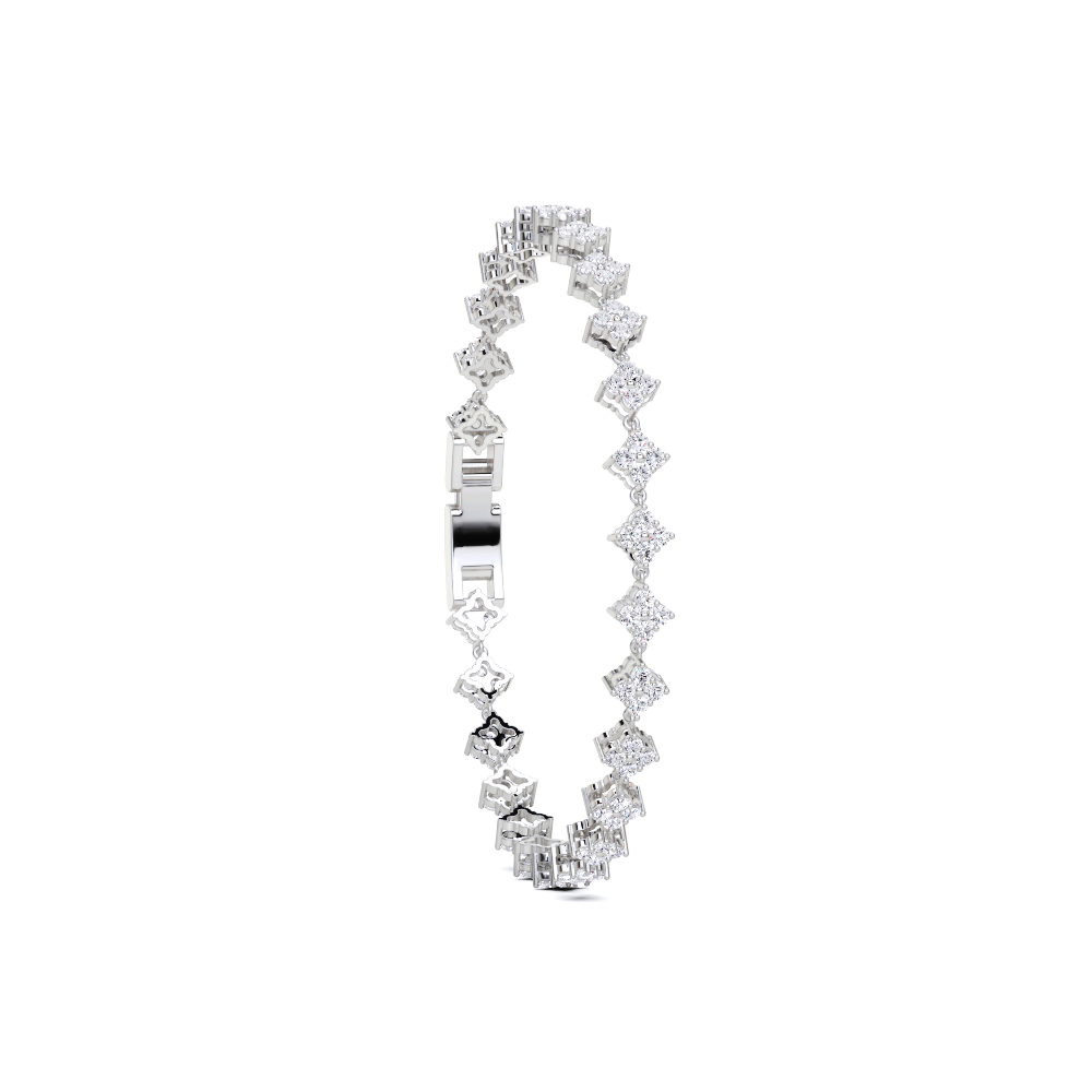 This bracelet features a series of round, brilliant-cut diamonds set in a floral or cluster design. The bracelet has a secure clasp with a small, rectangular detail. The diamonds are closely set, creating a continuous line of sparkle around the wrist.