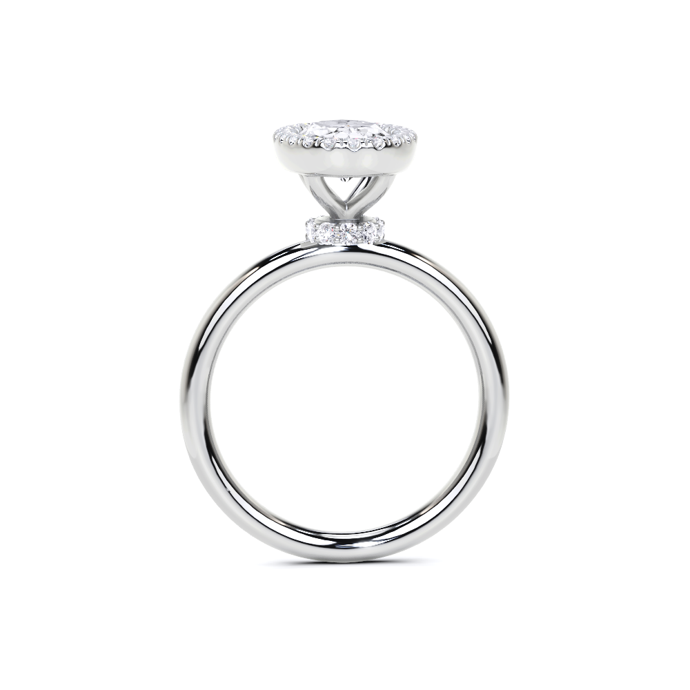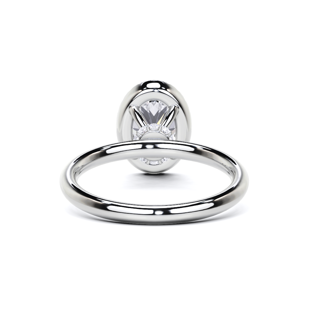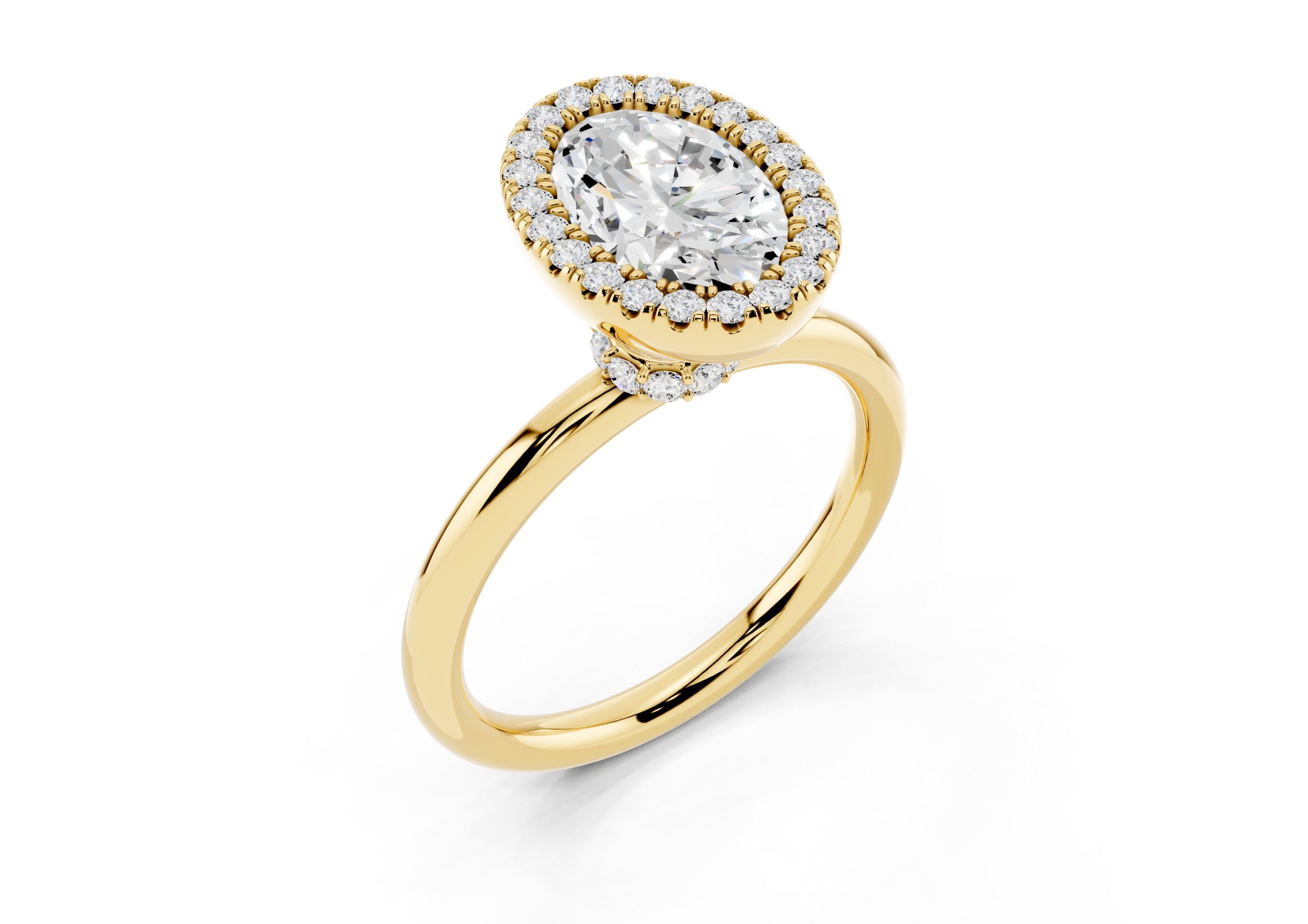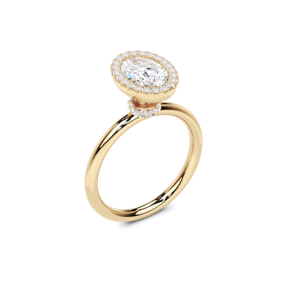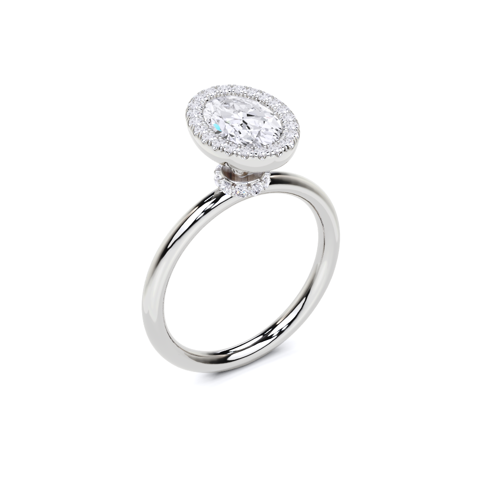 Designed with modern grace and subtle luxury, this ring features a shimmering oval center surrounded by a delicate halo. The elevated basket is accented with a hidden ring of stones, adding brilliance from every perspective. Understated yet undeniably elegant