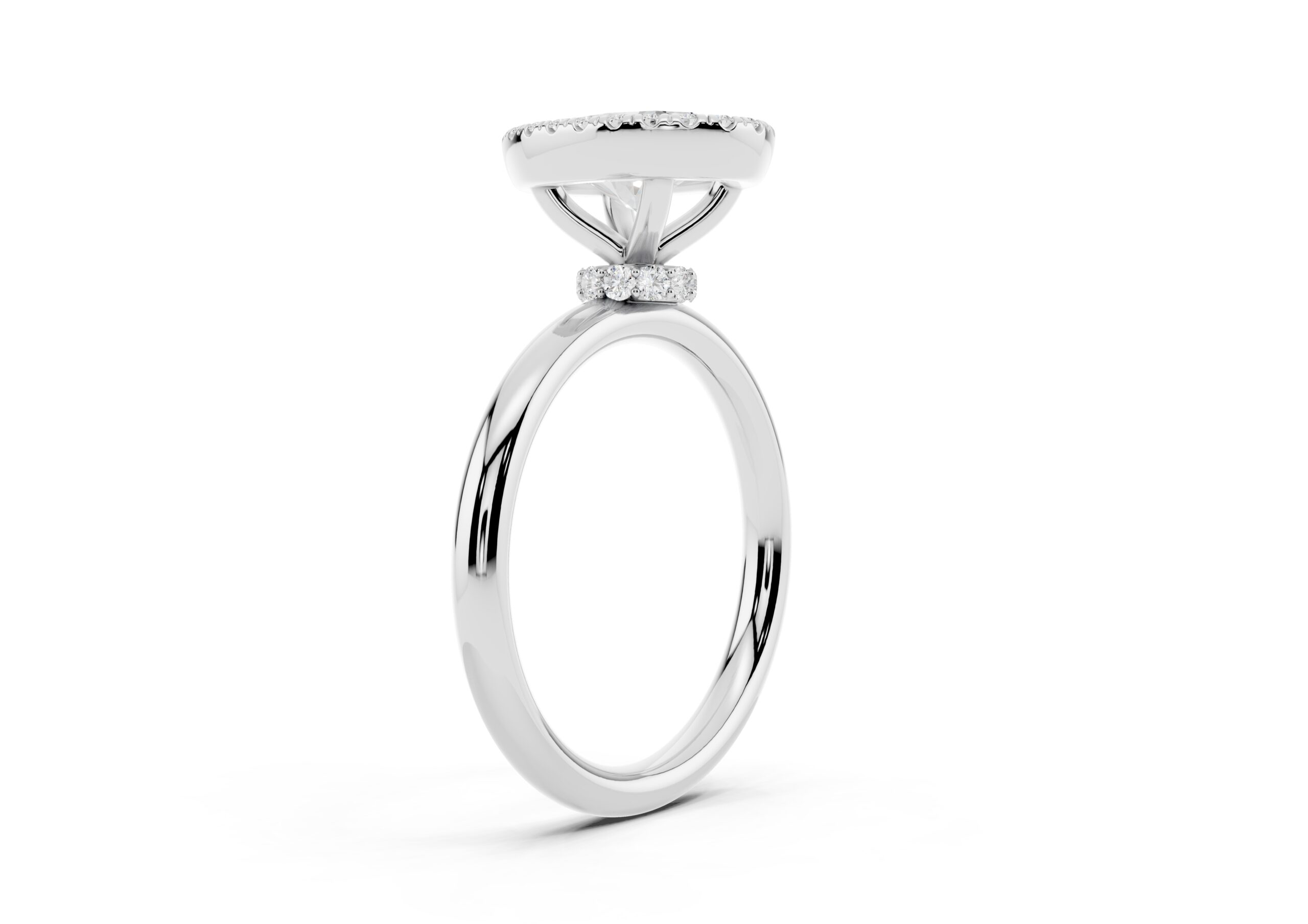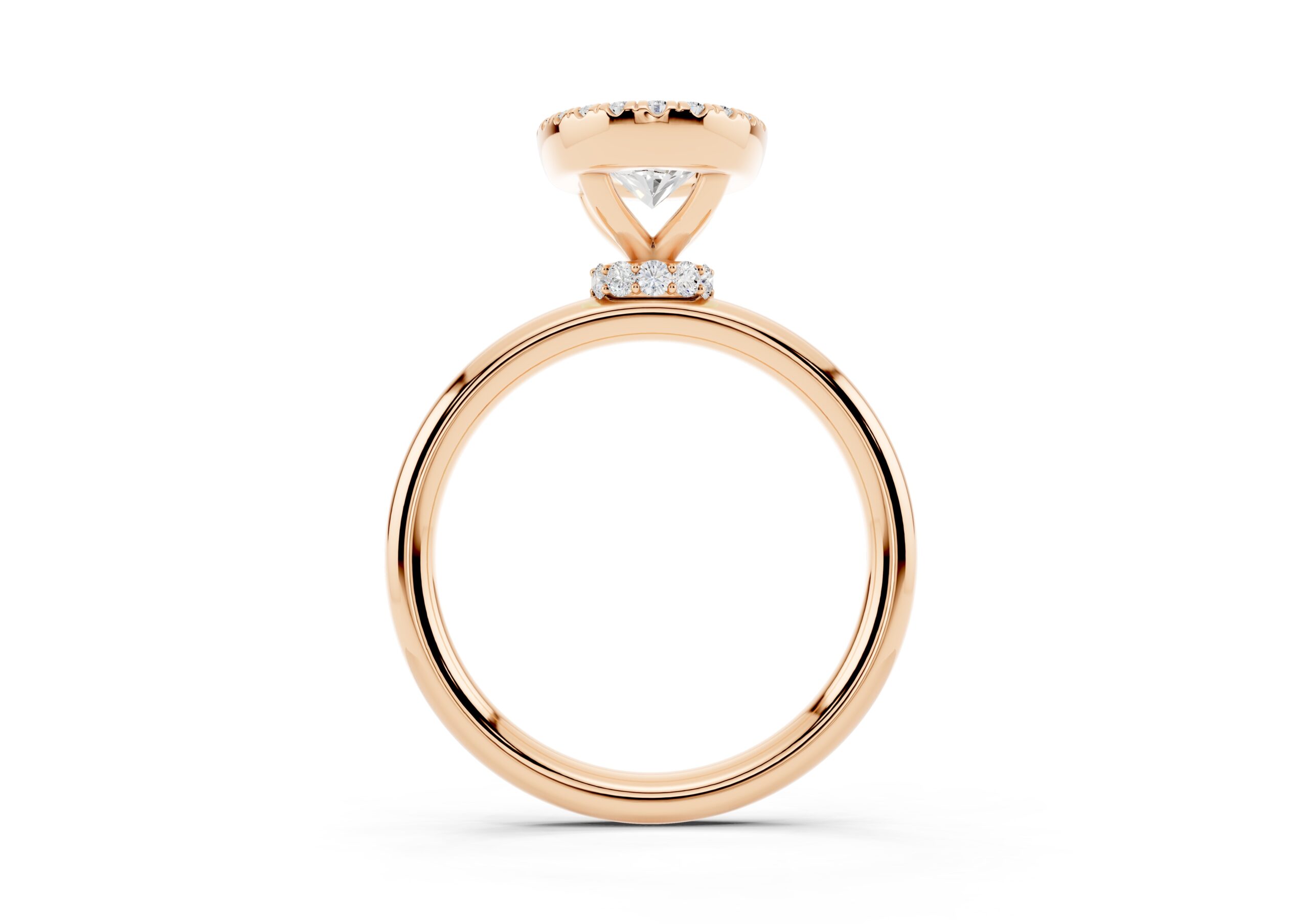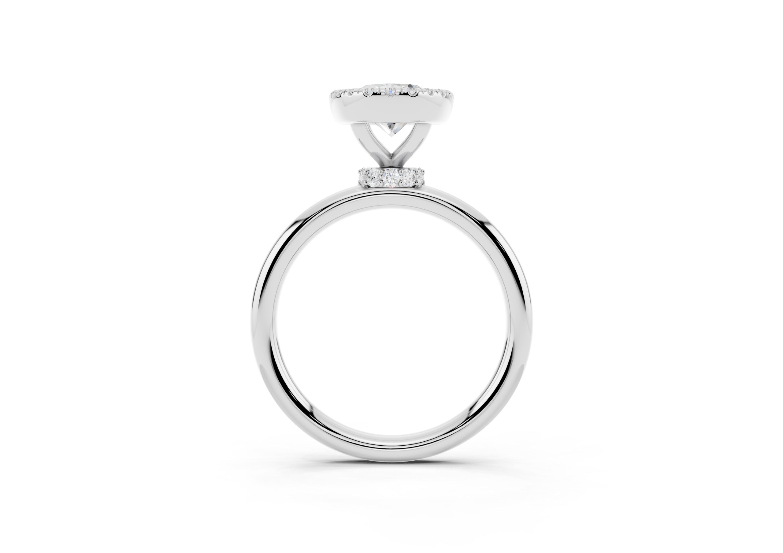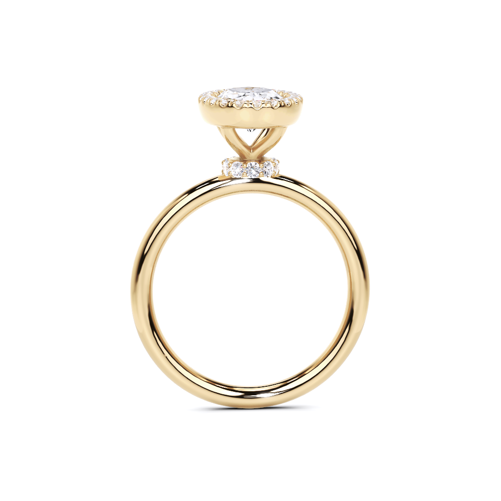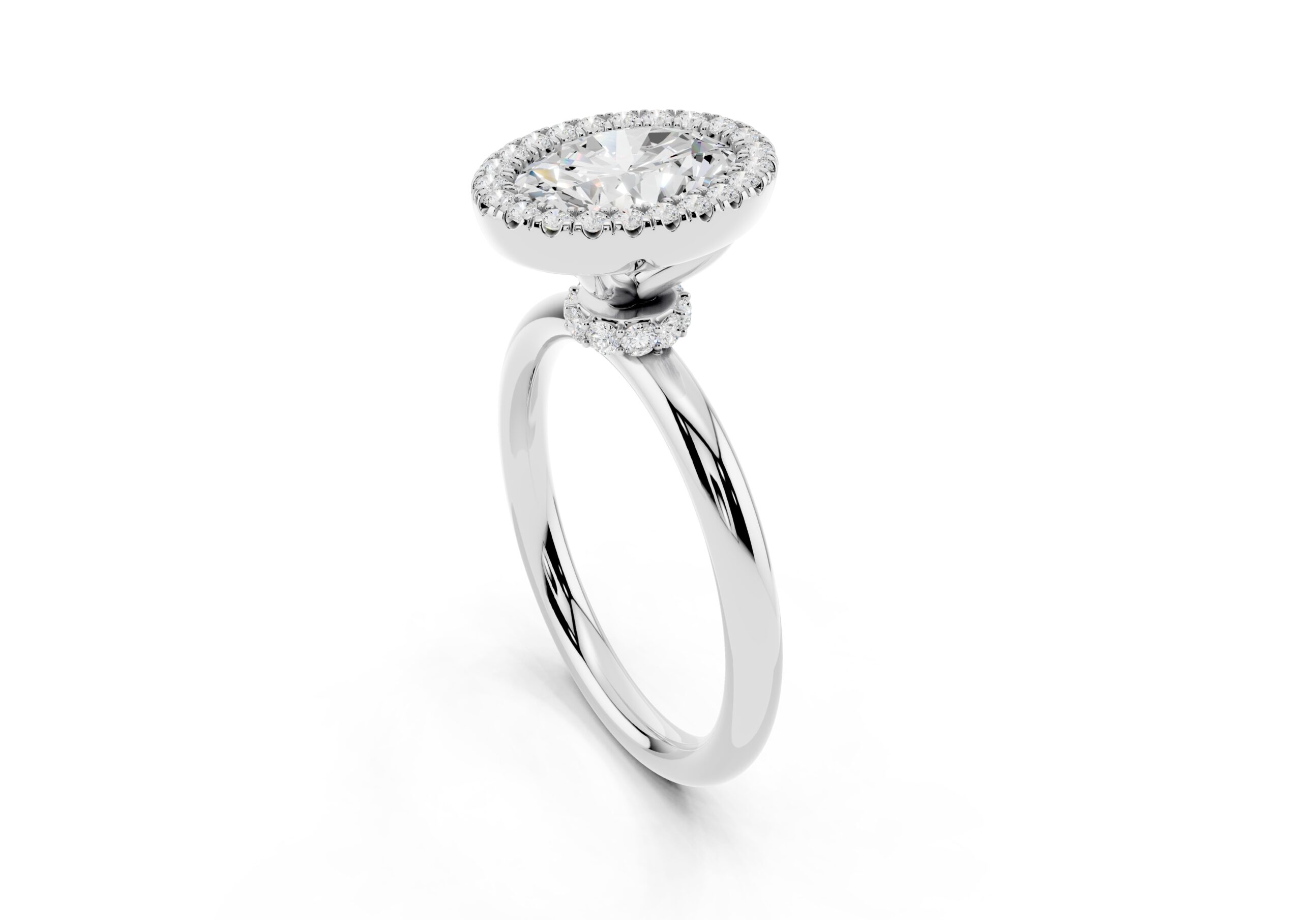Designed with modern grace and subtle luxury, this ring features a shimmering oval center surrounded by a delicate halo. The elevated basket is accented with a hidden ring of stones, adding brilliance from every perspective. Understated yet undeniably elegant