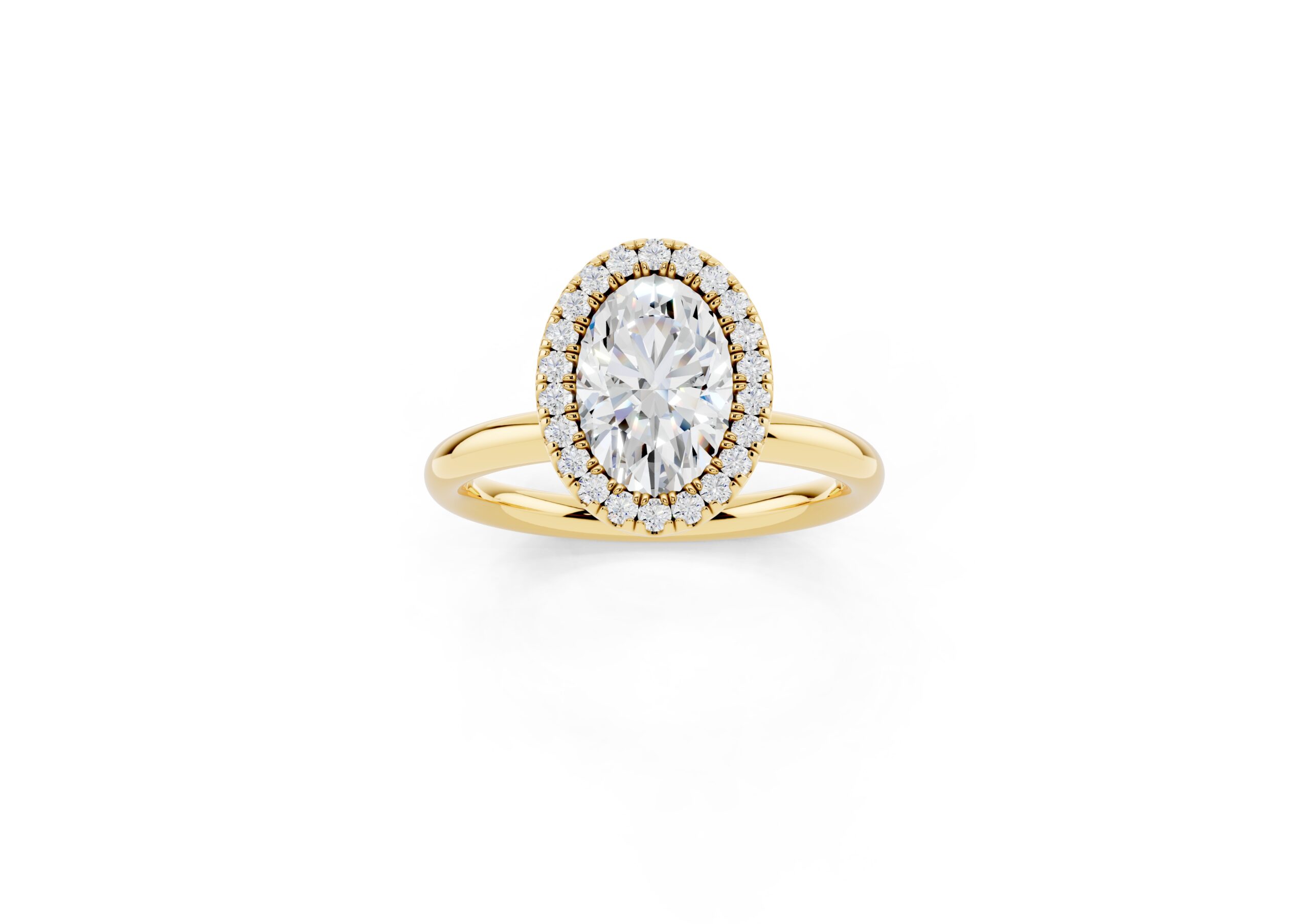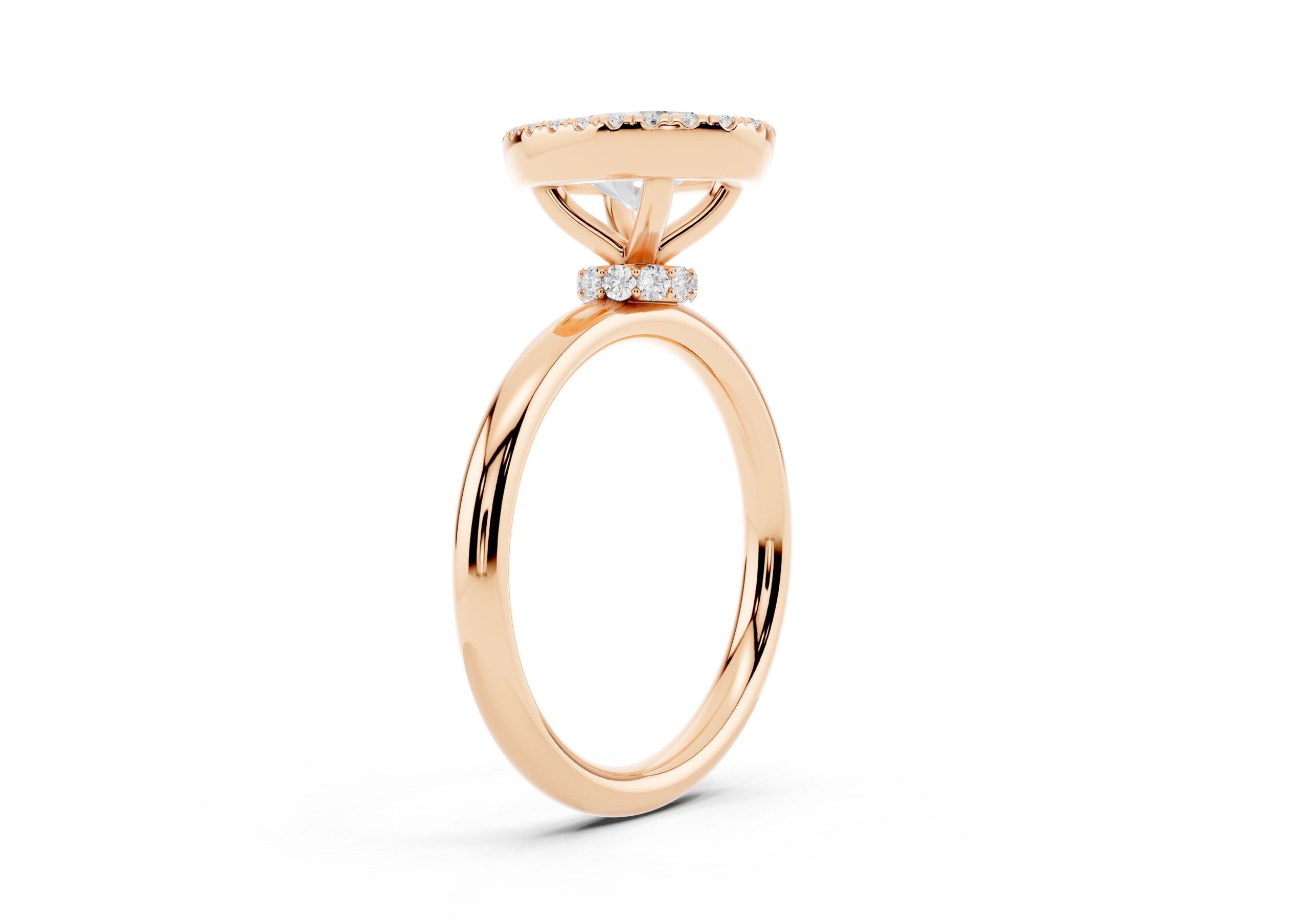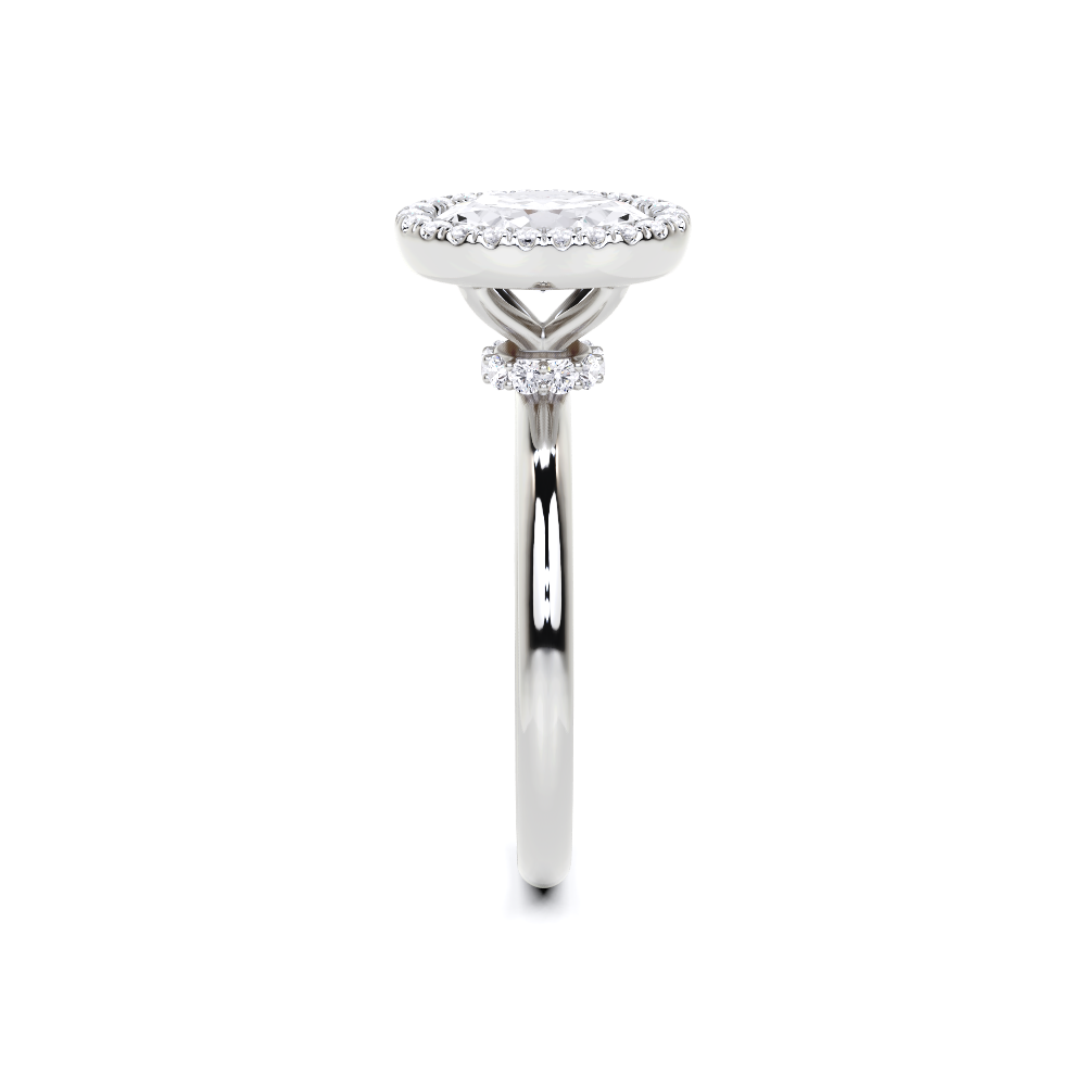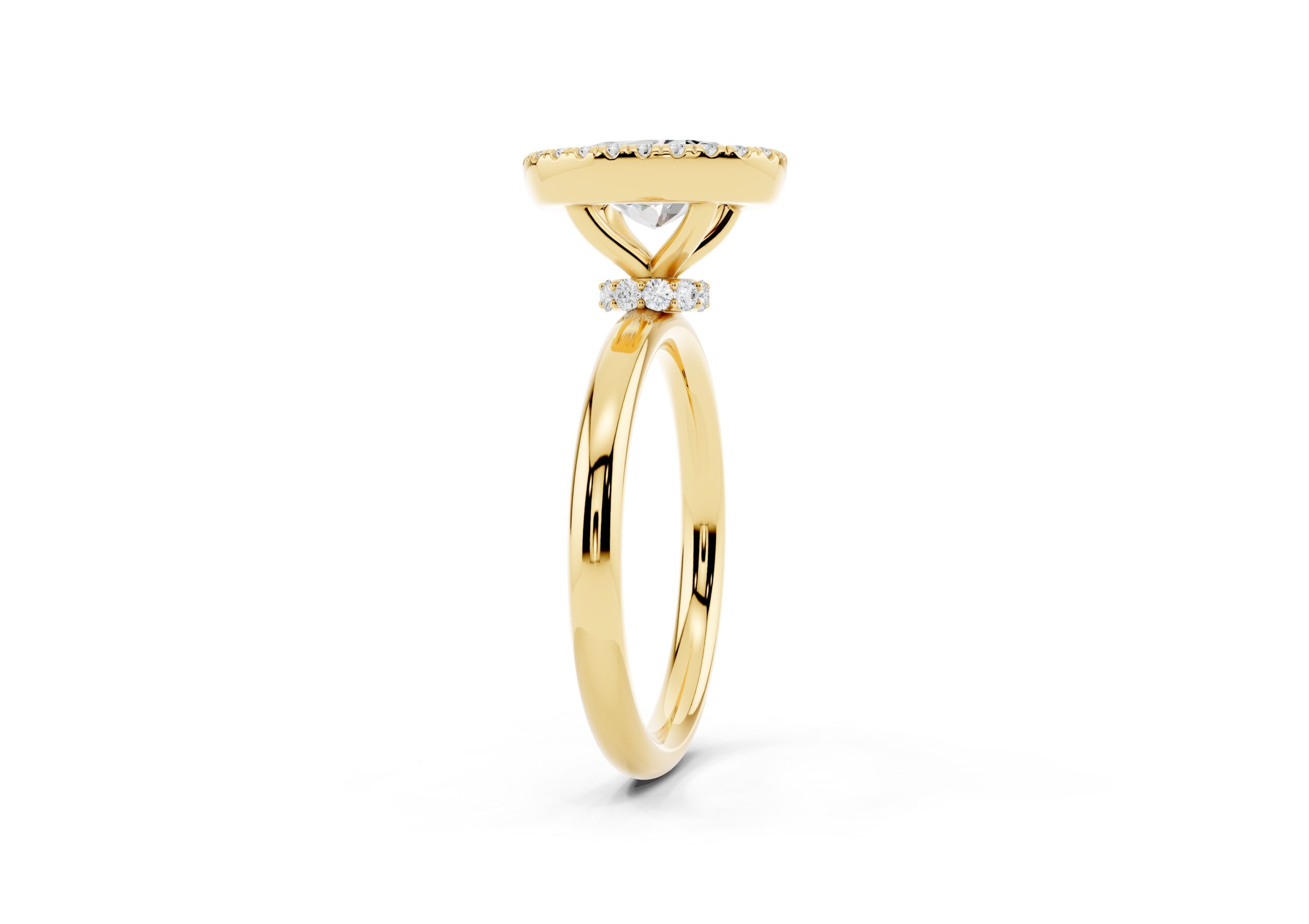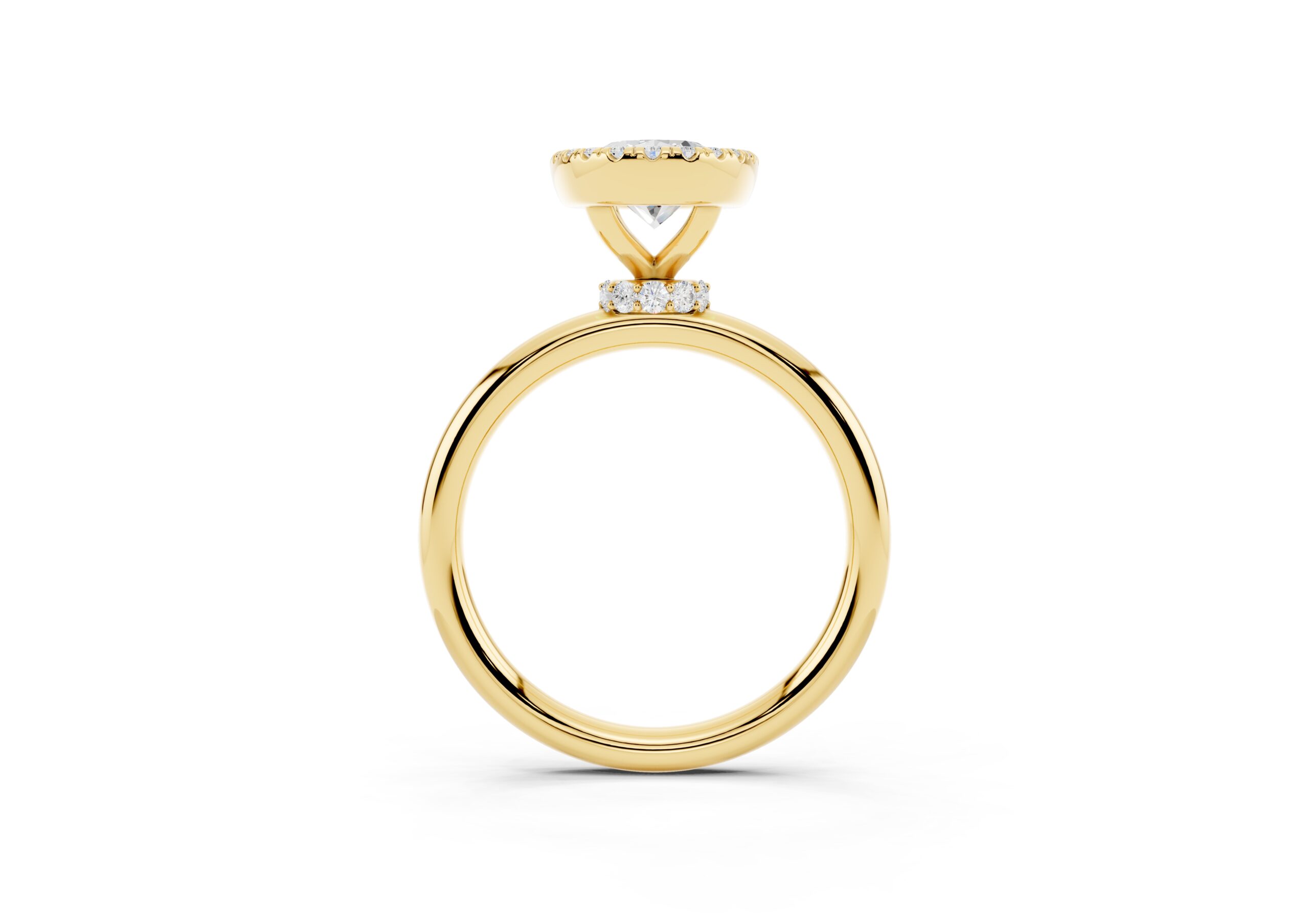 Designed with modern grace and subtle luxury, this ring features a shimmering oval center surrounded by a delicate halo. The elevated basket is accented with a hidden ring of stones, adding brilliance from every perspective. Understated yet undeniably elegant