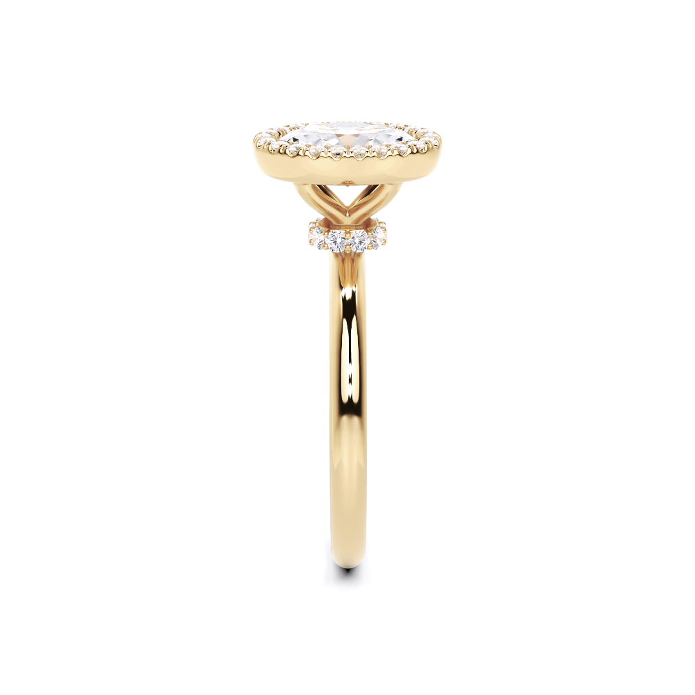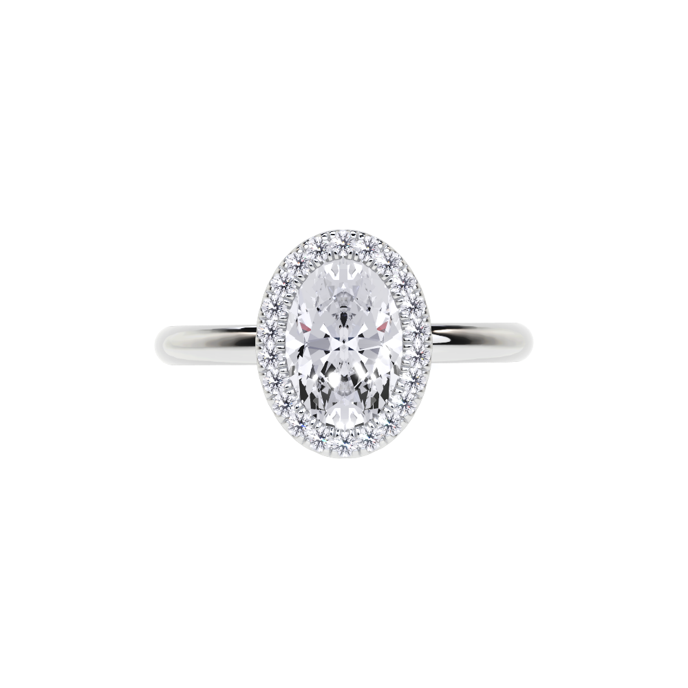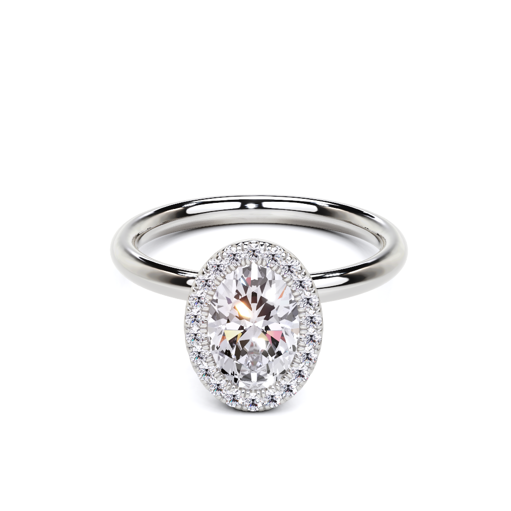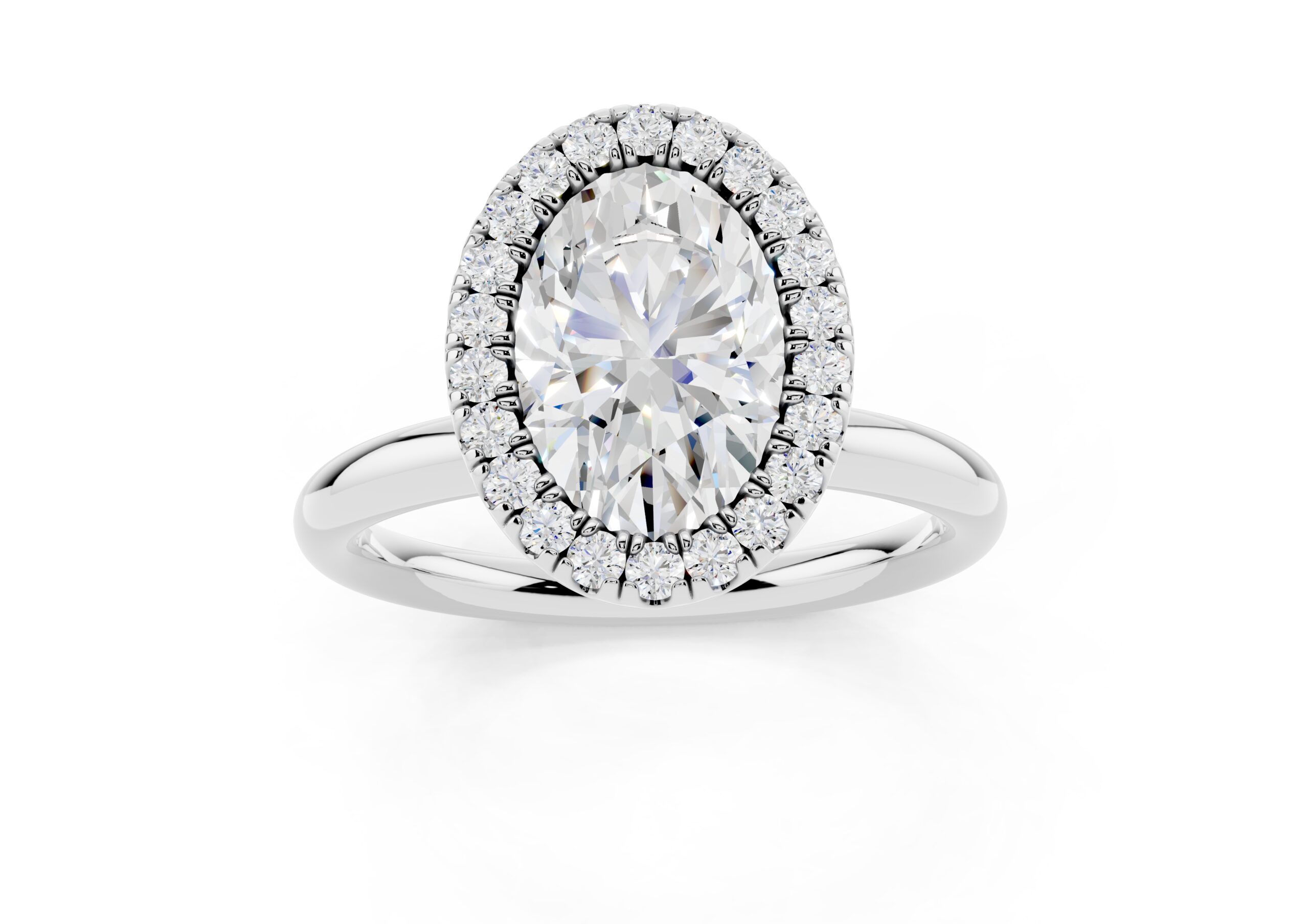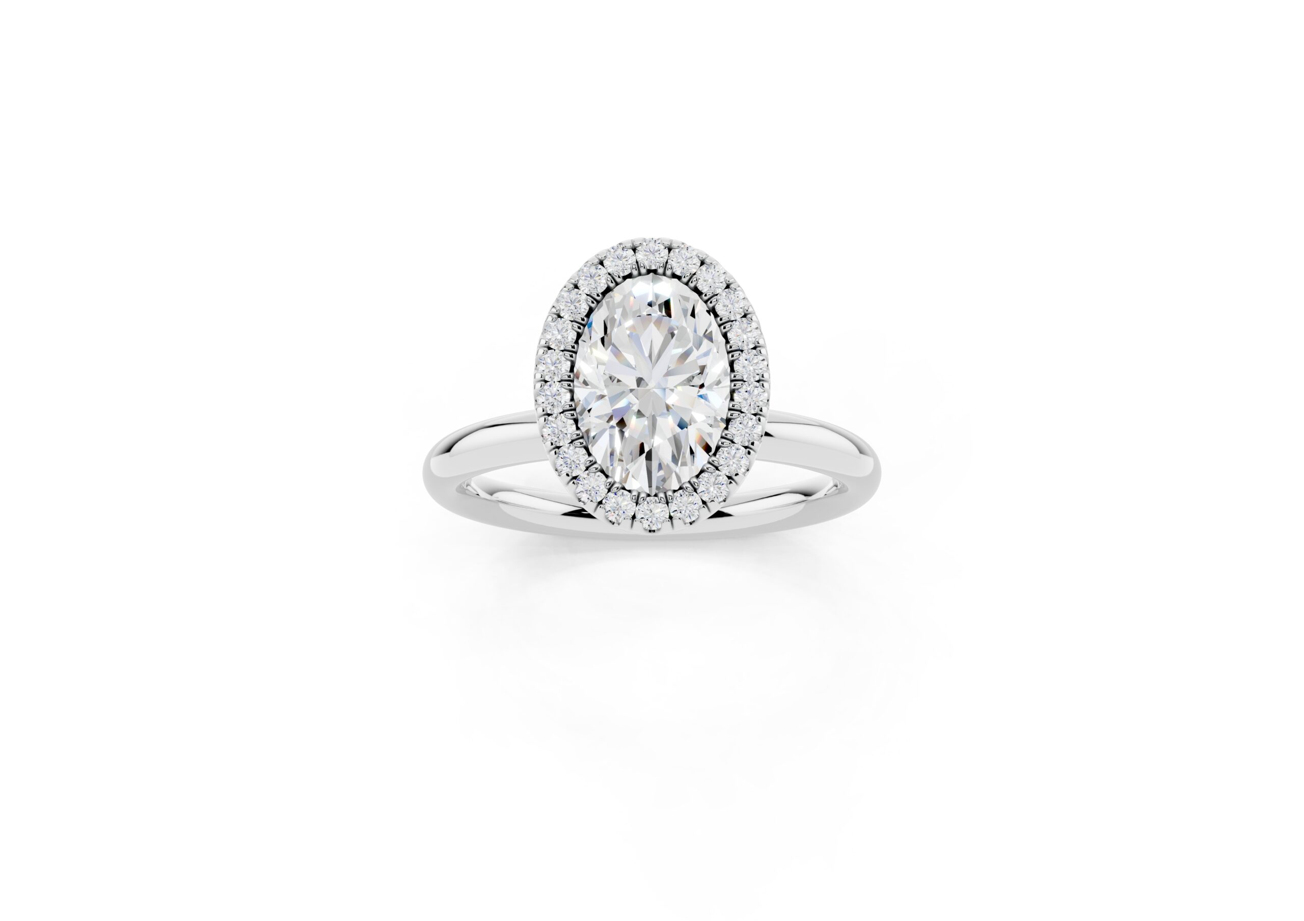 Designed with modern grace and subtle luxury, this ring features a shimmering oval center surrounded by a delicate halo. The elevated basket is accented with a hidden ring of stones, adding brilliance from every perspective. Understated yet undeniably elegant