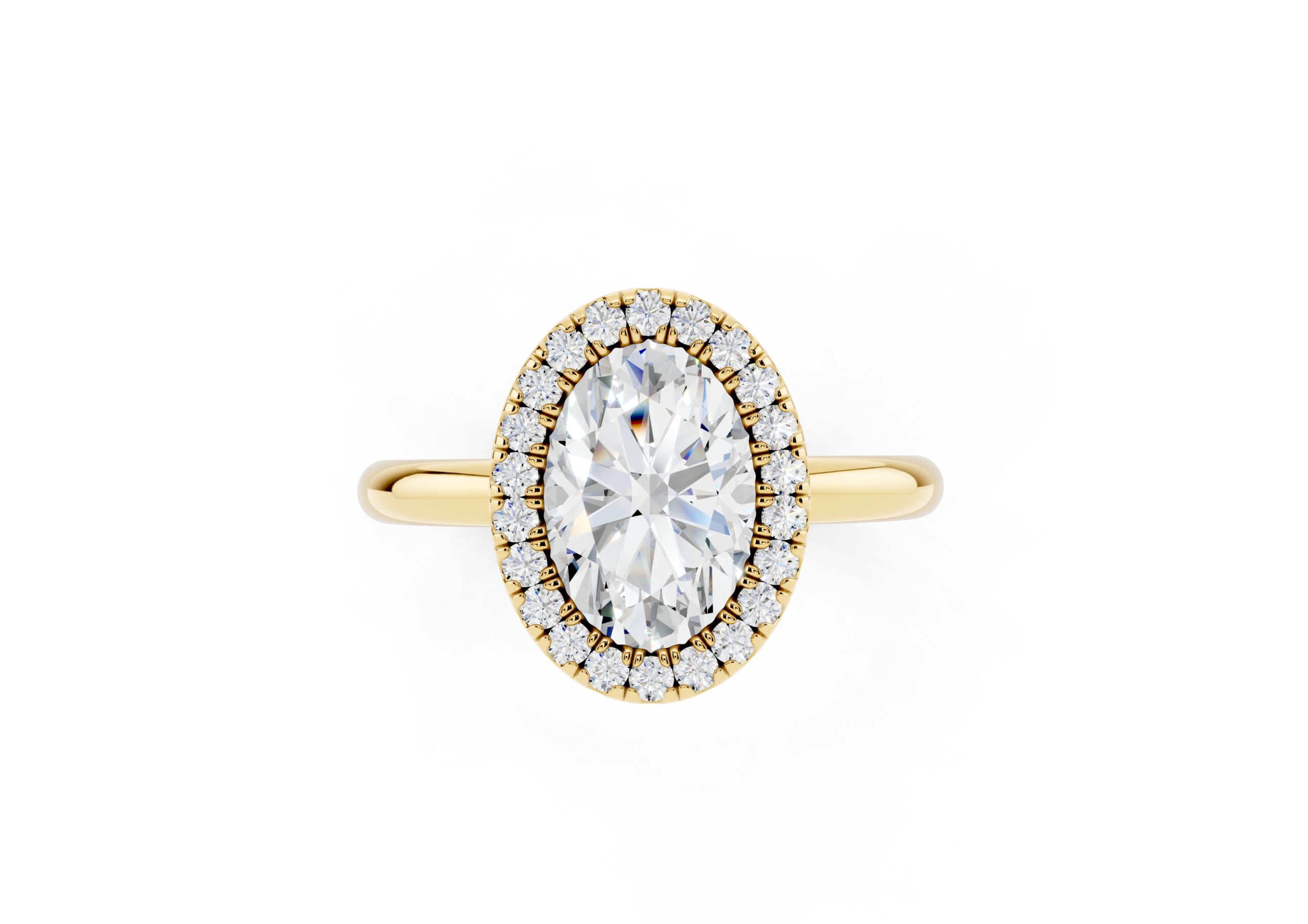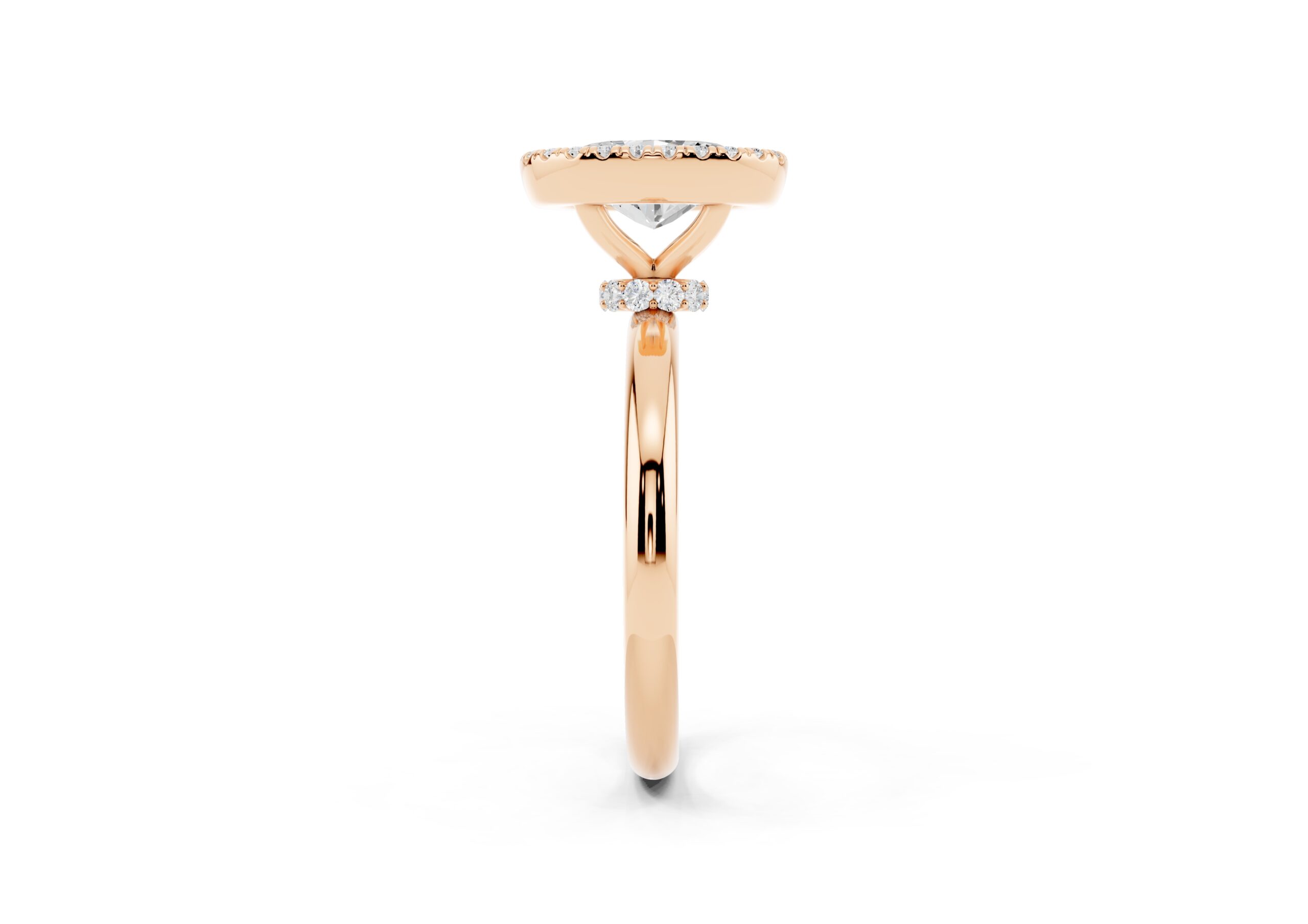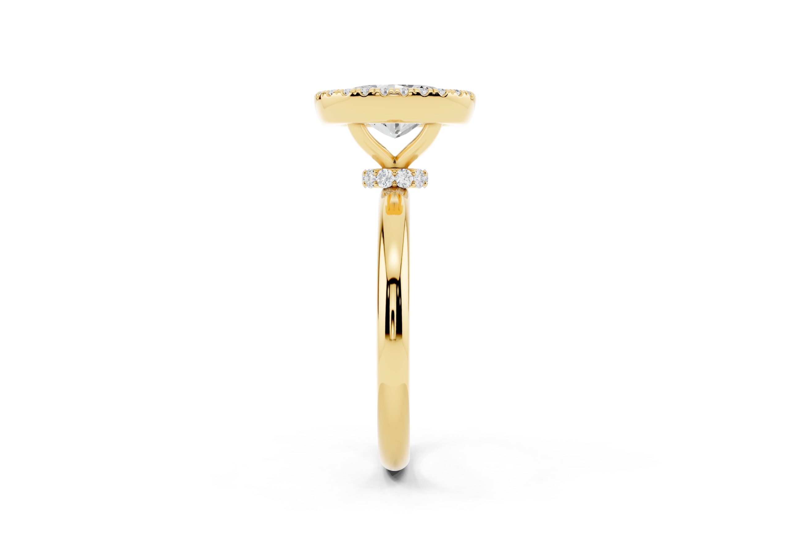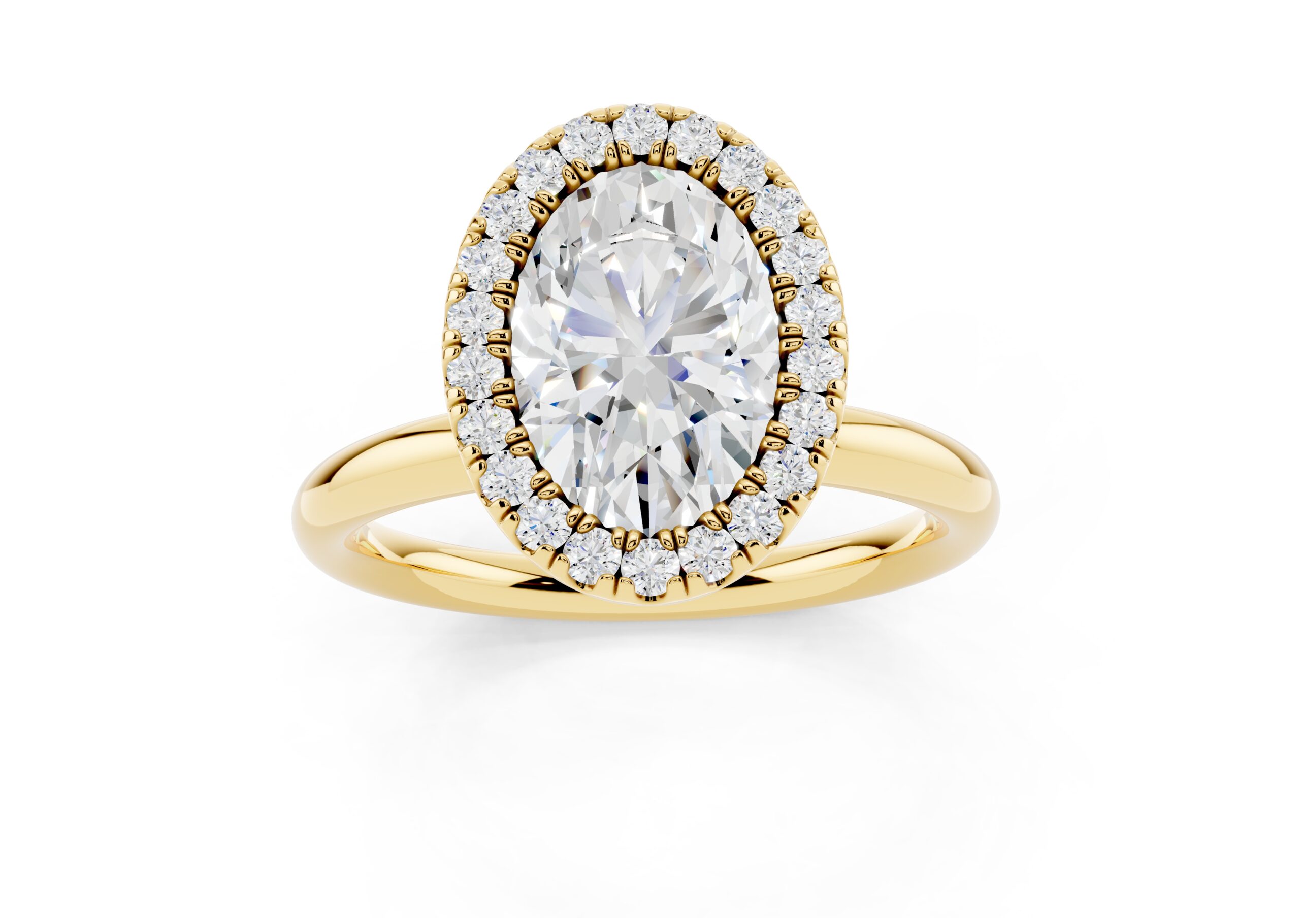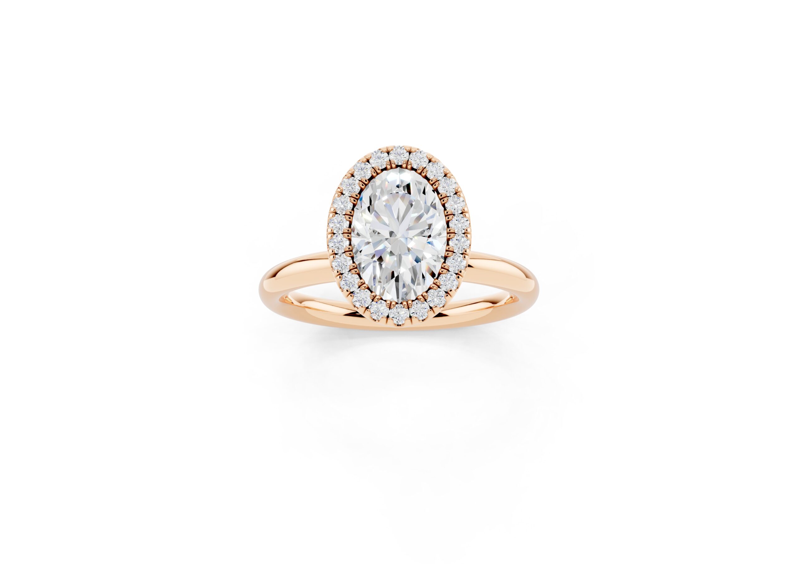 Designed with modern grace and subtle luxury, this ring features a shimmering oval center surrounded by a delicate halo. The elevated basket is accented with a hidden ring of stones, adding brilliance from every perspective. Understated yet undeniably elegant