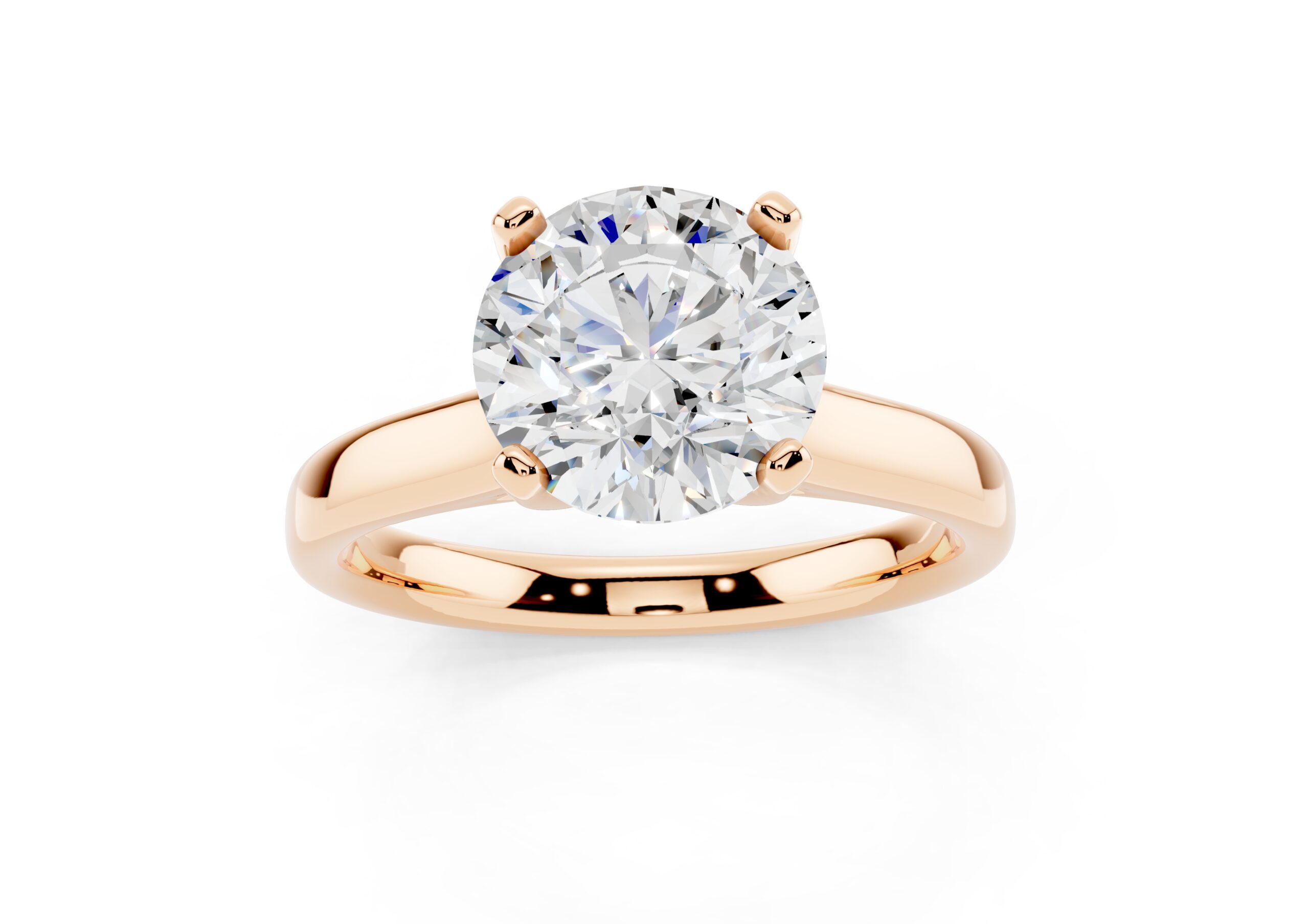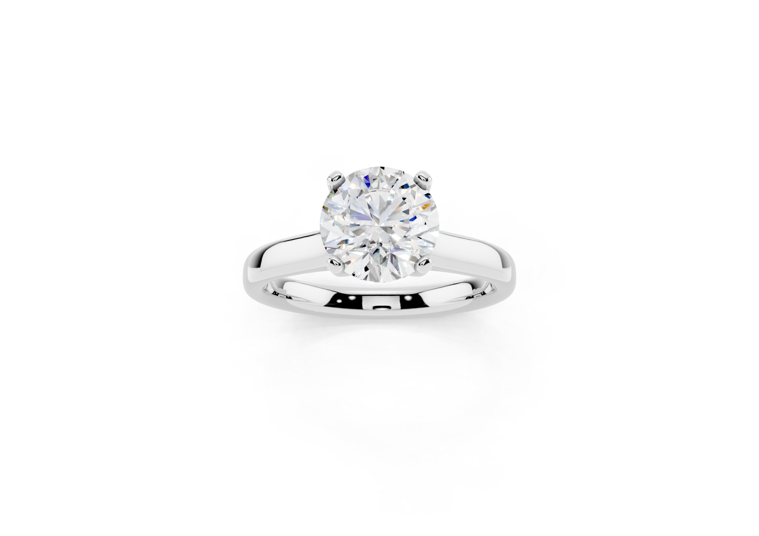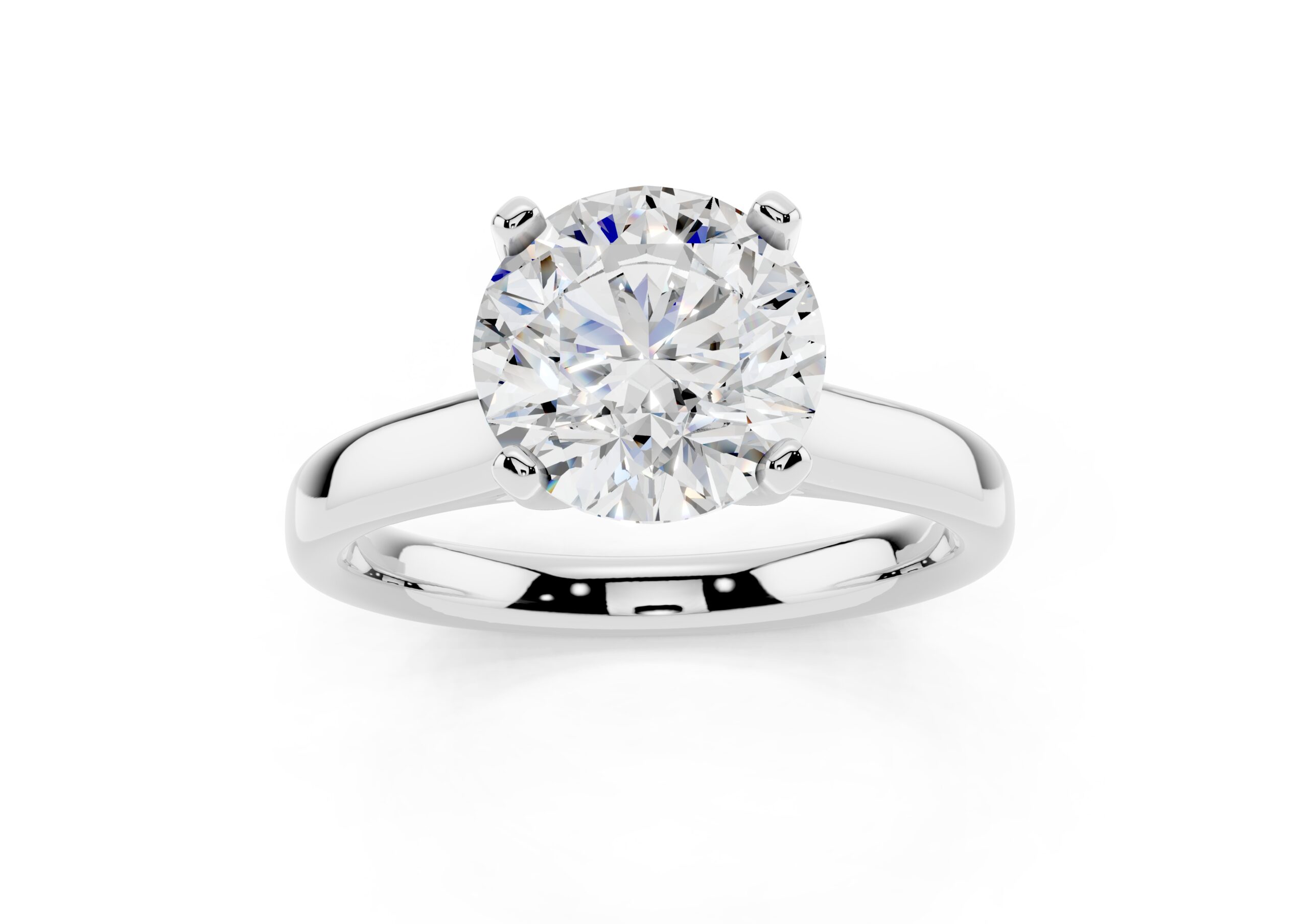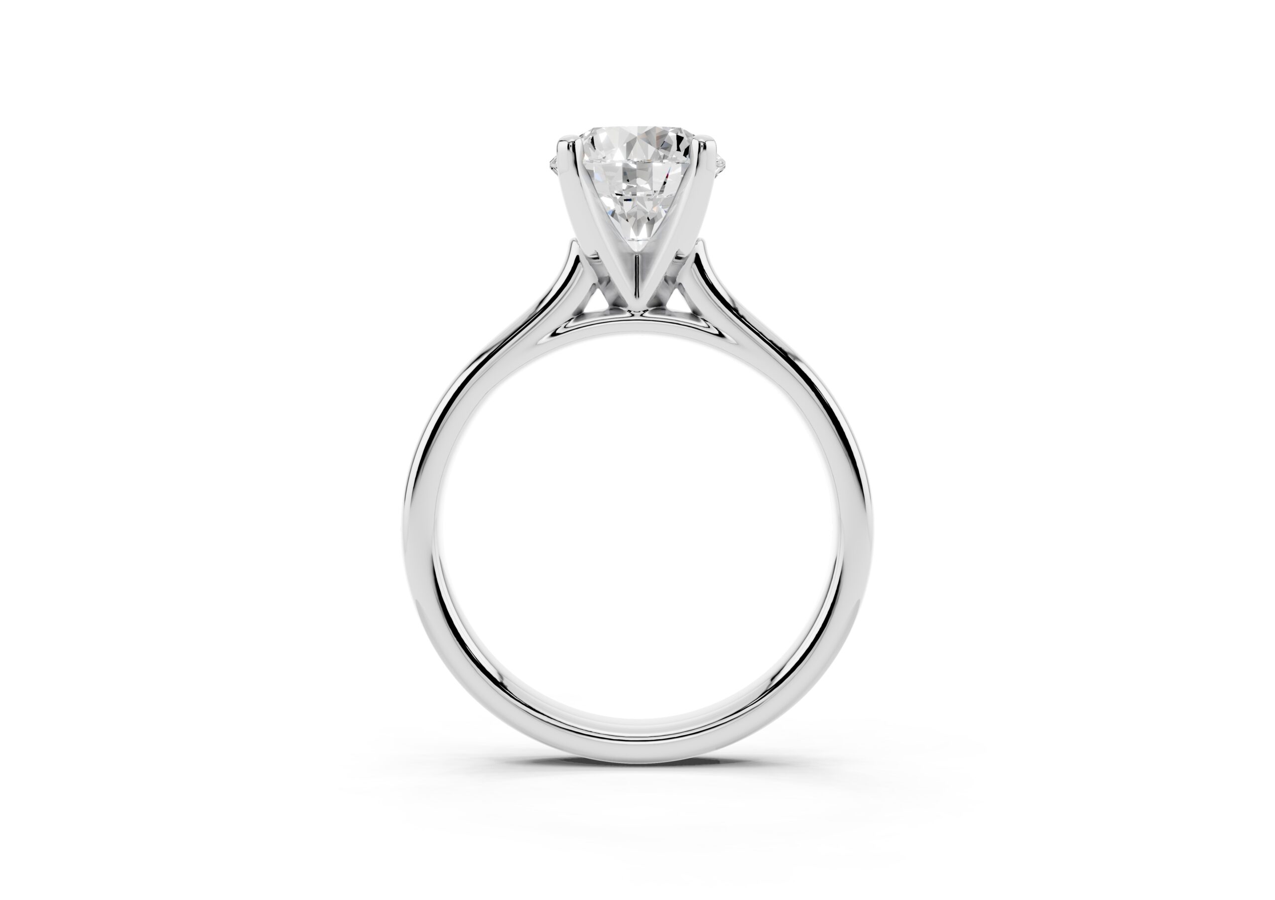 This solitaire is anything but subtle — featuring a commanding round diamond elevated in a clean four-prong setting atop a smooth, sculpted band. The proportions are bold yet balanced, designed to spotlight the center stone’s brilliance from every angle. Effortlessly elegant and unapologetically confident, it’s a modern icon made for a lifetime of attention.