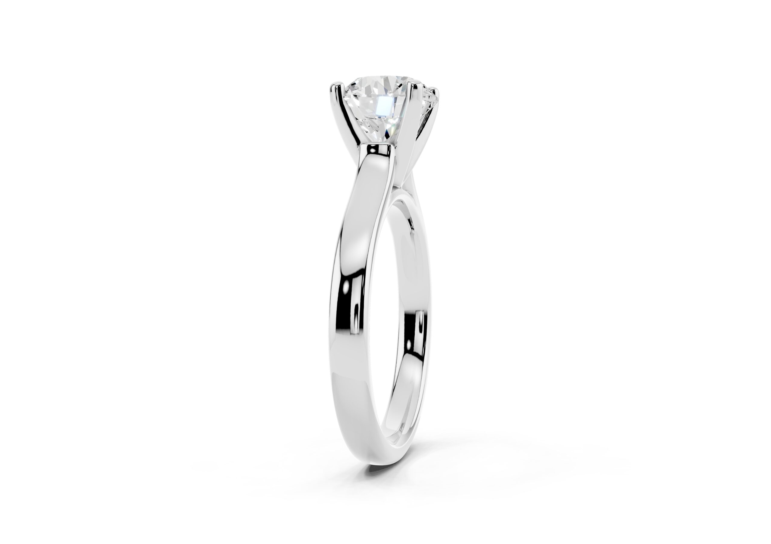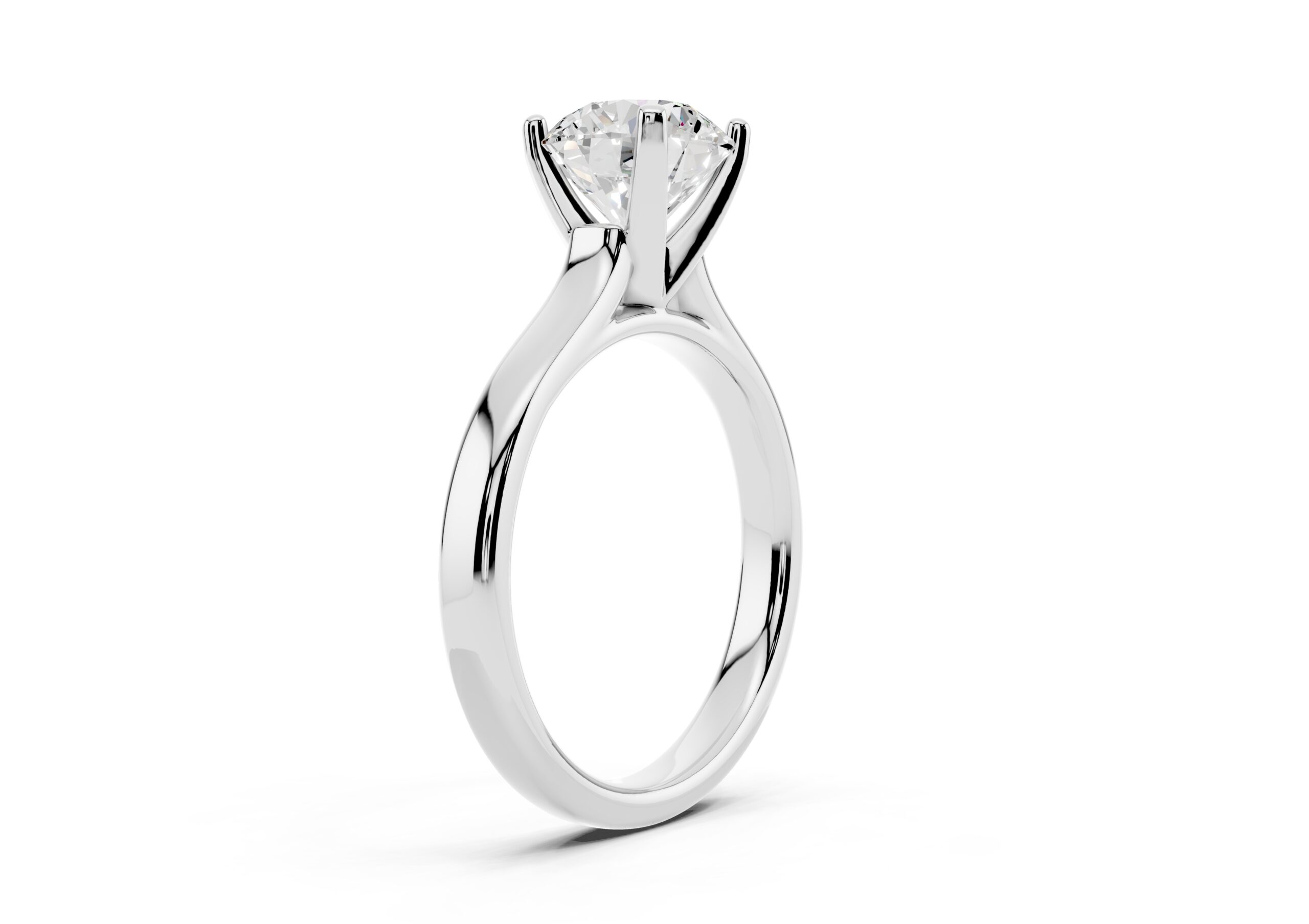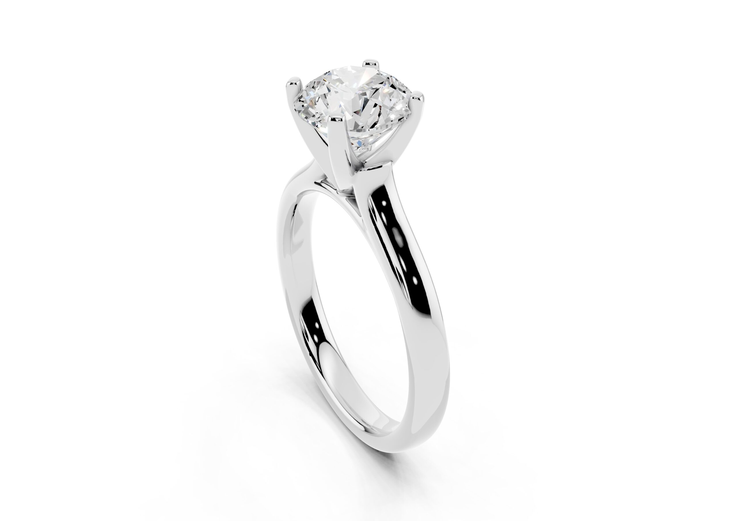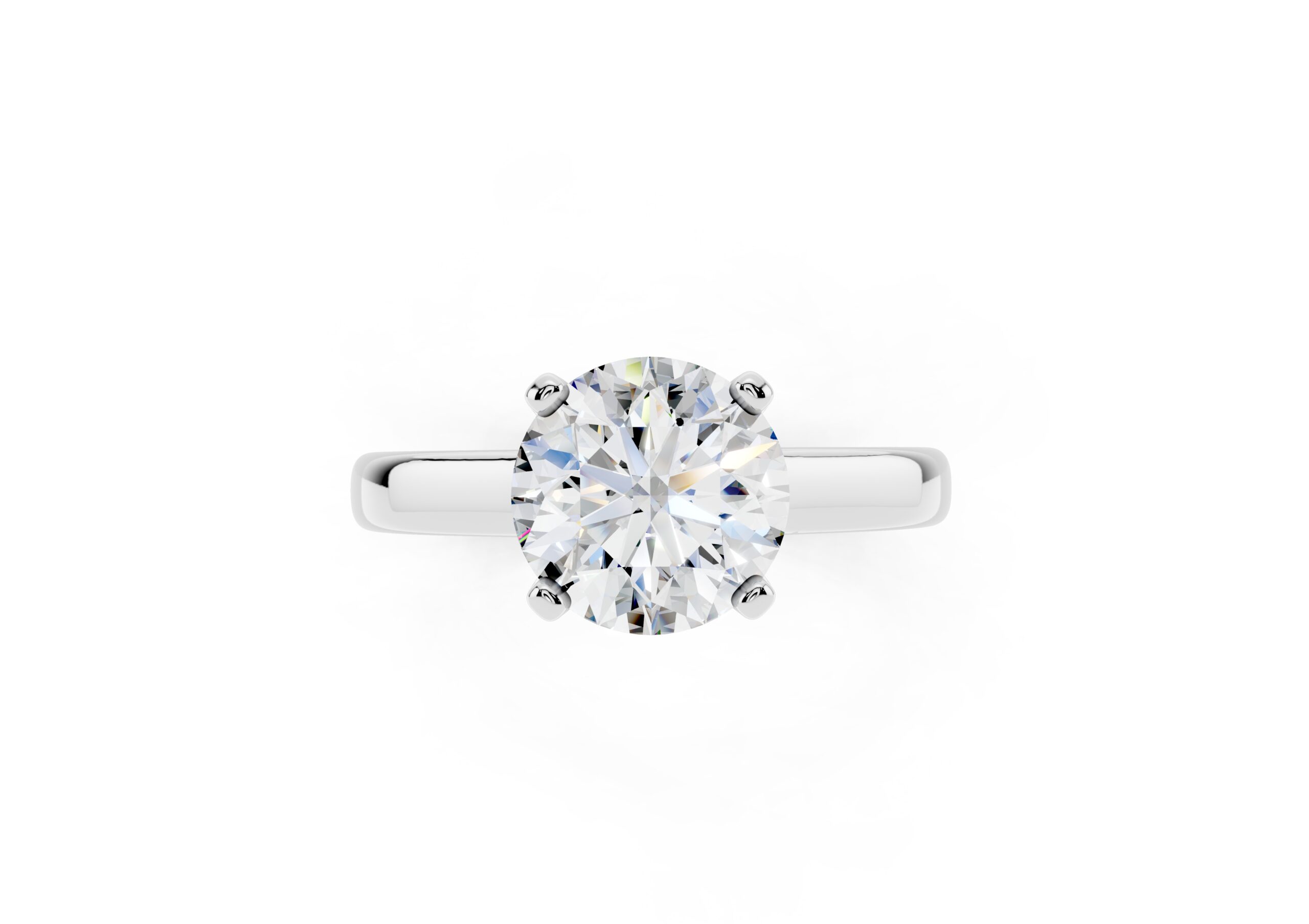 This solitaire is anything but subtle — featuring a commanding round diamond elevated in a clean four-prong setting atop a smooth, sculpted band. The proportions are bold yet balanced, designed to spotlight the center stone’s brilliance from every angle. Effortlessly elegant and unapologetically confident, it’s a modern icon made for a lifetime of attention.