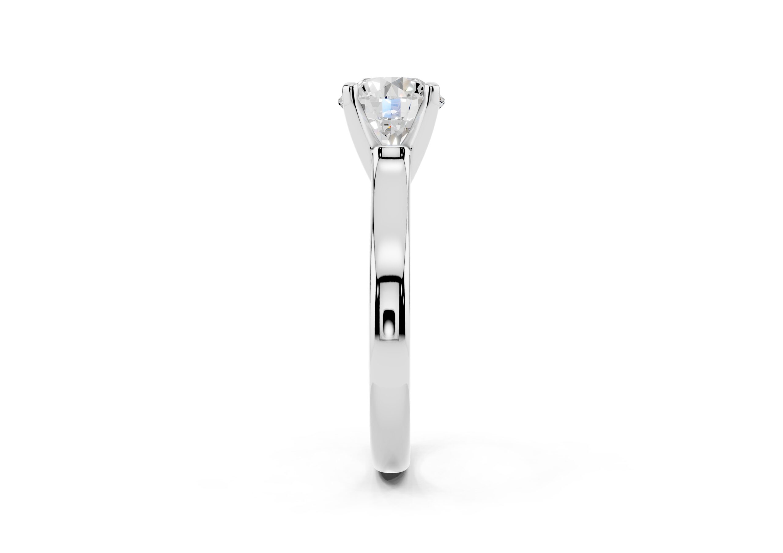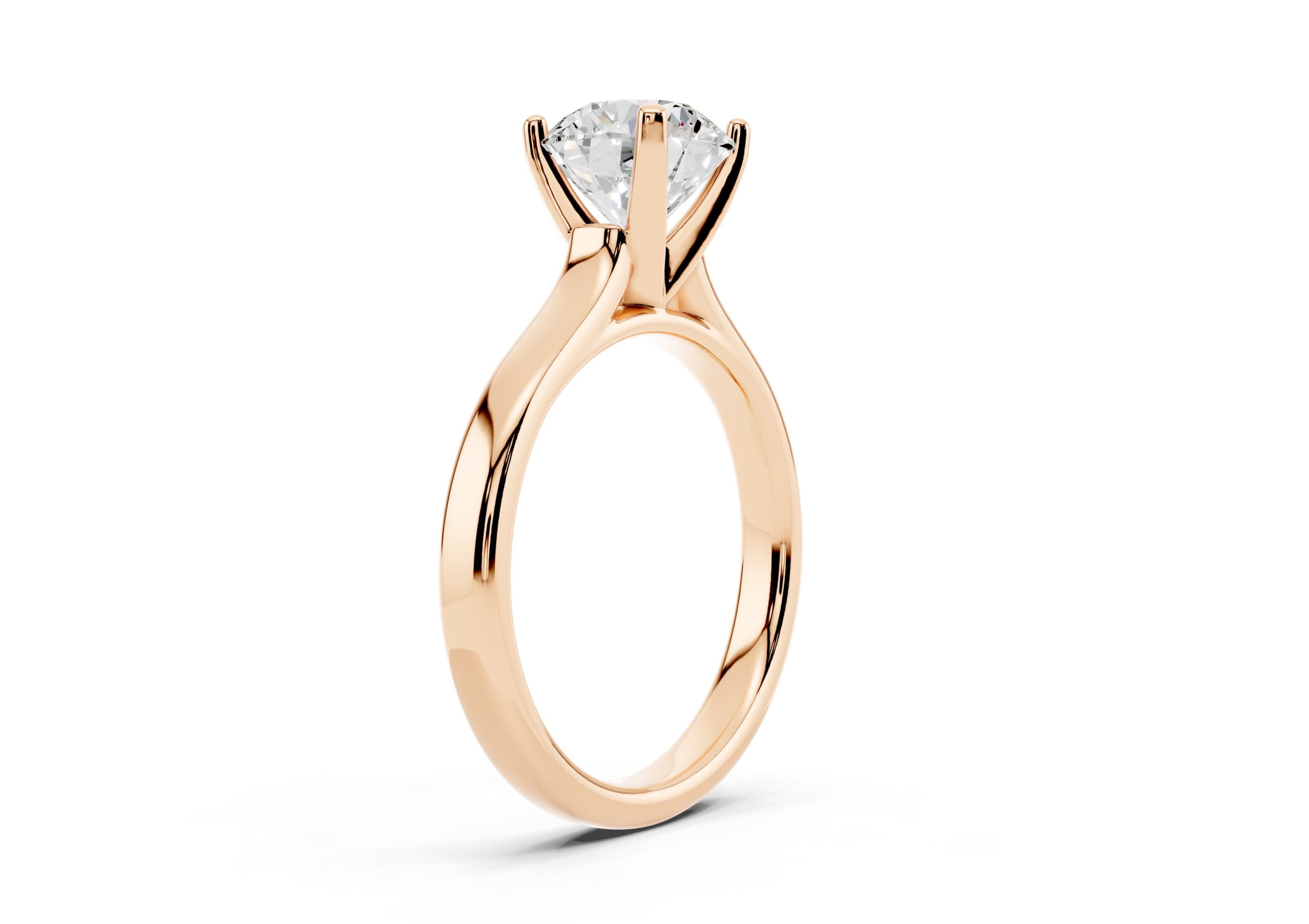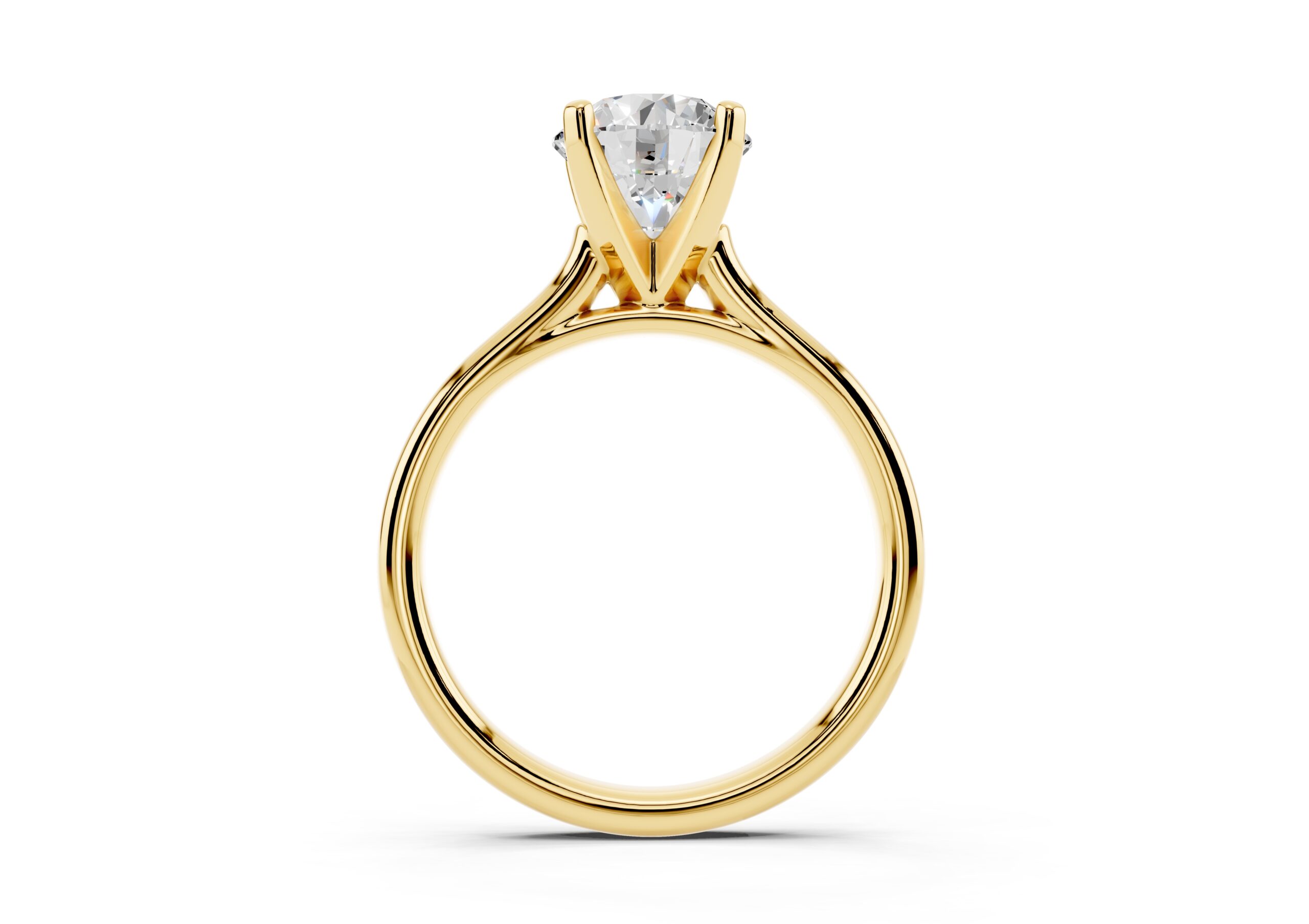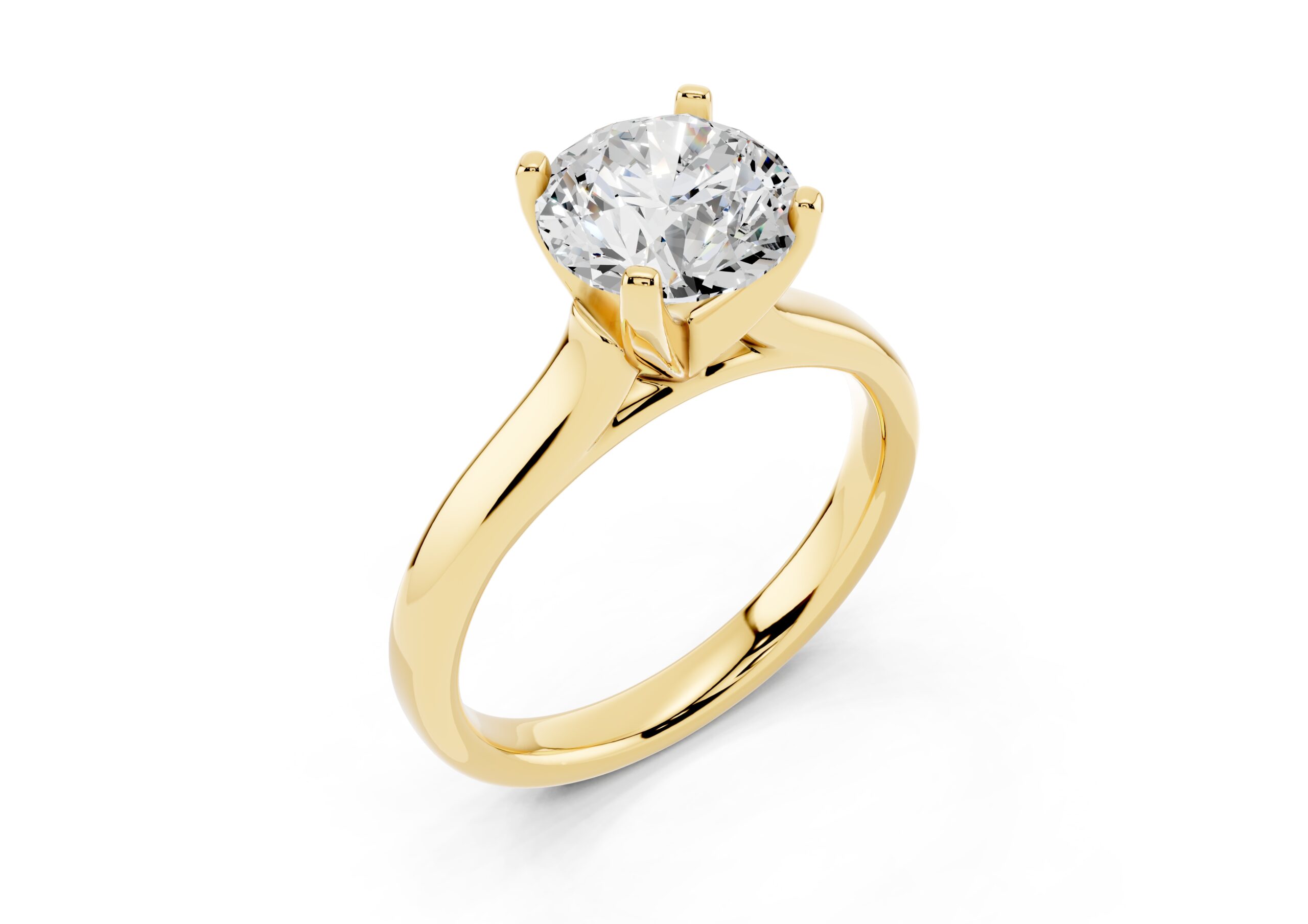 This solitaire is anything but subtle — featuring a commanding round diamond elevated in a clean four-prong setting atop a smooth, sculpted band. The proportions are bold yet balanced, designed to spotlight the center stone’s brilliance from every angle. Effortlessly elegant and unapologetically confident, it’s a modern icon made for a lifetime of attention.