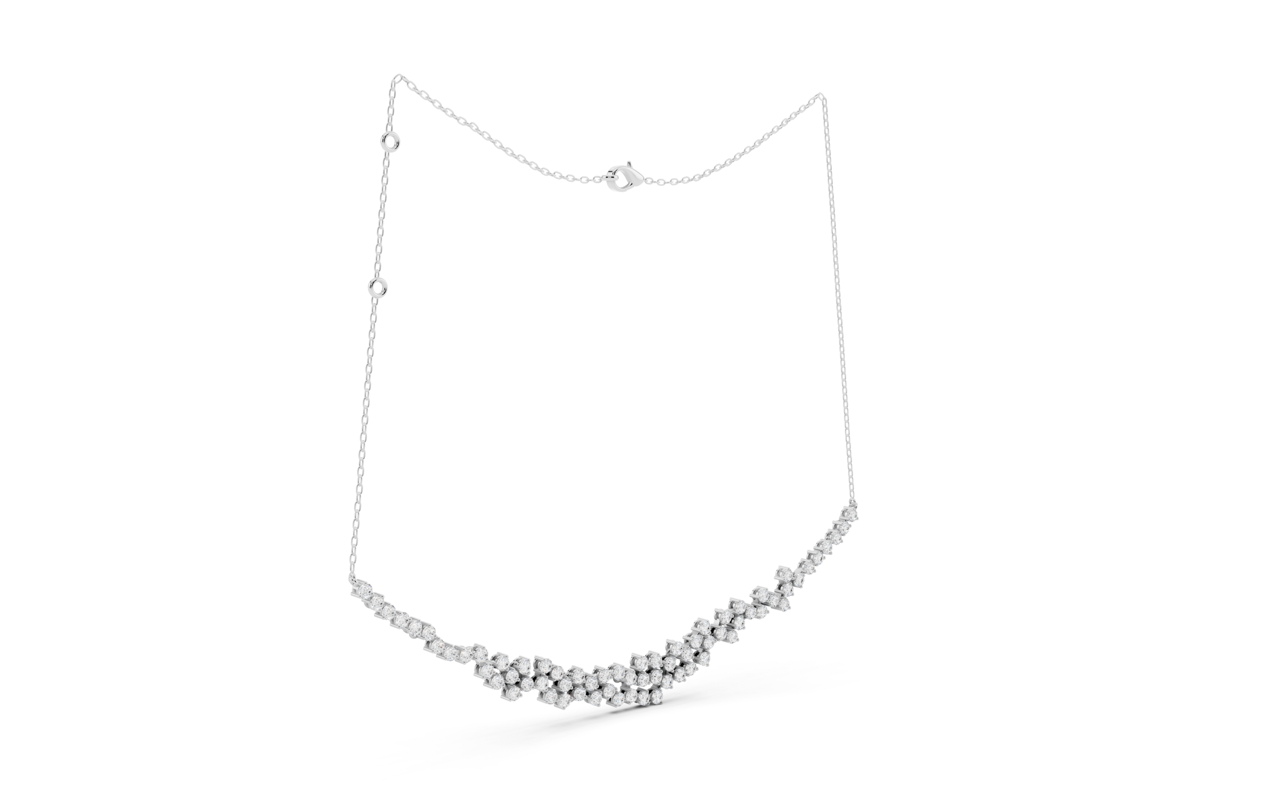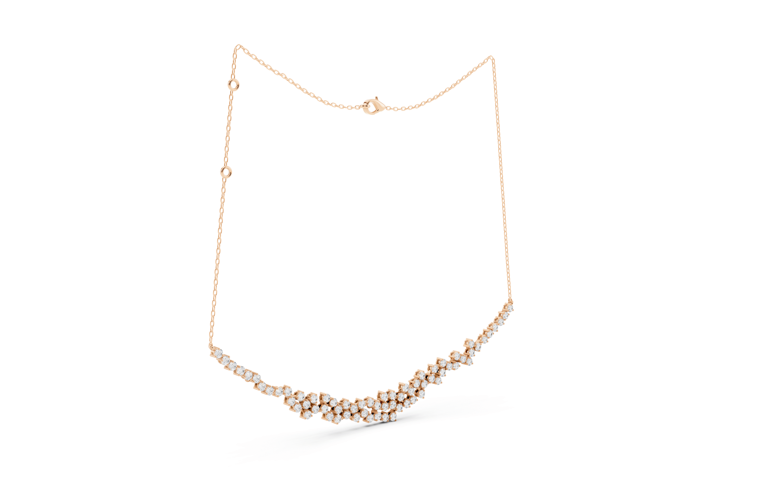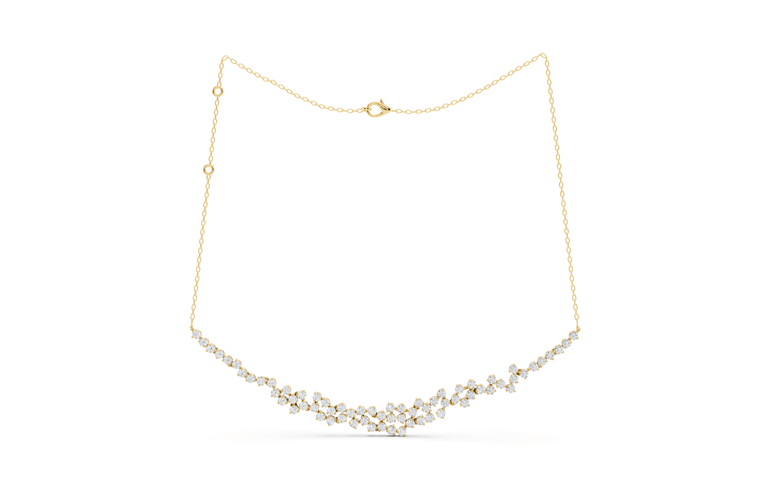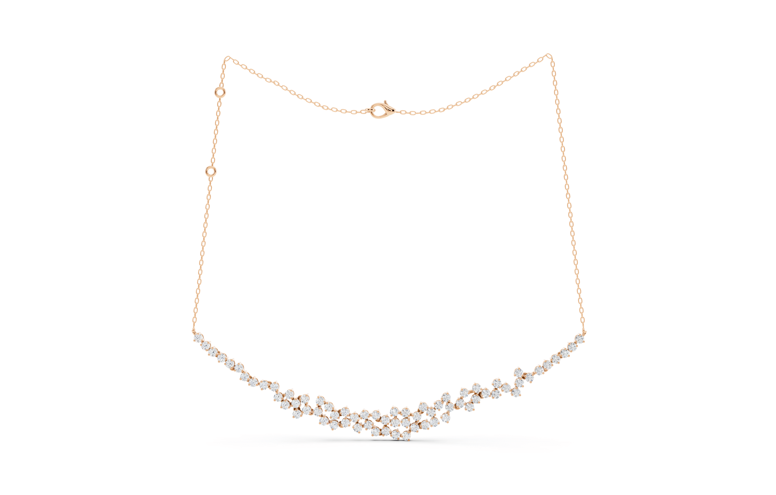 A graceful graduated necklace designed entirely with round stones in a clustered formation. The soft V-shaped contour accentuates the neckline, while the uniform cut ensures a timeless and balanced sparkle from every angle. Perfect for adding a refined yet radiant touch to any look.