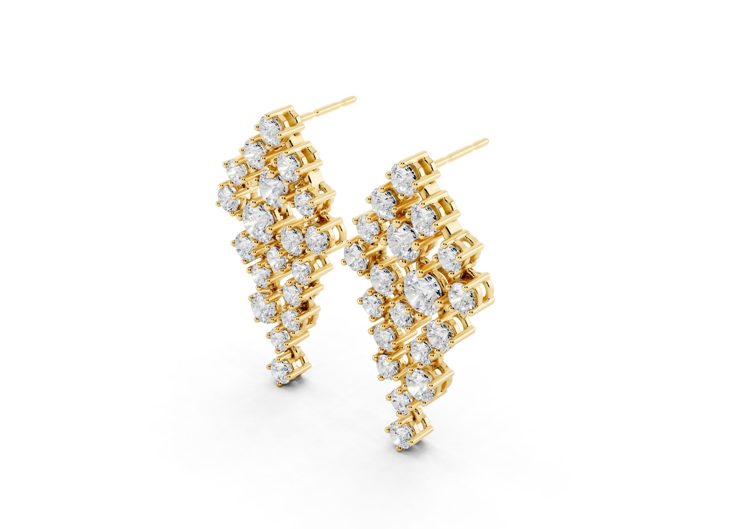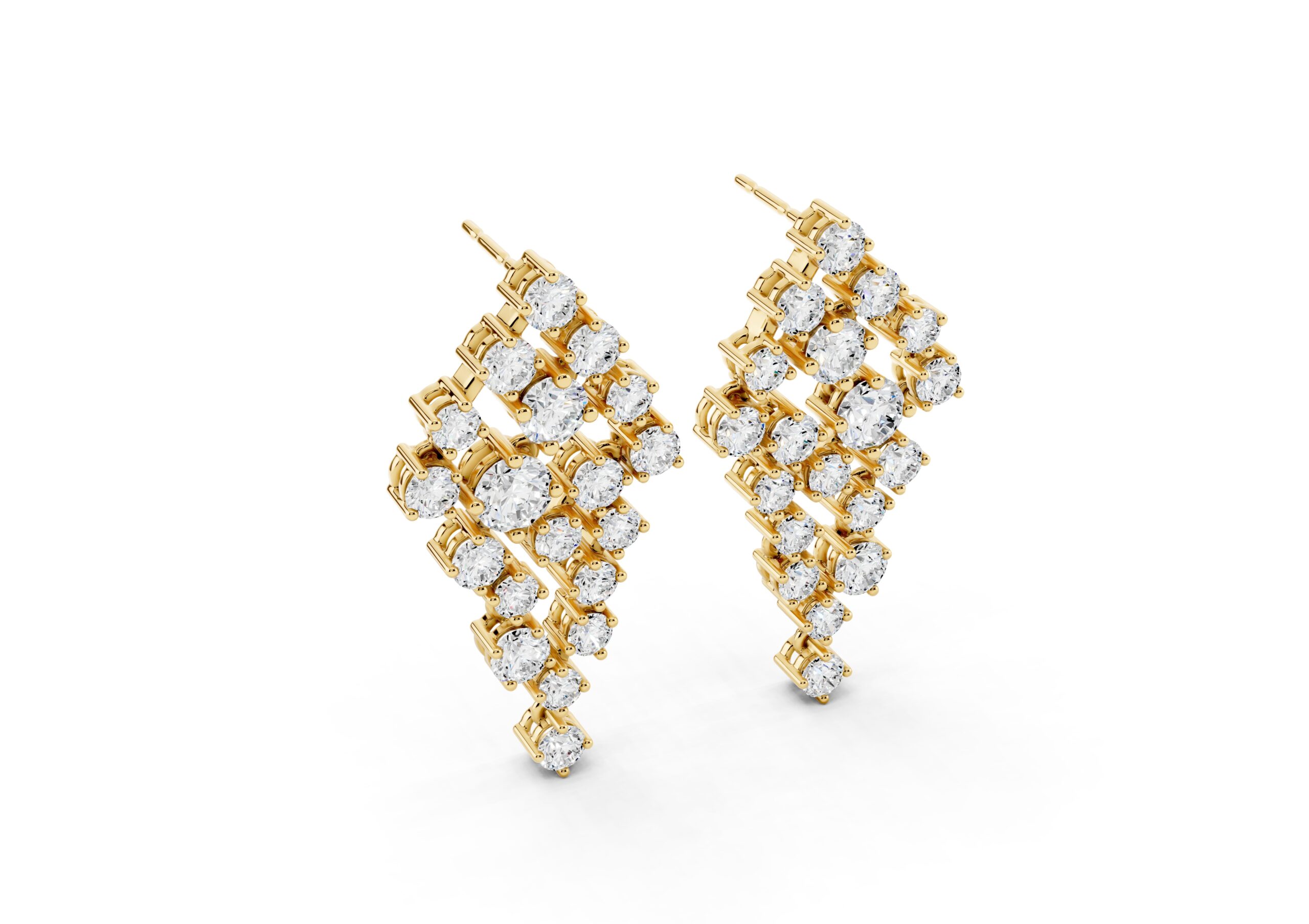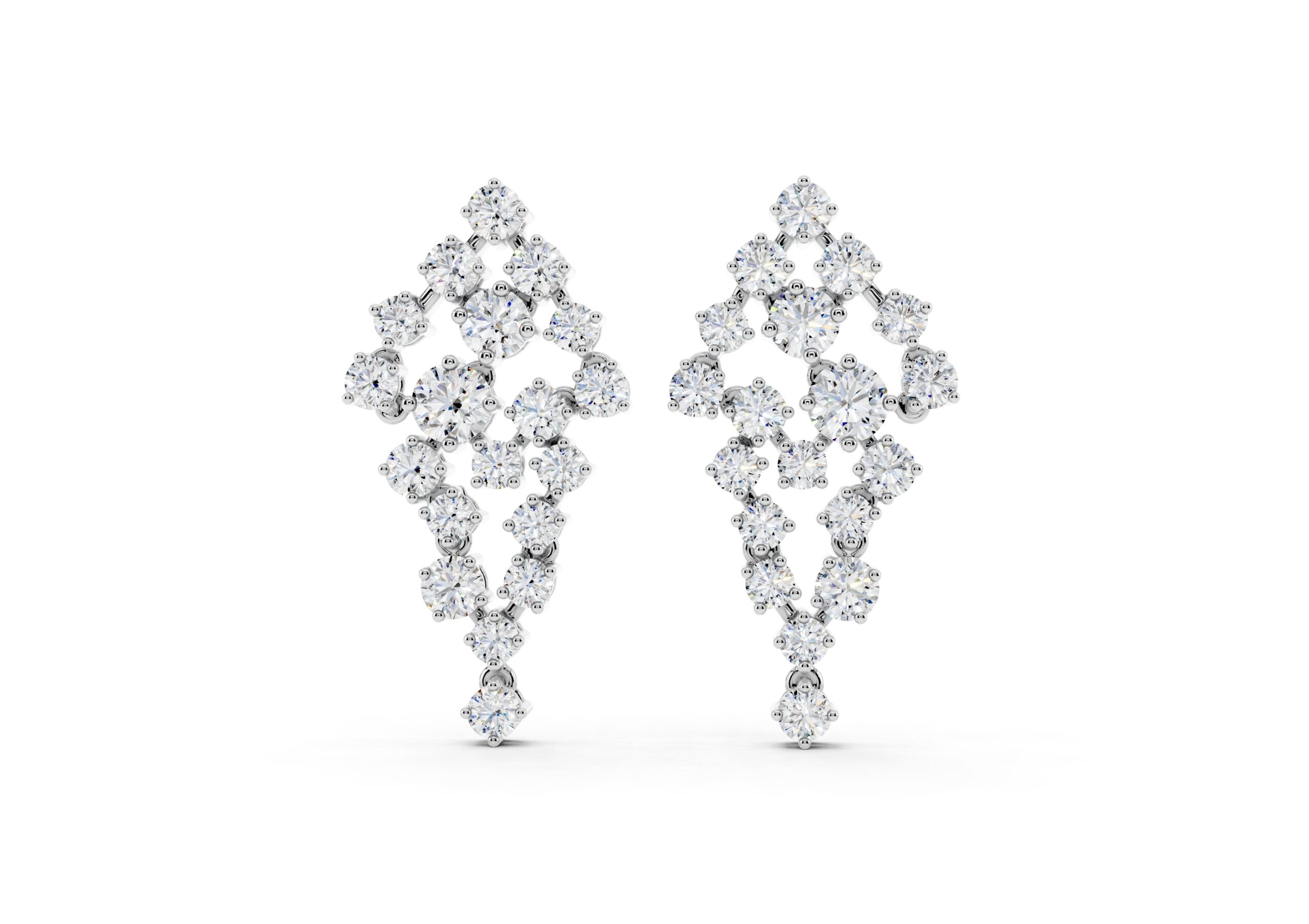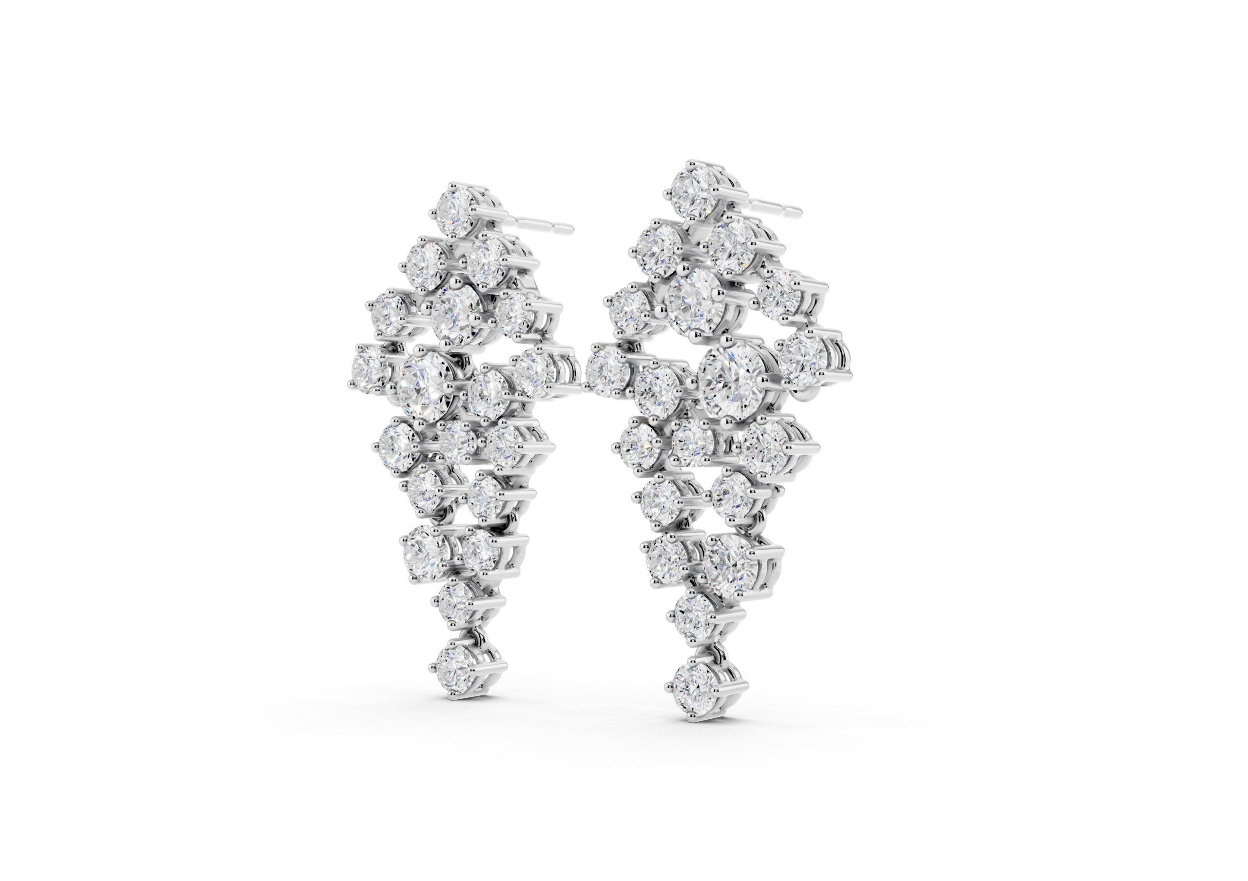 A celebration of structure and sparkle, these earrings are defined by a bold, tapering silhouette that draws the eye to the center — where a prominent round diamond anchors the entire design. Surrounded by a precisely arranged cluster of smaller stones, the central gem adds depth, dimension, and a quiet sense of power. The formation flows gracefully downward, balancing symmetry with brilliance for a look that feels sculptural yet fluid. A statement in poise, clarity, and confidence.