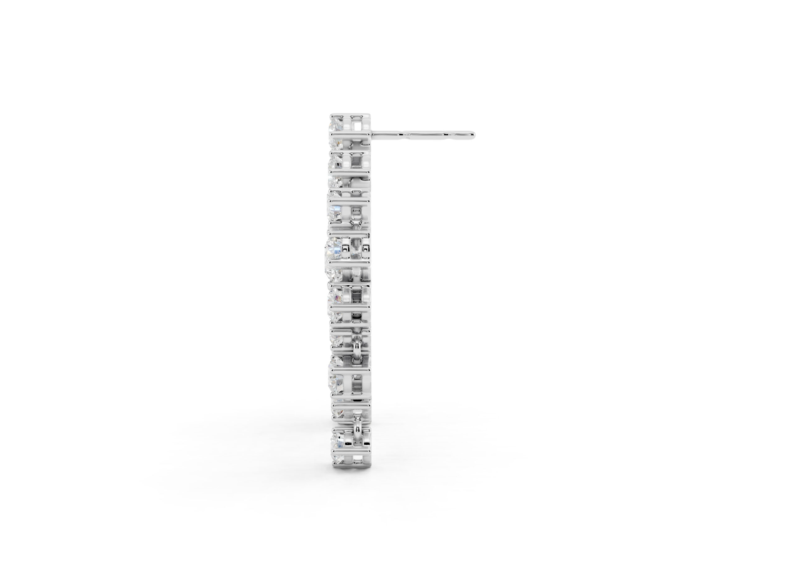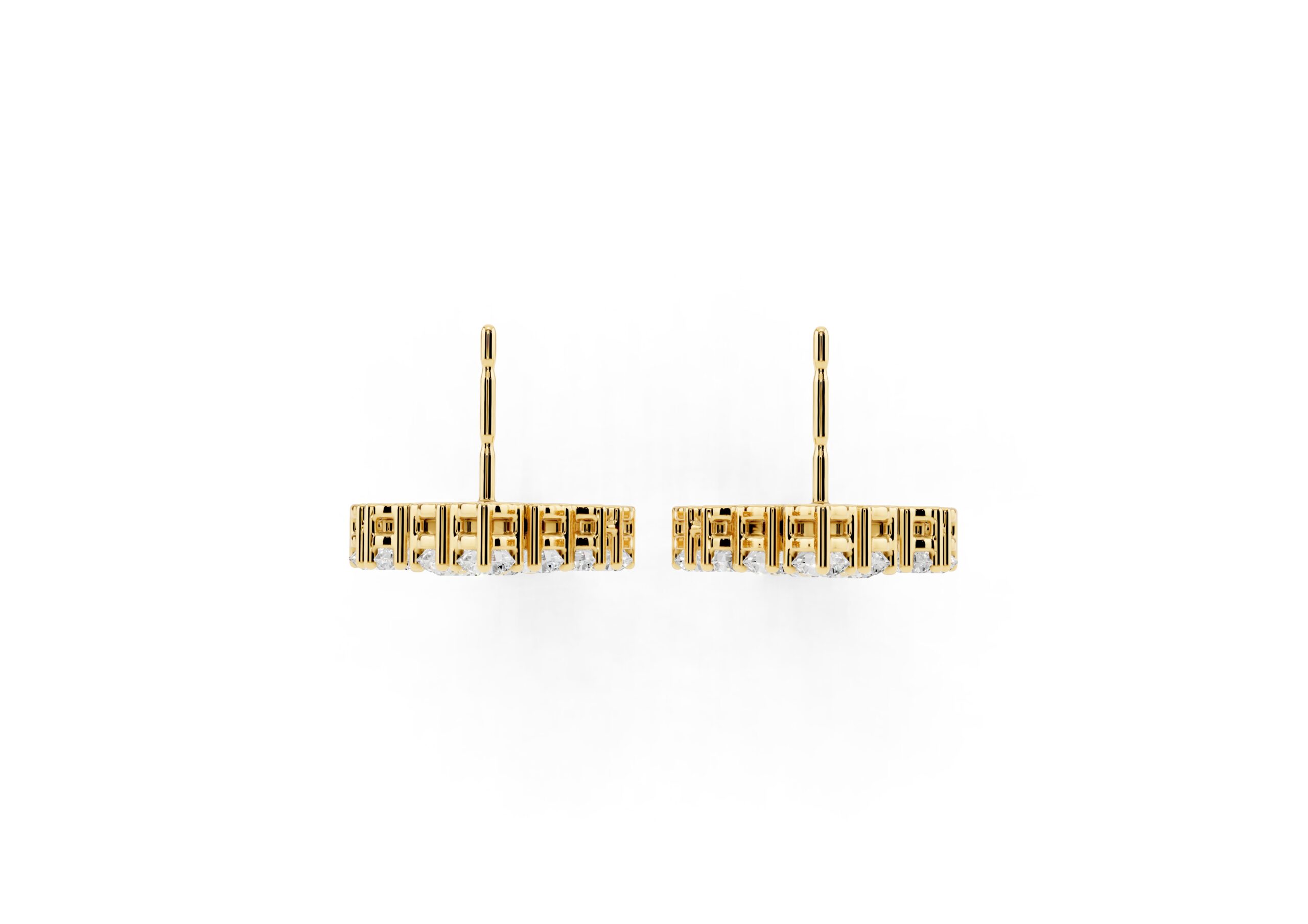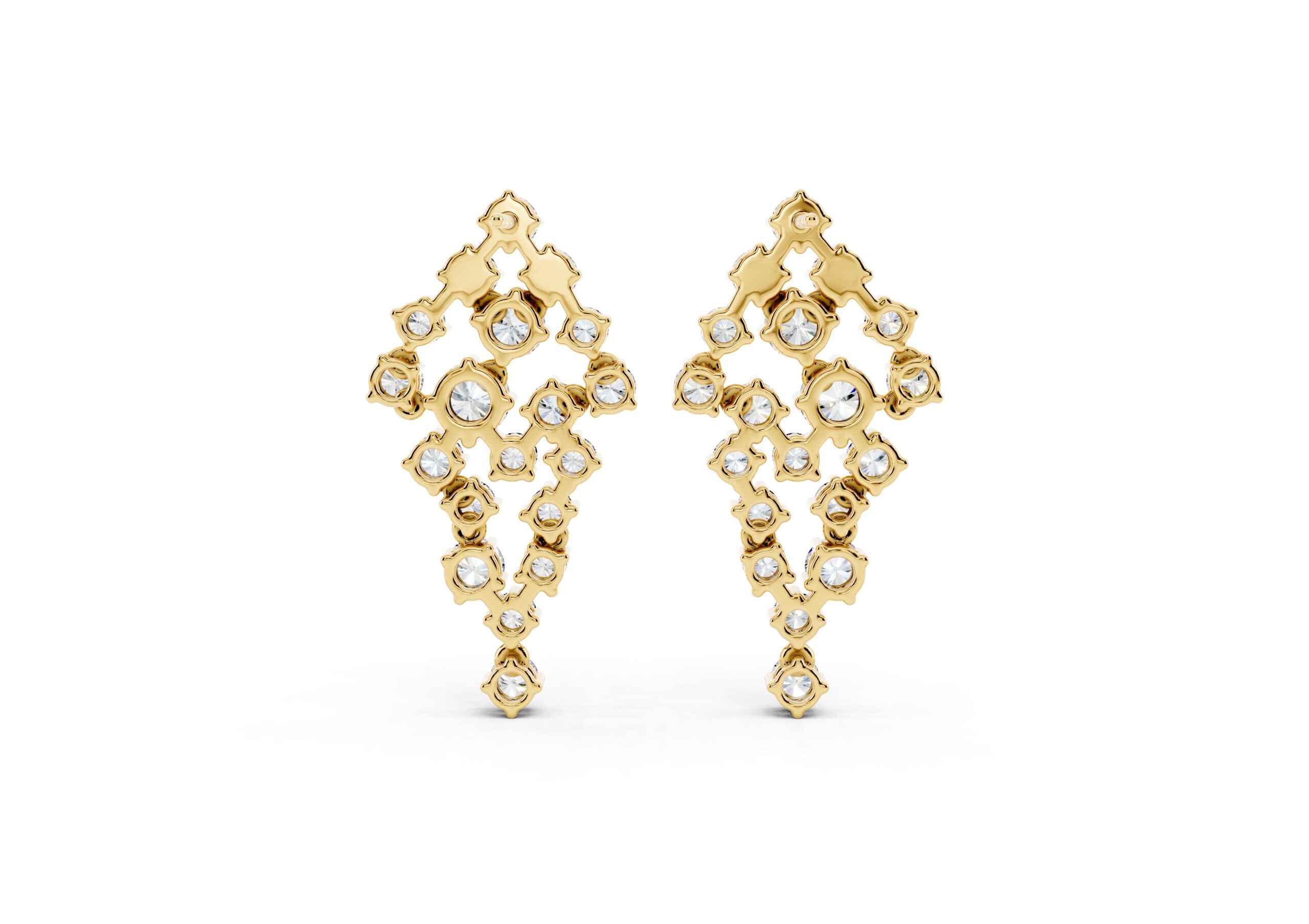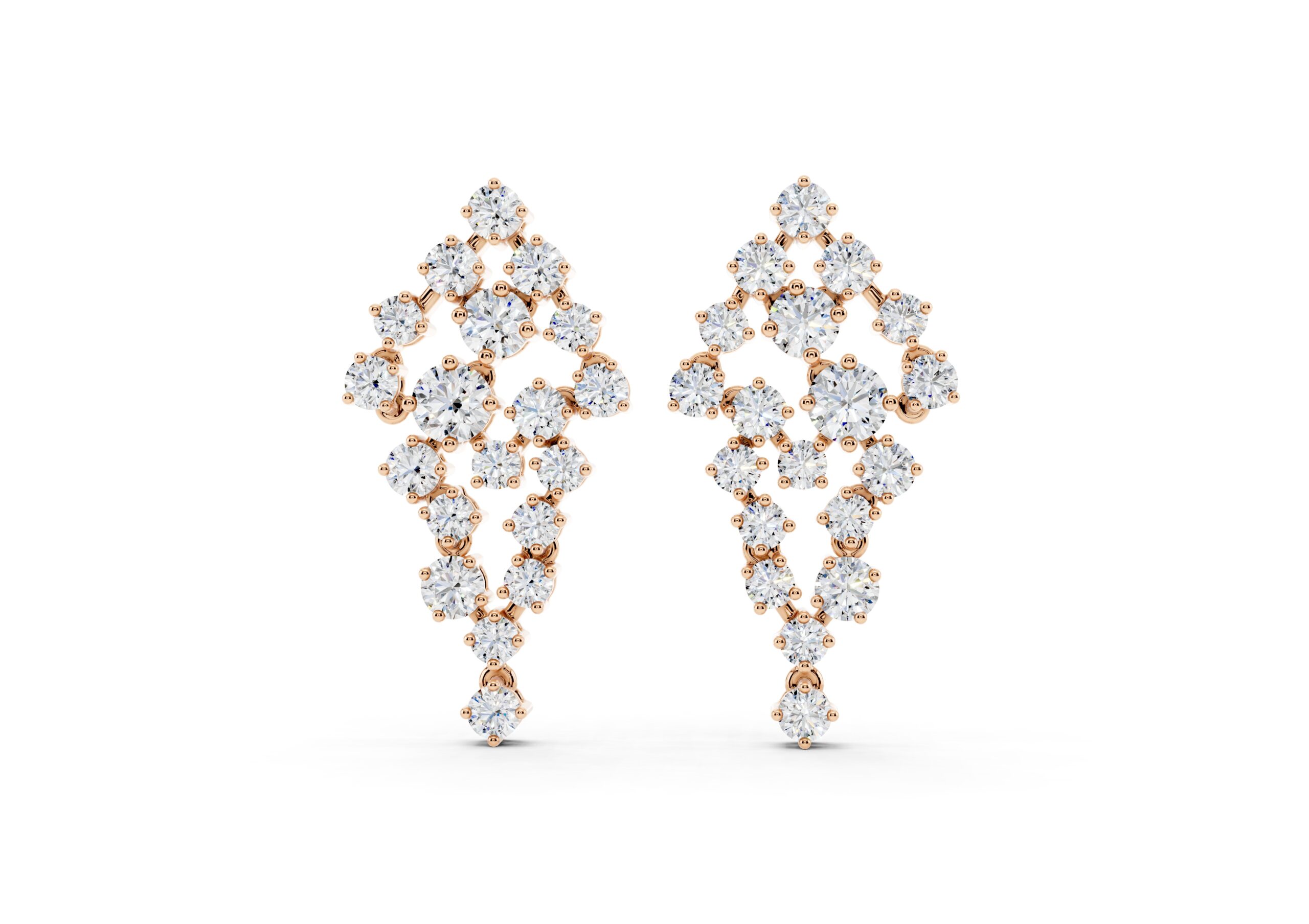 A celebration of structure and sparkle, these earrings are defined by a bold, tapering silhouette that draws the eye to the center — where a prominent round diamond anchors the entire design. Surrounded by a precisely arranged cluster of smaller stones, the central gem adds depth, dimension, and a quiet sense of power. The formation flows gracefully downward, balancing symmetry with brilliance for a look that feels sculptural yet fluid. A statement in poise, clarity, and confidence.