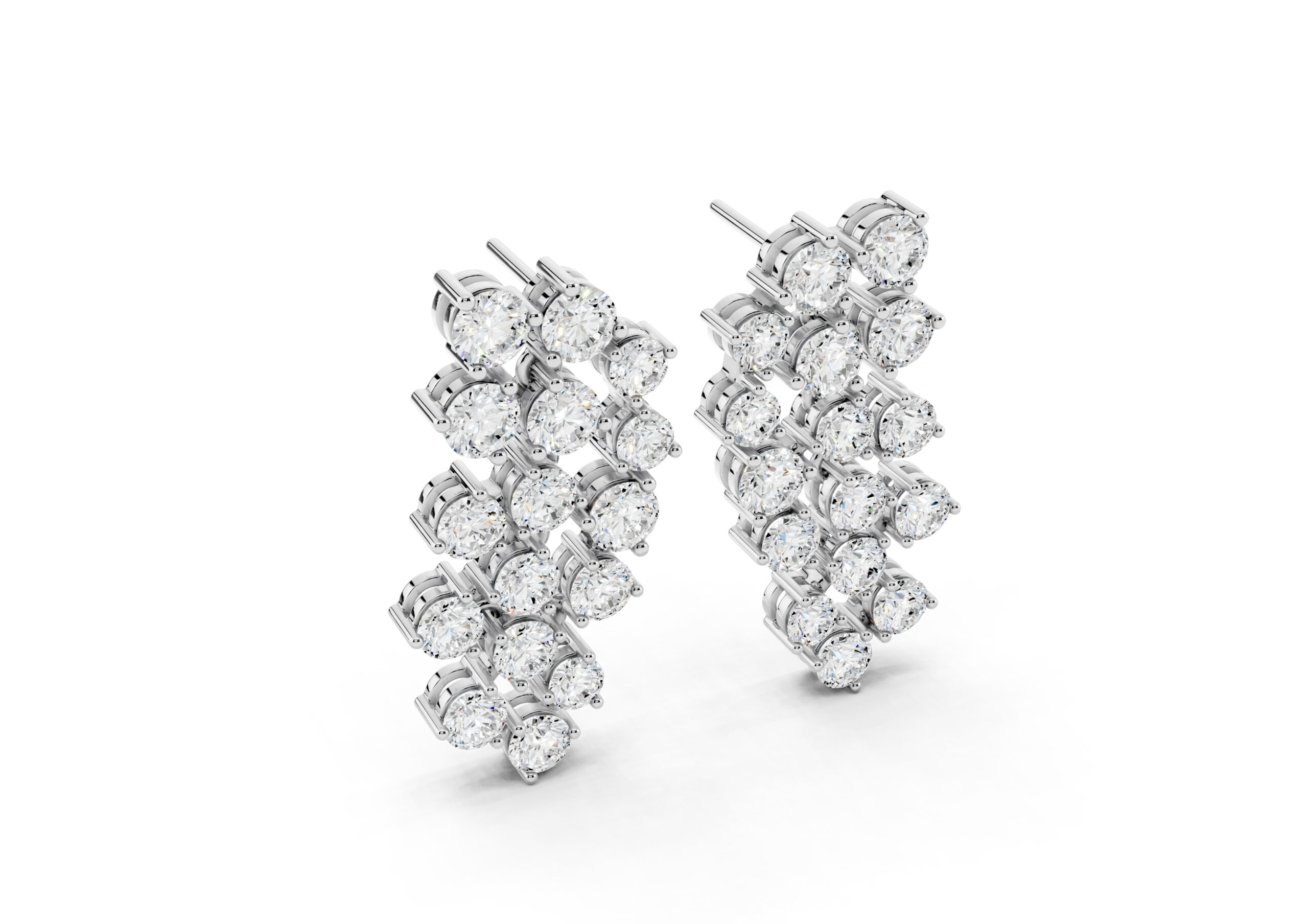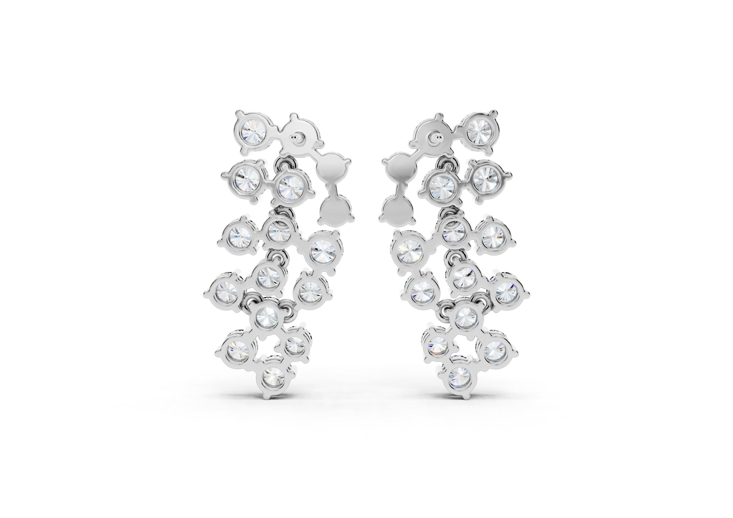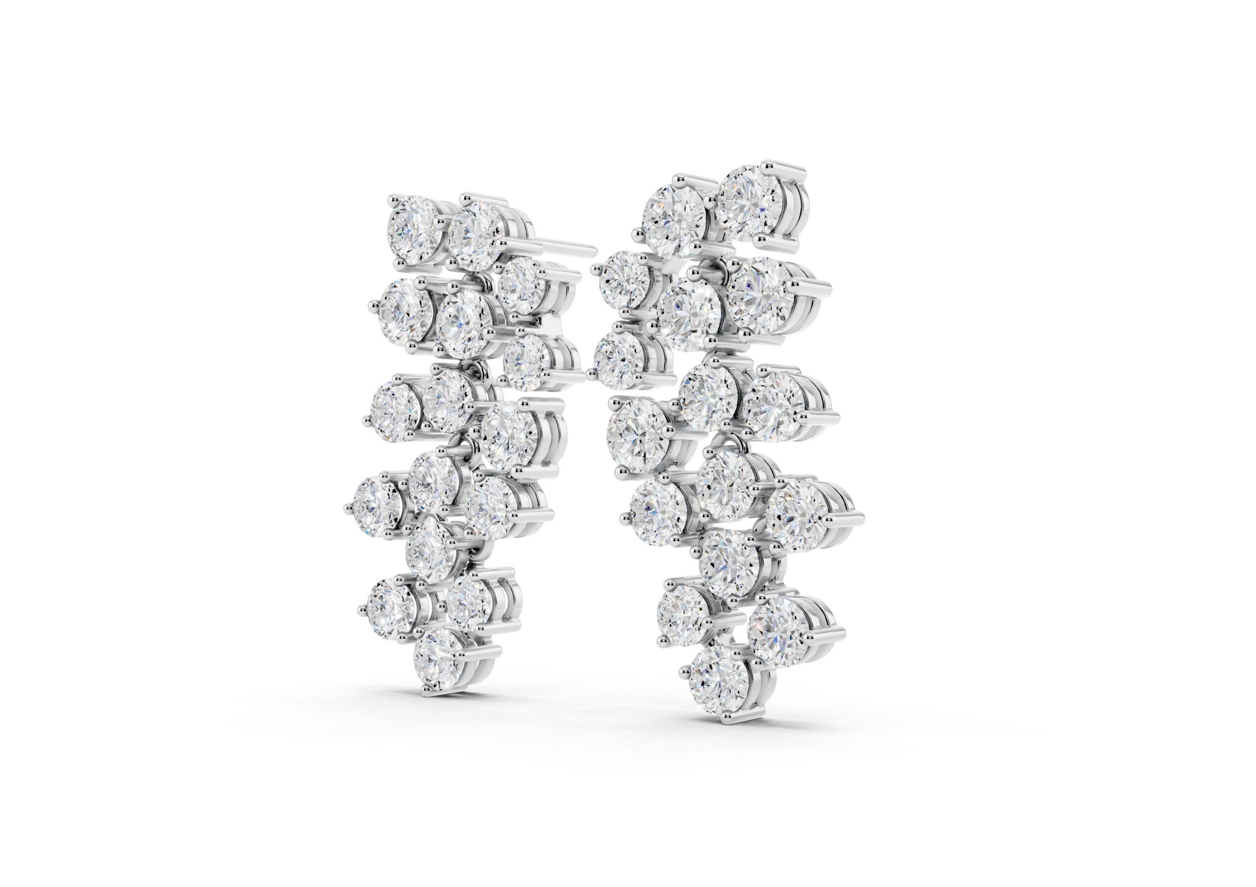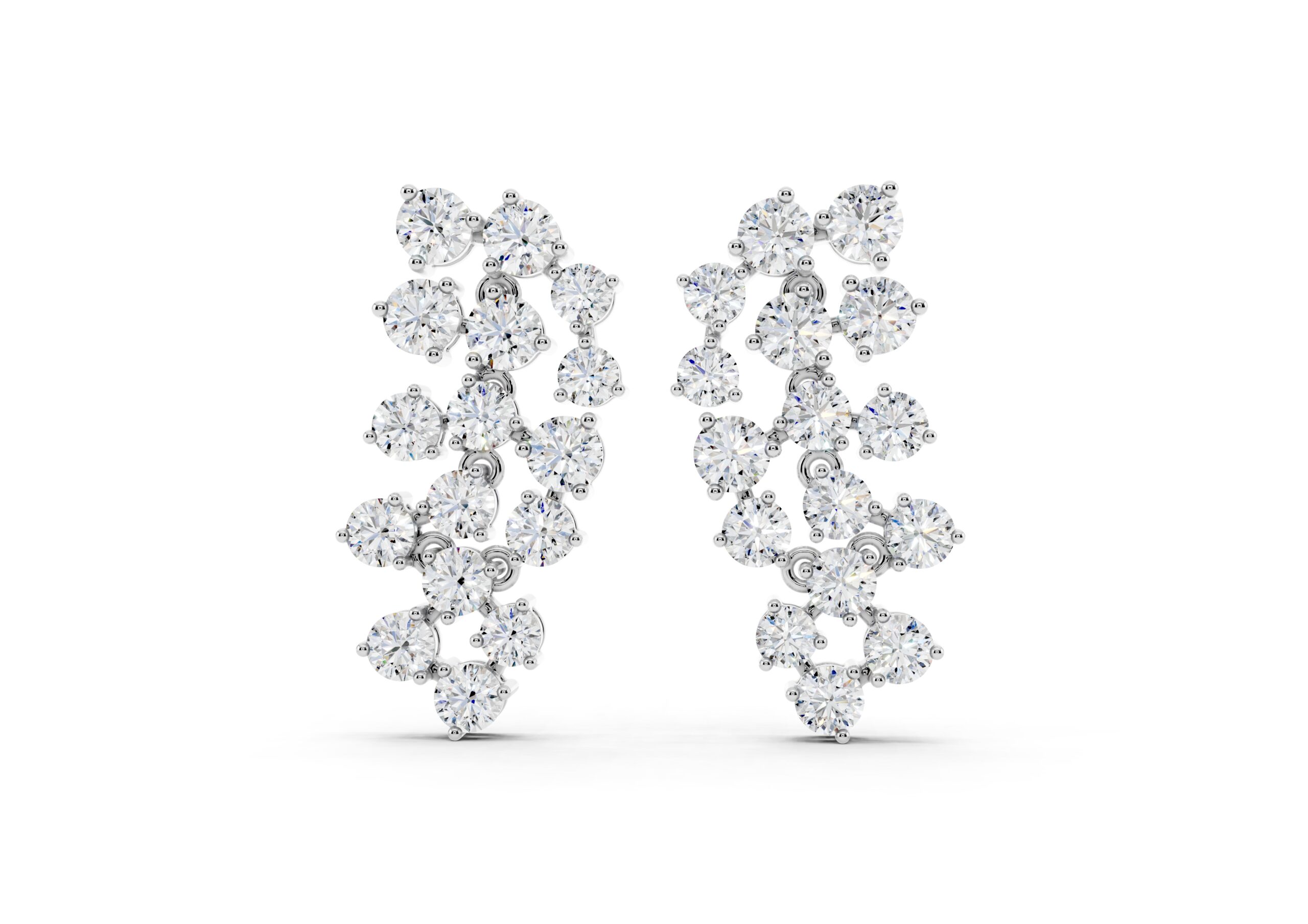 Crafted to mirror the flow of light, these earrings feature a cascading arrangement of round diamonds in a fluid, staggered pattern that creates maximum shimmer with refined movement. Their cool-toned finish gives the piece a crisp, modern edge — making it a go-to for occasions where elegance meets presence. Soft, sculptural, and unmistakably luxe.
