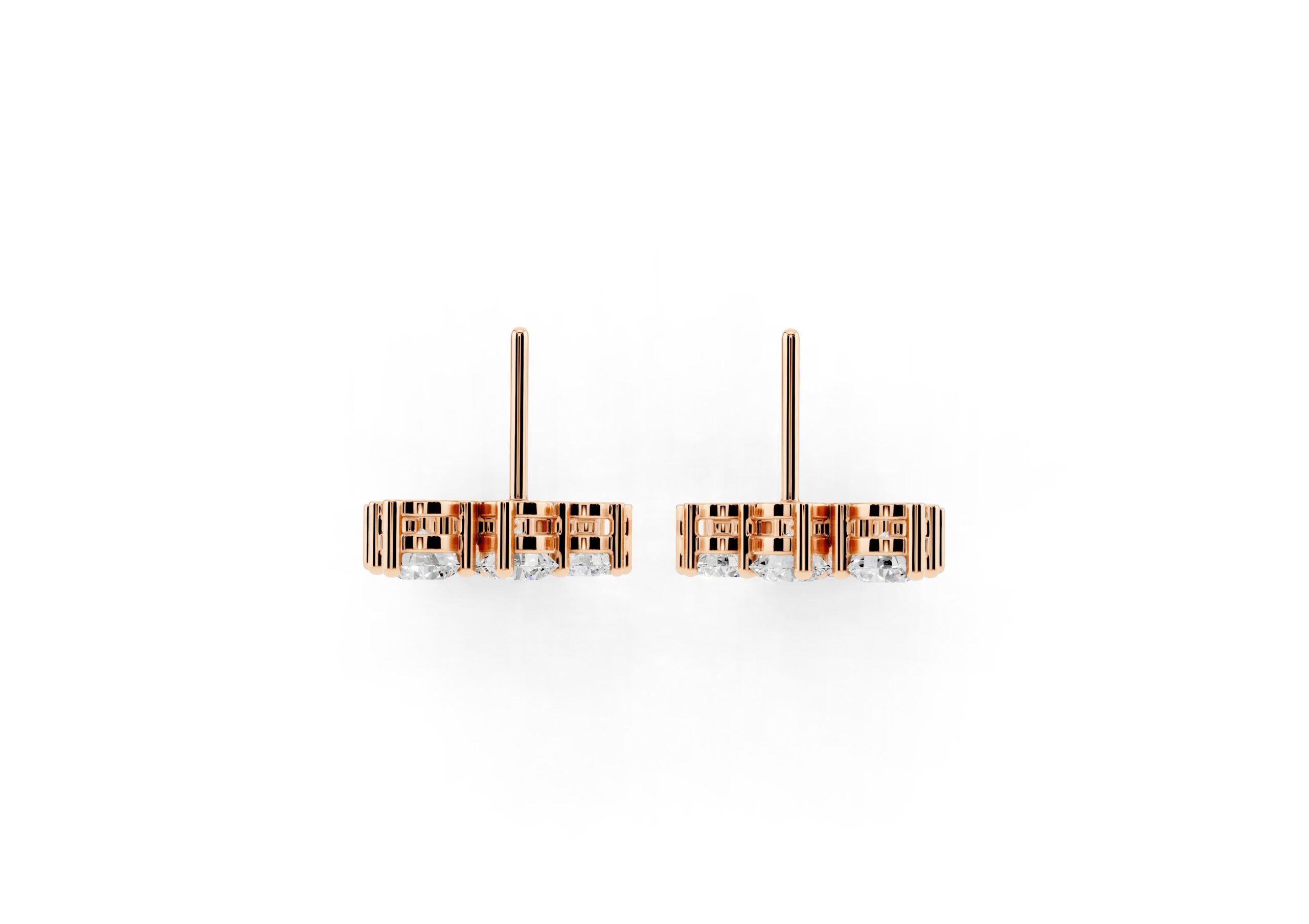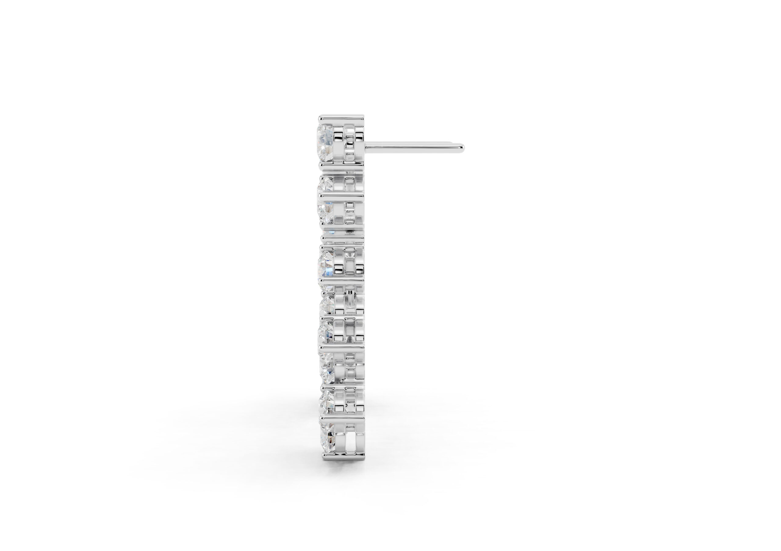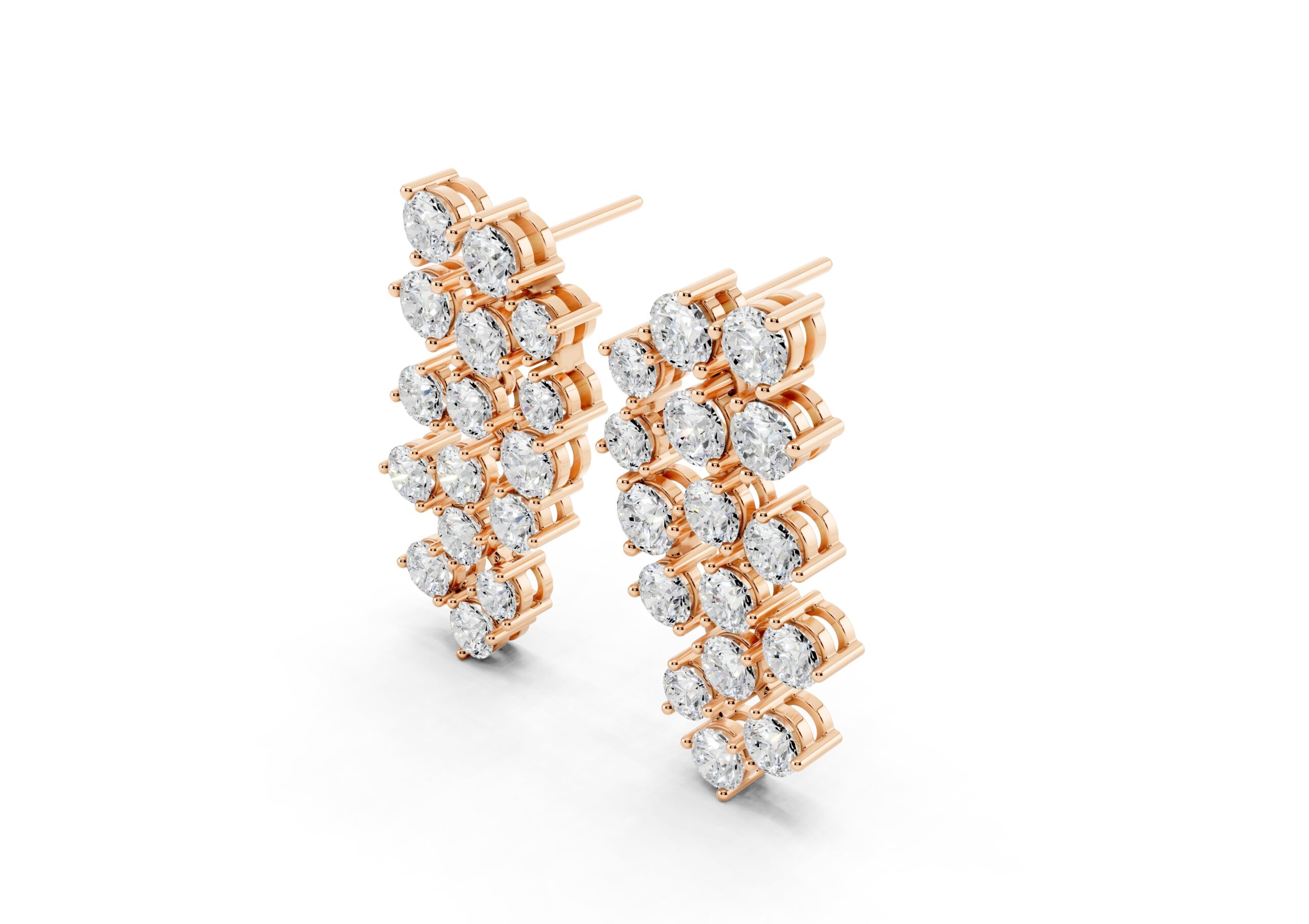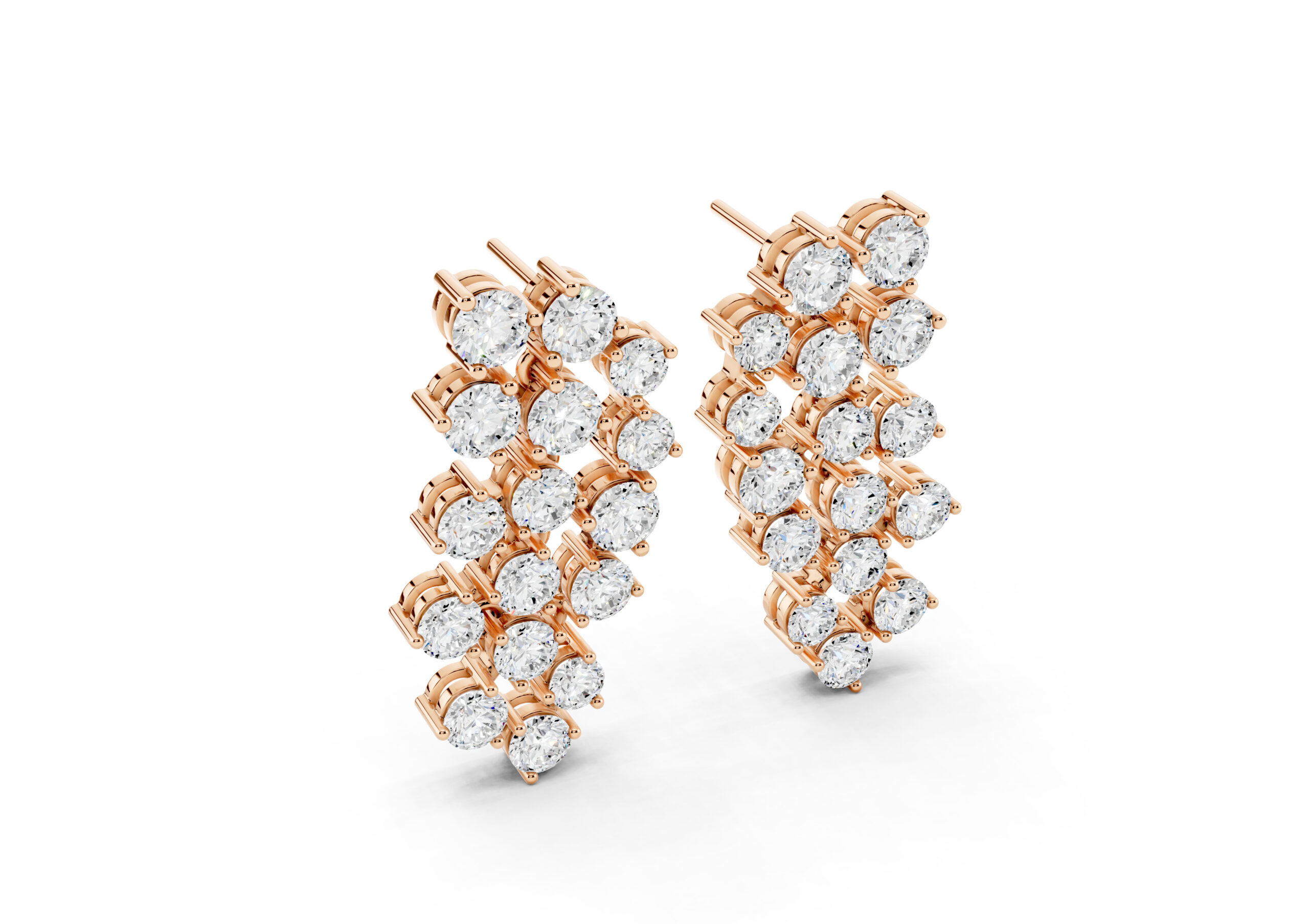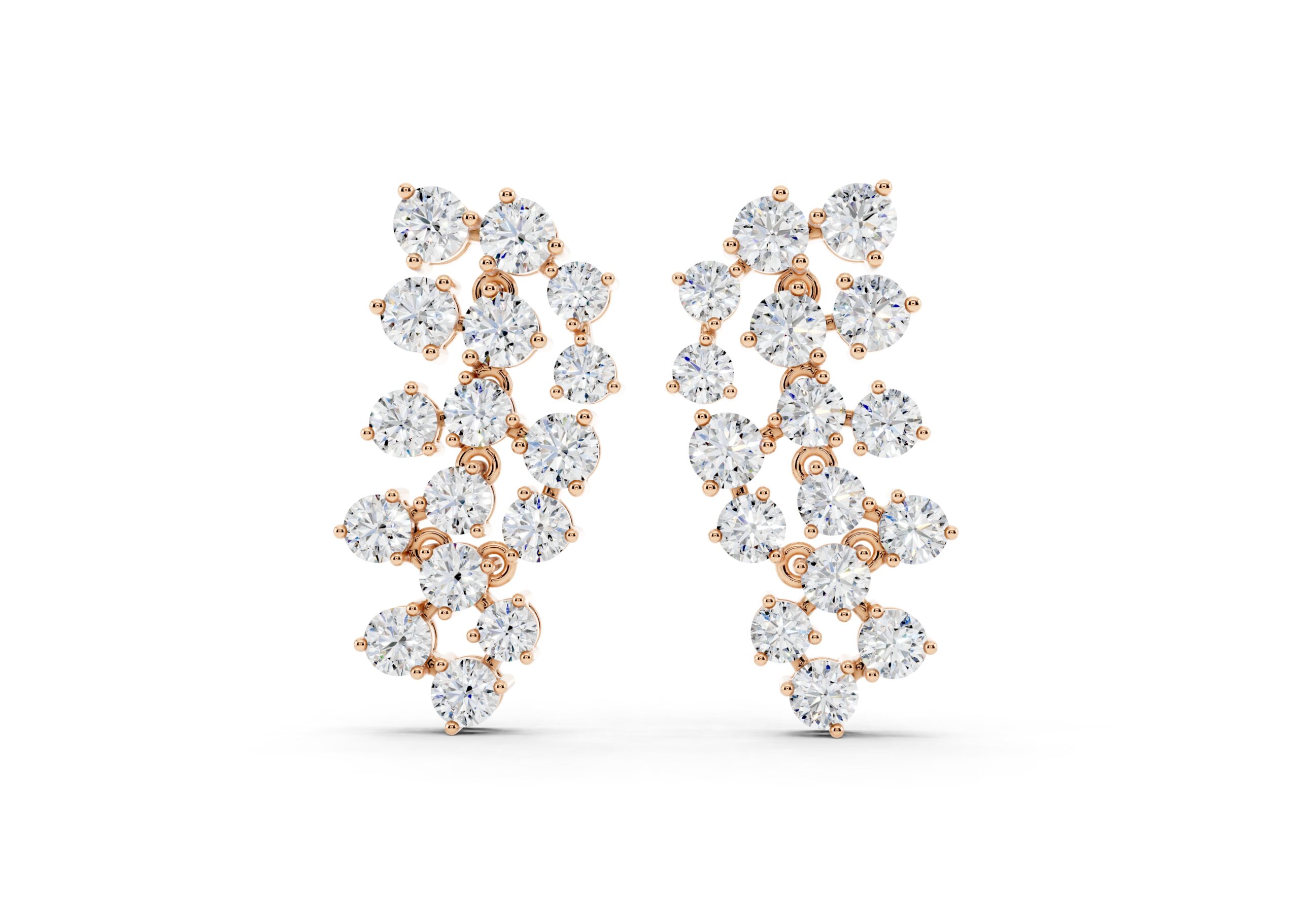 Crafted to mirror the flow of light, these earrings feature a cascading arrangement of round diamonds in a fluid, staggered pattern that creates maximum shimmer with refined movement. Their cool-toned finish gives the piece a crisp, modern edge — making it a go-to for occasions where elegance meets presence. Soft, sculptural, and unmistakably luxe.