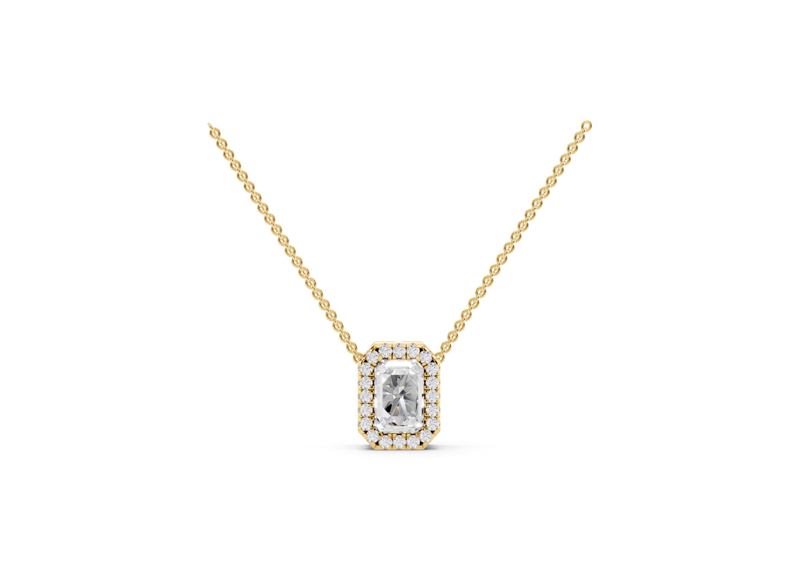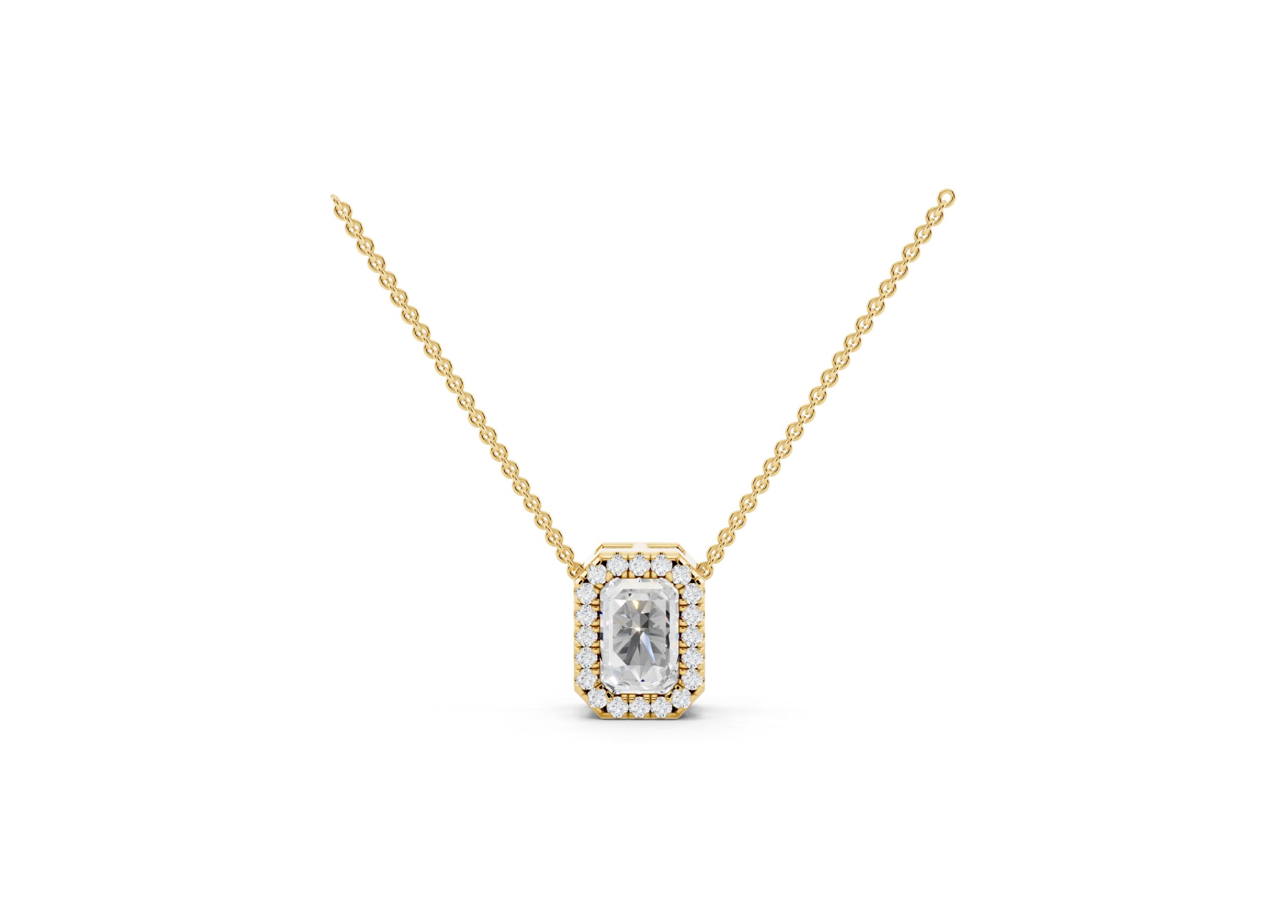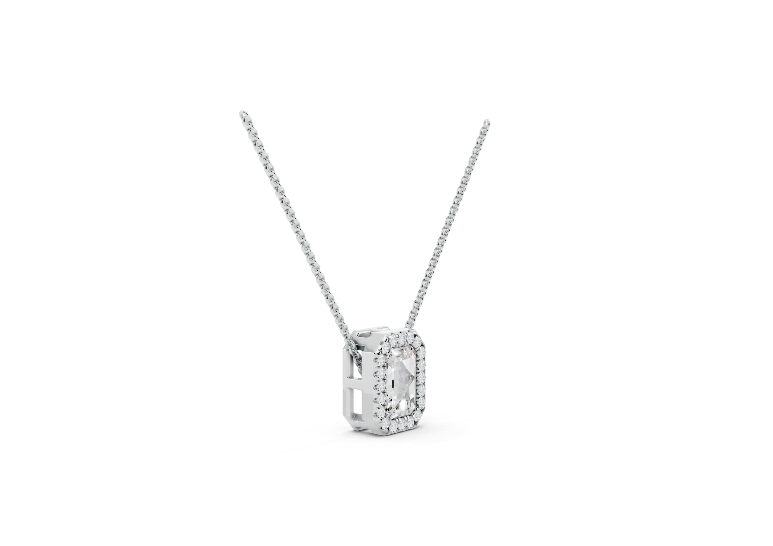 This pendant features a sleek emerald-cut diamond embraced by a delicate halo of round stones, emphasizing clean lines and timeless geometry. The octagonal silhouette enhances the pendant’s vintage charm, while the refined setting ensures the center stone remains the focal point. Suspended from a classic chain, it’s a versatile piece that brings quiet sophistication to everyday luxury.