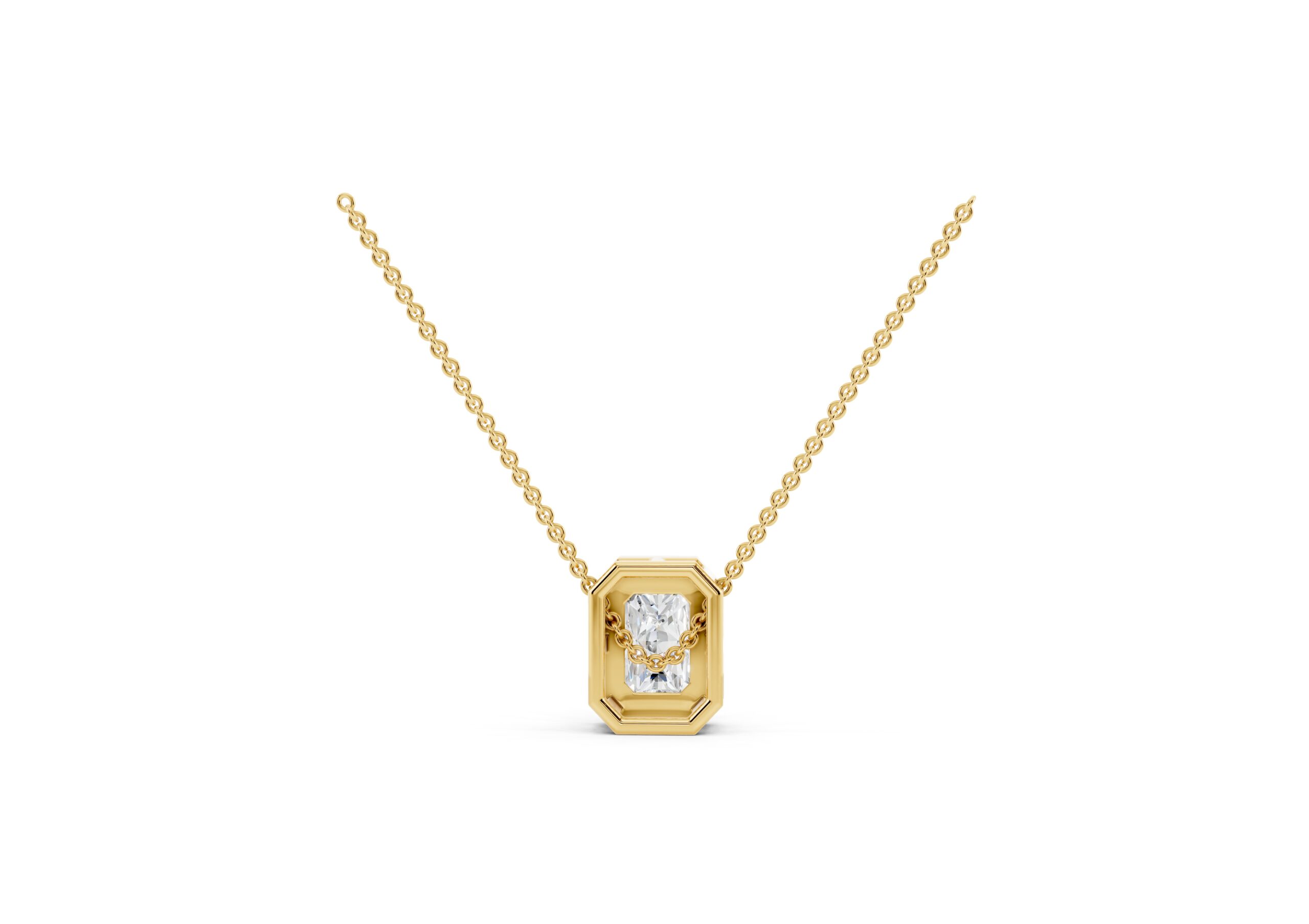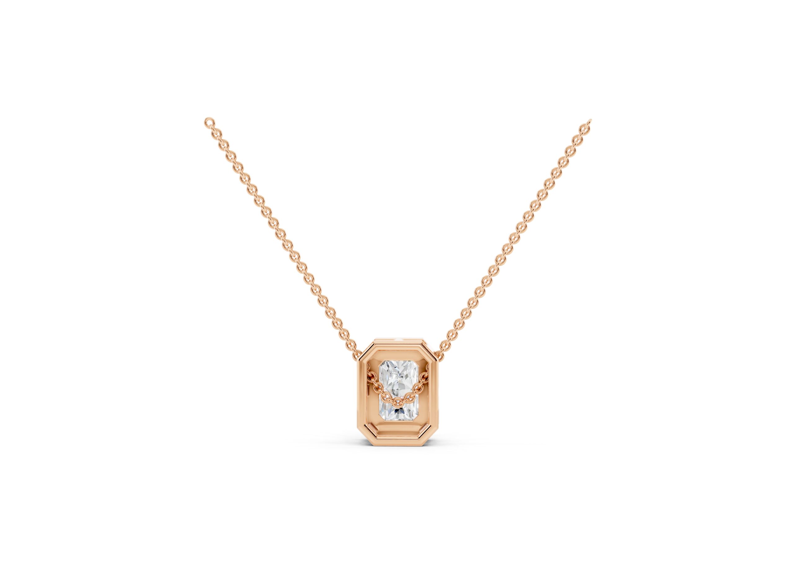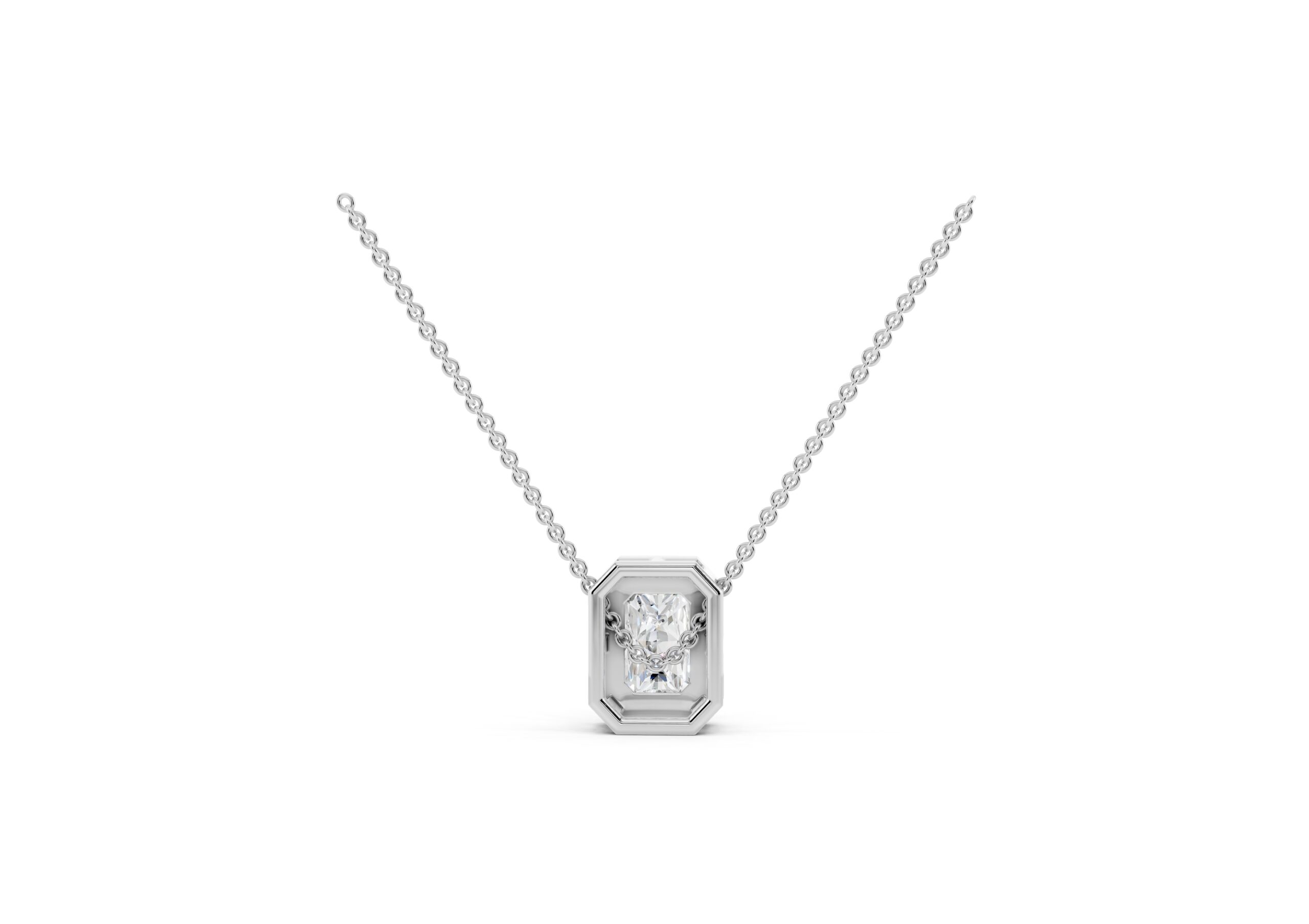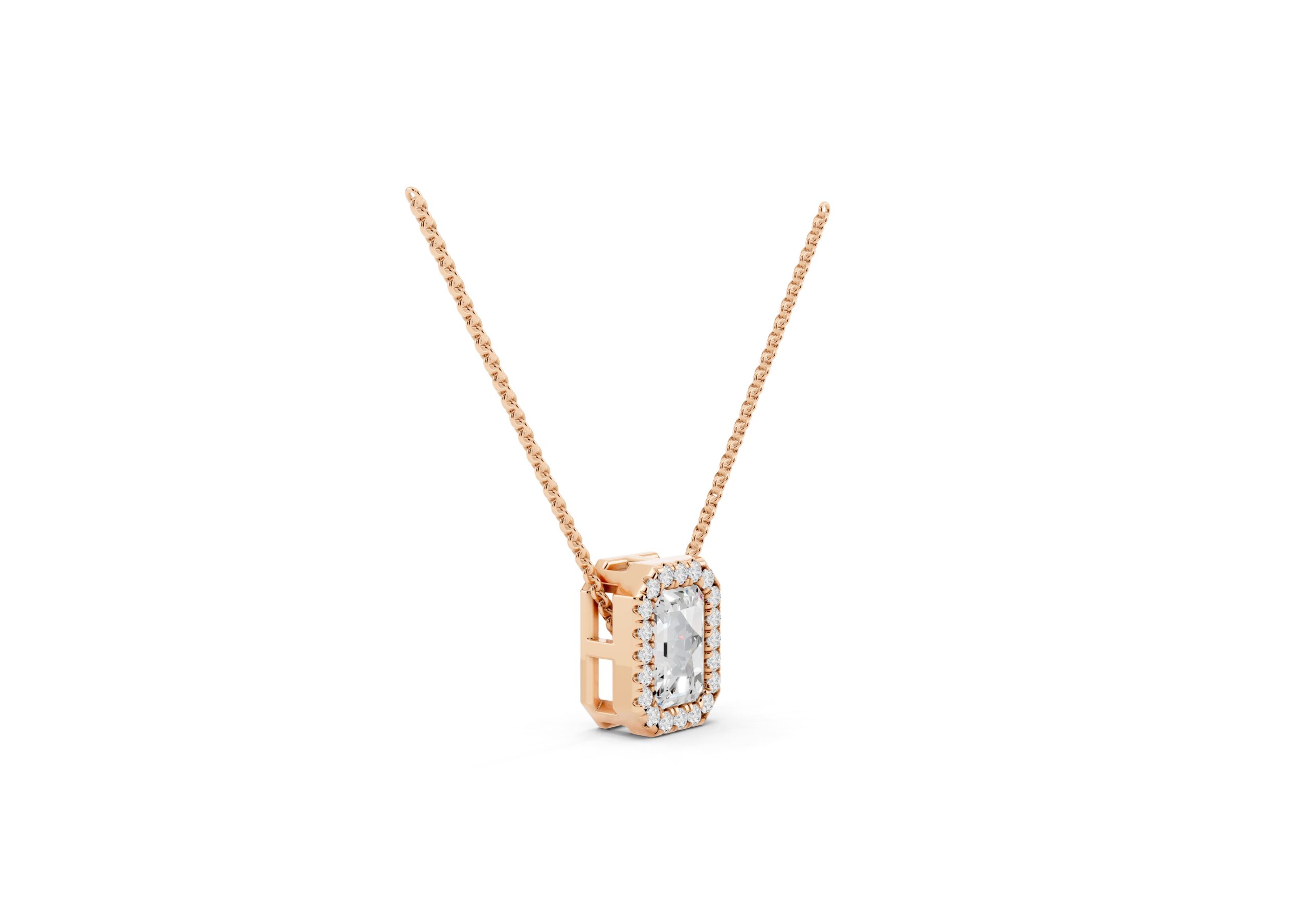 This pendant features a sleek emerald-cut diamond embraced by a delicate halo of round stones, emphasizing clean lines and timeless geometry. The octagonal silhouette enhances the pendant’s vintage charm, while the refined setting ensures the center stone remains the focal point. Suspended from a classic chain, it’s a versatile piece that brings quiet sophistication to everyday luxury.