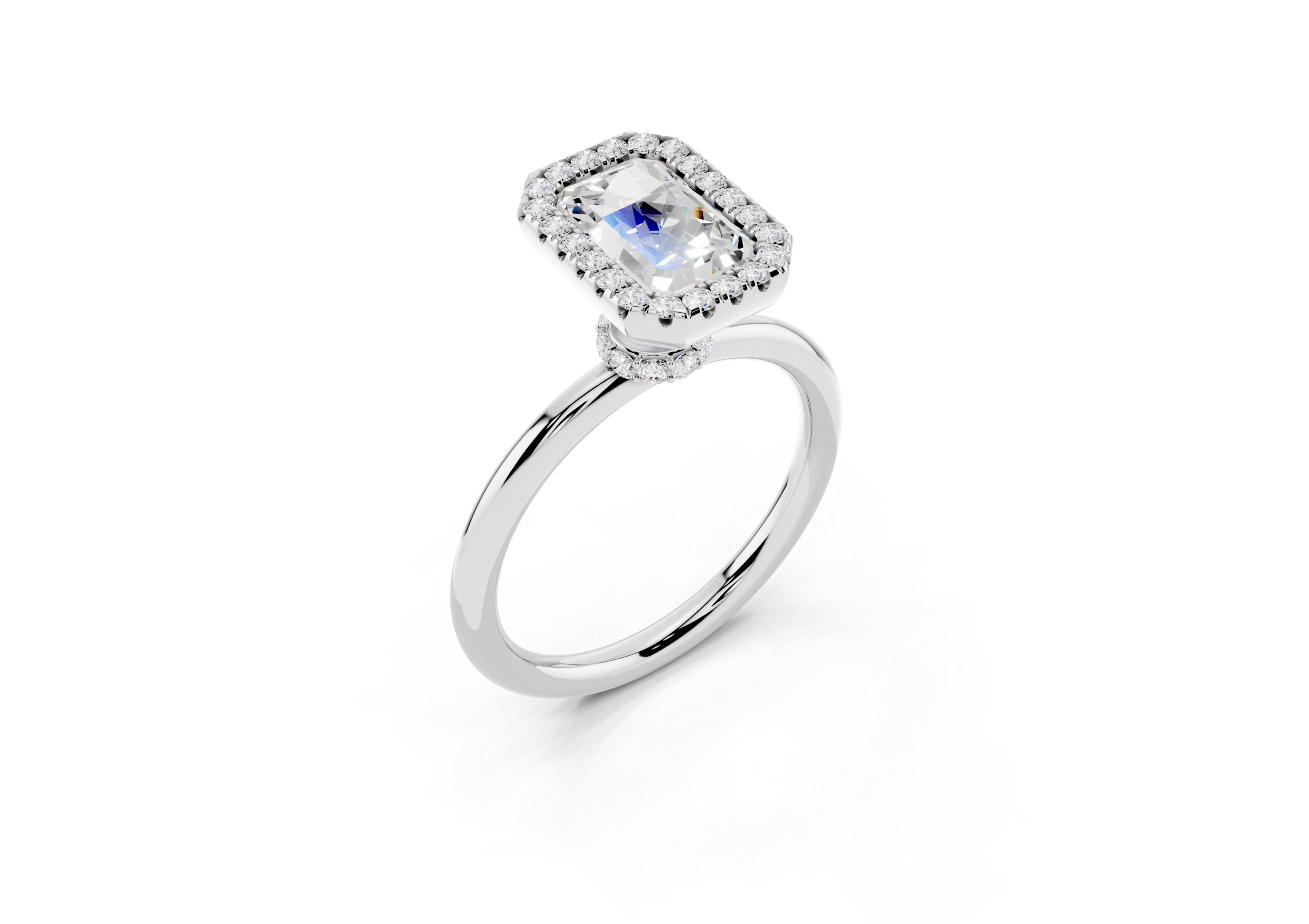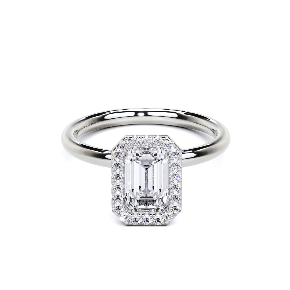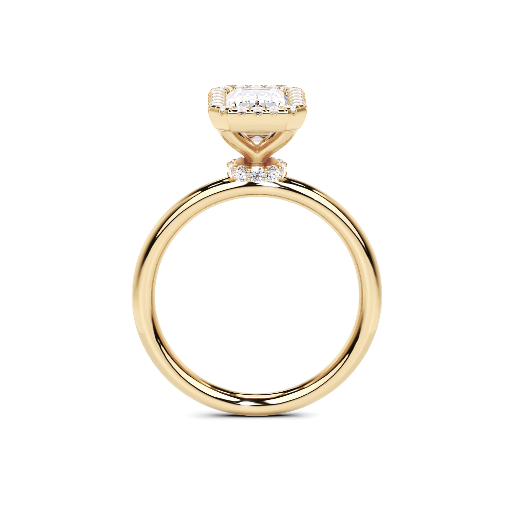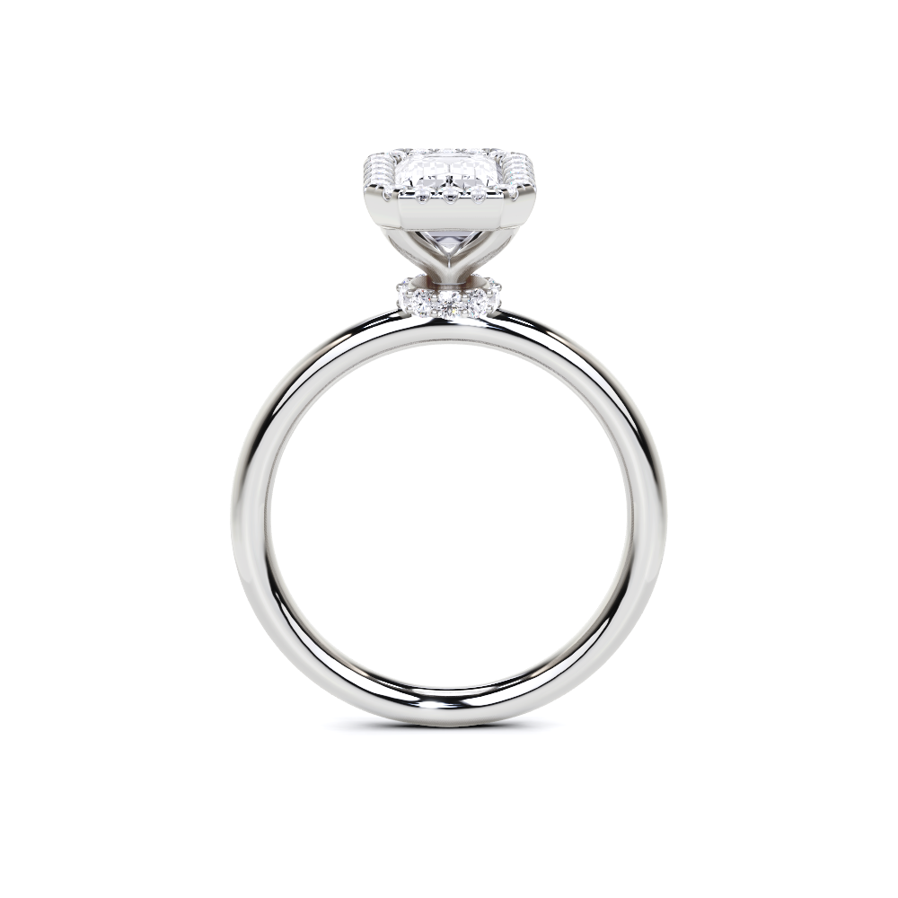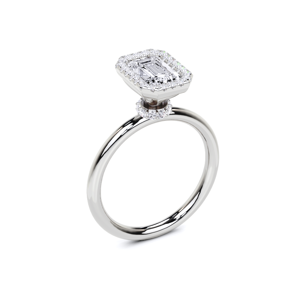 A refined solitaire-style piece featuring an emerald-cut center framed in a delicate halo, elevated atop a hidden pavé band for added brilliance from every angle. This design pairs modern minimalism with timeless elegance.
