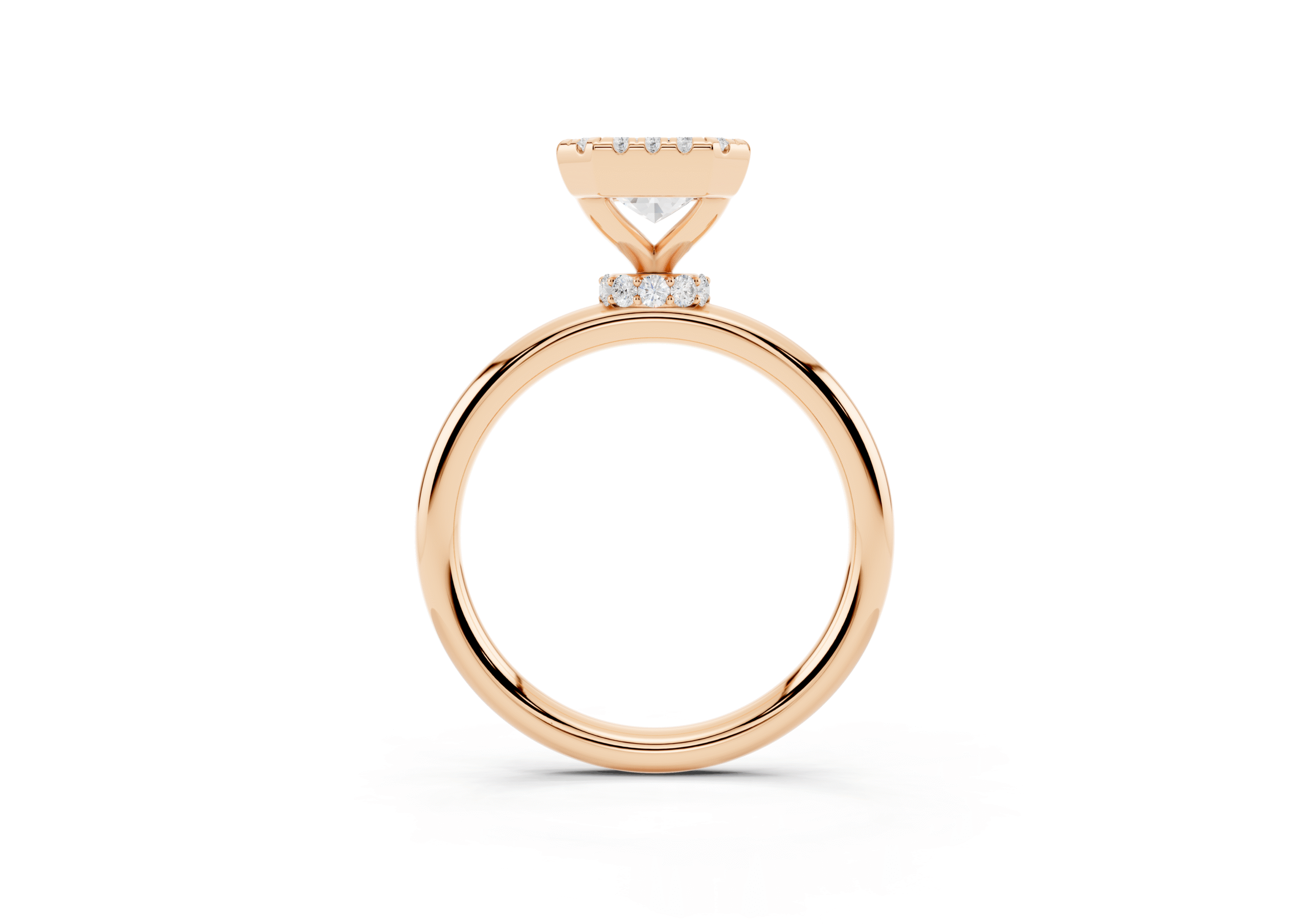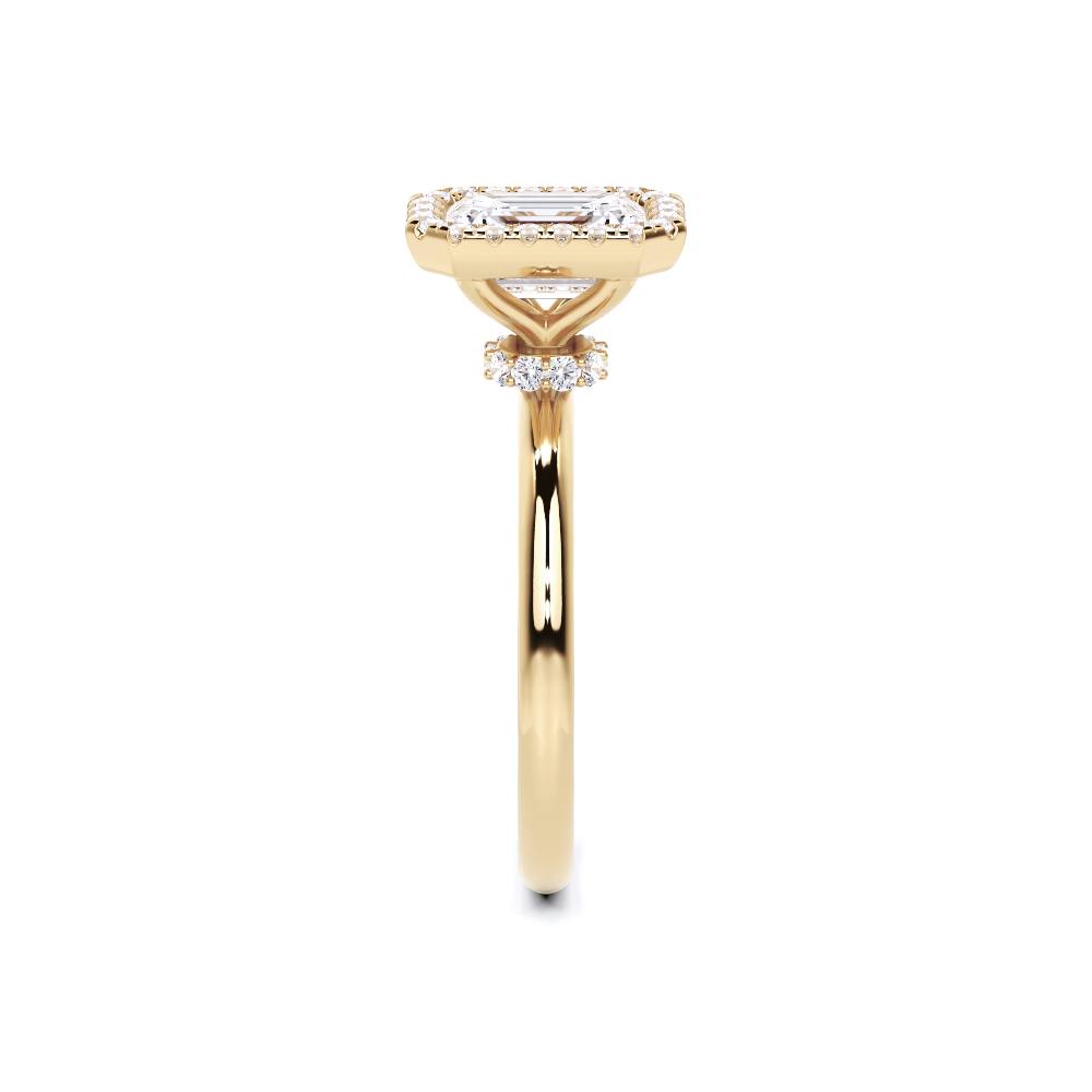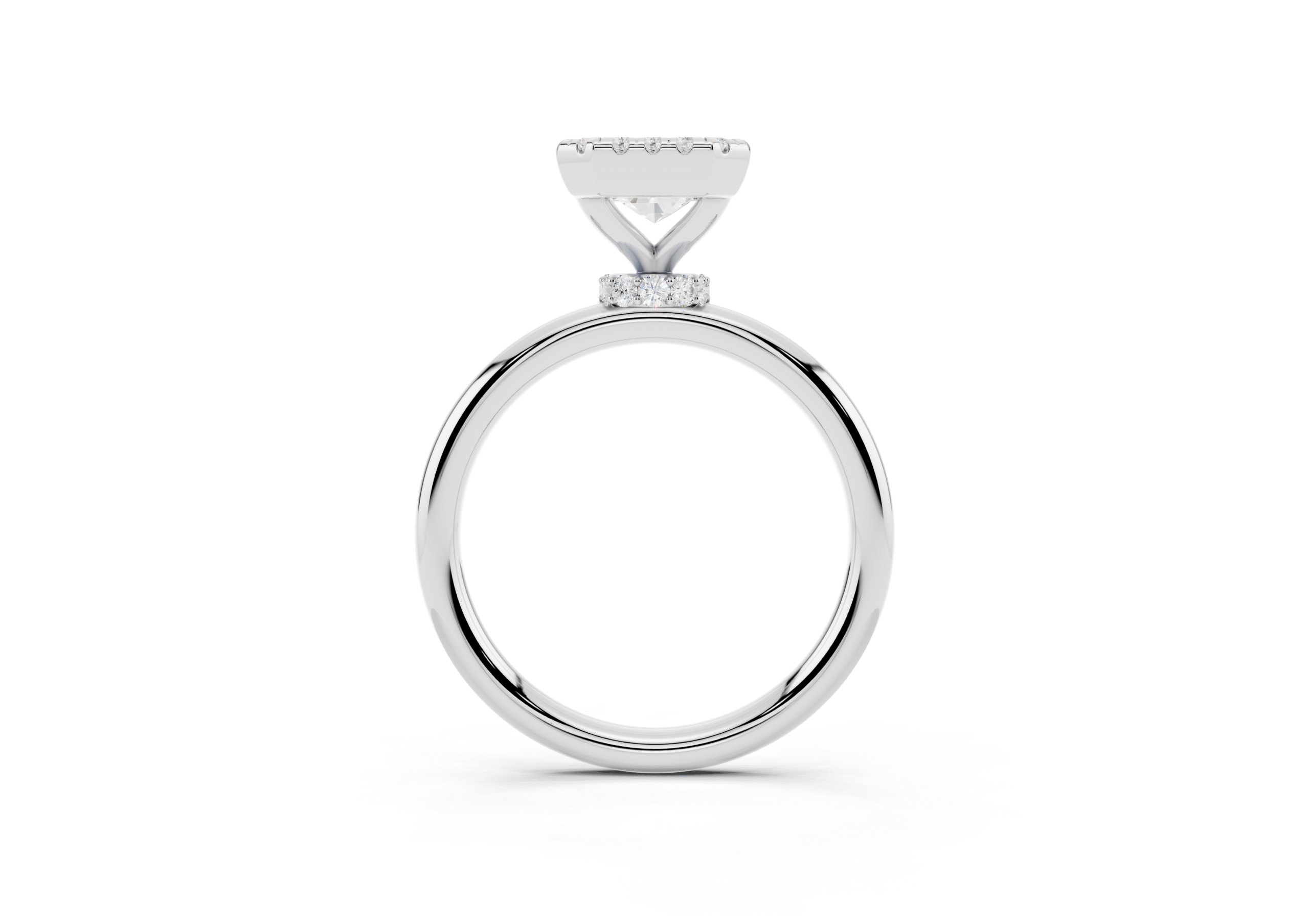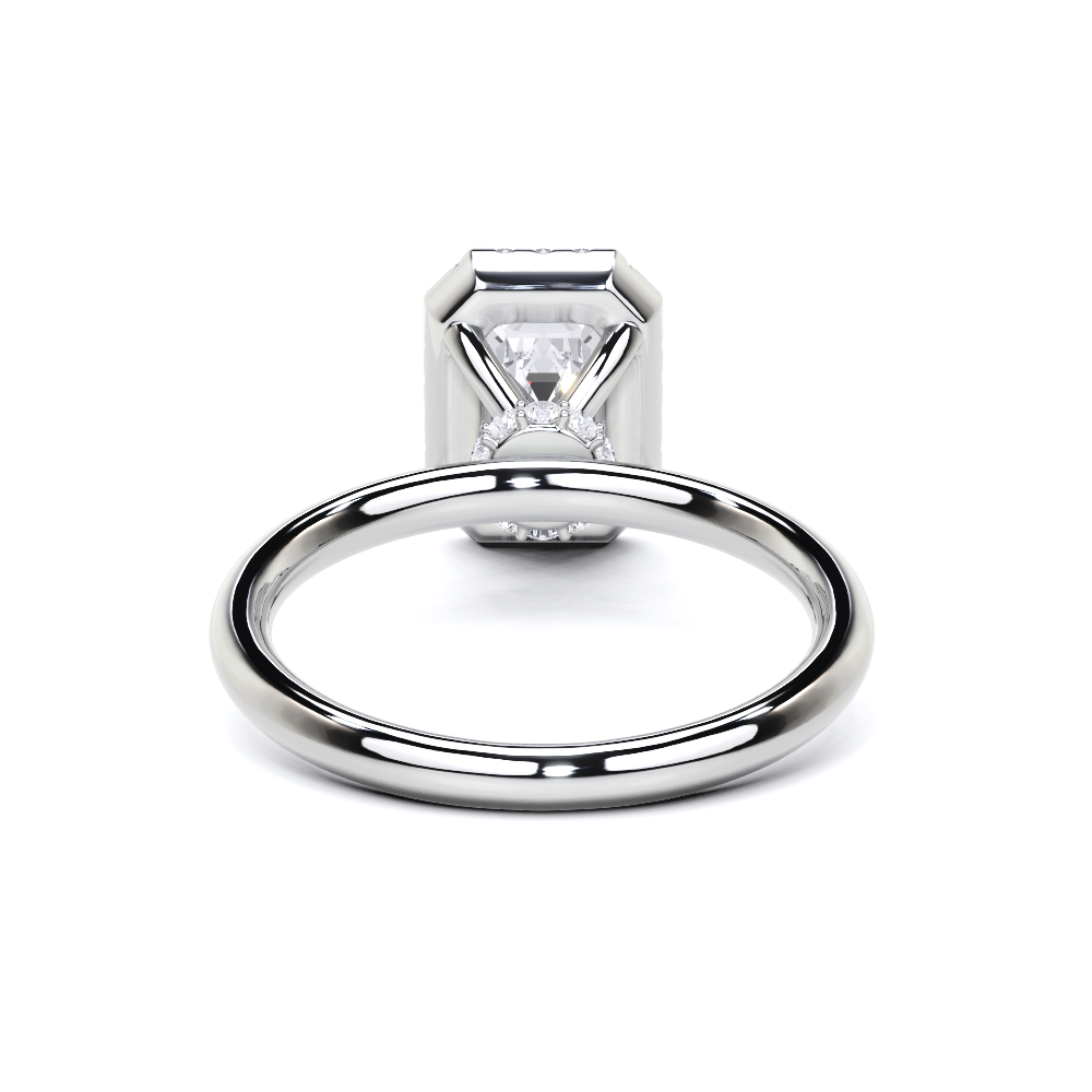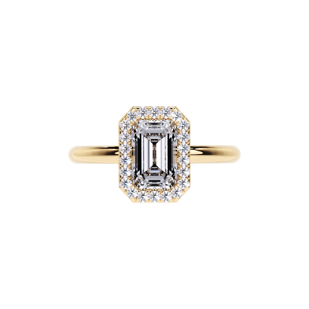 A refined solitaire-style piece featuring an emerald-cut center framed in a delicate halo, elevated atop a hidden pavé band for added brilliance from every angle. This design pairs modern minimalism with timeless elegance.
