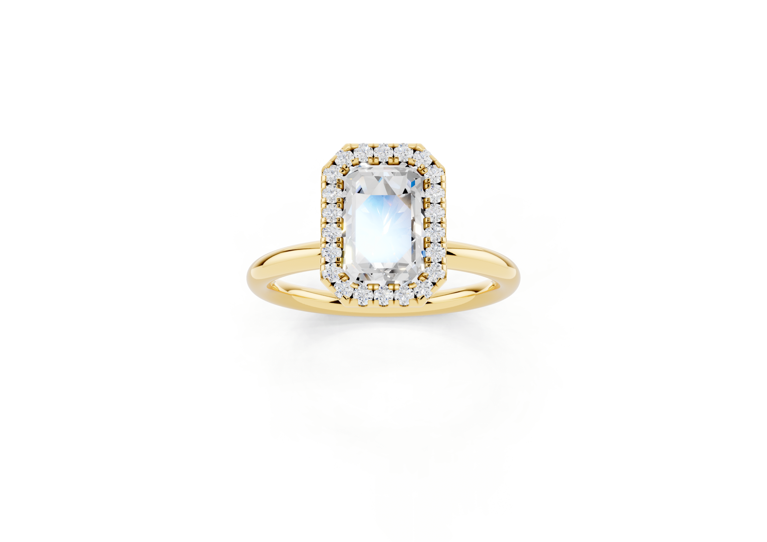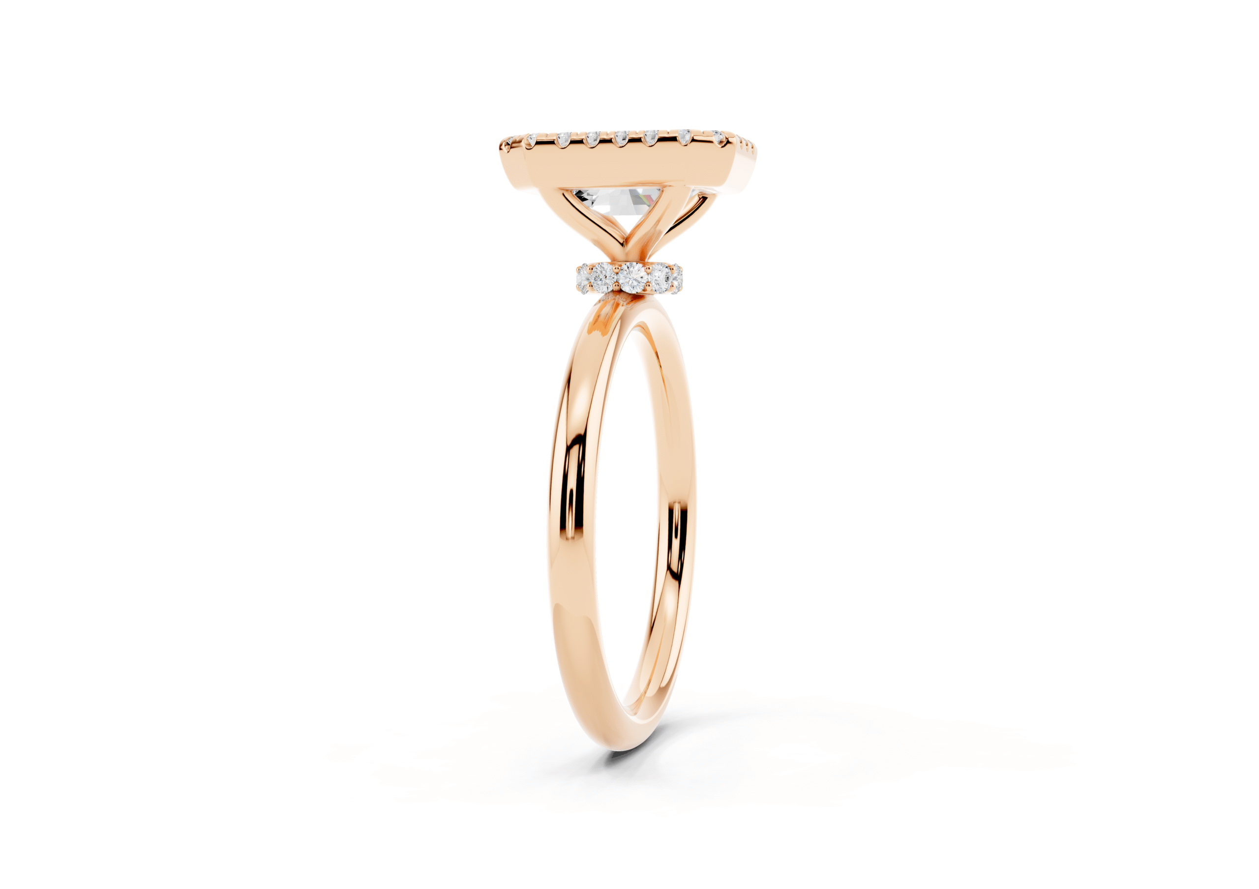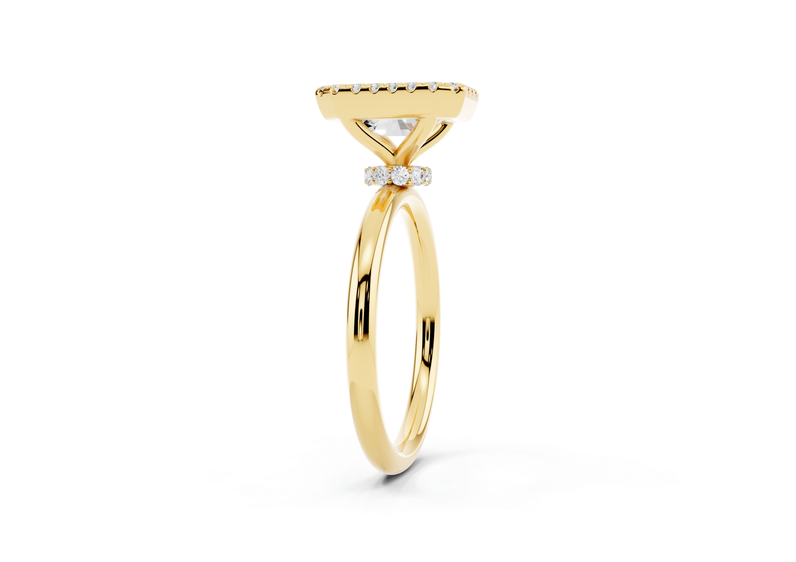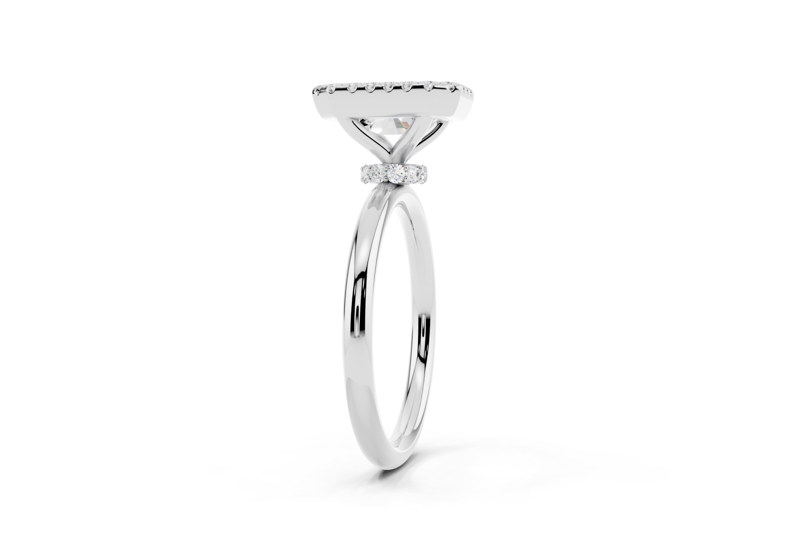 A refined solitaire-style piece featuring an emerald-cut center framed in a delicate halo, elevated atop a hidden pavé band for added brilliance from every angle. This design pairs modern minimalism with timeless elegance.