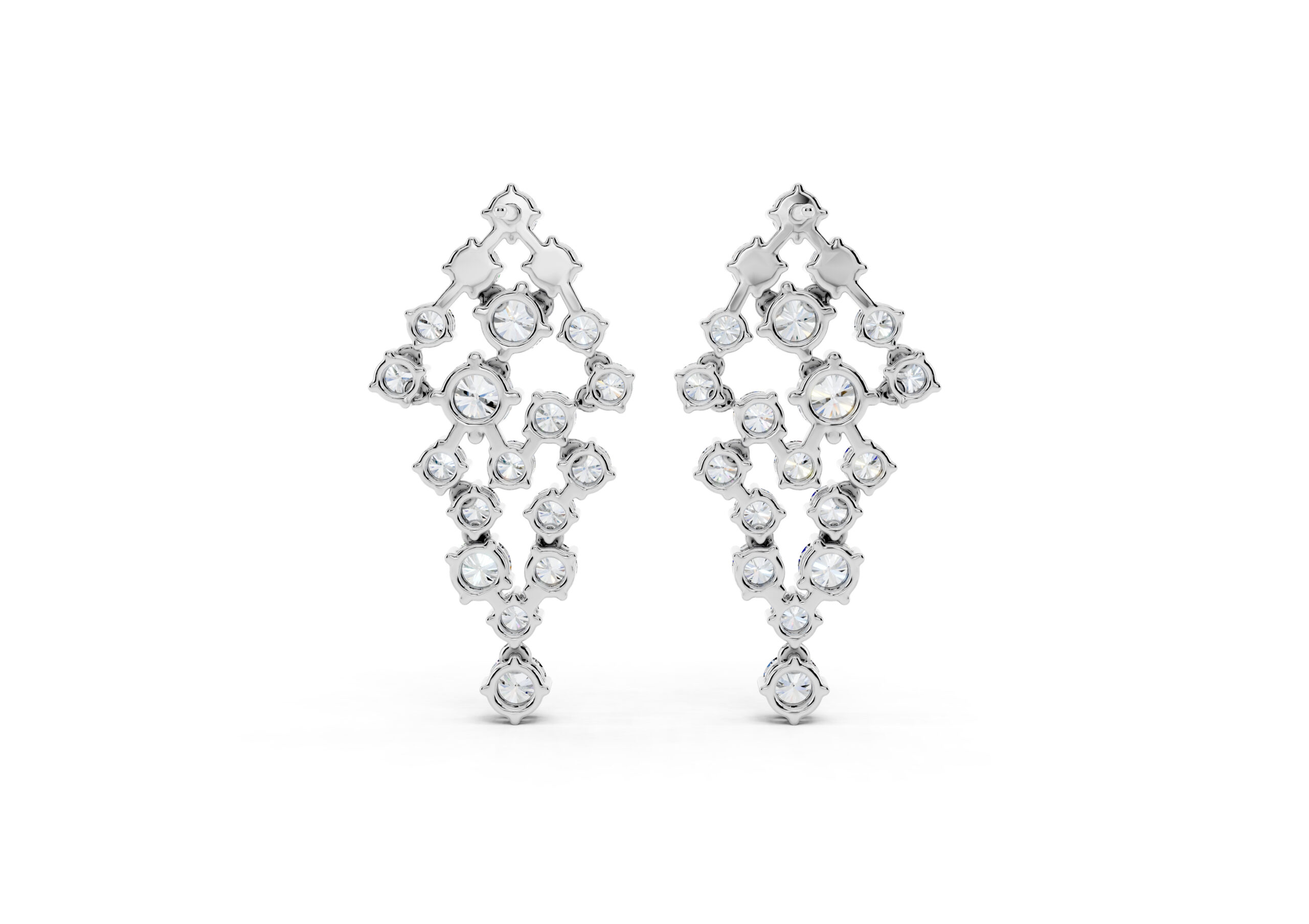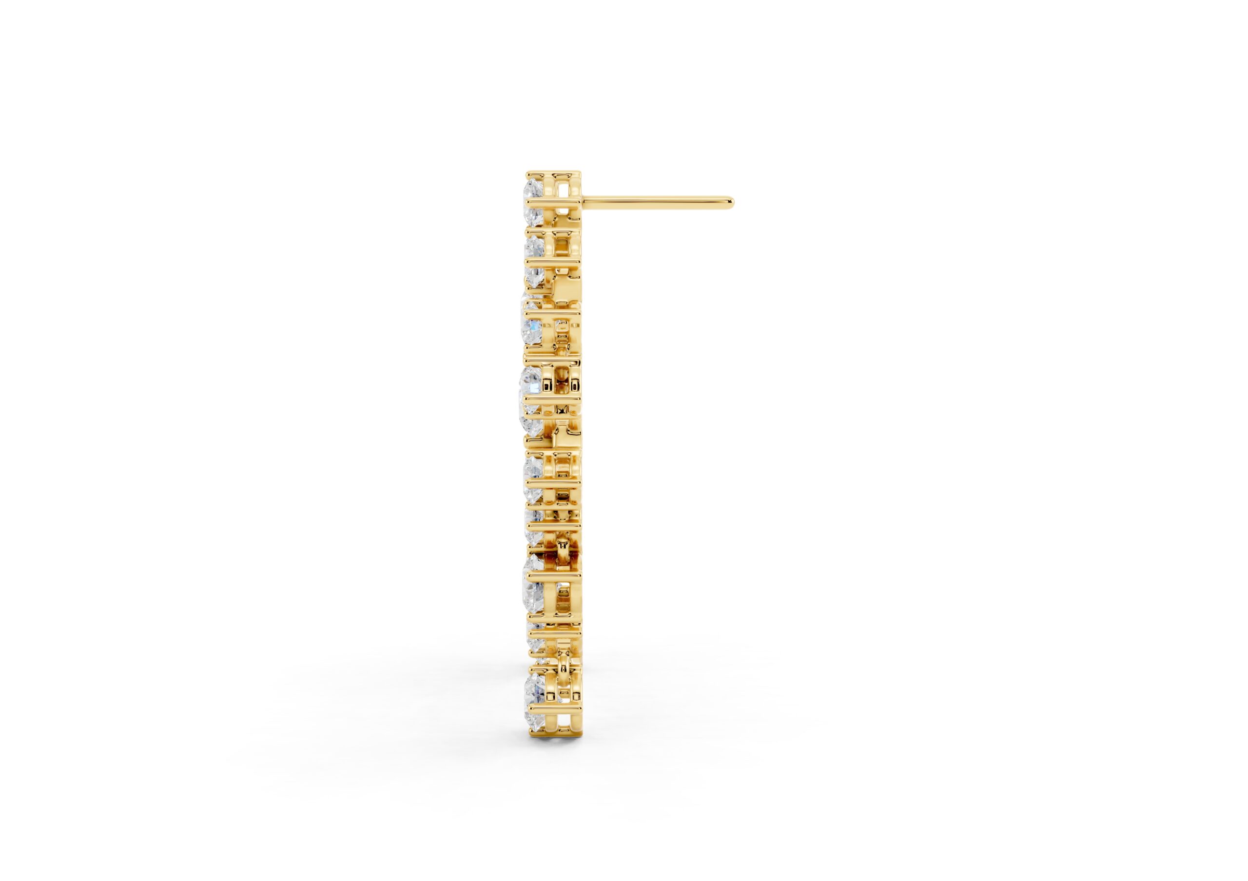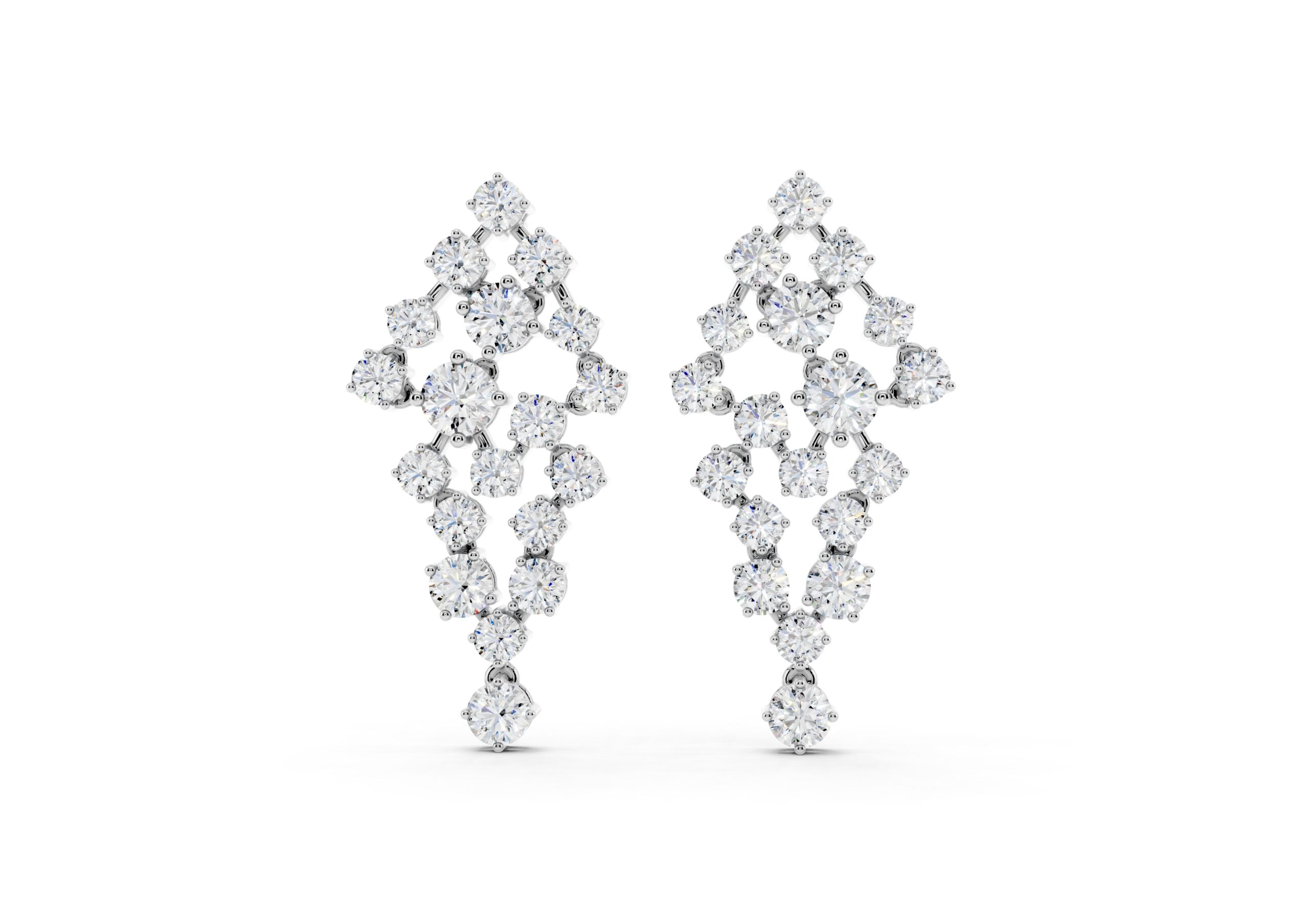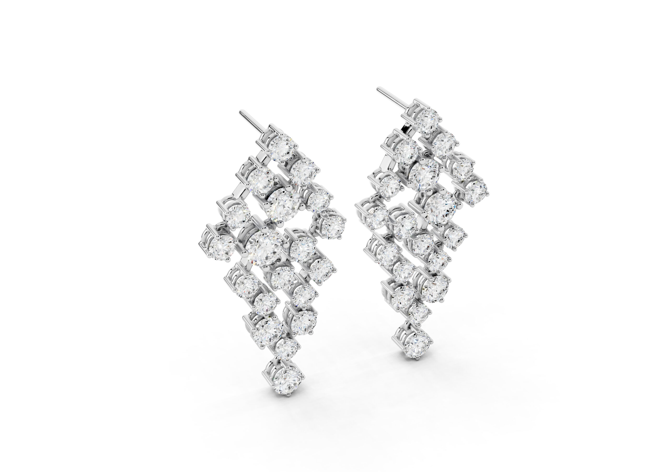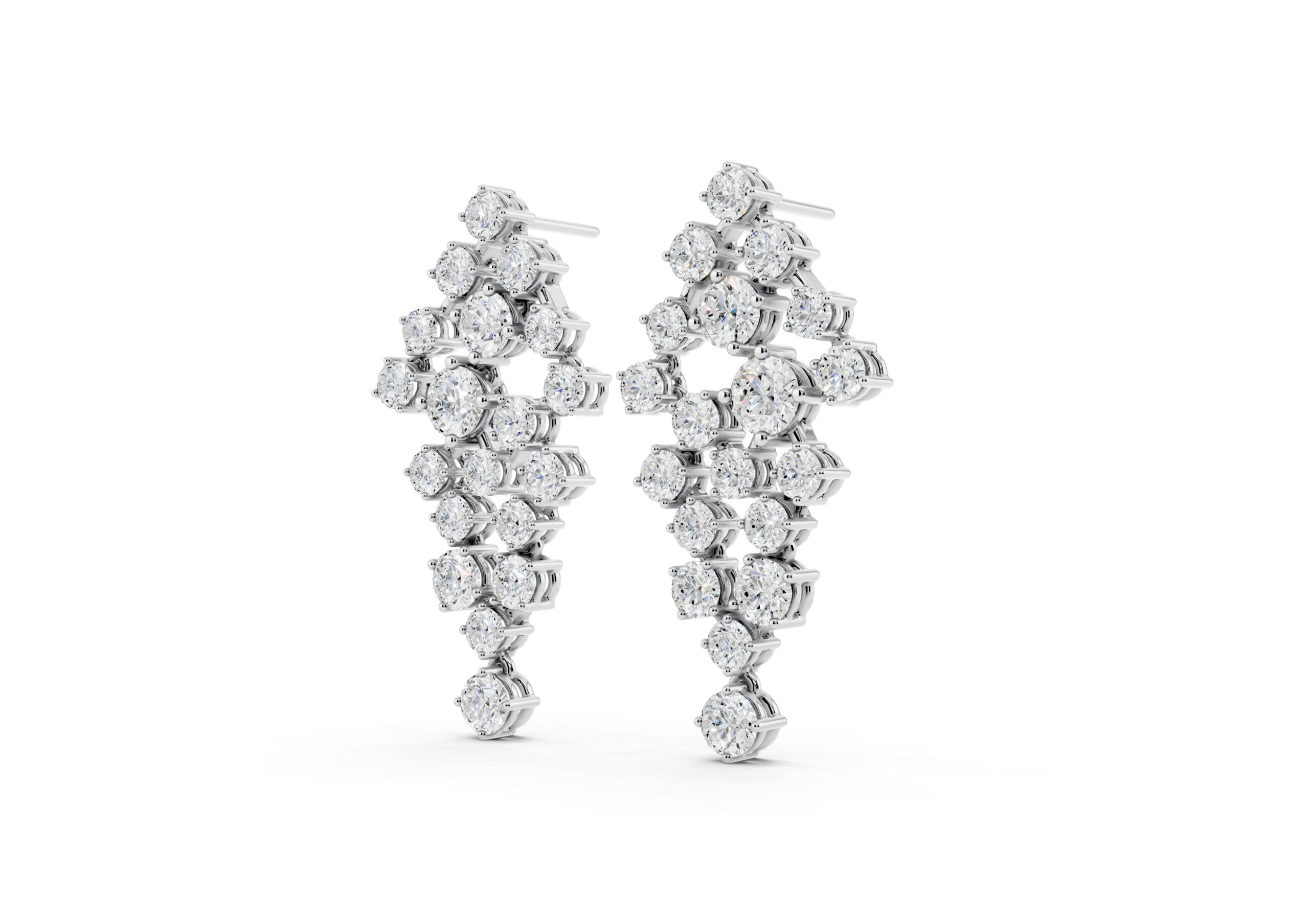 These earrings feature a graceful diamond taper that fans outward before narrowing to a single radiant drop. The strategic mix of diamond sizes creates dimension and movement, while the precise symmetry adds a sense of regal elegance. Bold yet delicate, they strike the perfect balance between statement and sophistication.