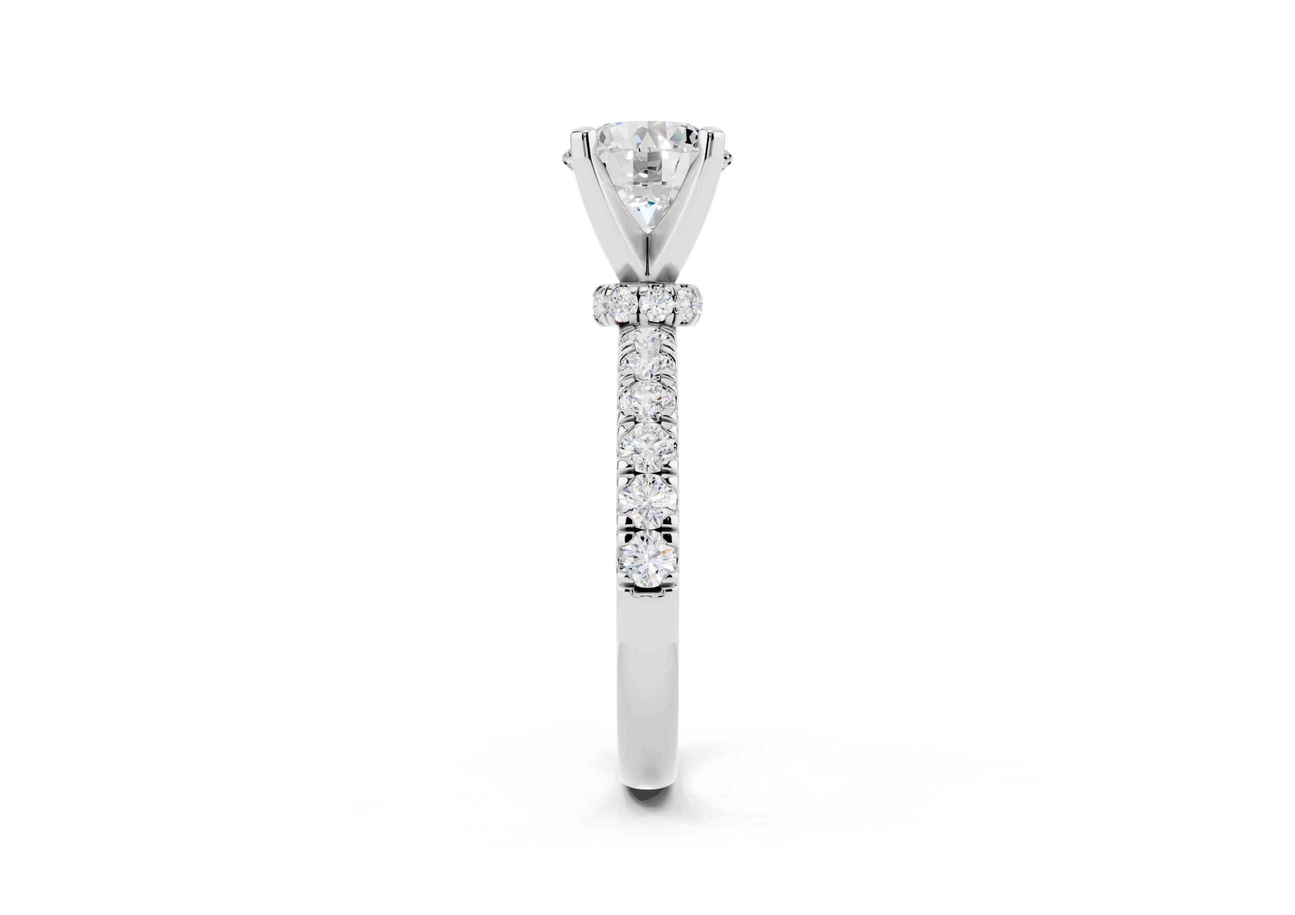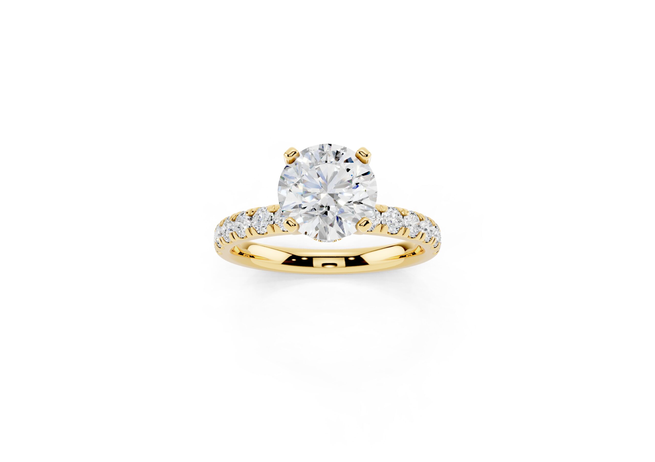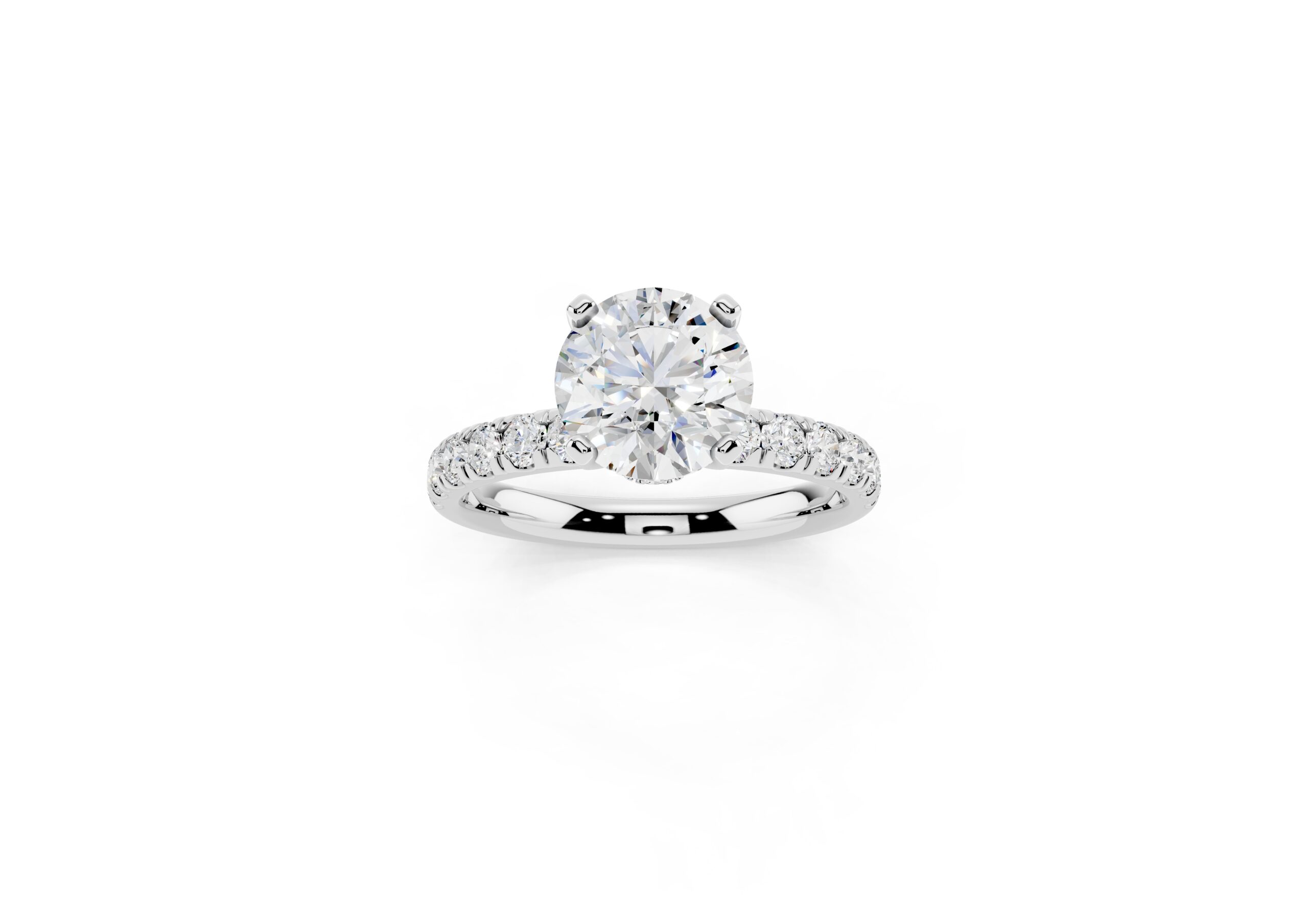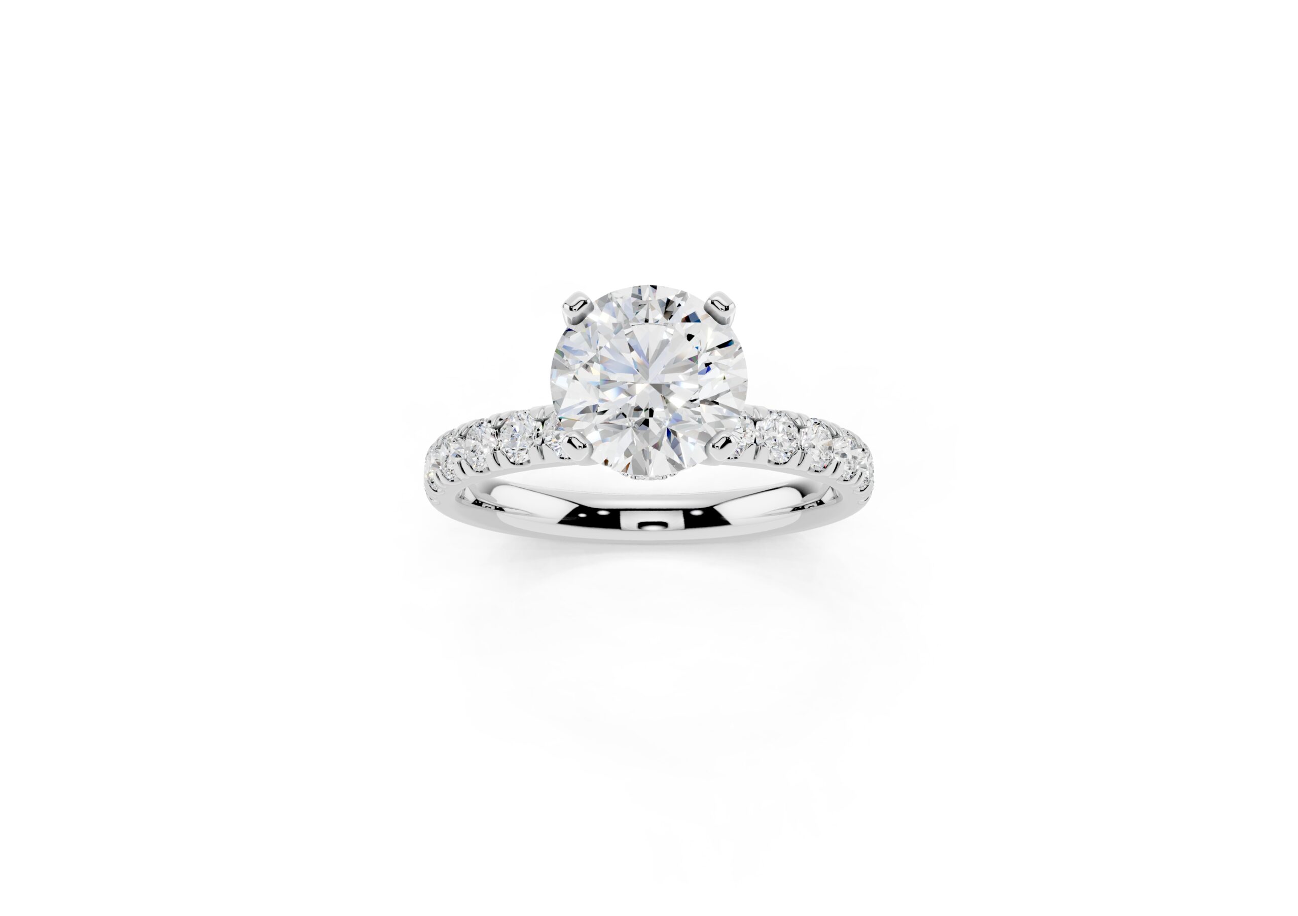 Featuring a bold round center stone set in a secure four-prong design, this ring showcases a tapered pavé band that adds a rich texture of brilliance. Its structured, slightly domed silhouette creates a powerful statement with a refined, elegant finish—perfect for those who prefer timeless design with a touch of drama.