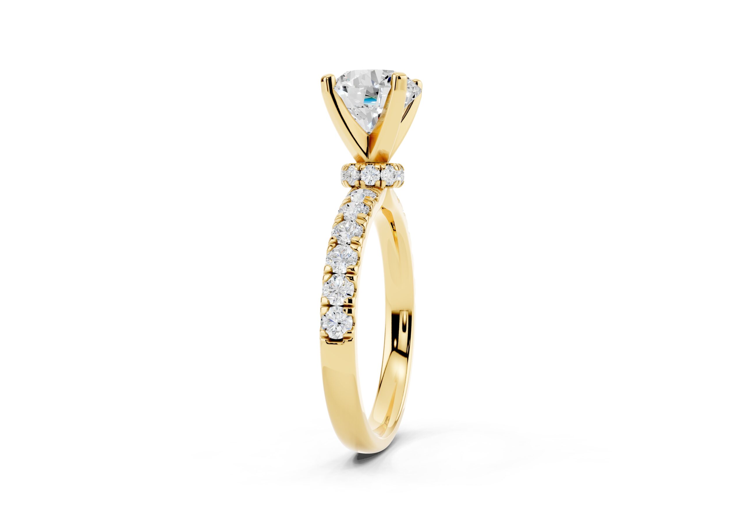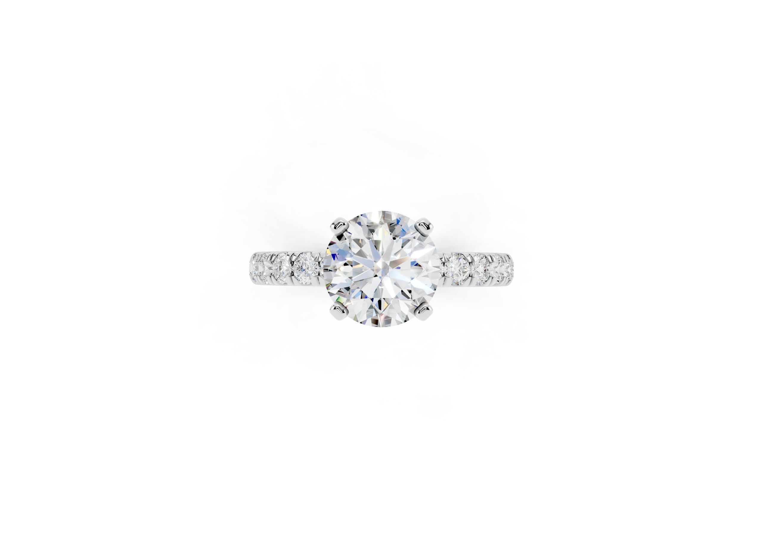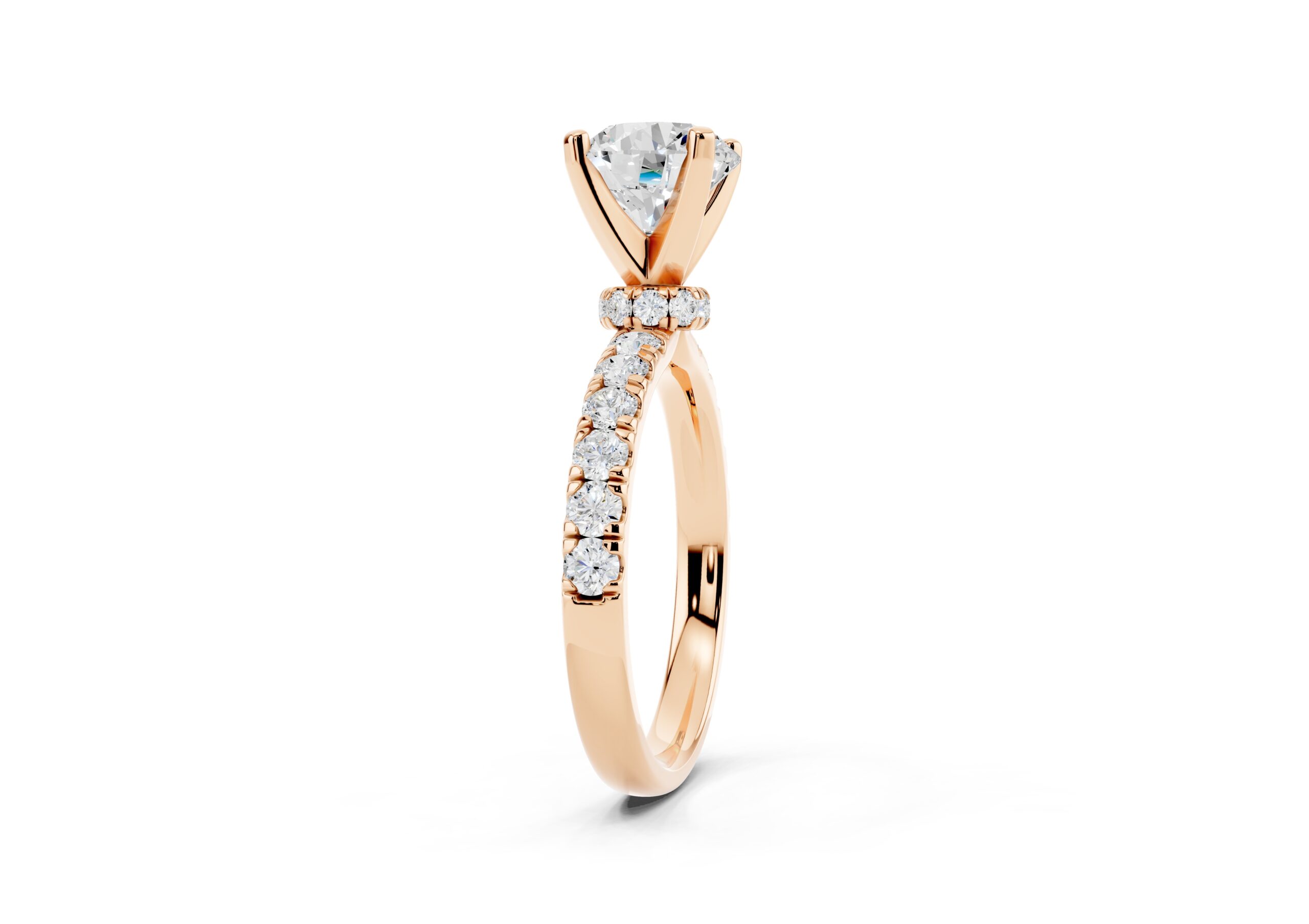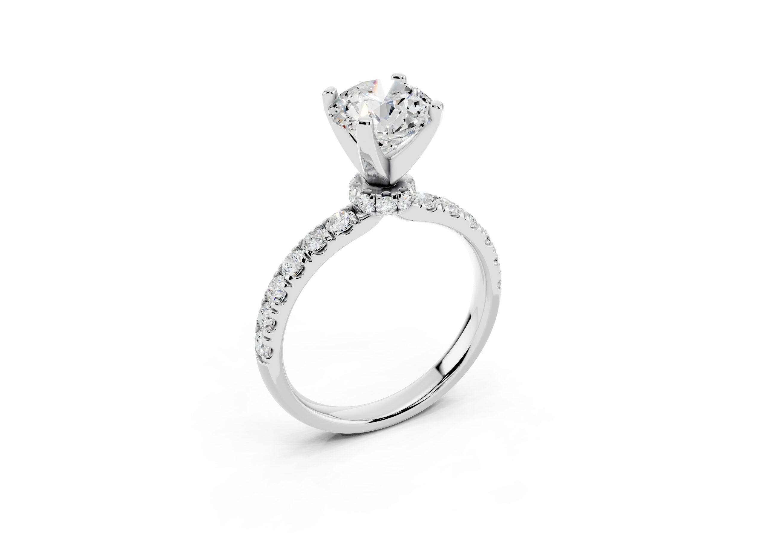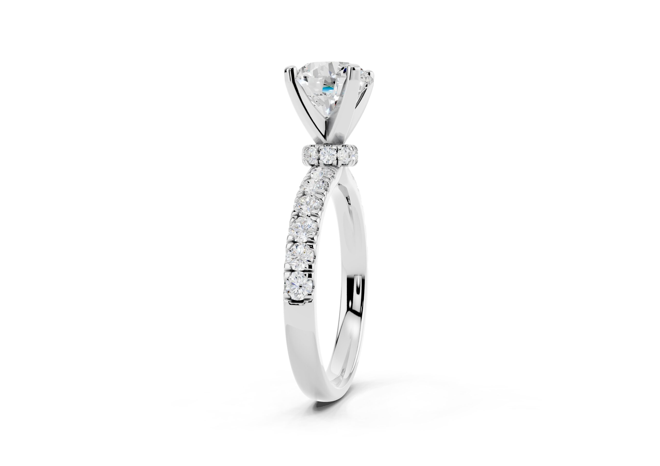 Featuring a bold round center stone set in a secure four-prong design, this ring showcases a tapered pavé band that adds a rich texture of brilliance. Its structured, slightly domed silhouette creates a powerful statement with a refined, elegant finish—perfect for those who prefer timeless design with a touch of drama.