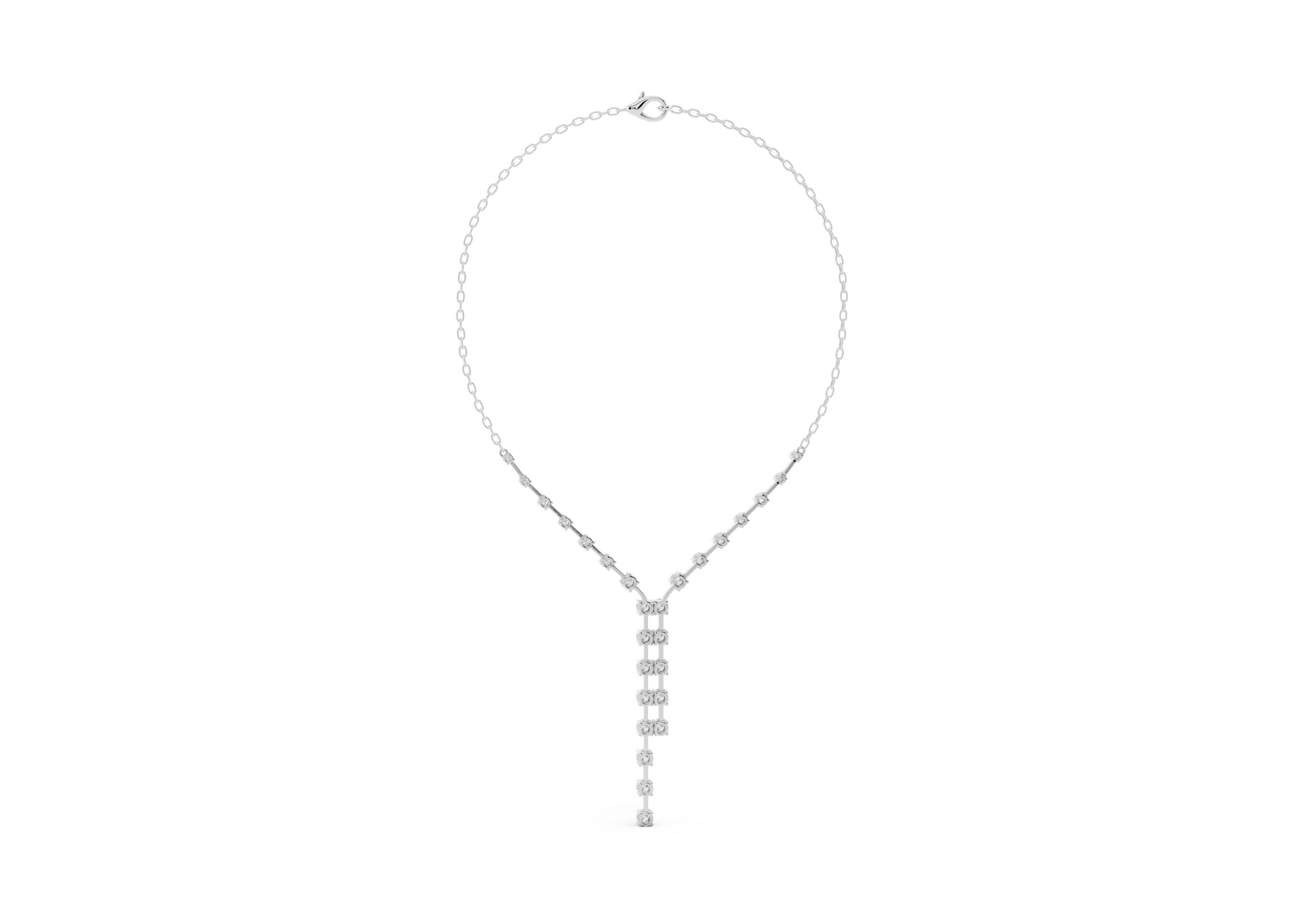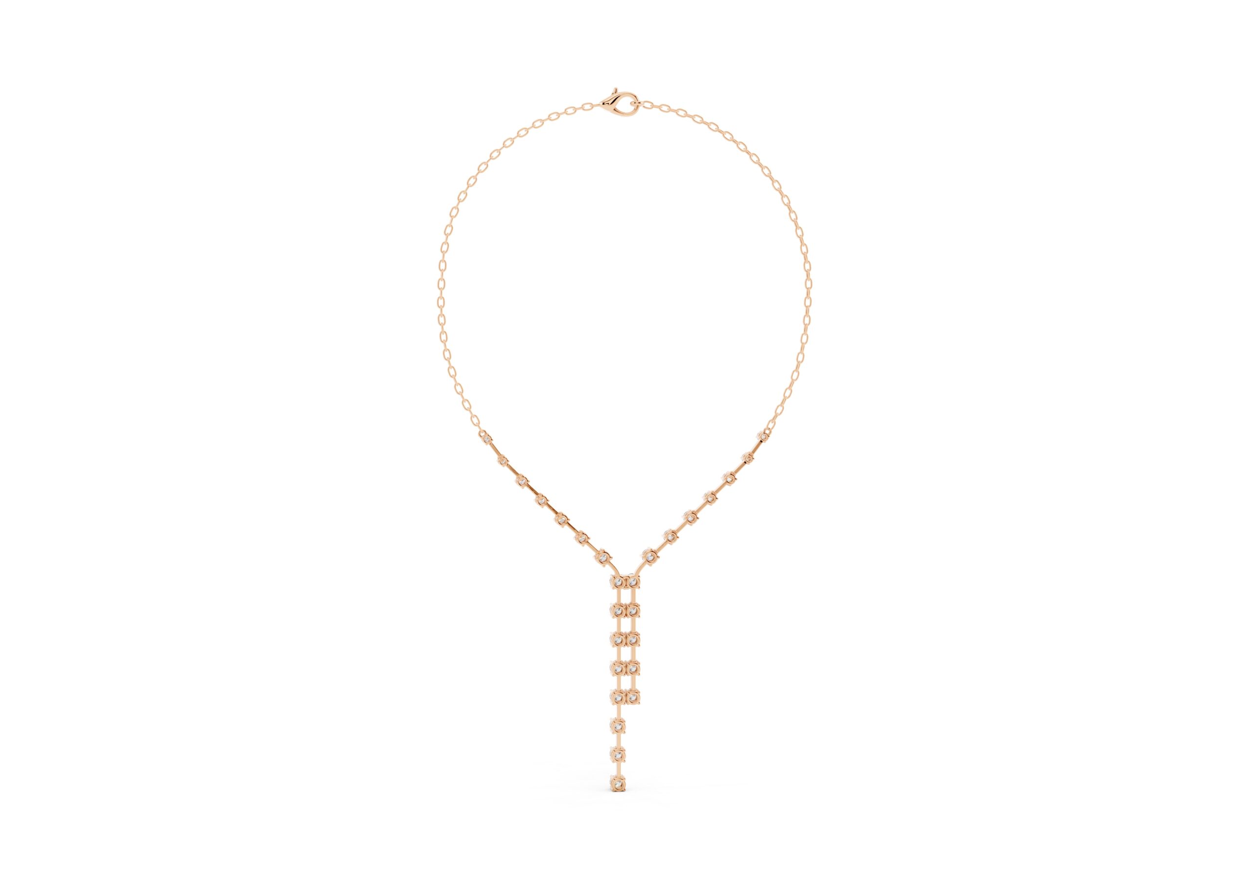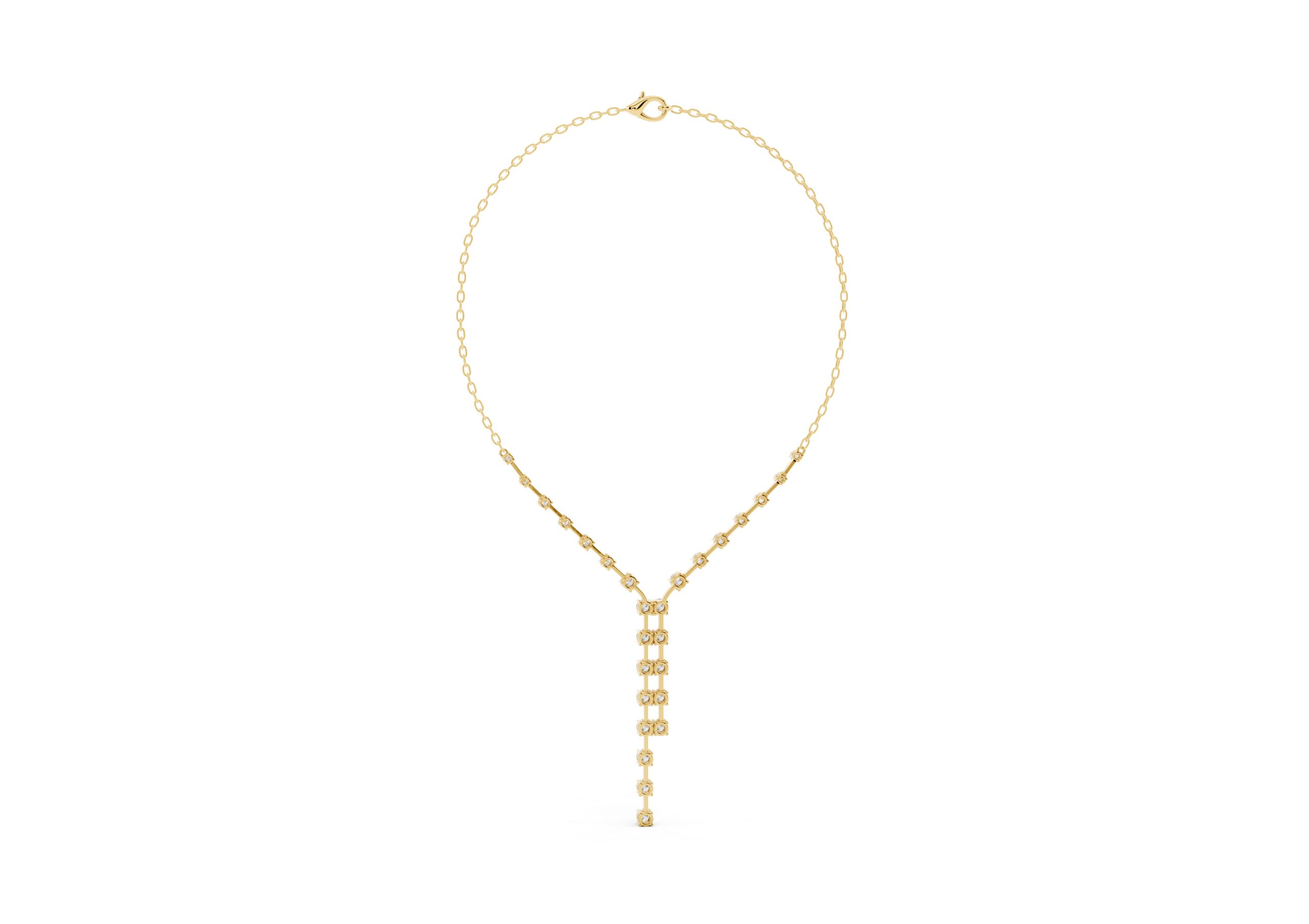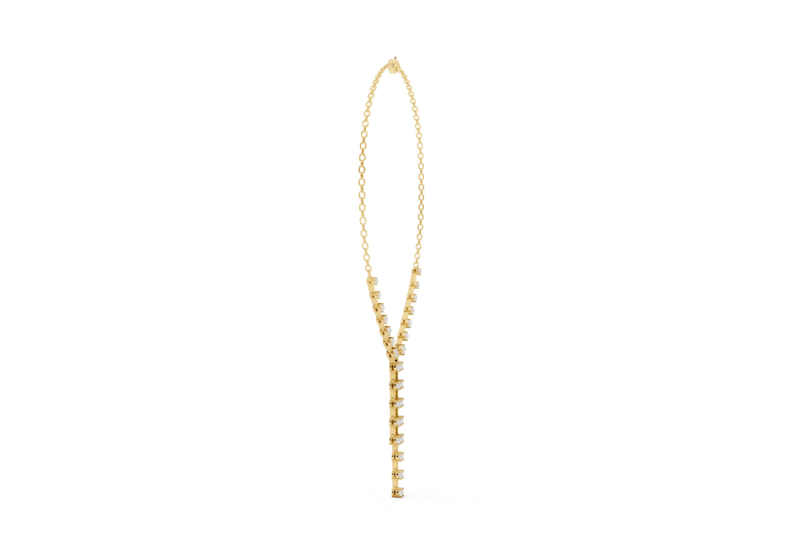 this necklace features a gentle Y-shape formed by a fine chain and a structured row of round diamonds that taper into a sleek vertical drop. The balanced design blends delicacy with direction — soft curves meet linear lines in a piece made to elongate the neckline and catch the light with every movement. Understated, elegant, and quietly bold.