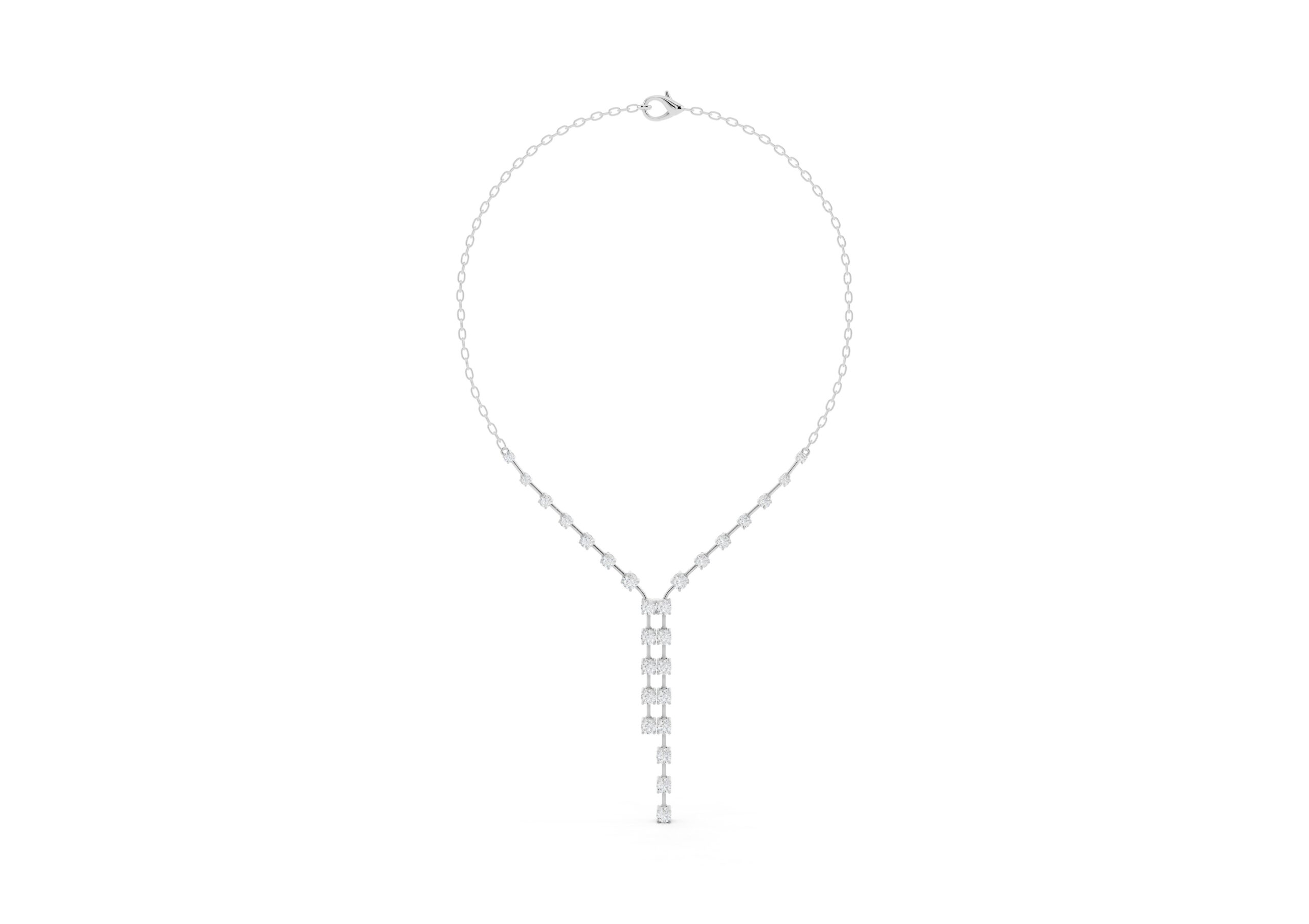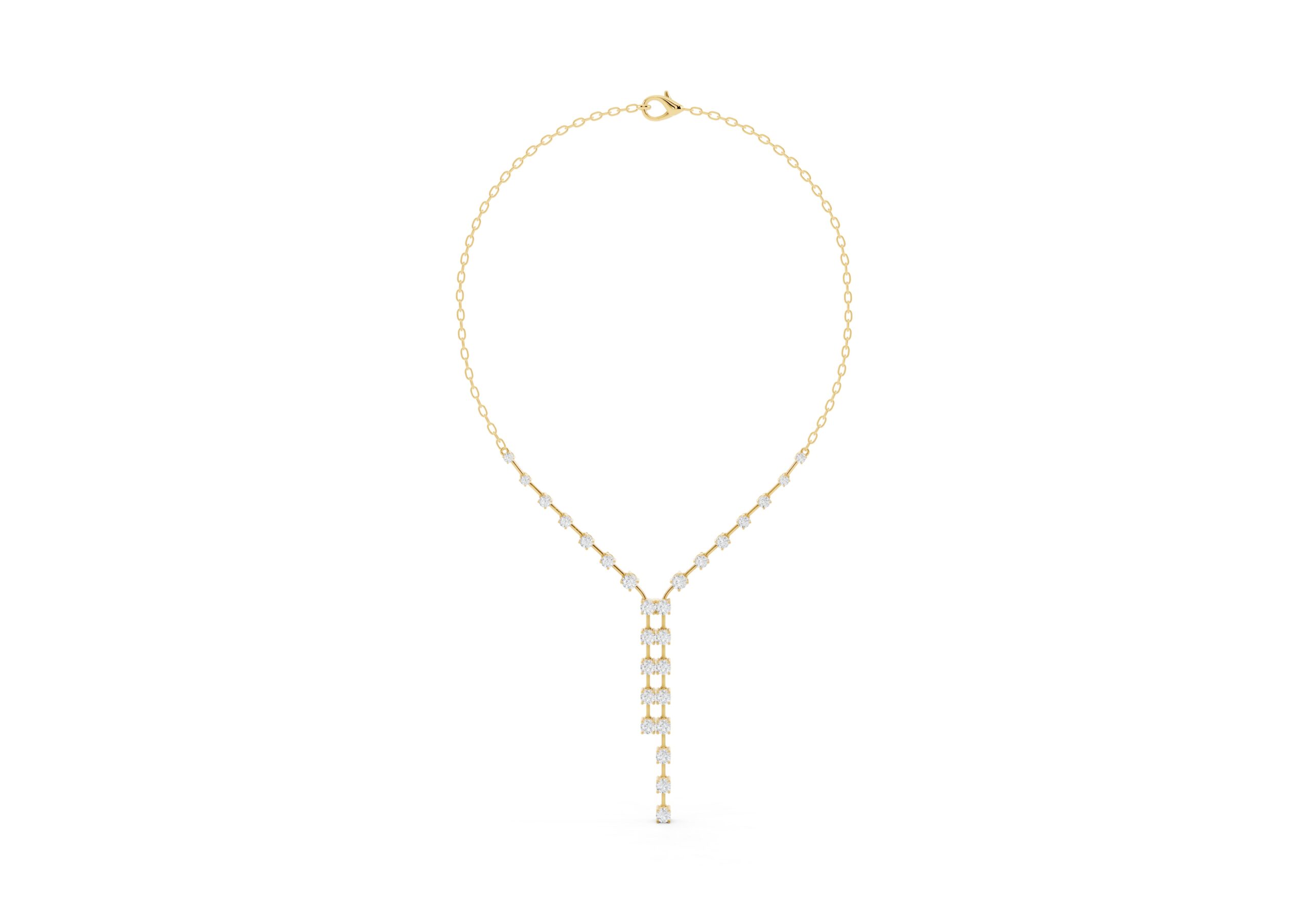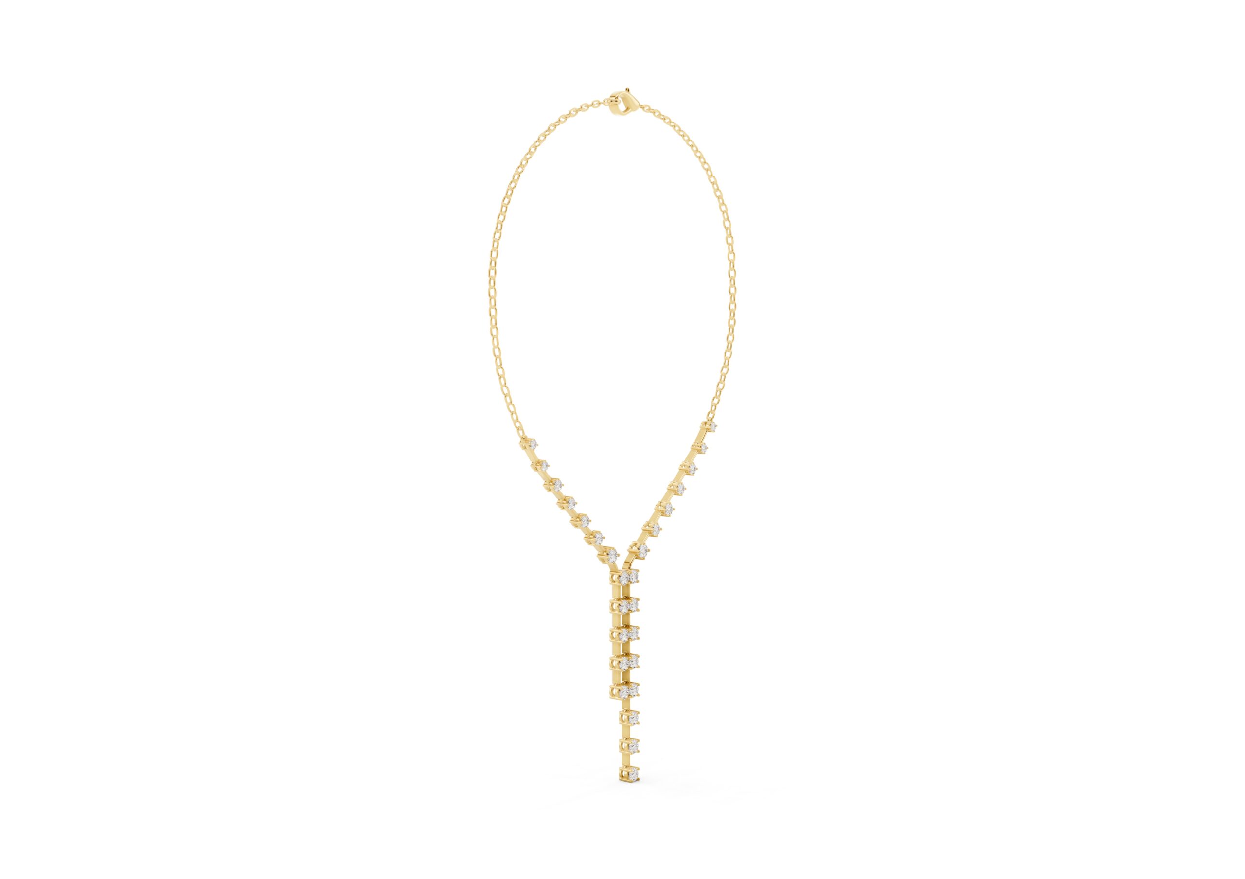 this necklace features a gentle Y-shape formed by a fine chain and a structured row of round diamonds that taper into a sleek vertical drop. The balanced design blends delicacy with direction — soft curves meet linear lines in a piece made to elongate the neckline and catch the light with every movement. Understated, elegant, and quietly bold.