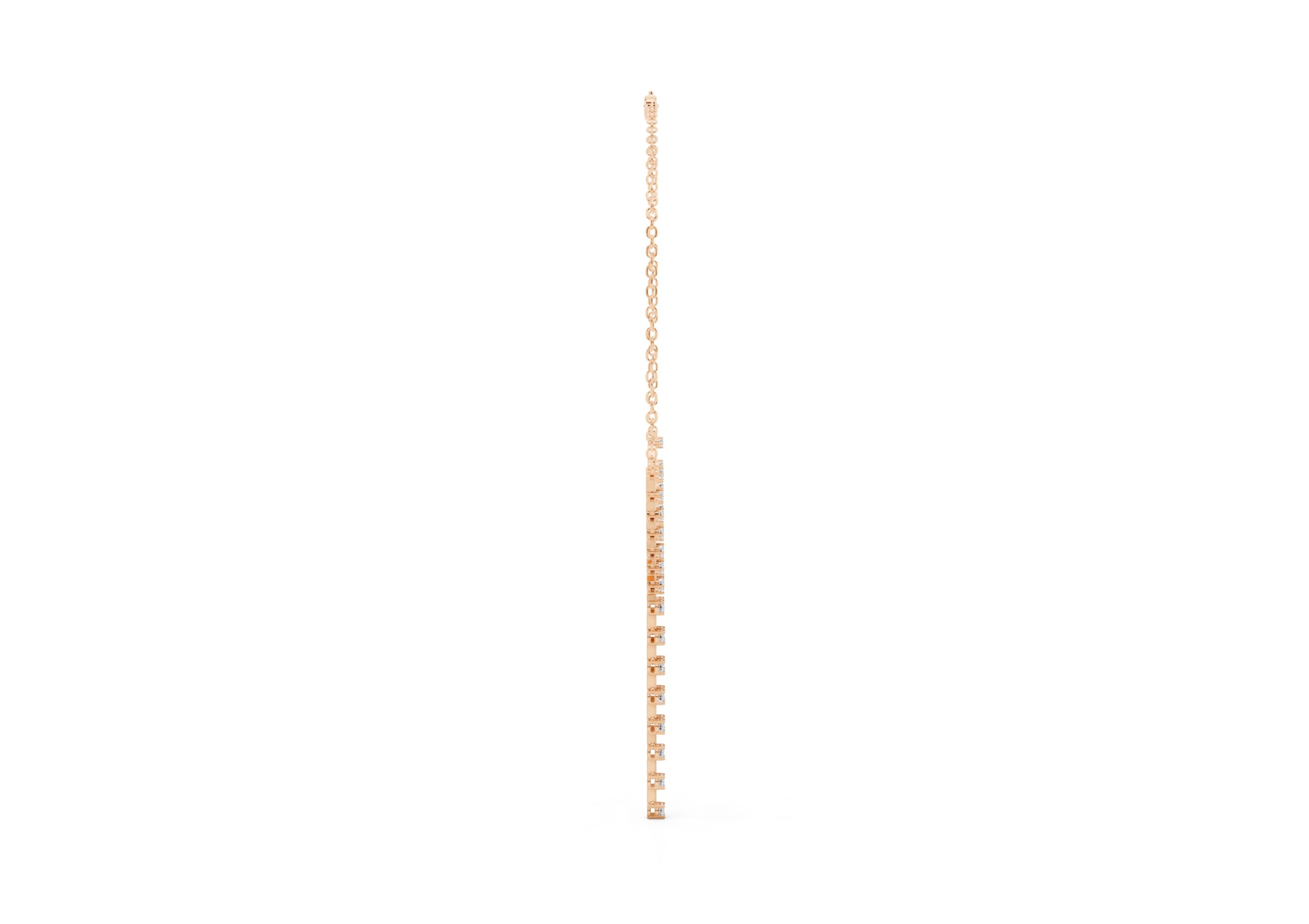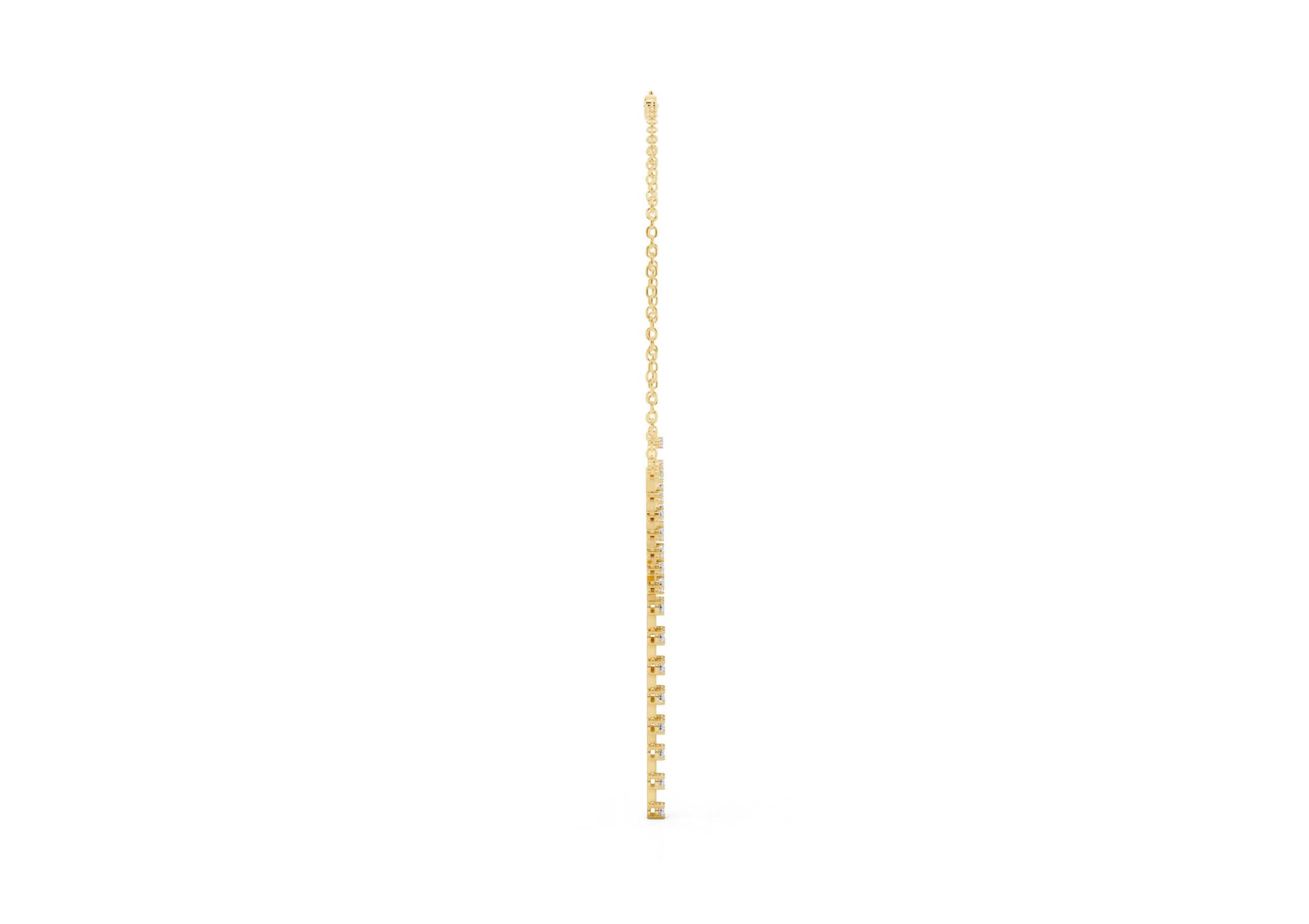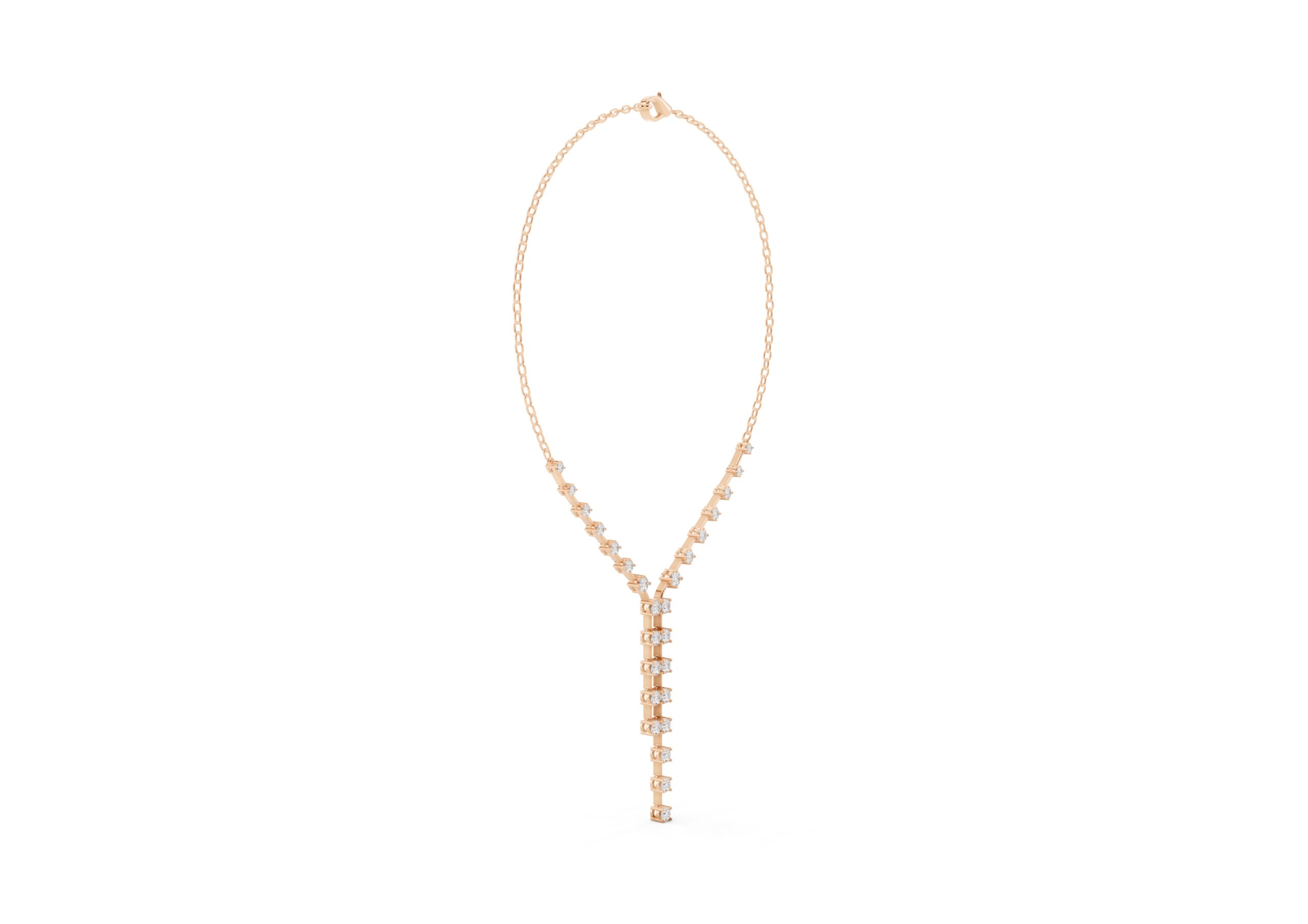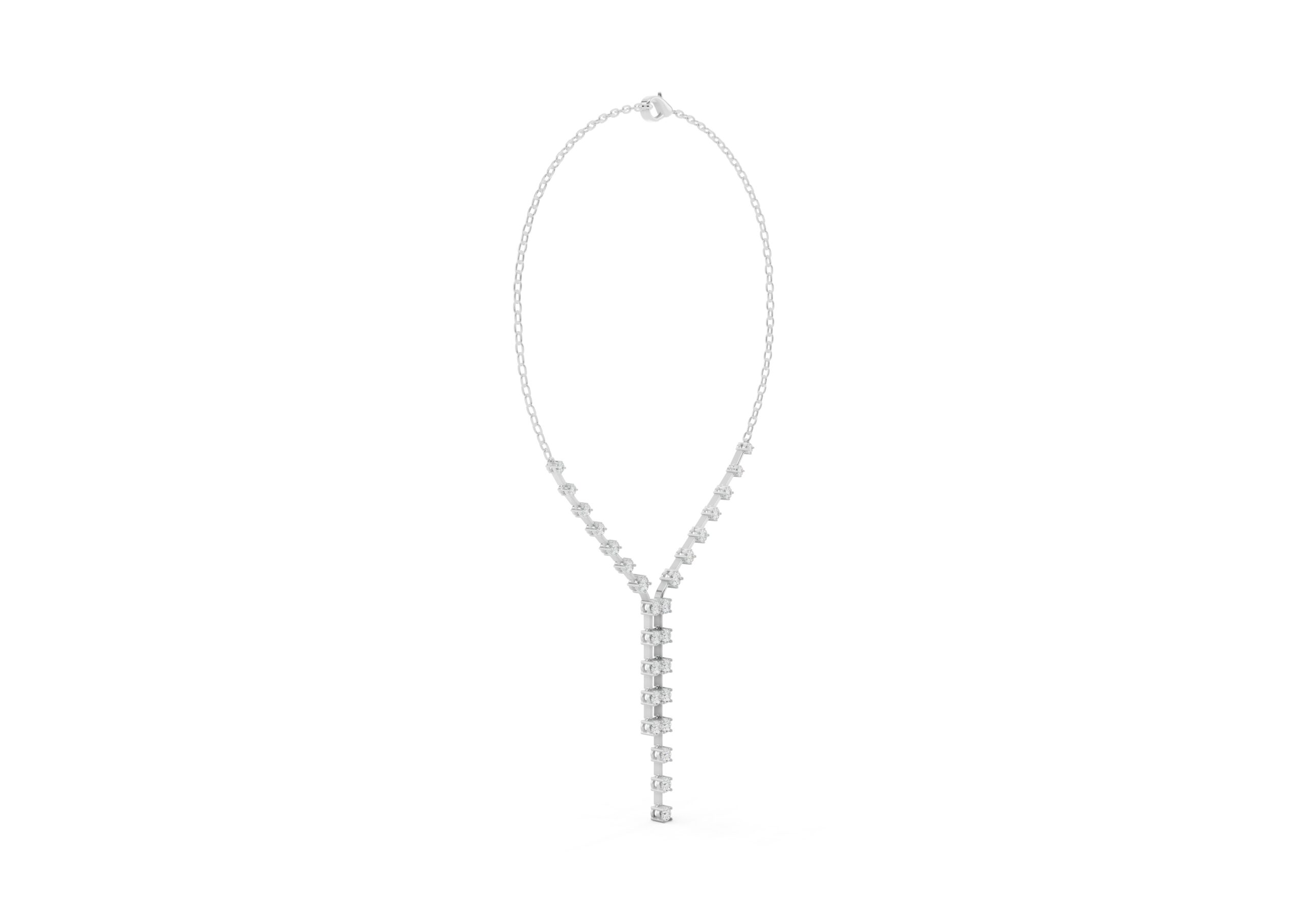 this necklace features a gentle Y-shape formed by a fine chain and a structured row of round diamonds that taper into a sleek vertical drop. The balanced design blends delicacy with direction — soft curves meet linear lines in a piece made to elongate the neckline and catch the light with every movement. Understated, elegant, and quietly bold.