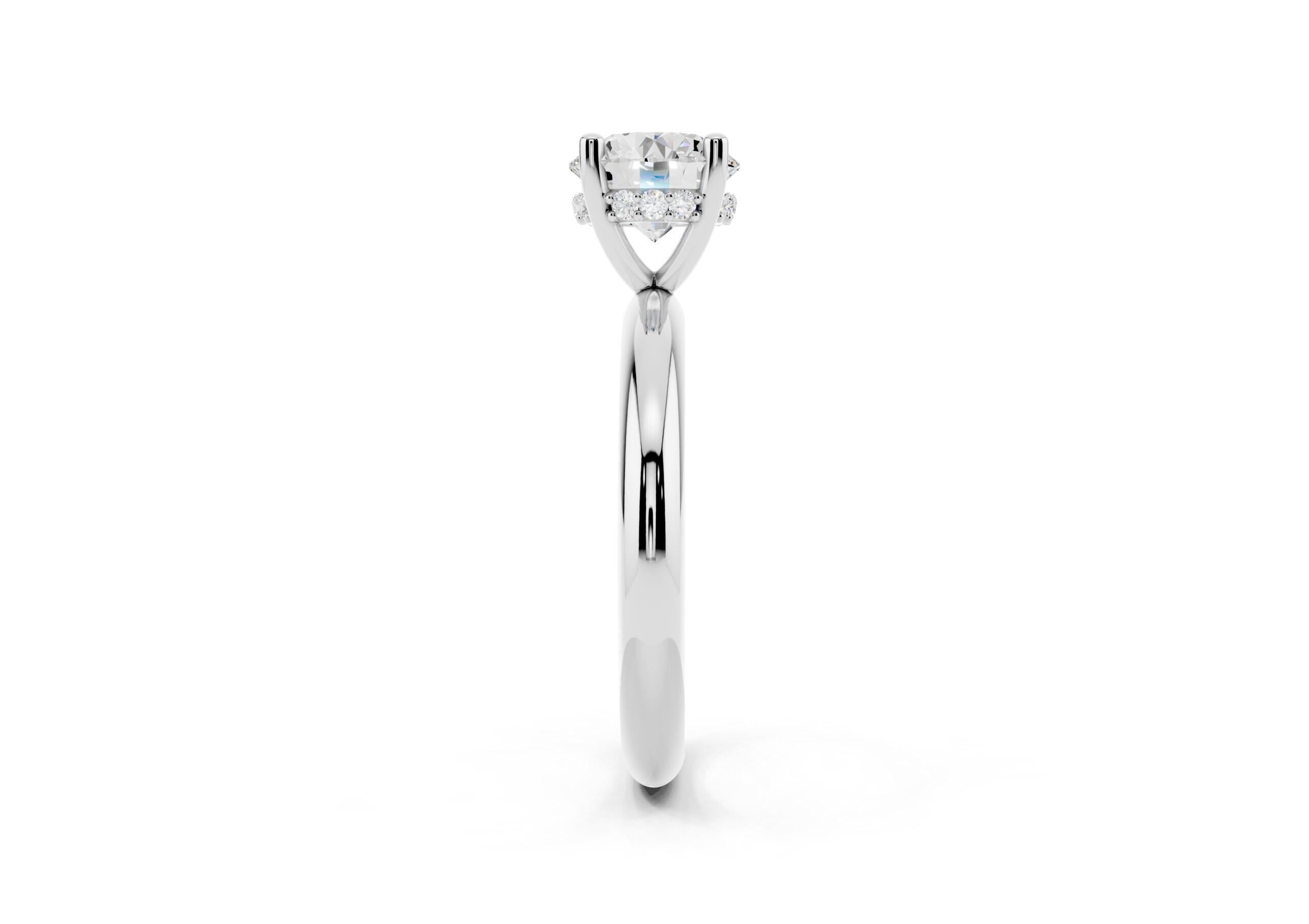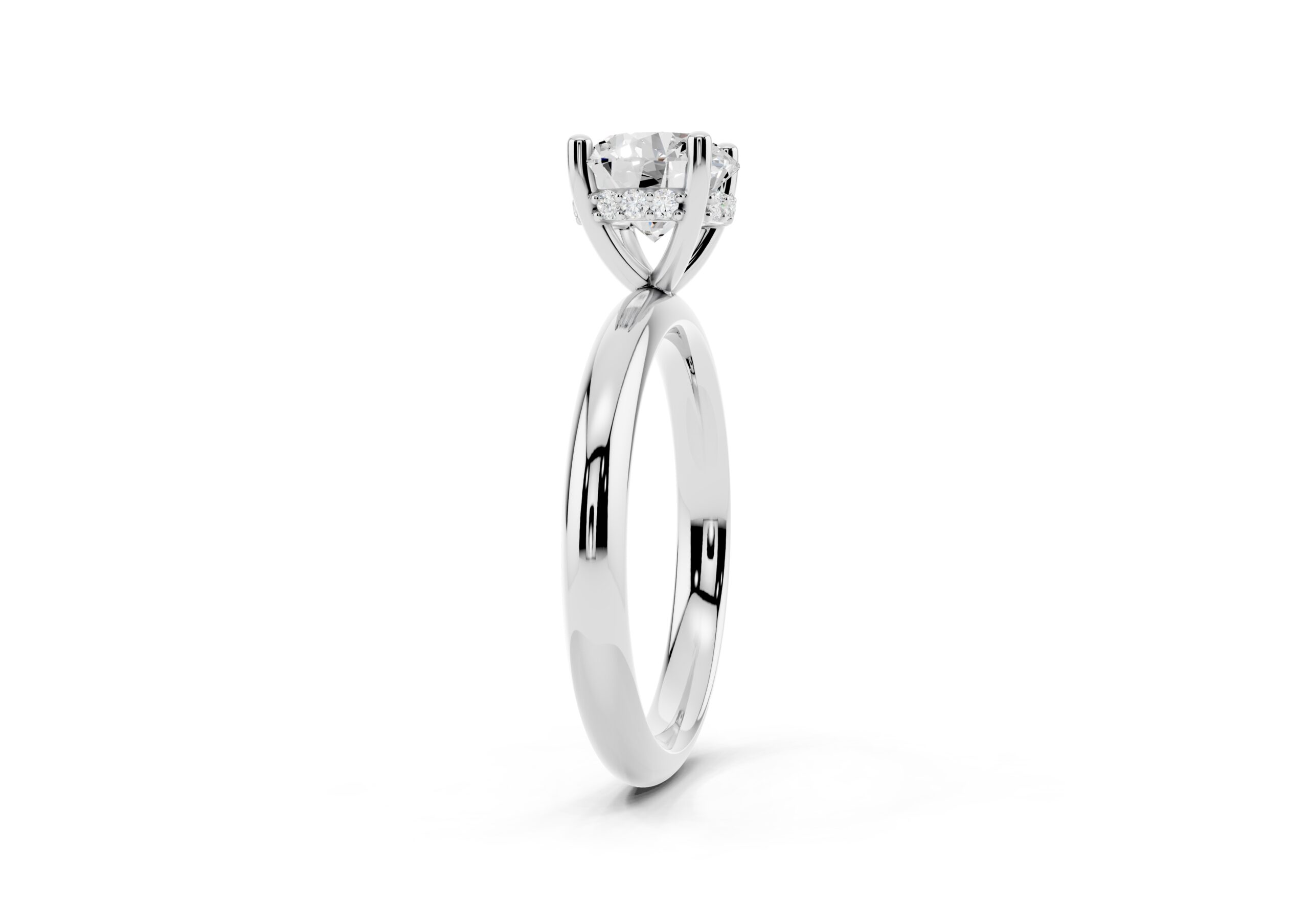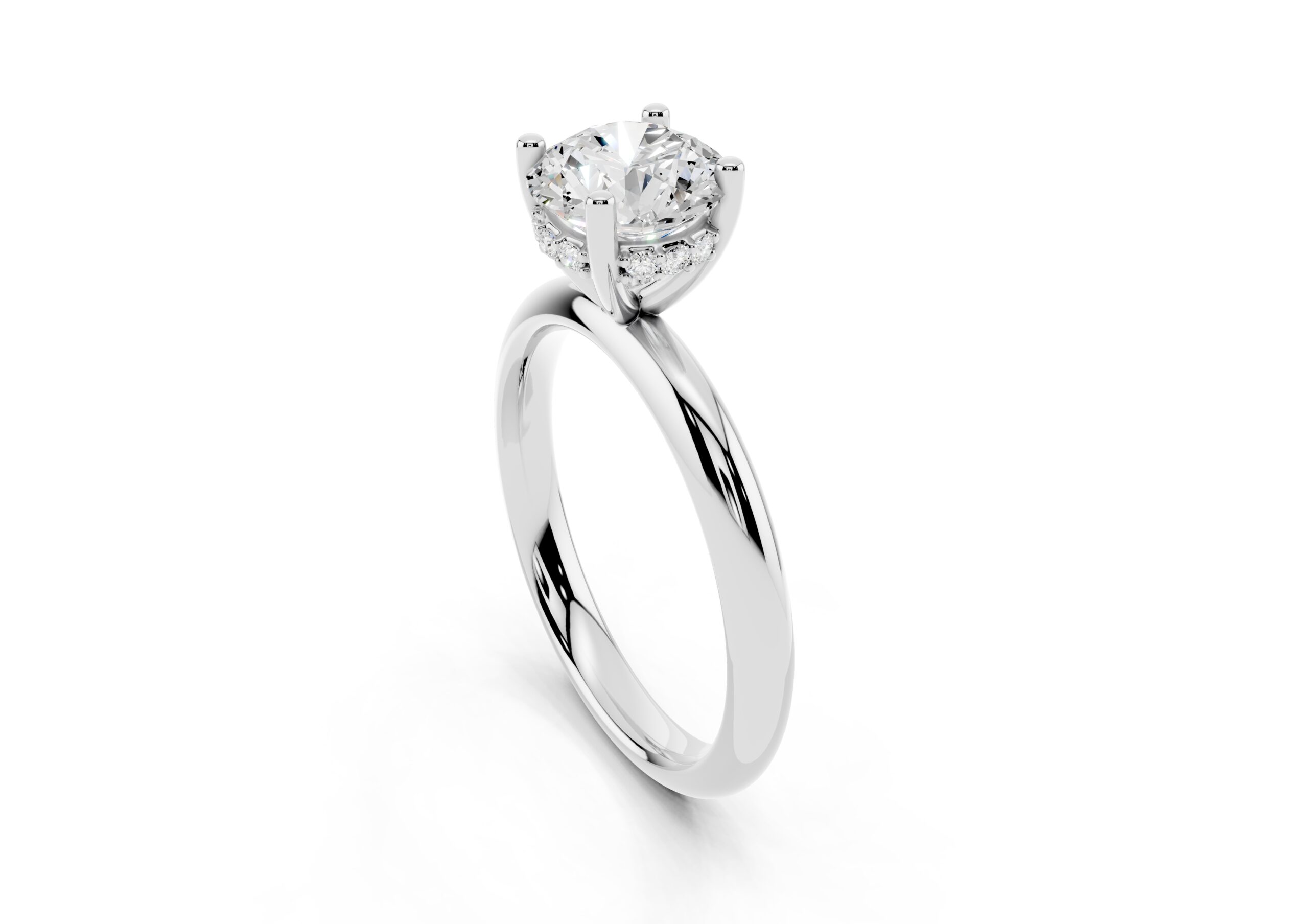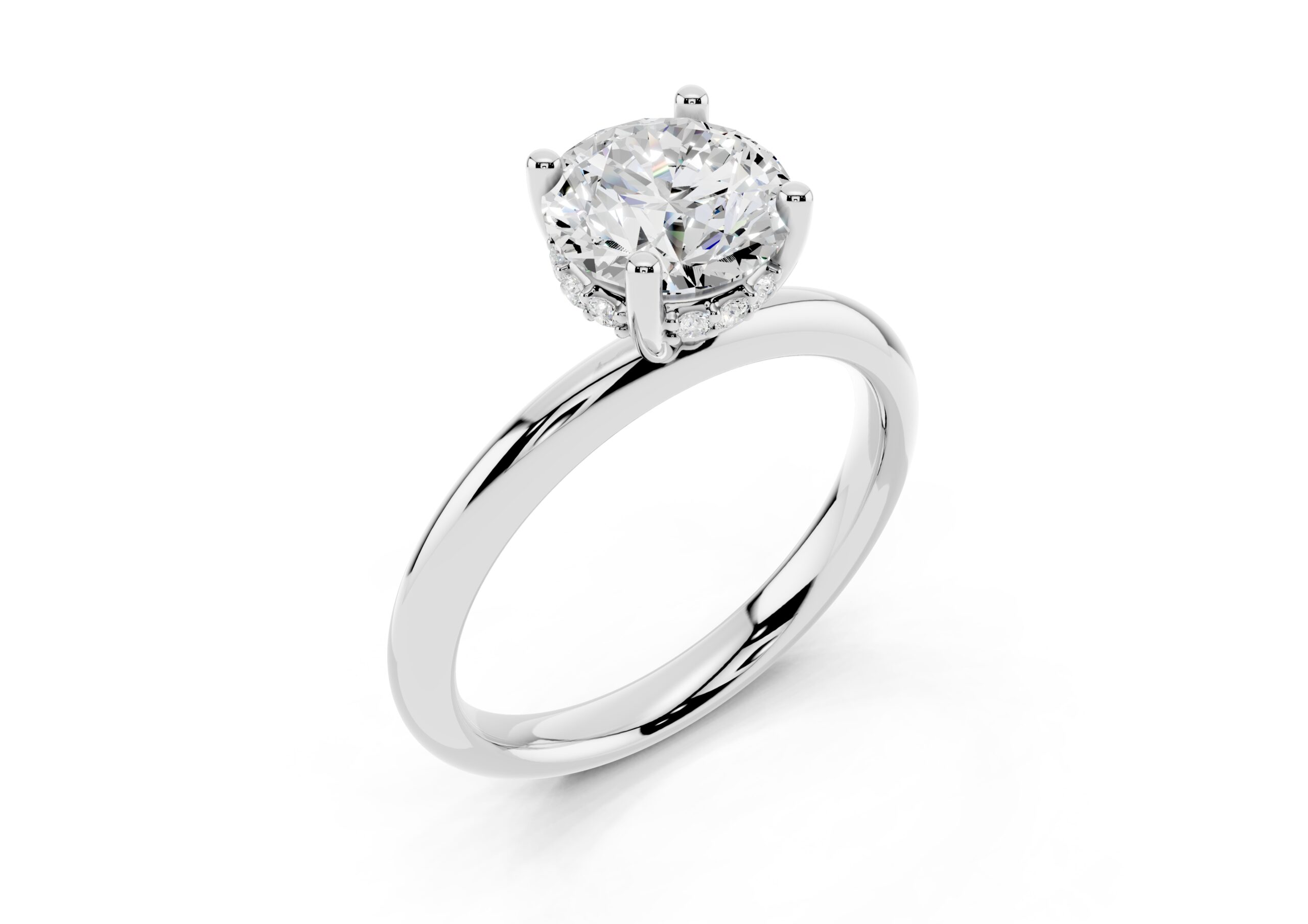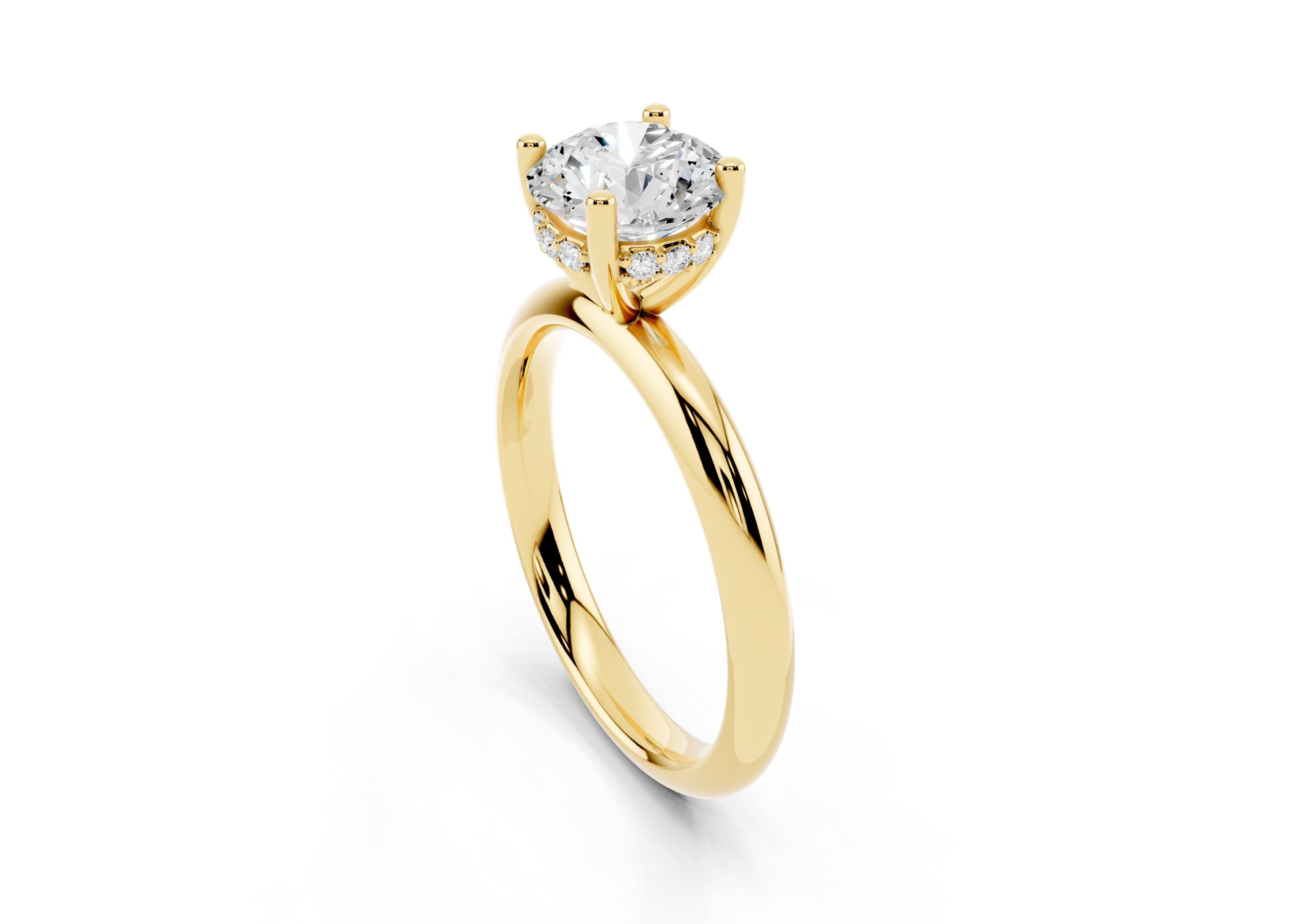 Classic at first glance, this solitaire ring hides a secret sparkle beneath the surface. A luminous round diamond sits in a graceful four-prong setting, with a delicate hidden halo of pavé-set diamonds encircling the base—creating a subtle radiance that glows from within. Refined, modern, and quietly dazzling, it’s a ring that shines for those who love elegance with a twist.