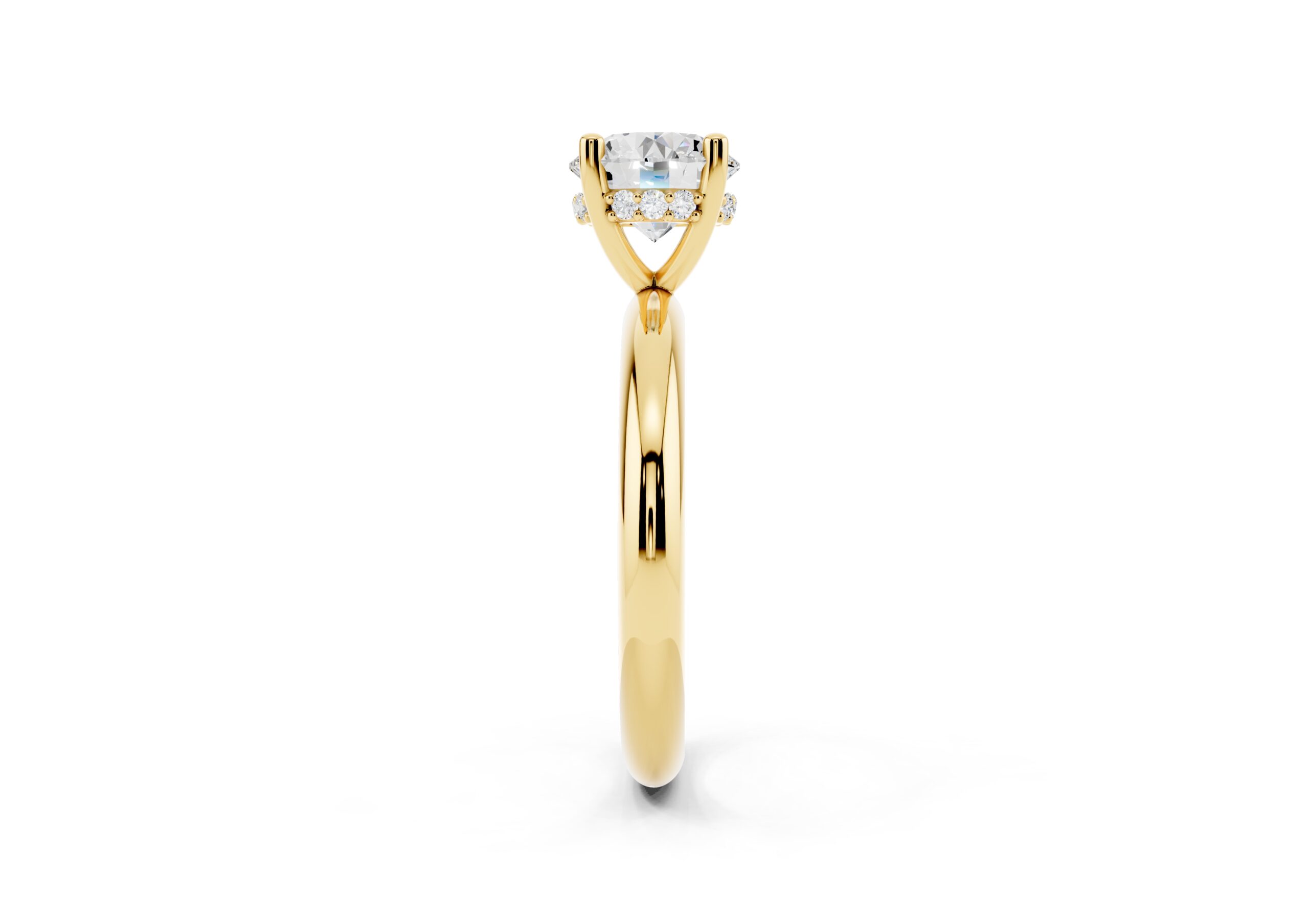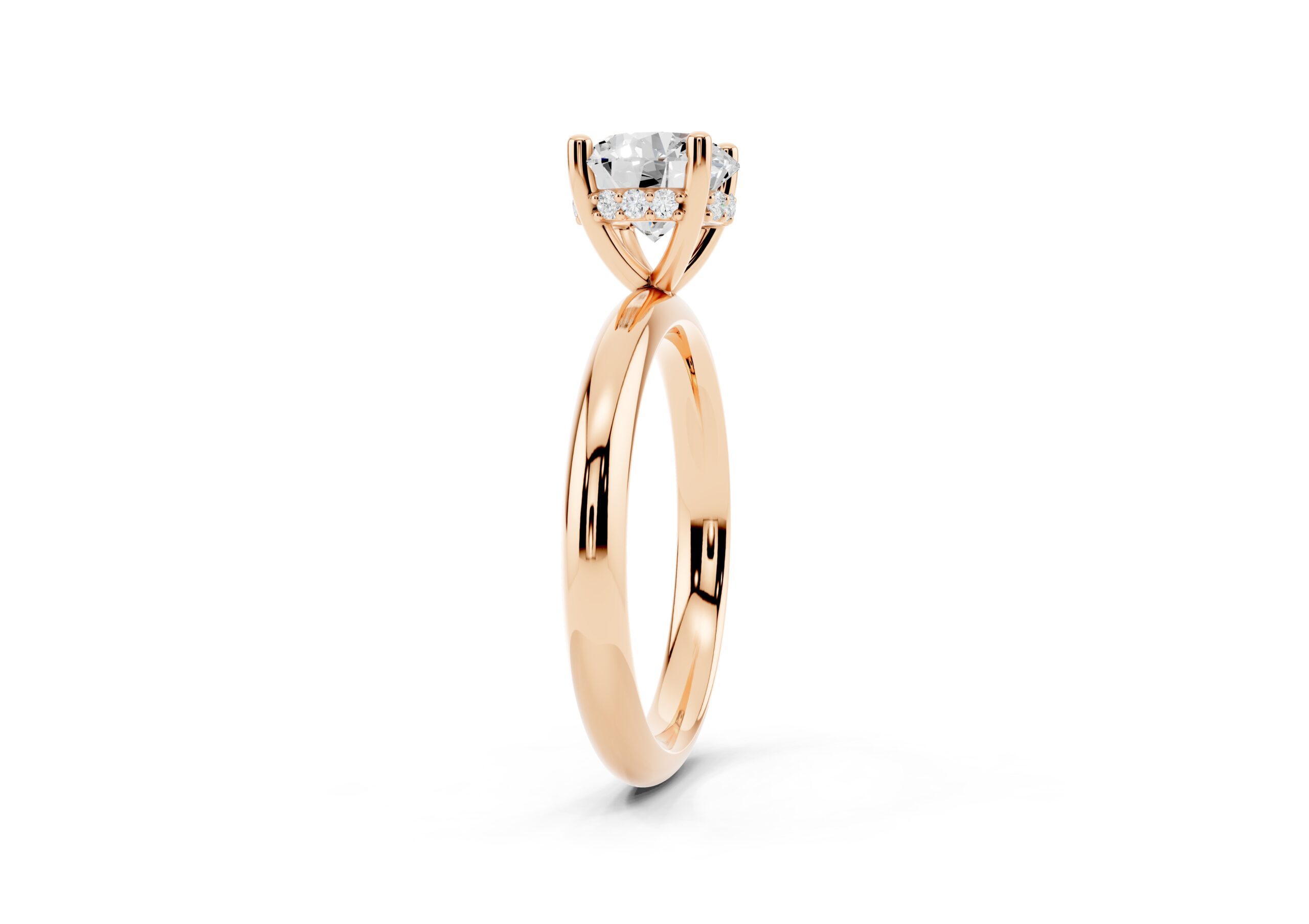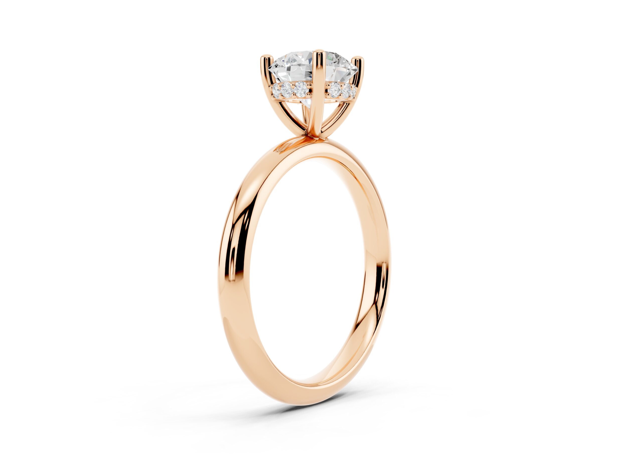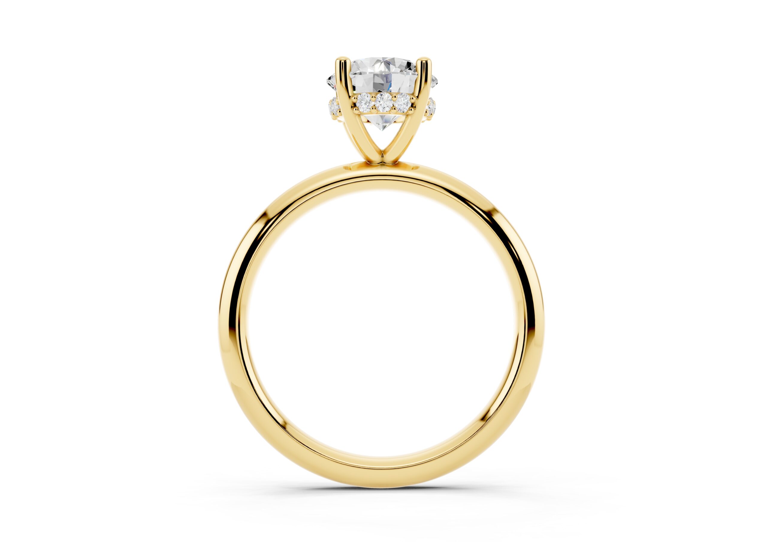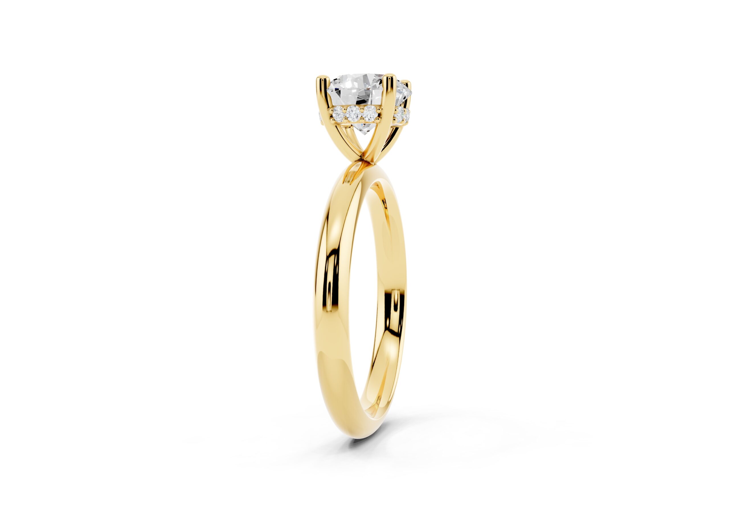 Classic at first glance, this solitaire ring hides a secret sparkle beneath the surface. A luminous round diamond sits in a graceful four-prong setting, with a delicate hidden halo of pavé-set diamonds encircling the base—creating a subtle radiance that glows from within. Refined, modern, and quietly dazzling, it’s a ring that shines for those who love elegance with a twist.