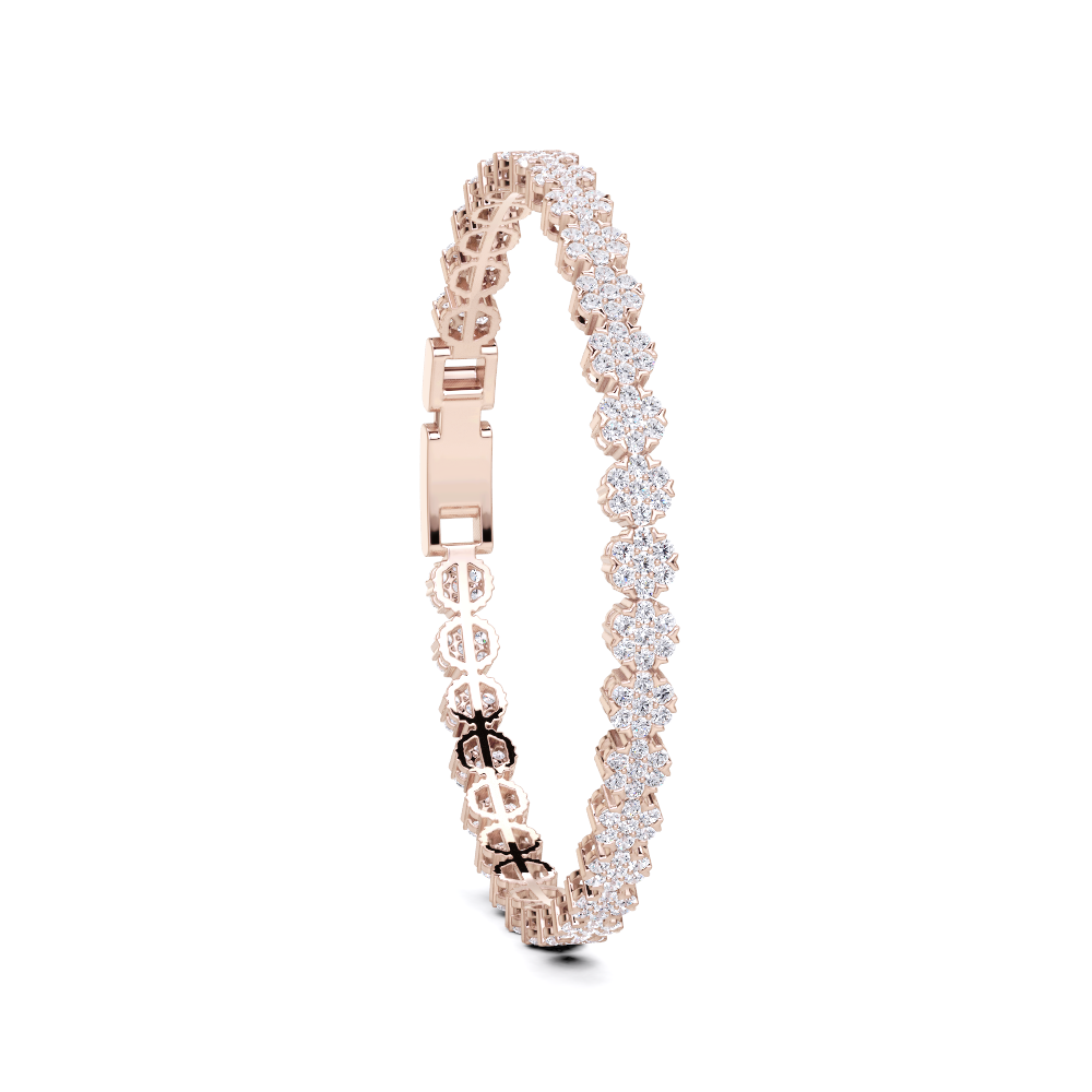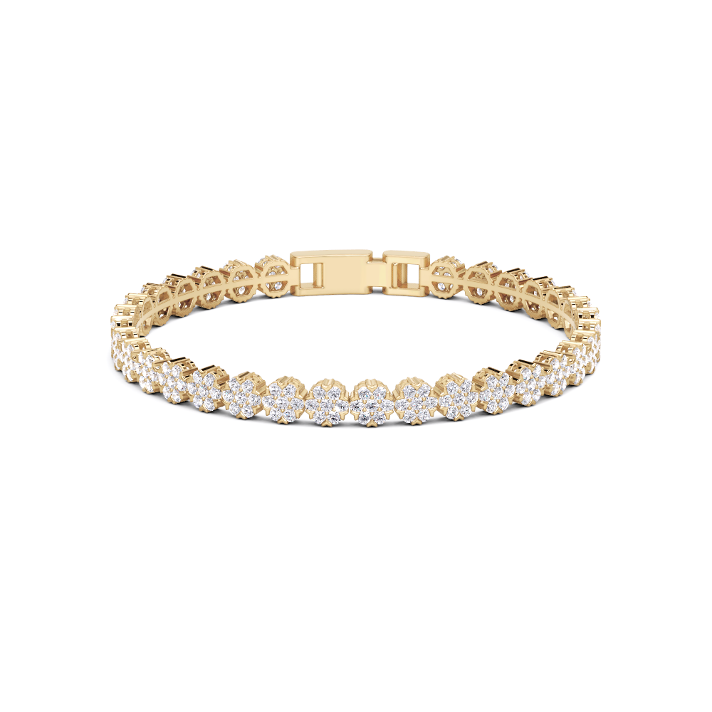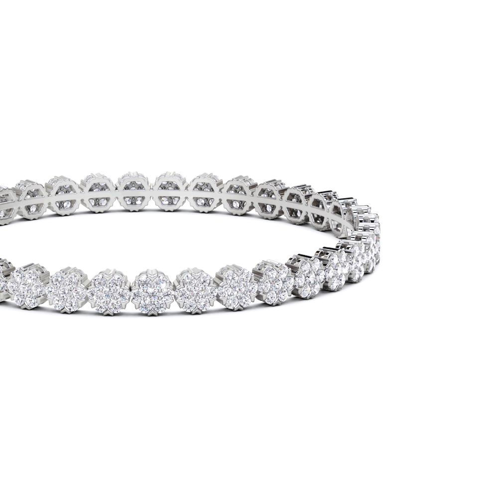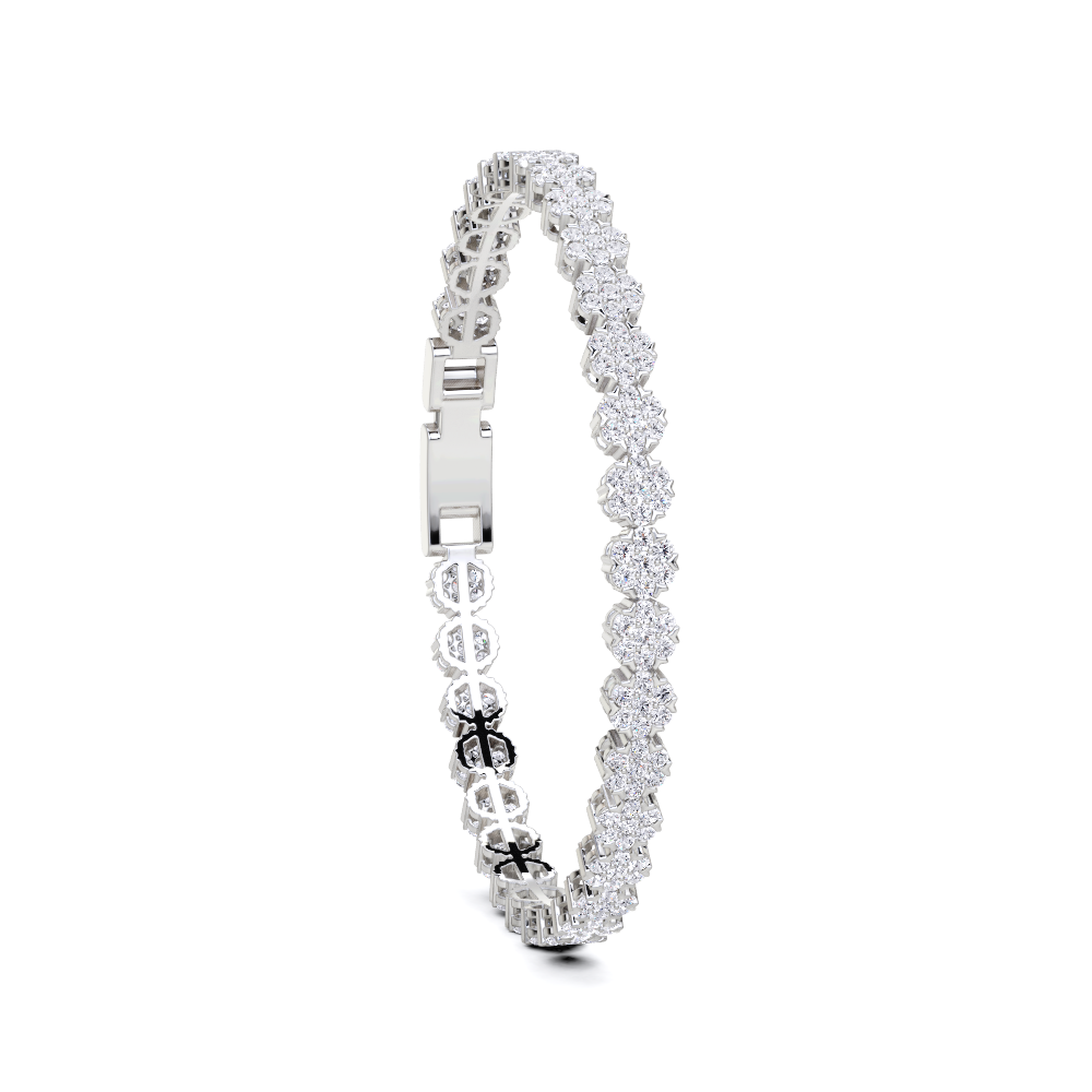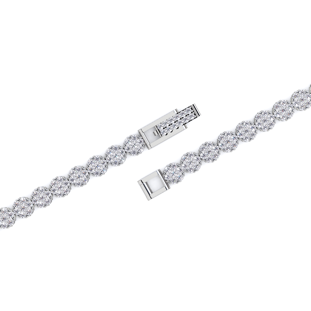 This bracelet radiates refined brilliance through its floral cluster arrangement, where each motif is formed by a central stone embraced by a ring of smaller accents.