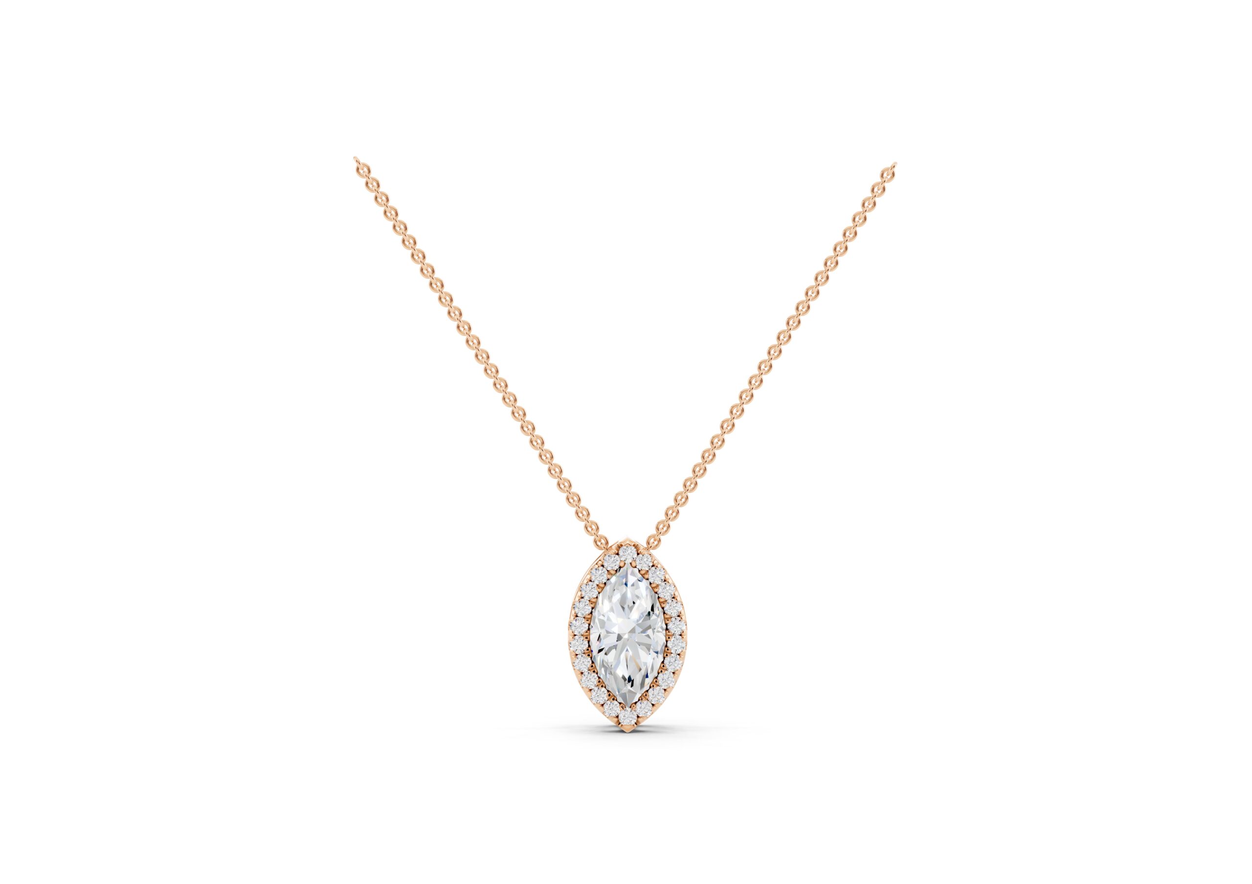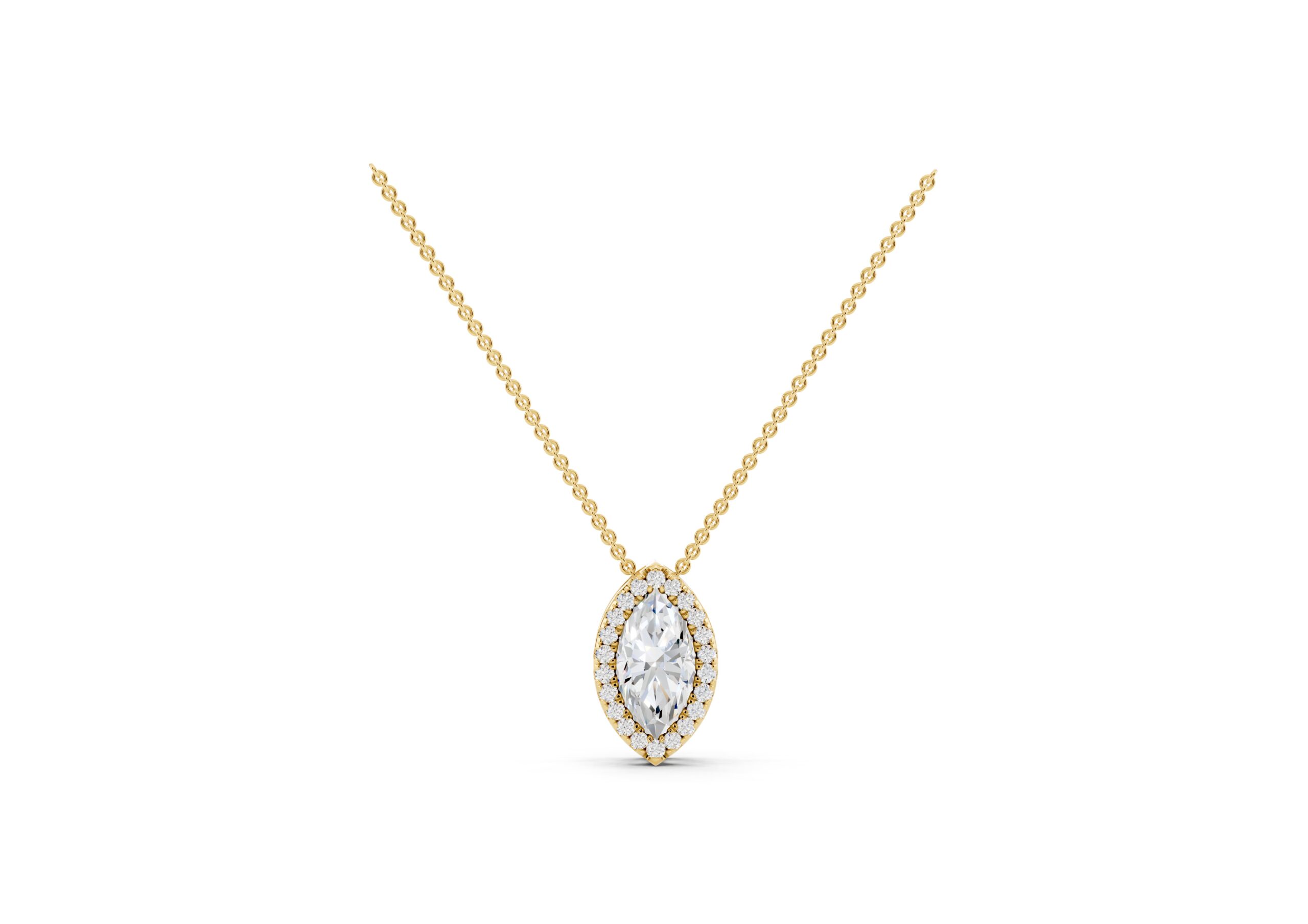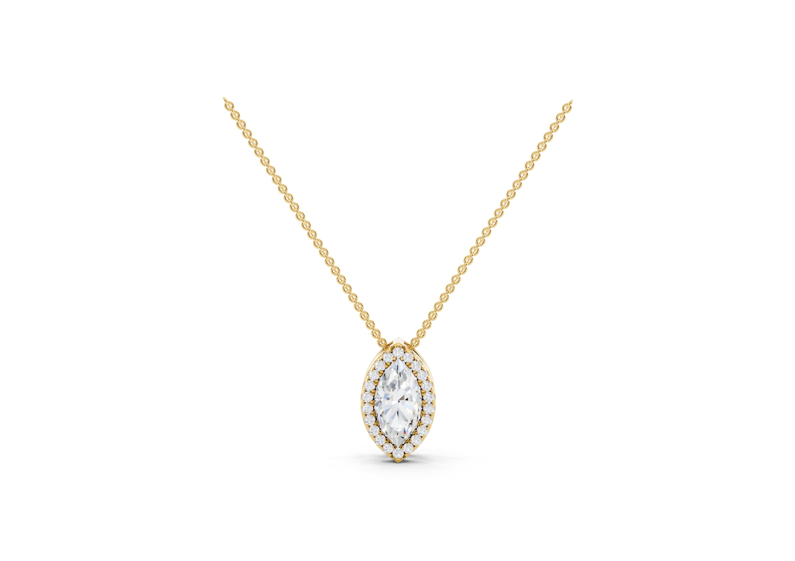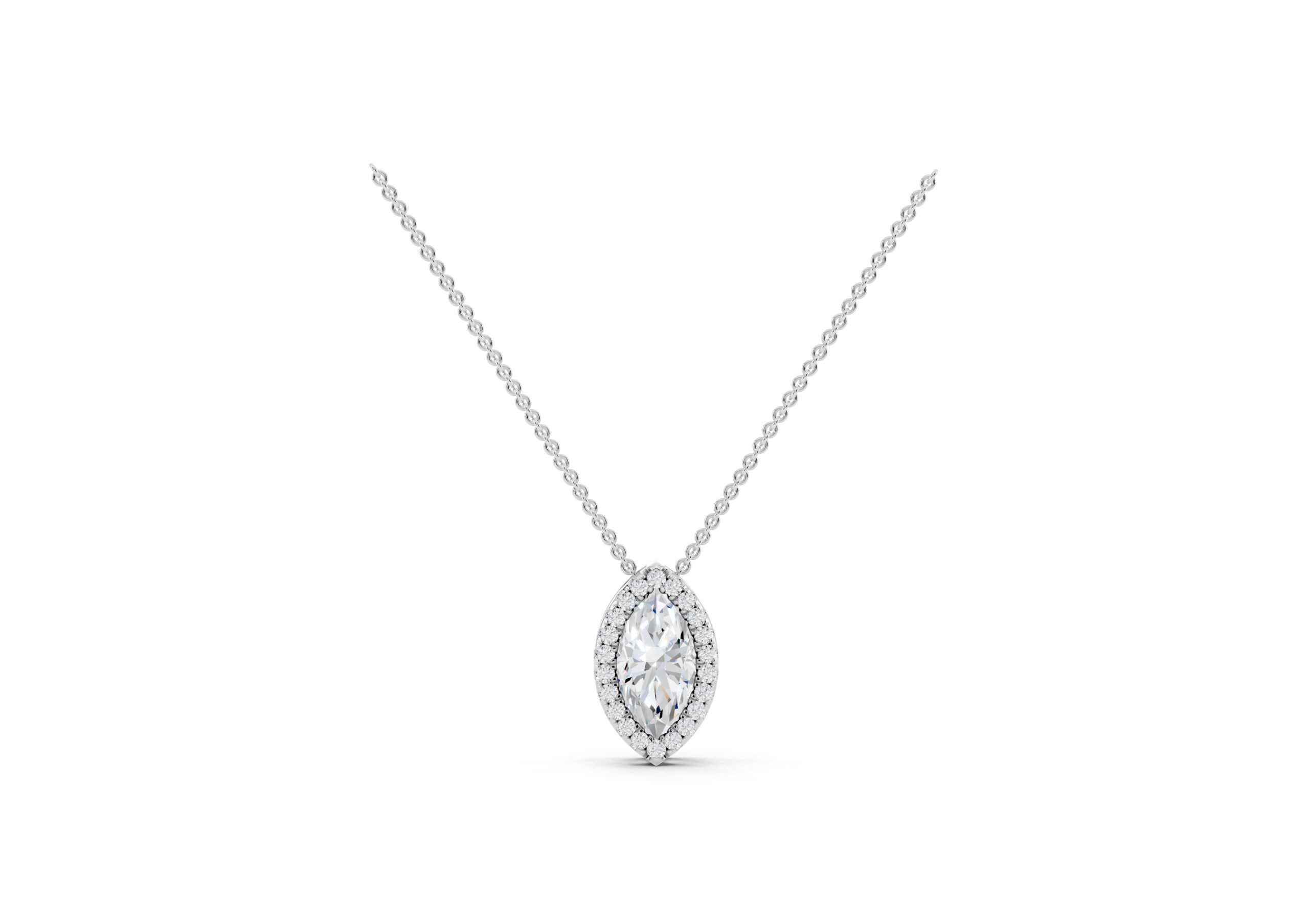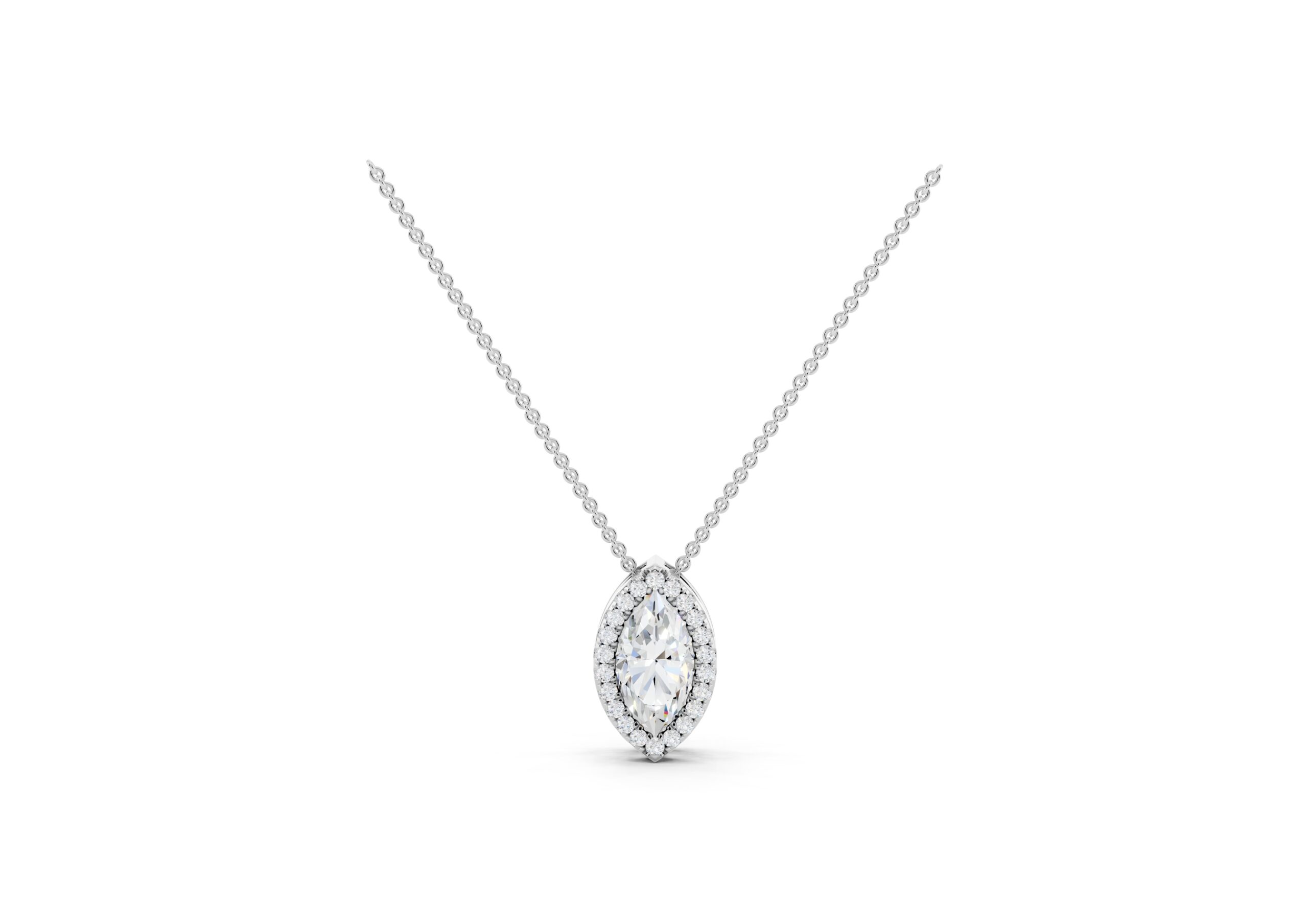 A marquise-cut diamond rests at the heart of this pendant, encircled by a halo of round diamonds that enhance its elongated, graceful form. The pendant hangs delicately from a classic chain, offering a striking silhouette with subtle fluidity. Timeless yet eye-catching, this piece captures the elegance of symmetry and the brilliance of refined detailing.