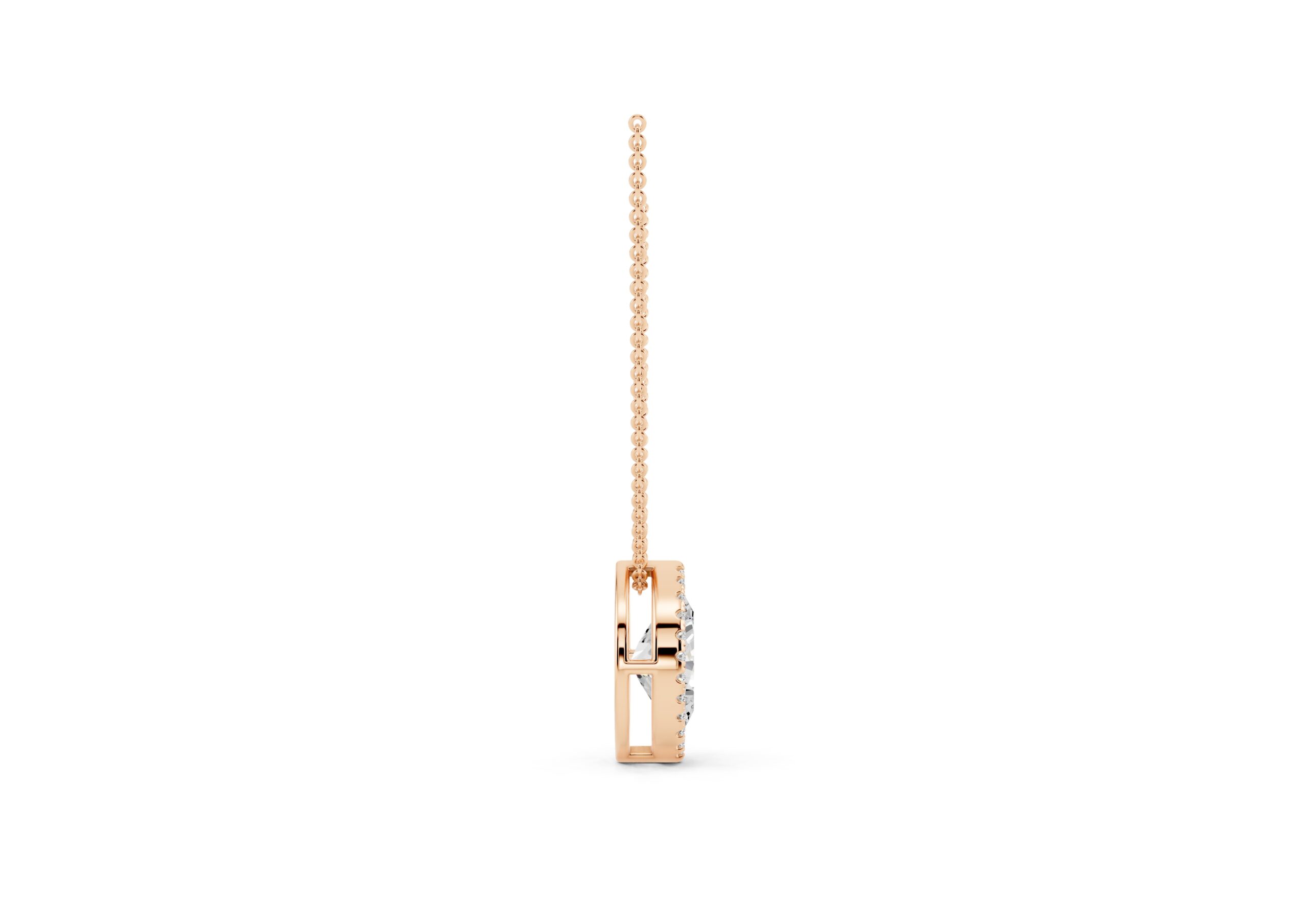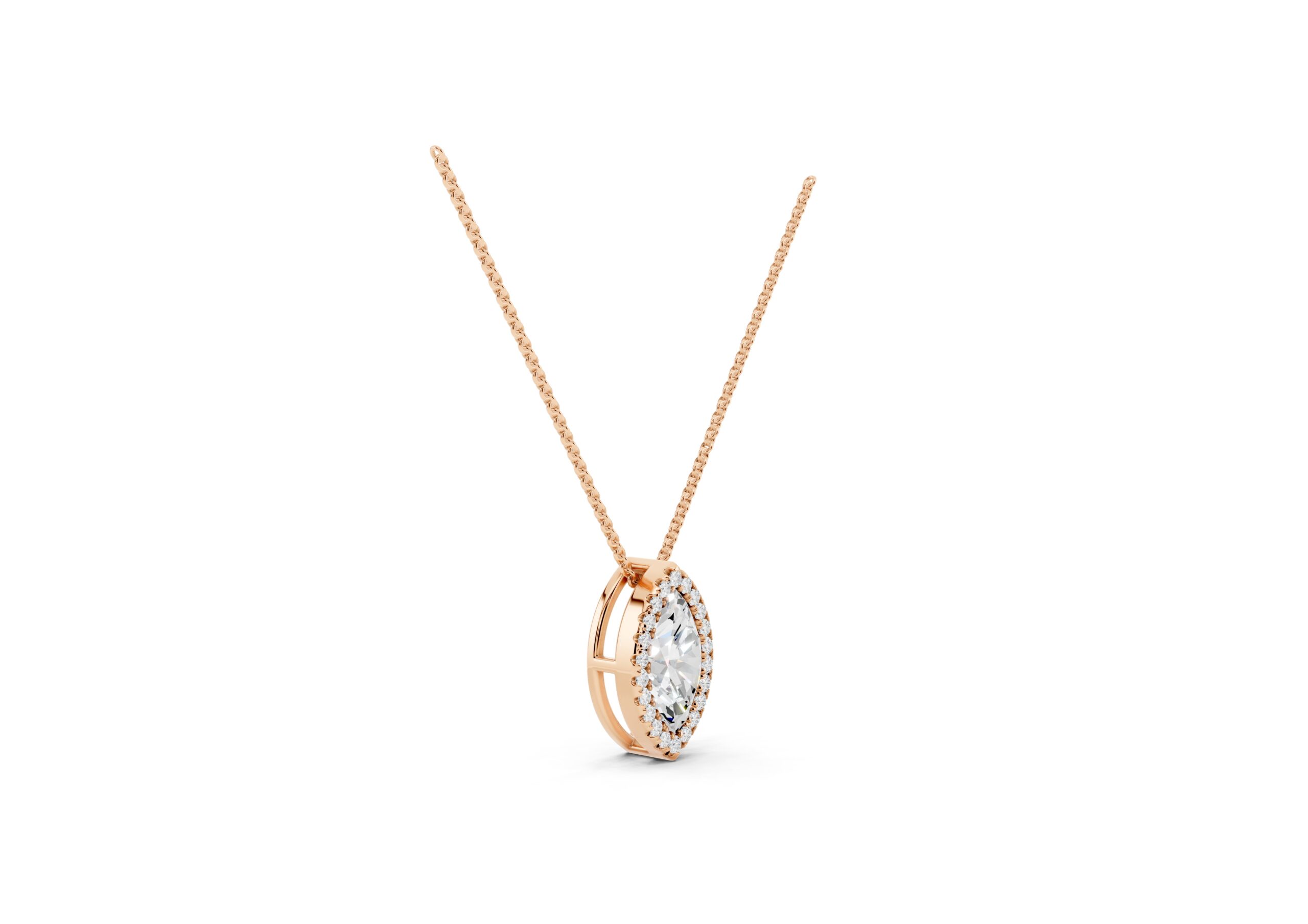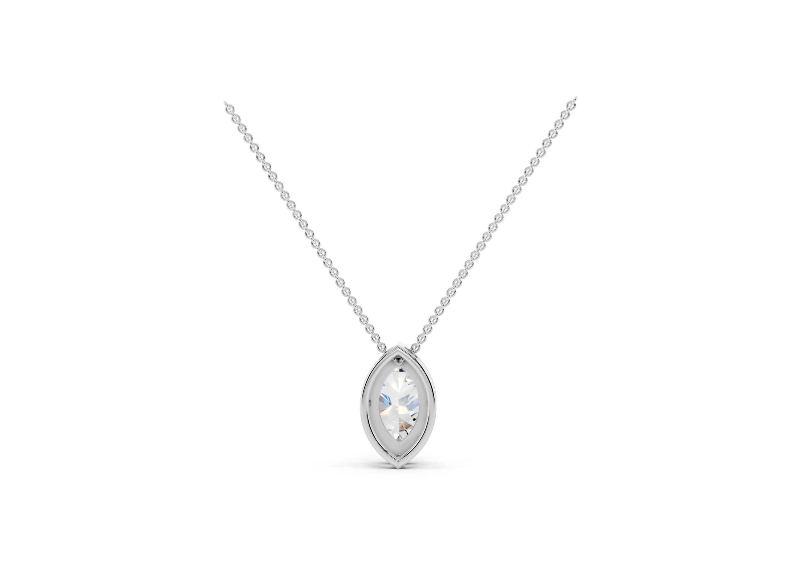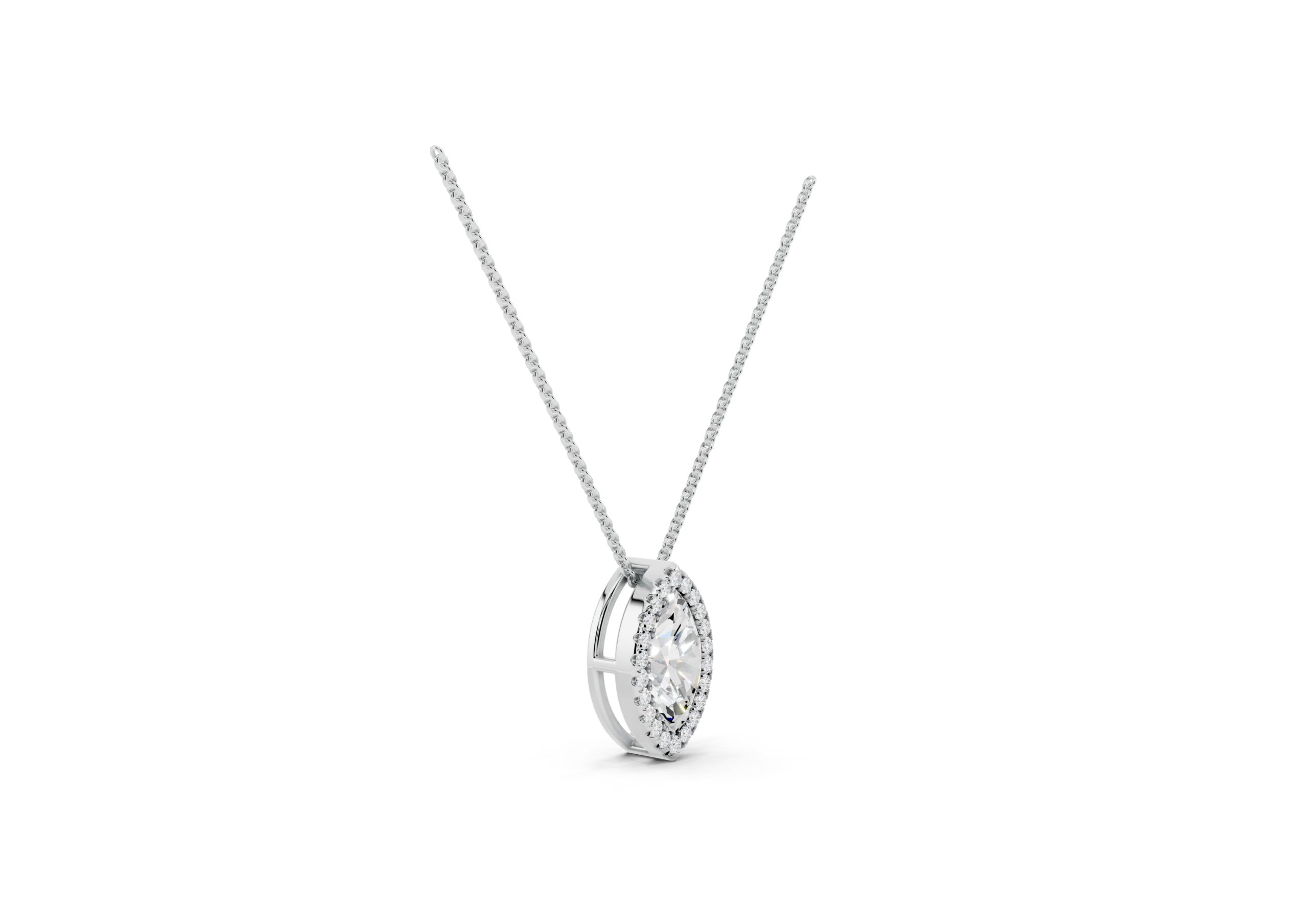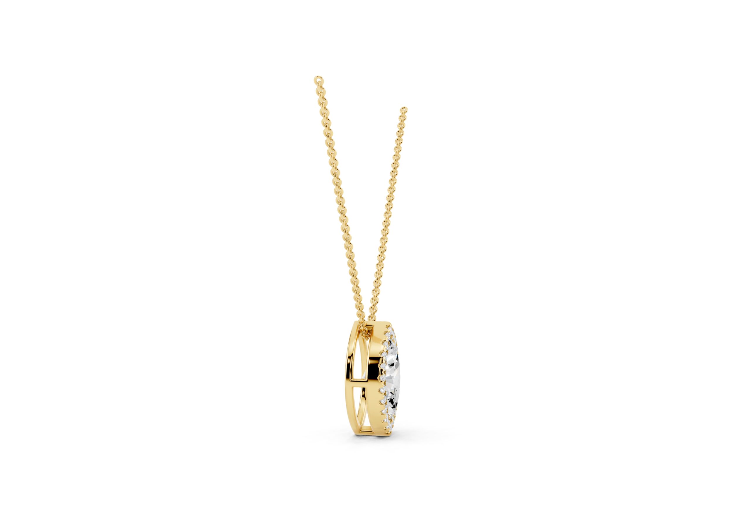 A marquise-cut diamond rests at the heart of this pendant, encircled by a halo of round diamonds that enhance its elongated, graceful form. The pendant hangs delicately from a classic chain, offering a striking silhouette with subtle fluidity. Timeless yet eye-catching, this piece captures the elegance of symmetry and the brilliance of refined detailing.