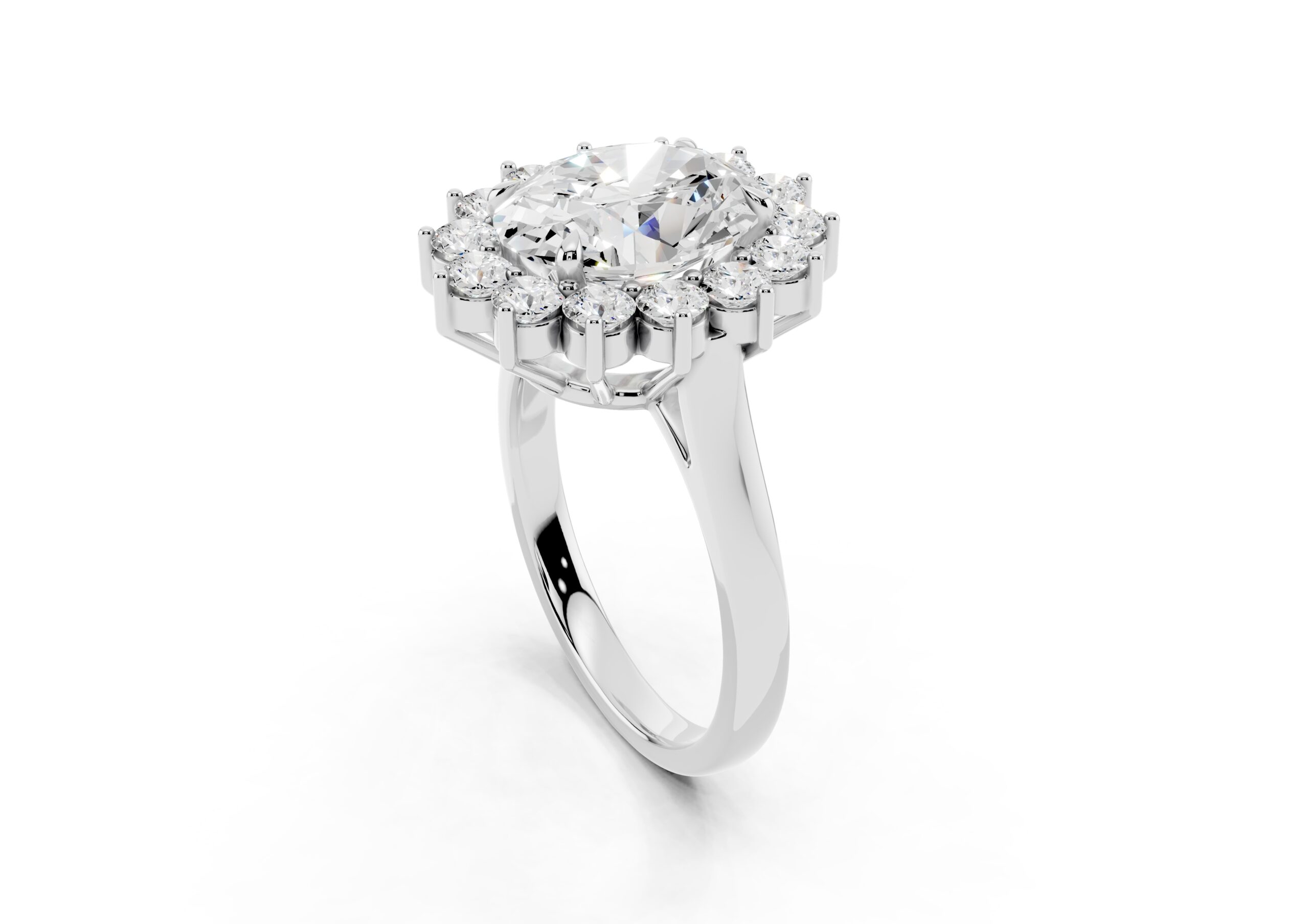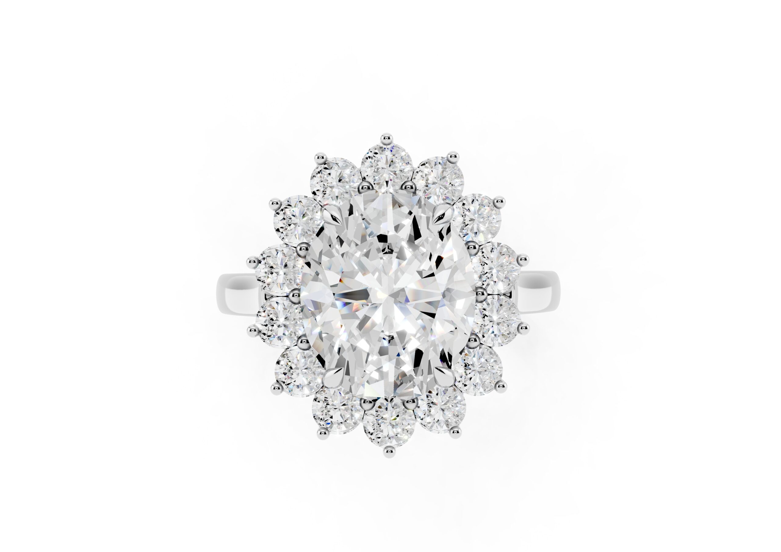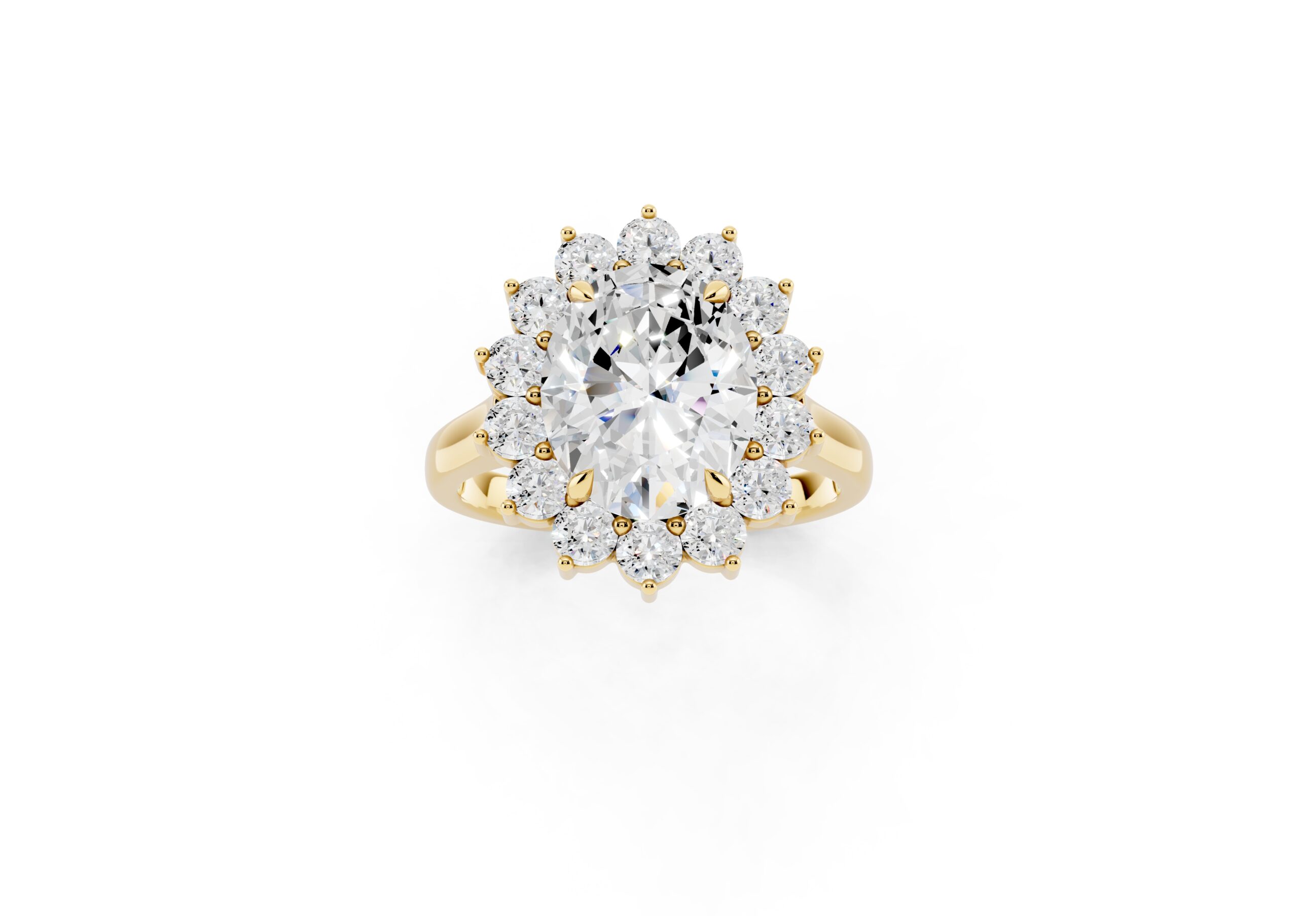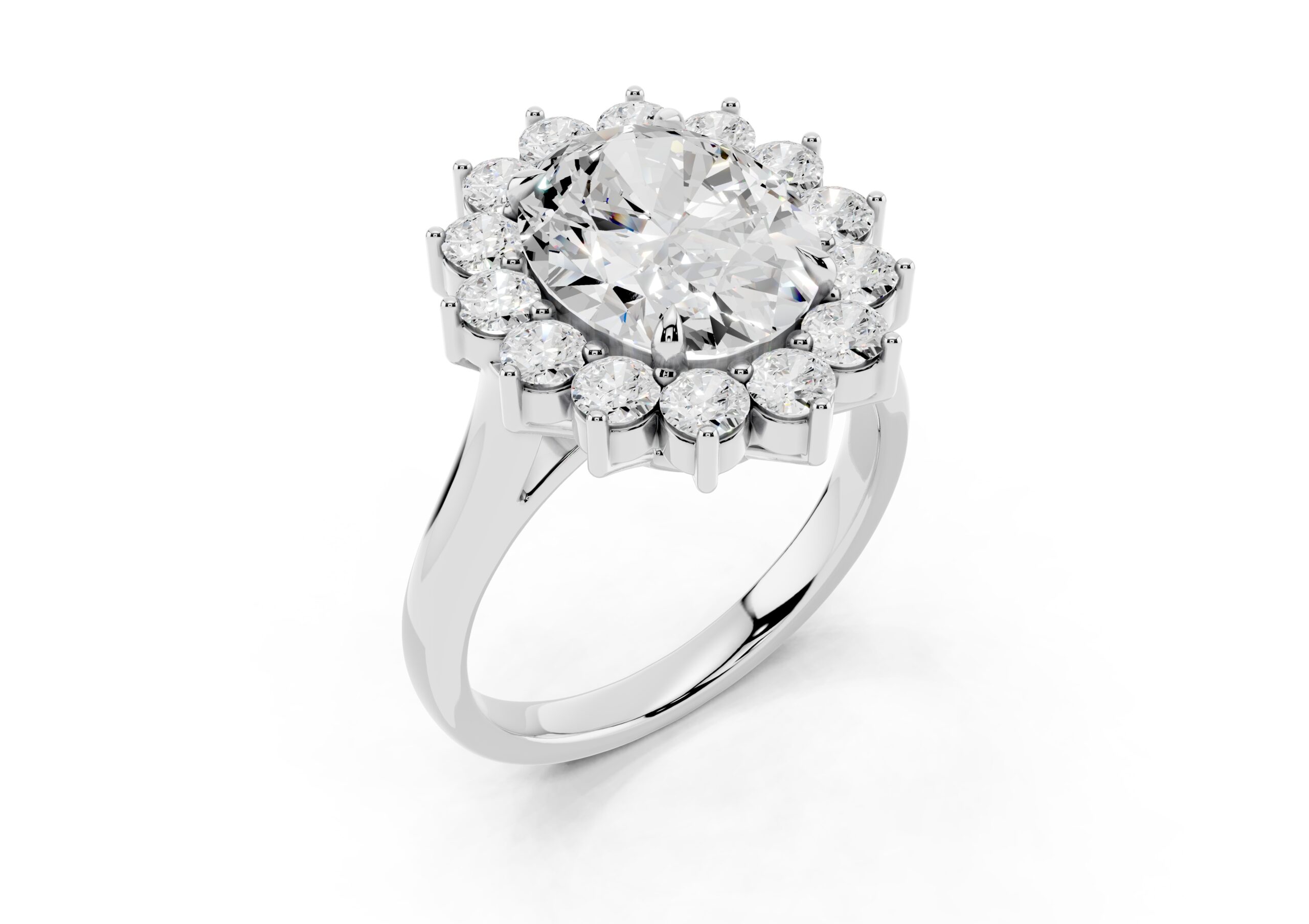 A vintage-inspired ring featuring an oval center stone surrounded by a striking halo of round stones. The design’s floral-like silhouette, elevated by prong settings, creates a radiant burst of brilliance, blending timeless charm with elegant sophistication.