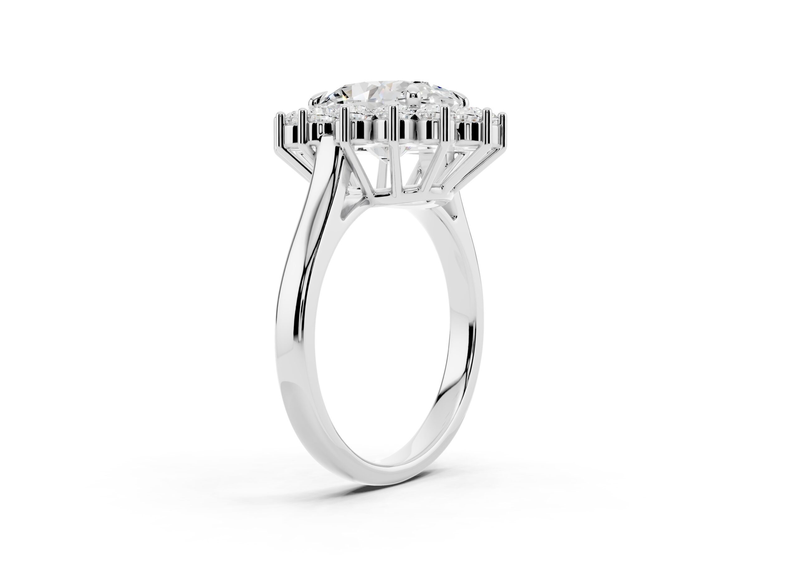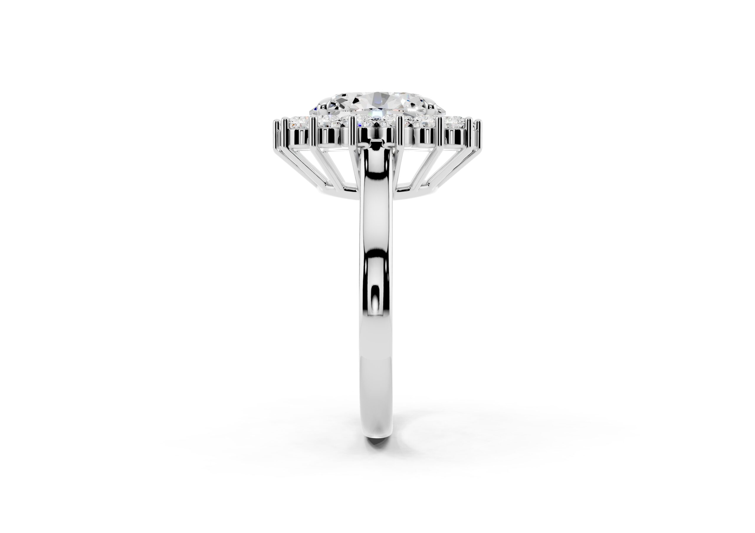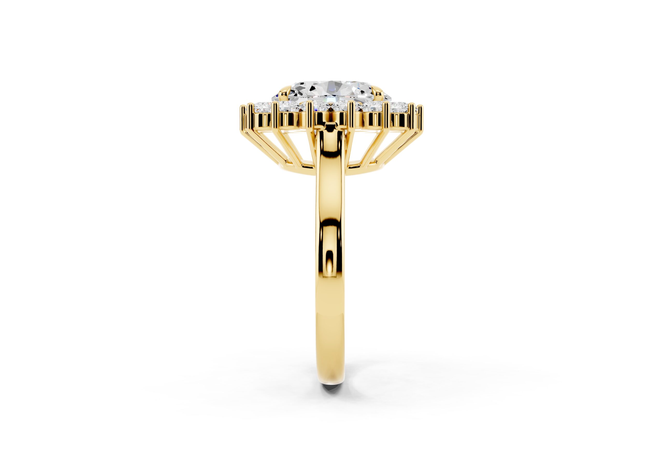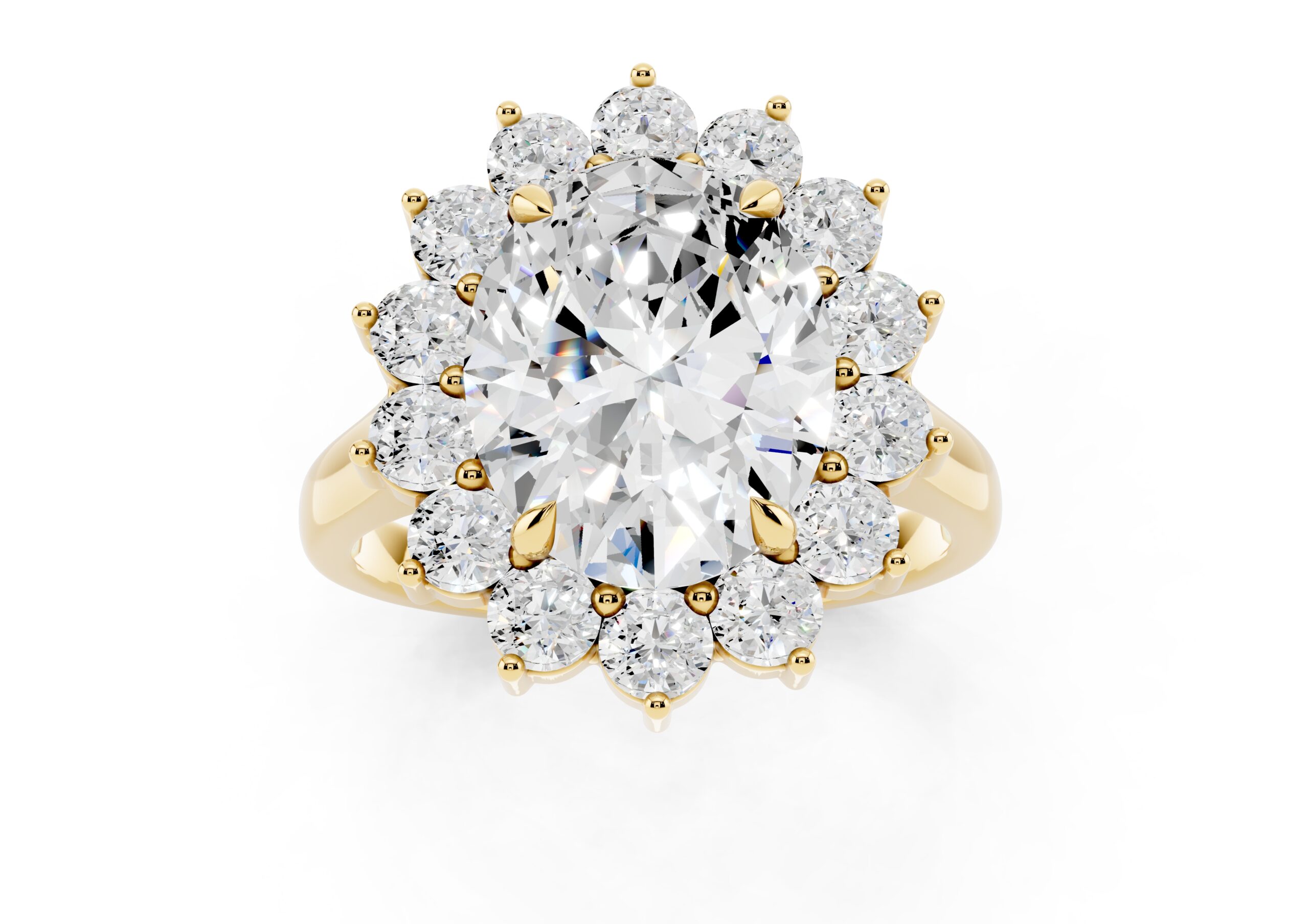 A vintage-inspired ring featuring an oval center stone surrounded by a striking halo of round stones. The design’s floral-like silhouette, elevated by prong settings, creates a radiant burst of brilliance, blending timeless charm with elegant sophistication.
