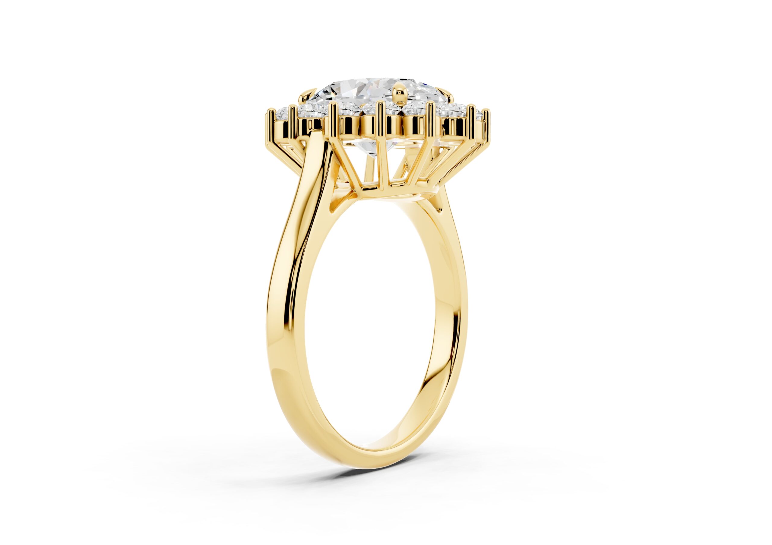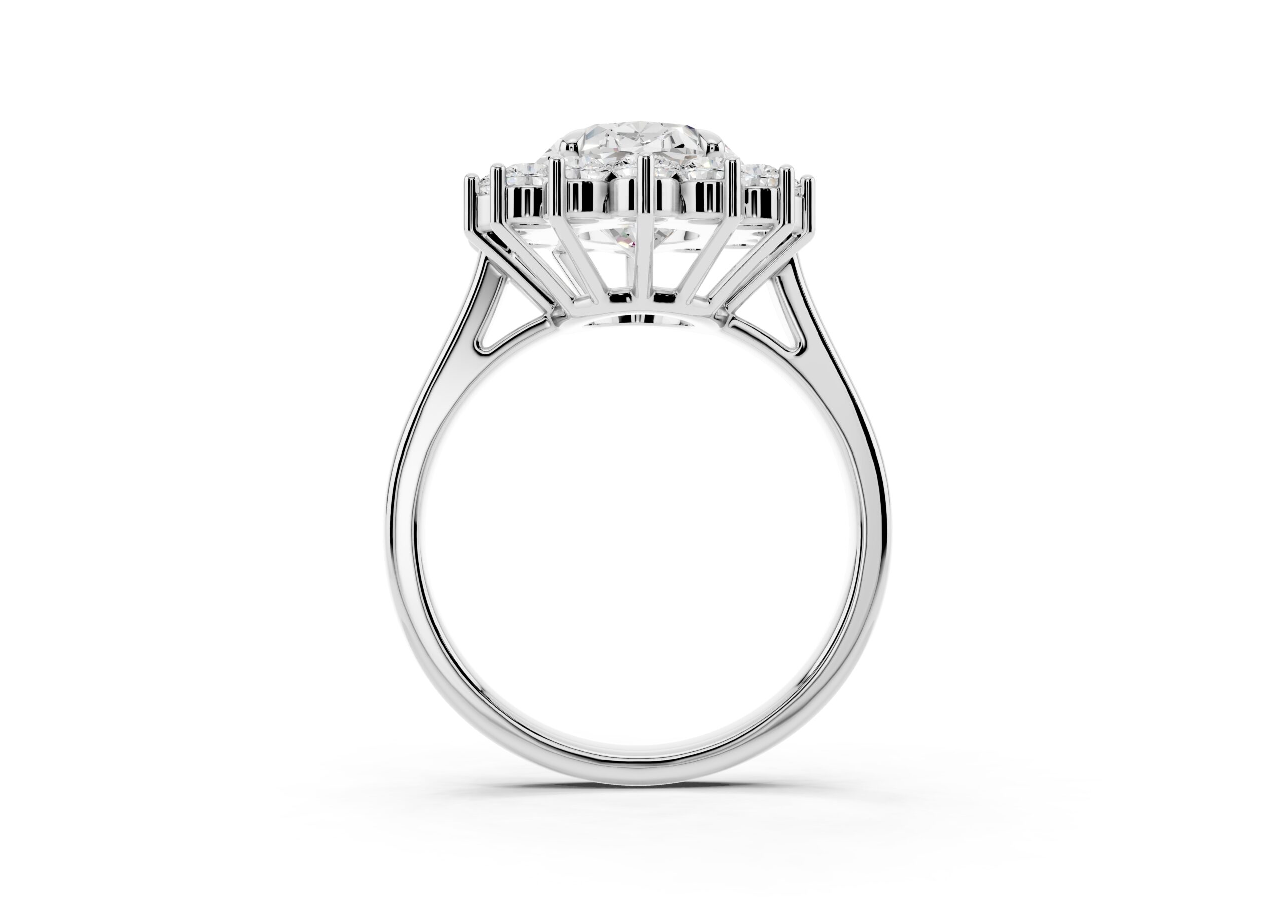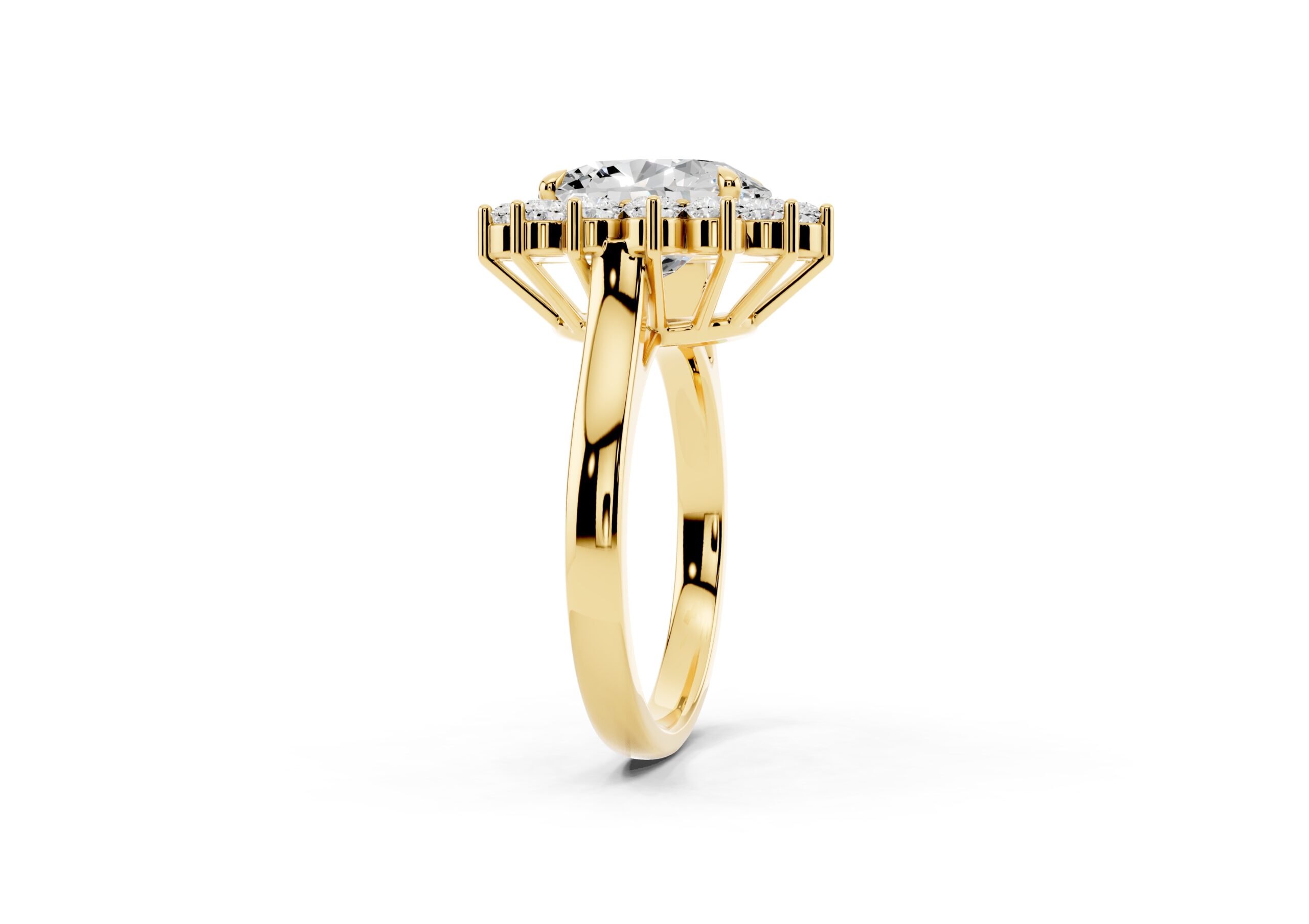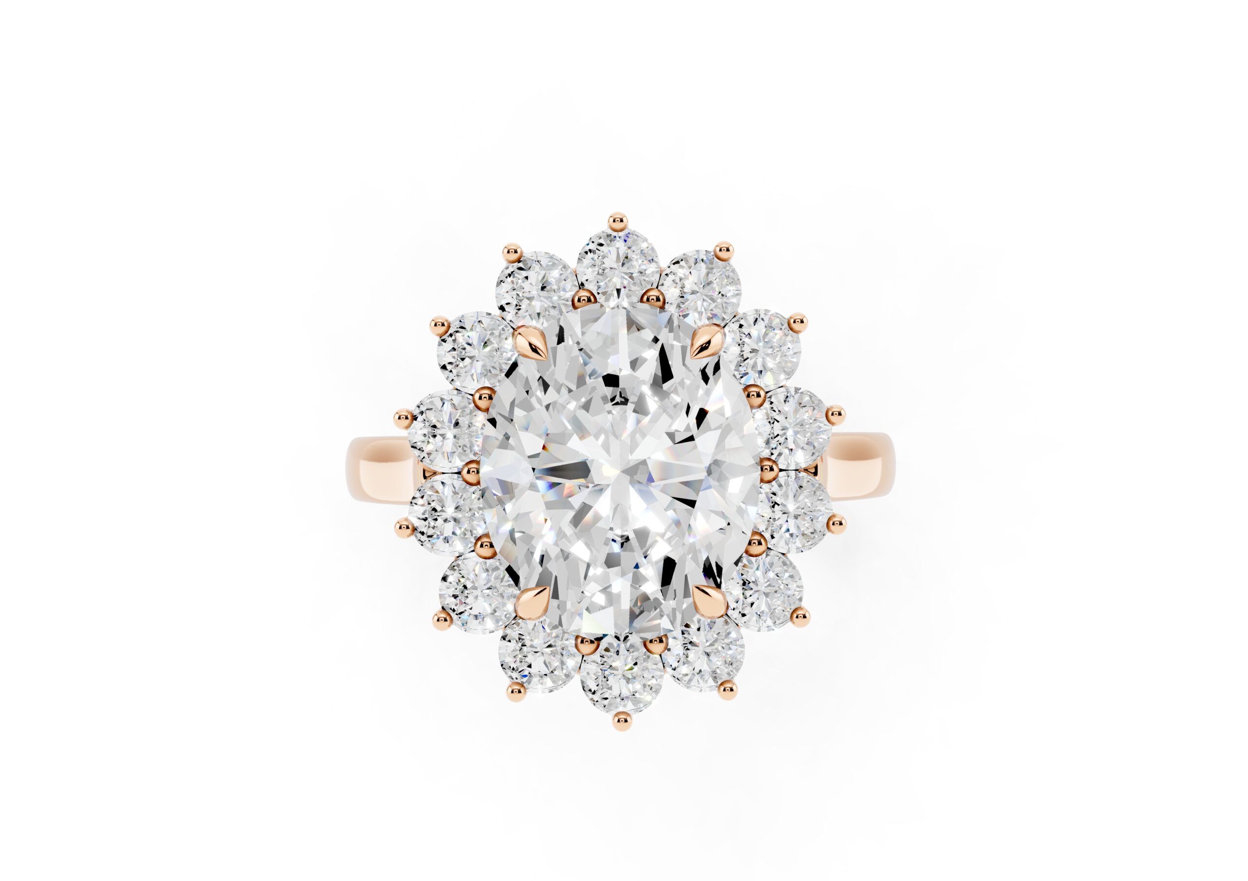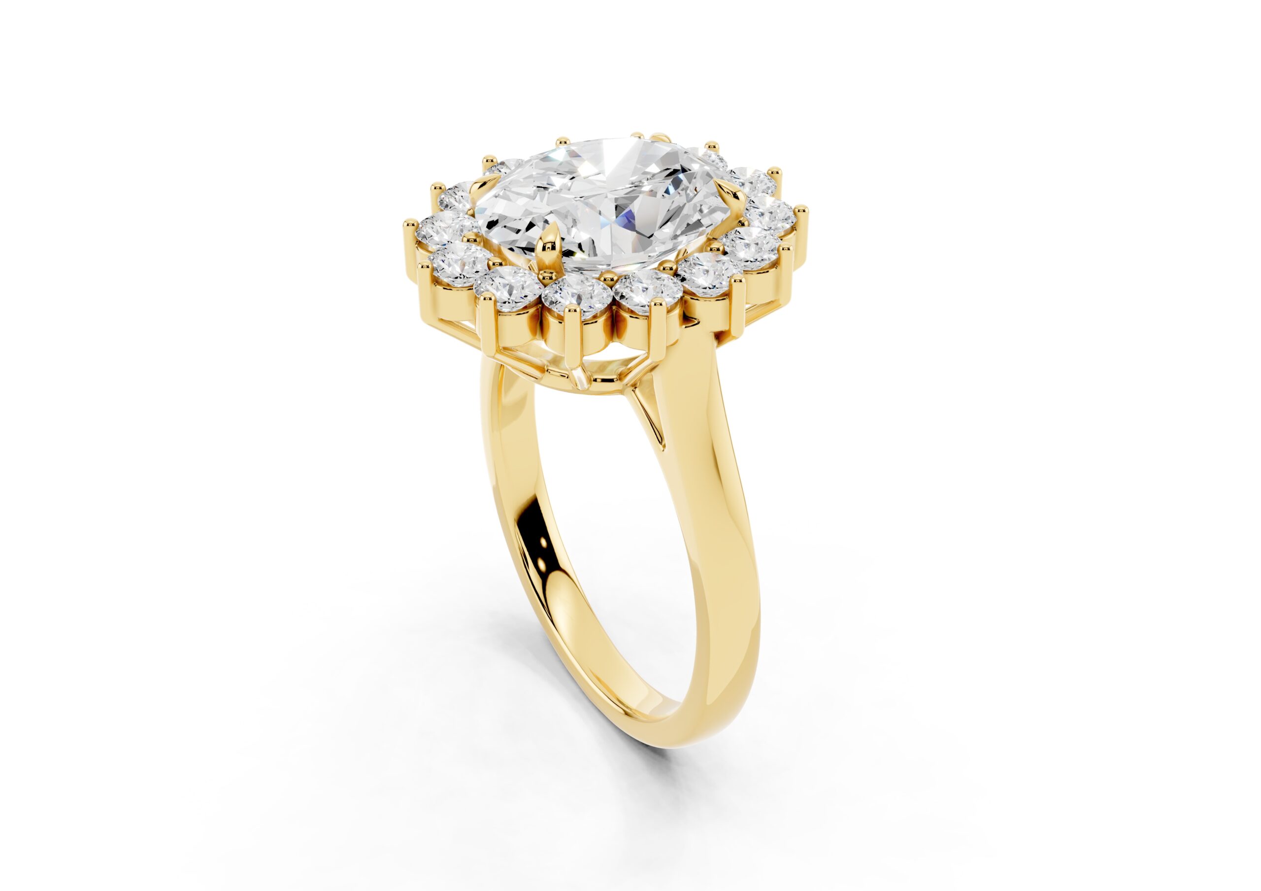 A vintage-inspired ring featuring an oval center stone surrounded by a striking halo of round stones. The design’s floral-like silhouette, elevated by prong settings, creates a radiant burst of brilliance, blending timeless charm with elegant sophistication.