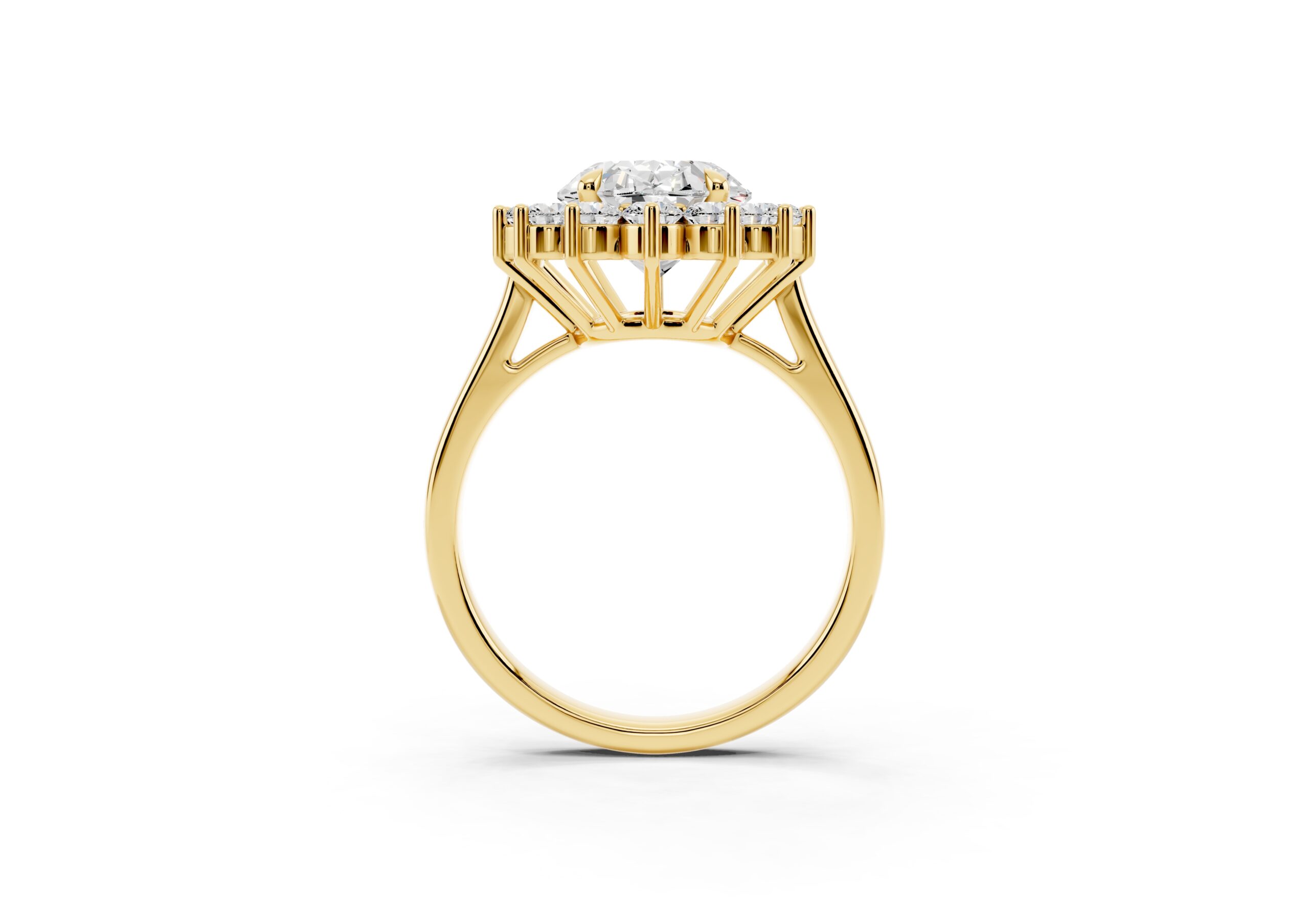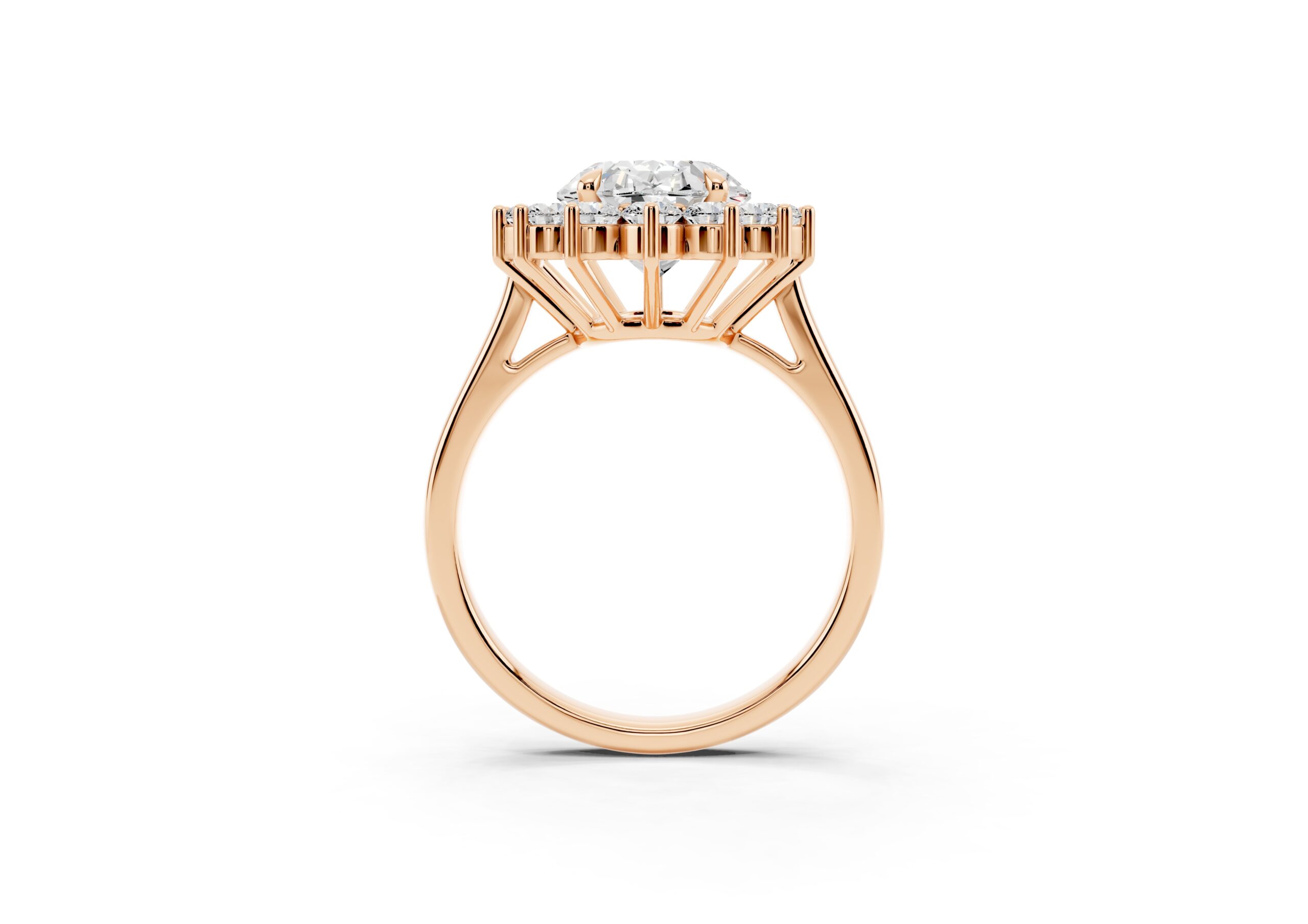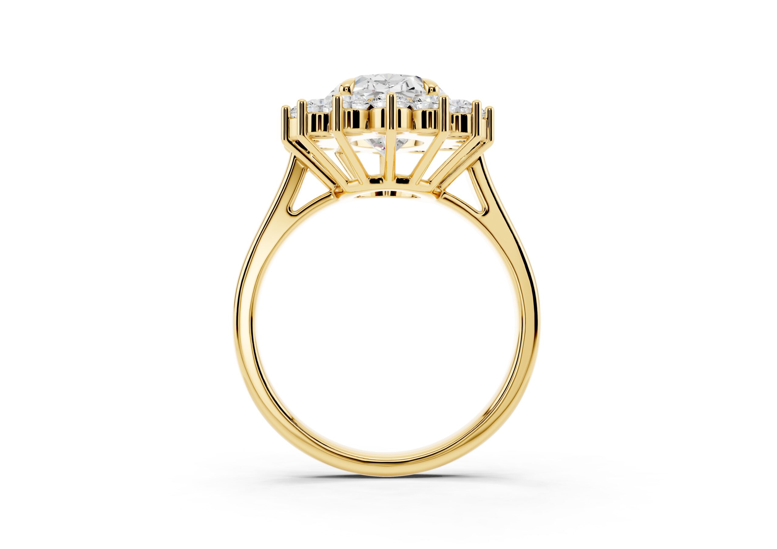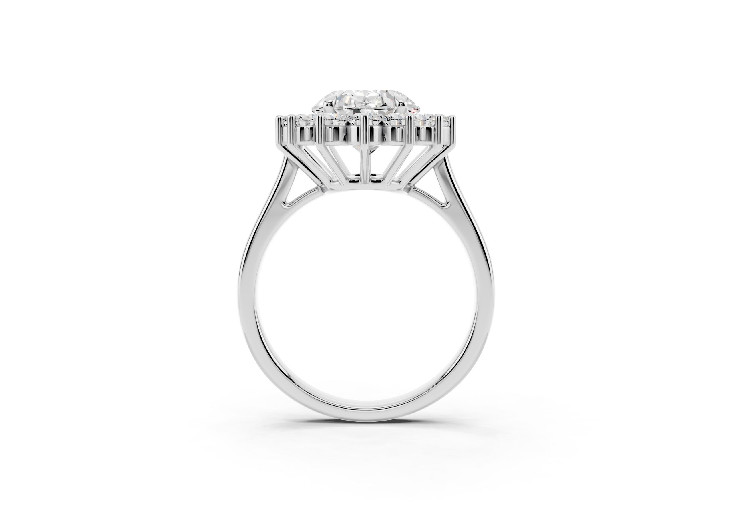 A vintage-inspired ring featuring an oval center stone surrounded by a striking halo of round stones. The design’s floral-like silhouette, elevated by prong settings, creates a radiant burst of brilliance, blending timeless charm with elegant sophistication.