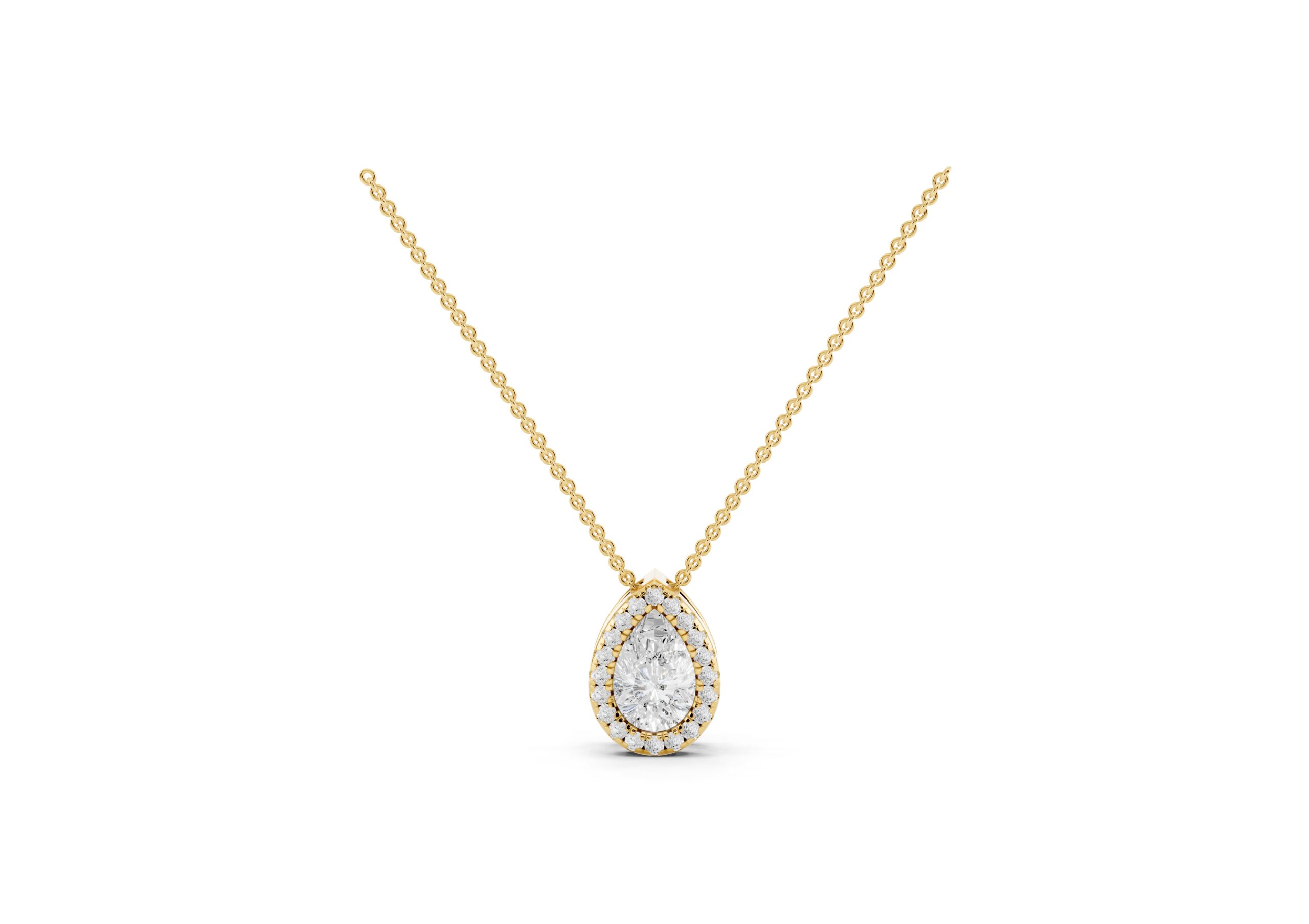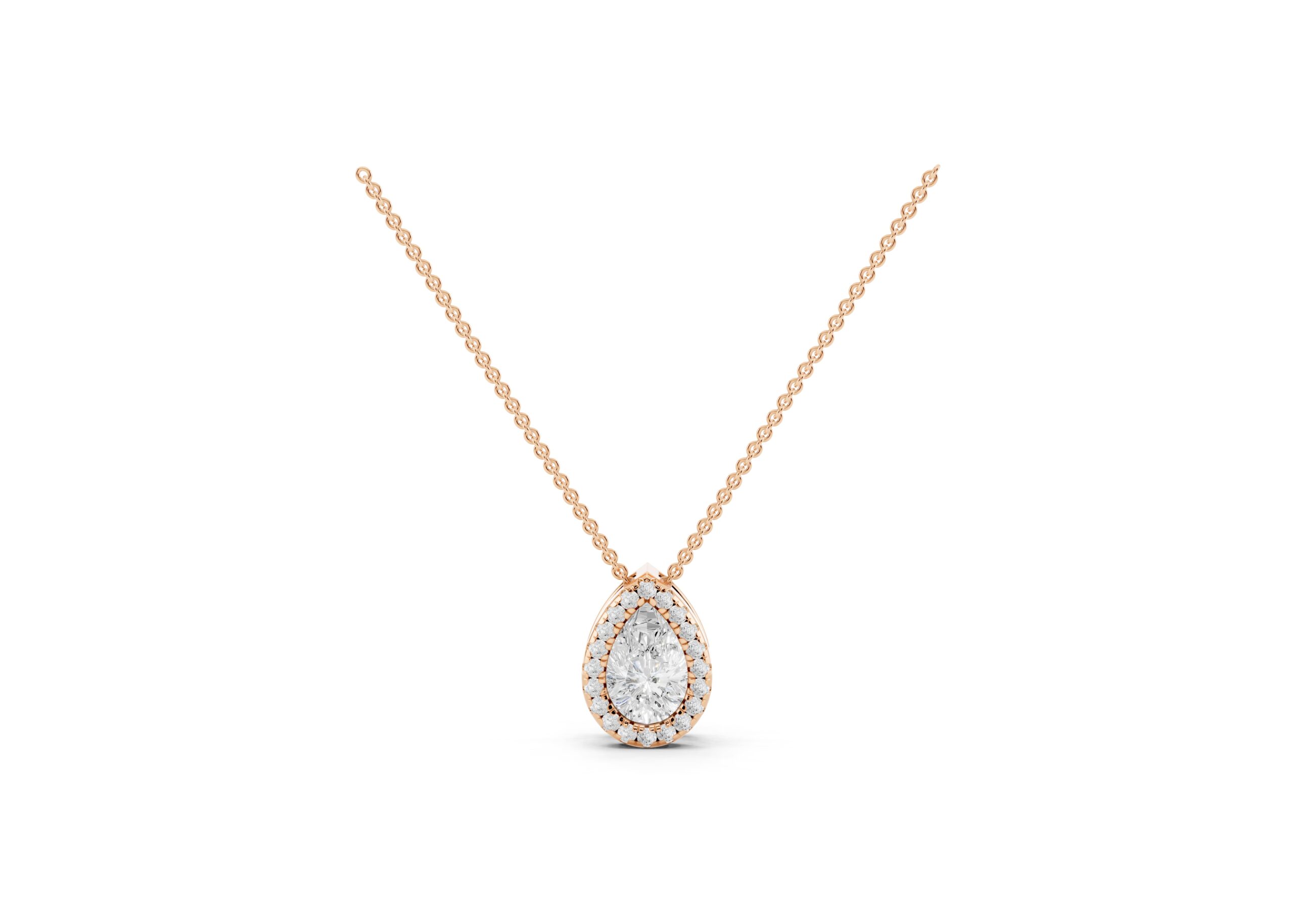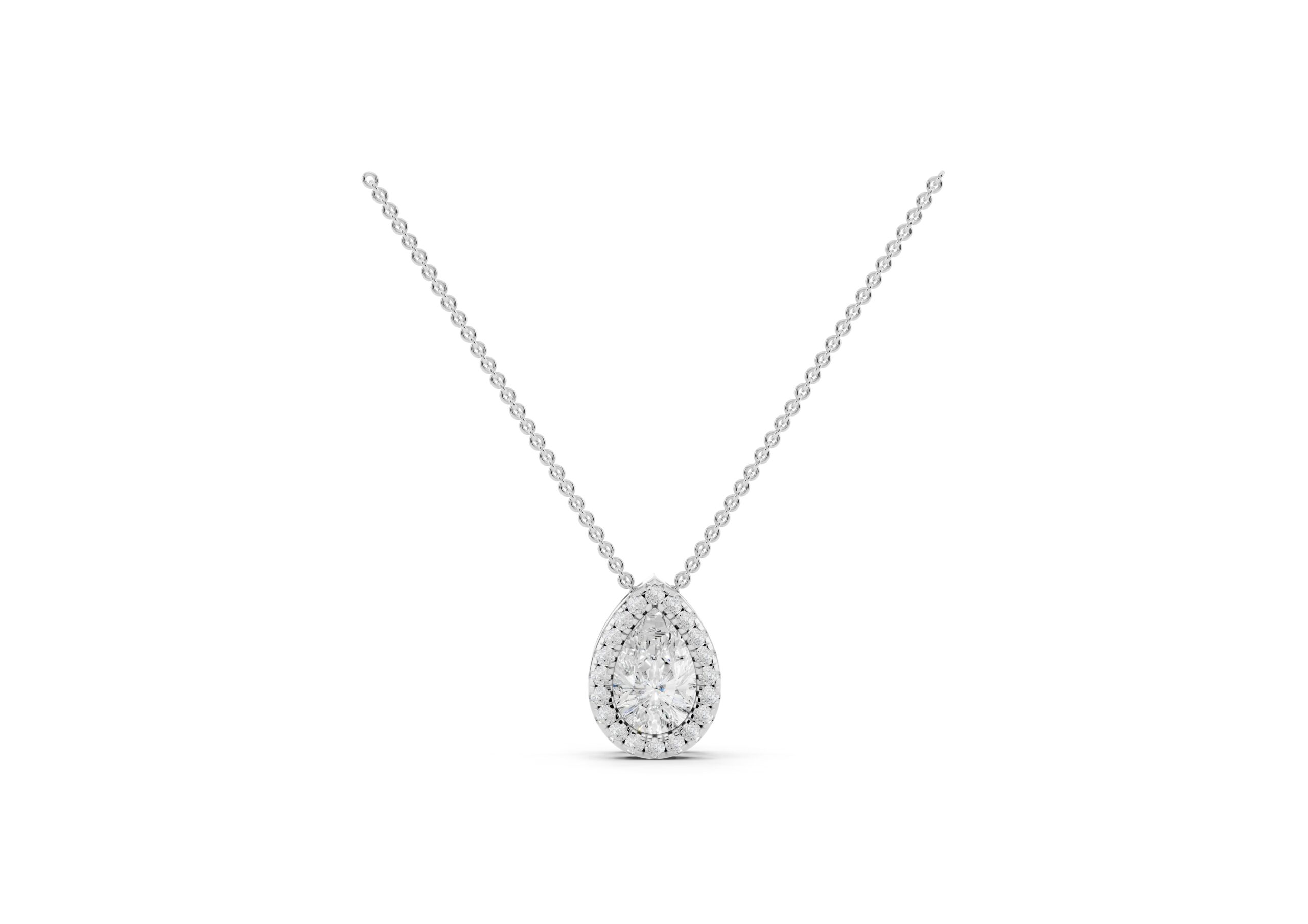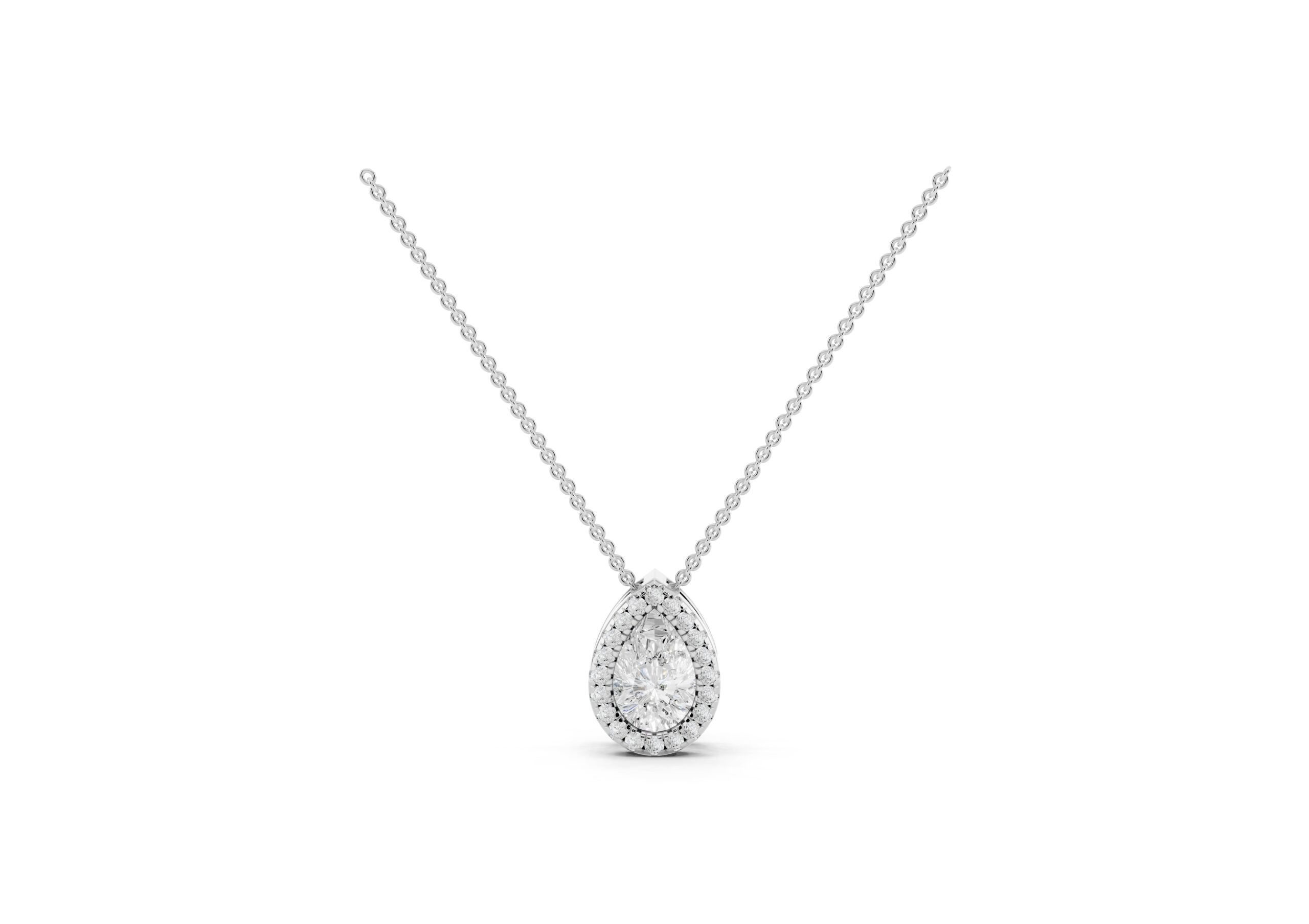 An elegant Pear-shaped Molecular pendent, that radiates brilliance. A delicate halo of smaller, round stones encircles the center stone, enhancing its sparkle and creating a vintage-inspired glamour. The overall effect is one of timeless sophistication, making it a versatile piece for various occasions.