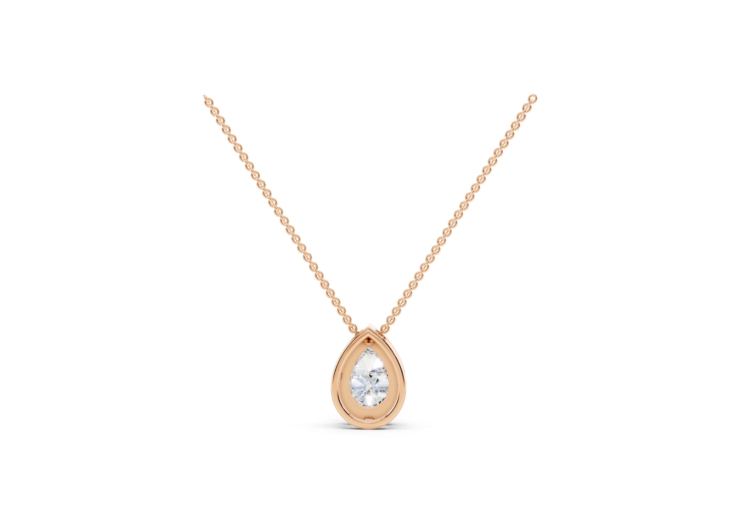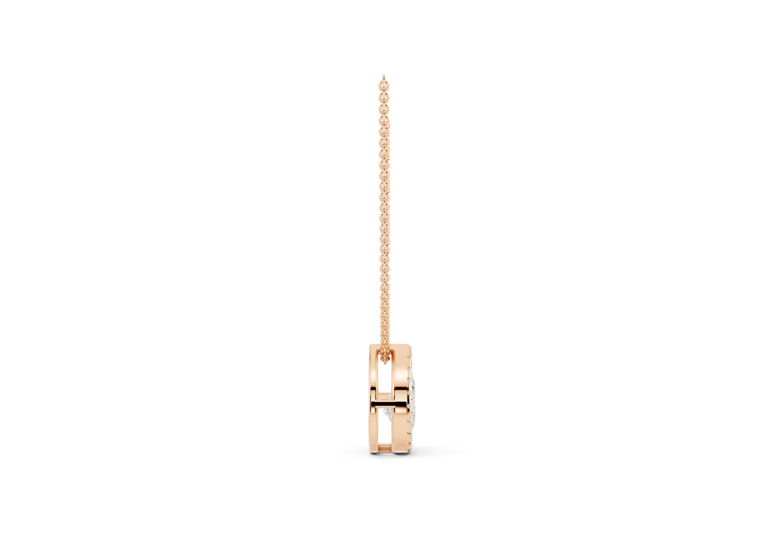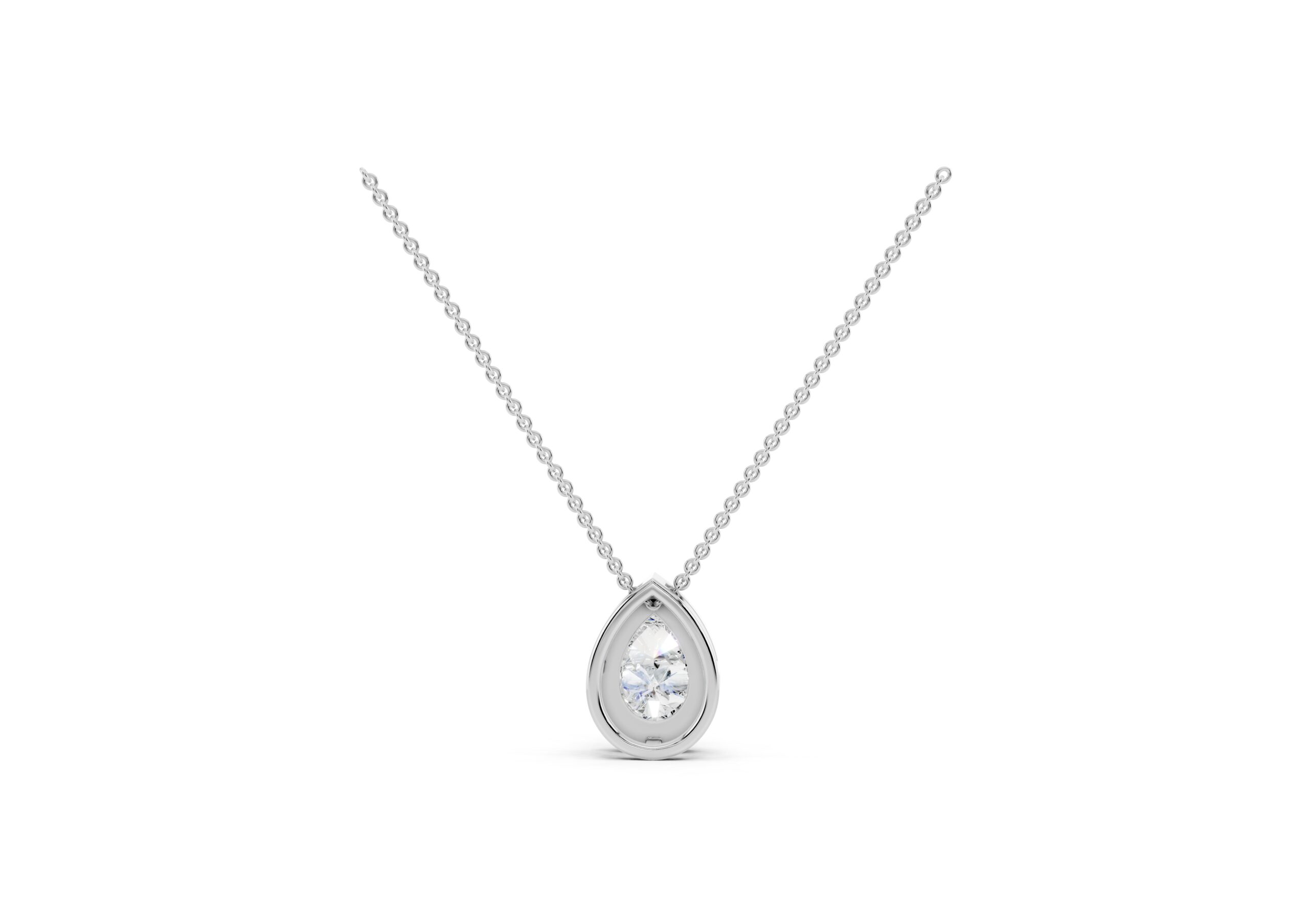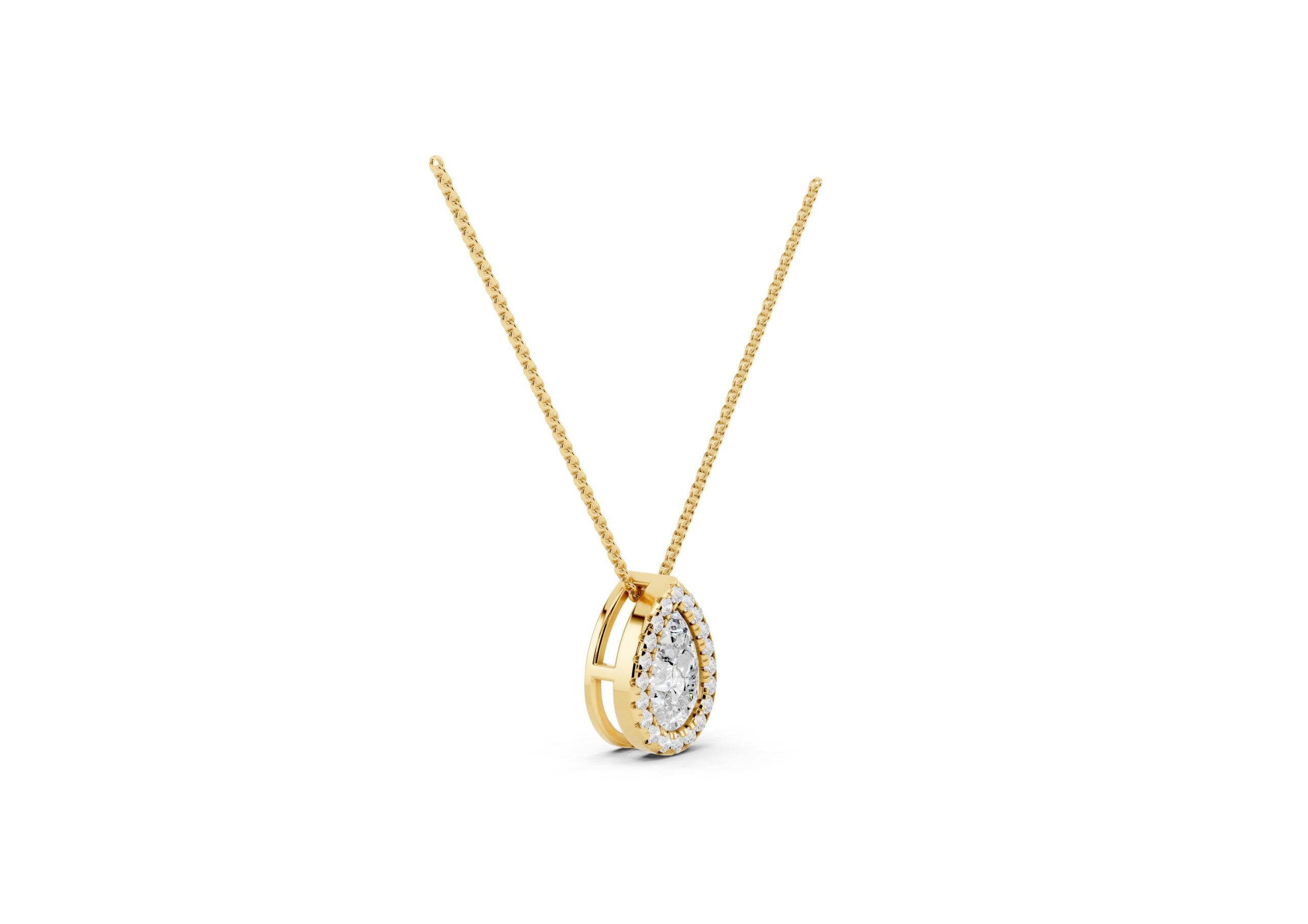 An elegant Pear-shaped Molecular pendent, that radiates brilliance. A delicate halo of smaller, round stones encircles the center stone, enhancing its sparkle and creating a vintage-inspired glamour. The overall effect is one of timeless sophistication, making it a versatile piece for various occasions.