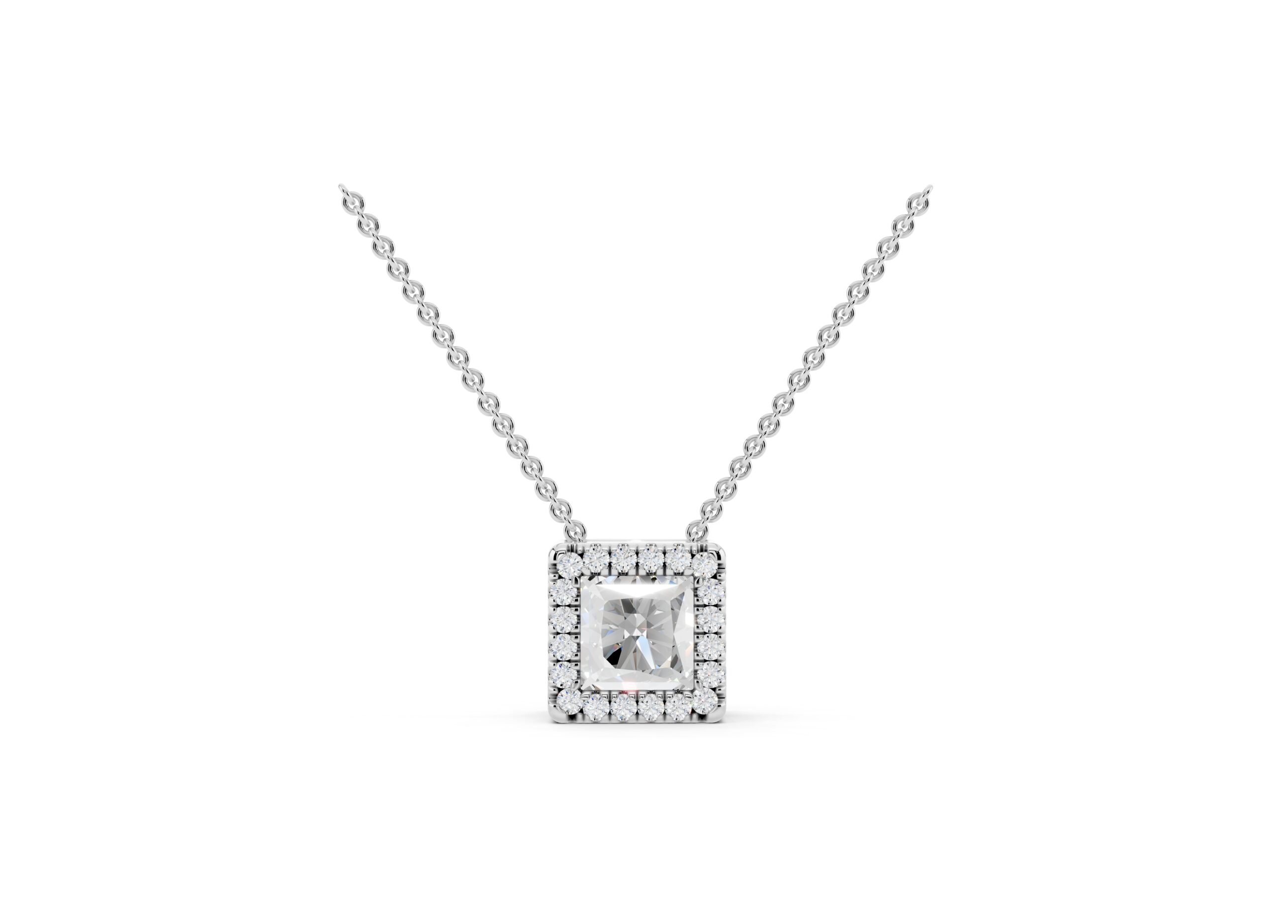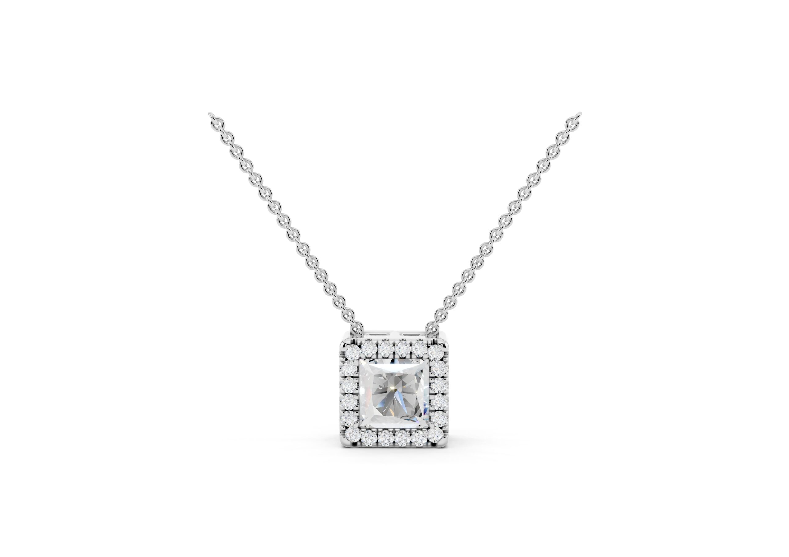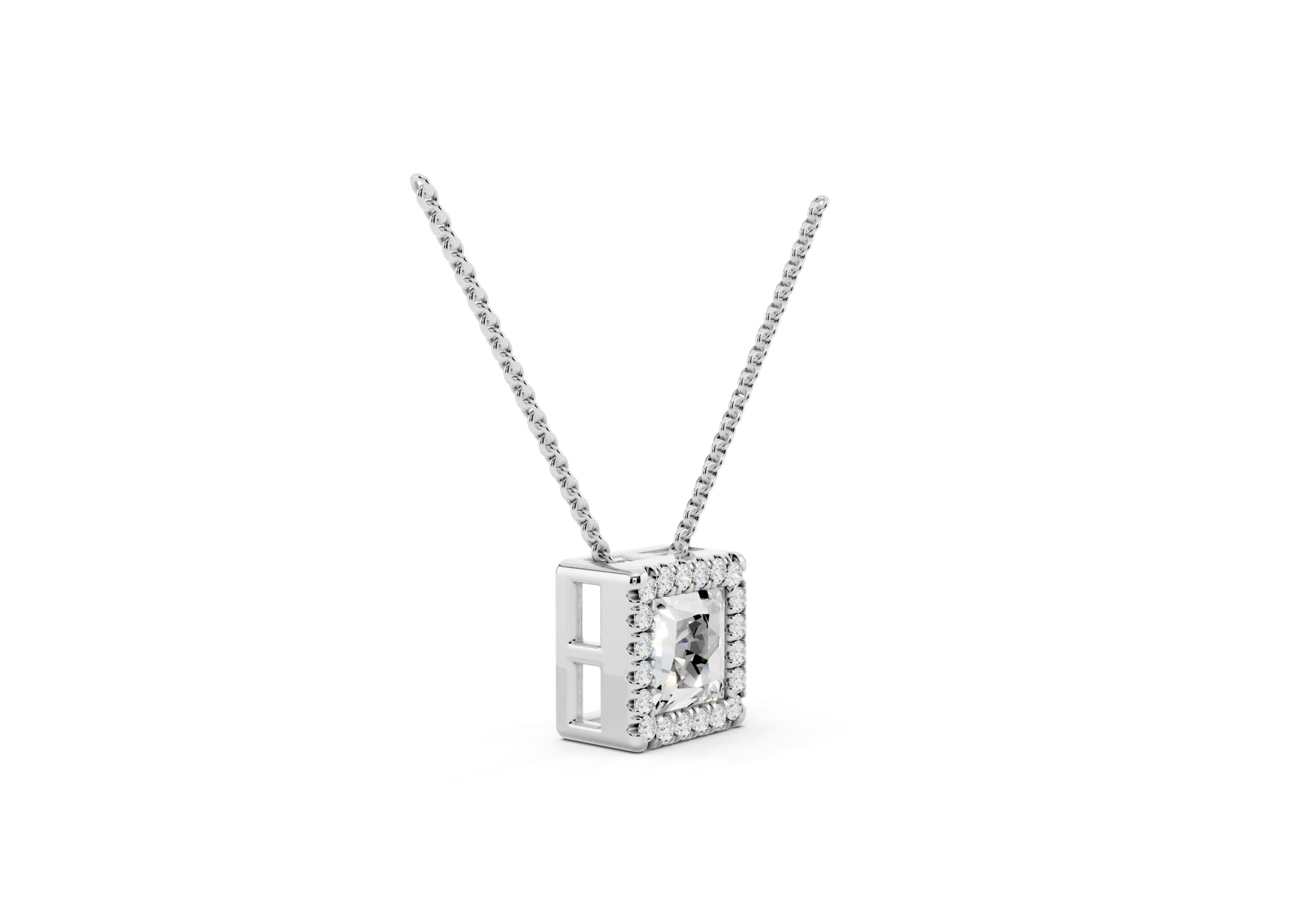 A cushion-cut diamond is the centerpiece of this pendant, framed in a delicate halo of brilliant round diamonds. Its structured, square silhouette contrasts beautifully with the soft sparkle that surrounds it. The design brings modern refinement and timeless charm together in one sophisticated piece—perfect for everyday elegance or a meaningful gift.