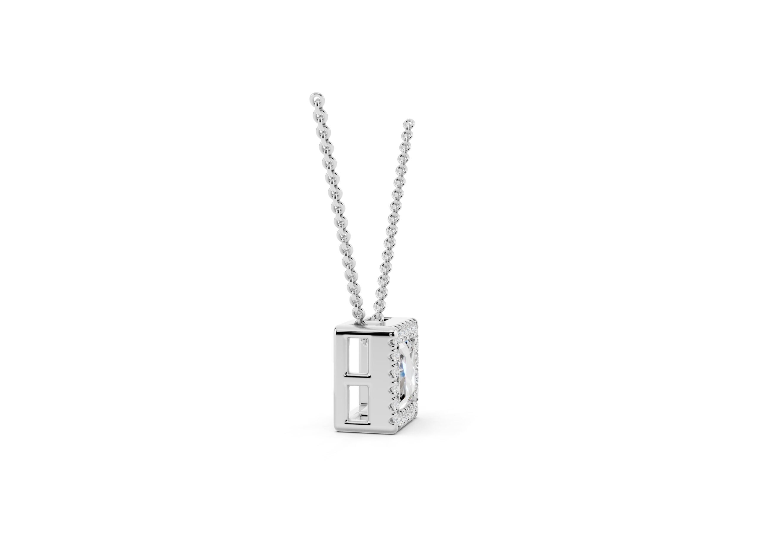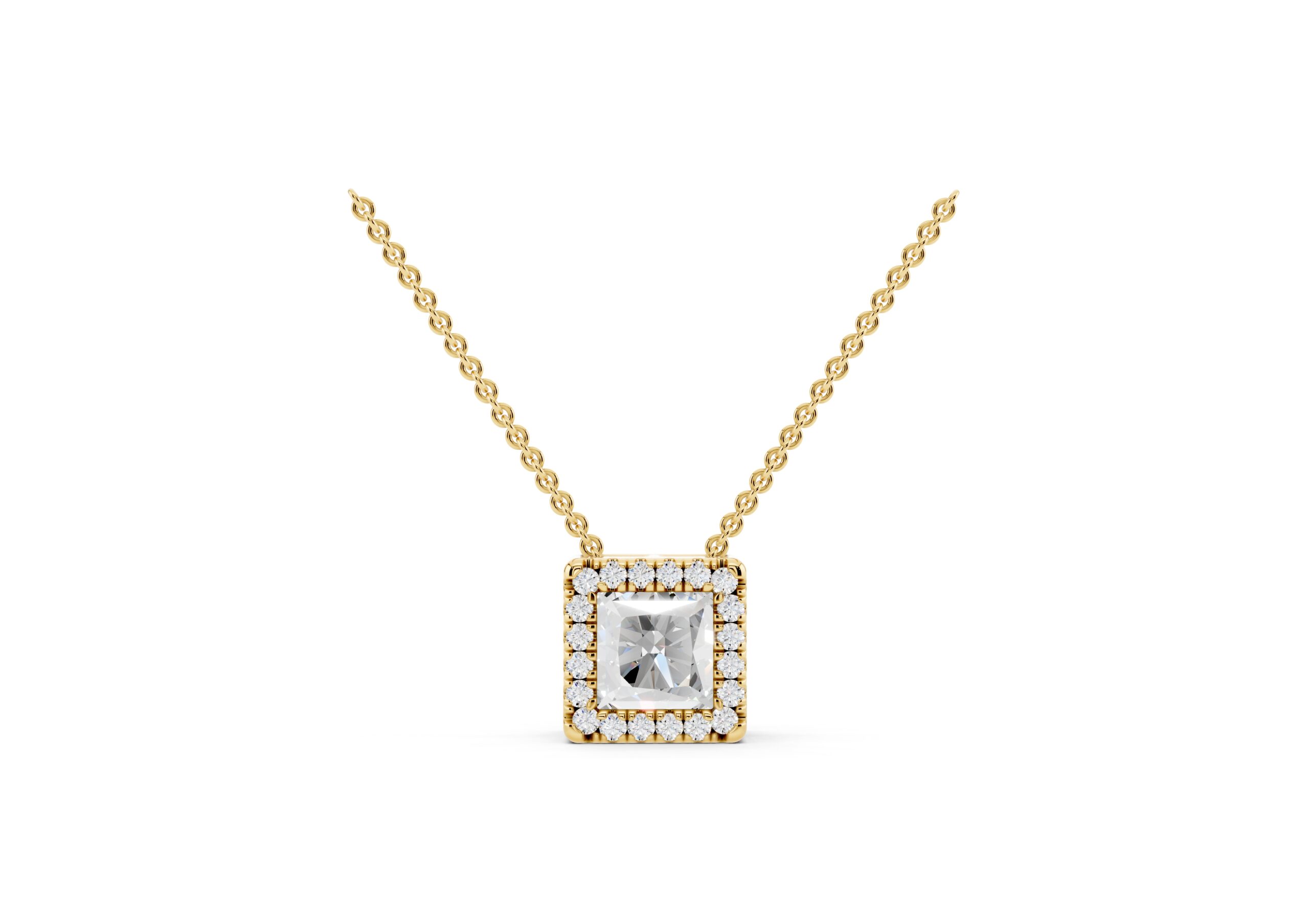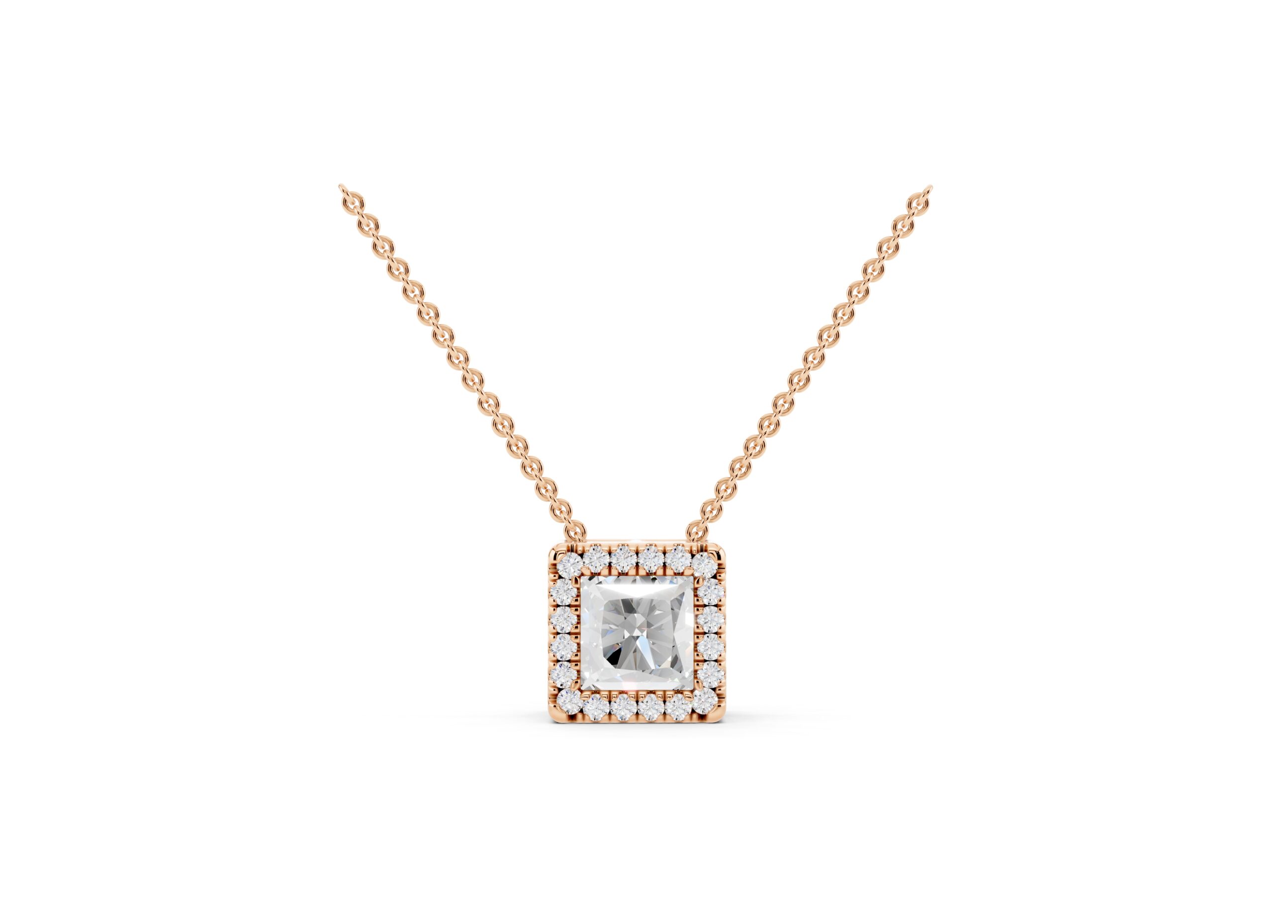 A cushion-cut diamond is the centerpiece of this pendant, framed in a delicate halo of brilliant round diamonds. Its structured, square silhouette contrasts beautifully with the soft sparkle that surrounds it. The design brings modern refinement and timeless charm together in one sophisticated piece—perfect for everyday elegance or a meaningful gift.