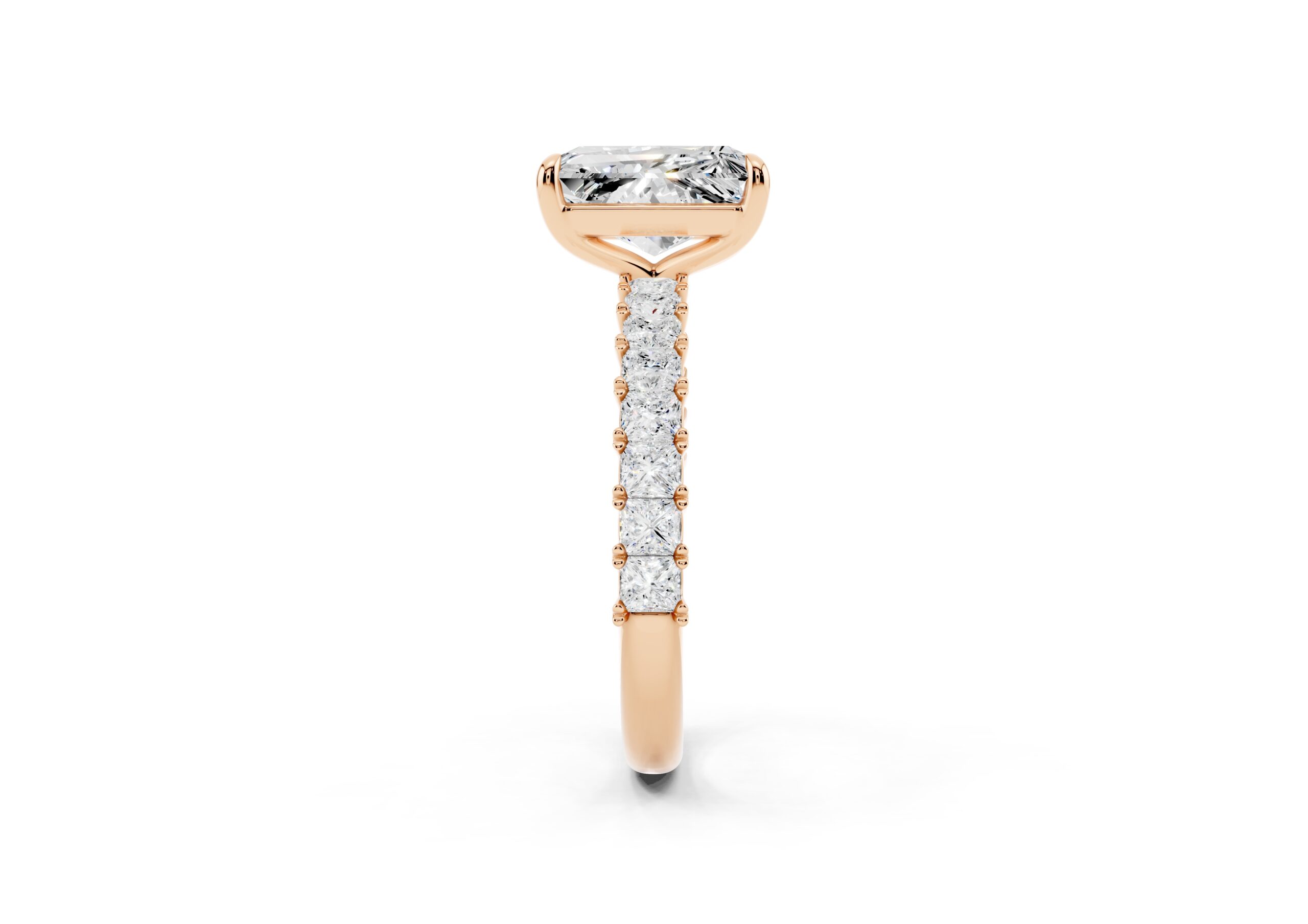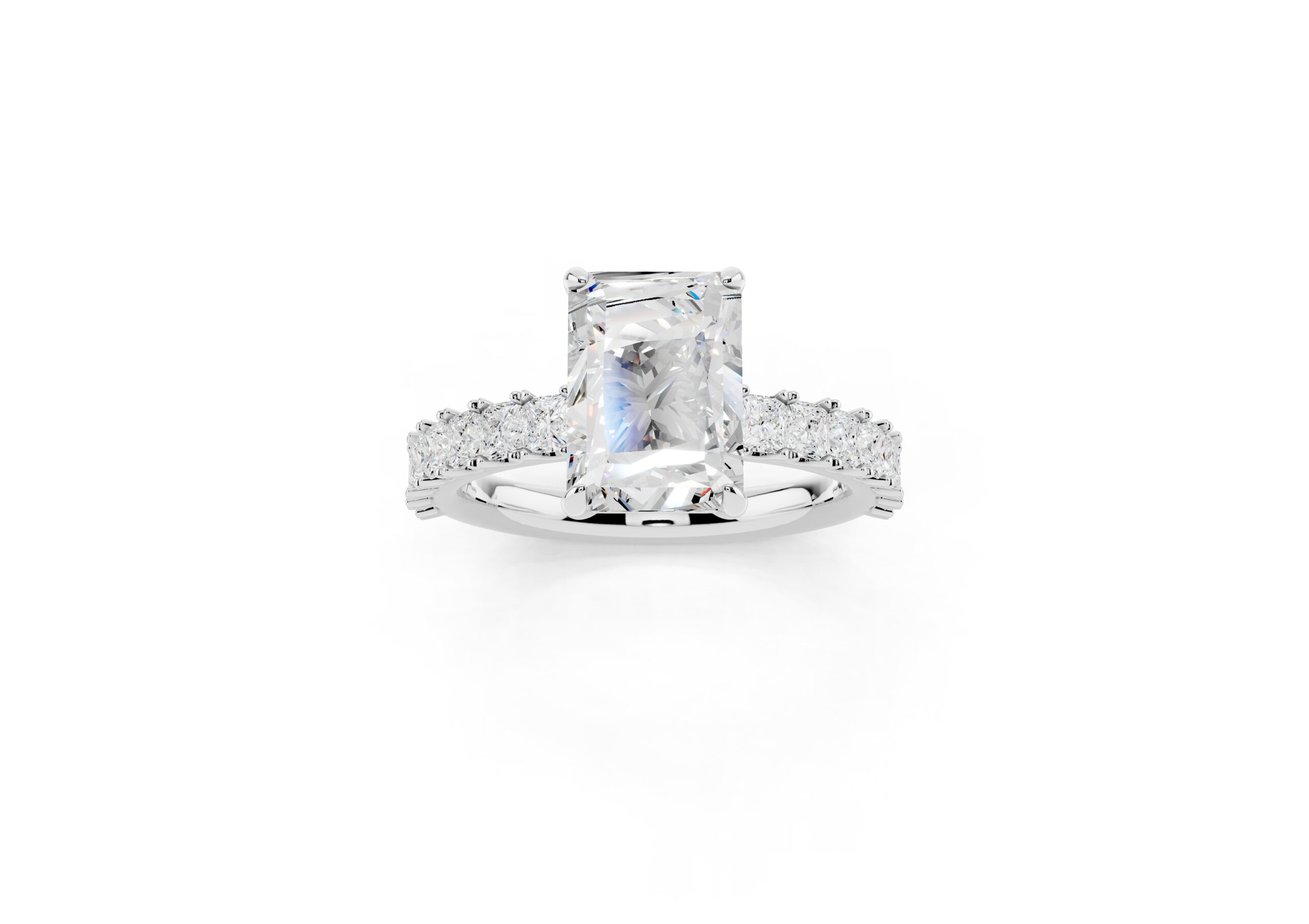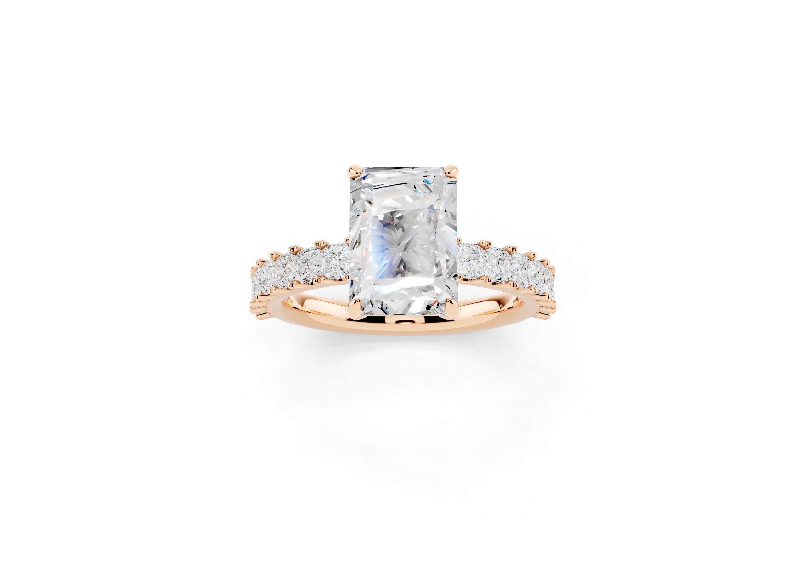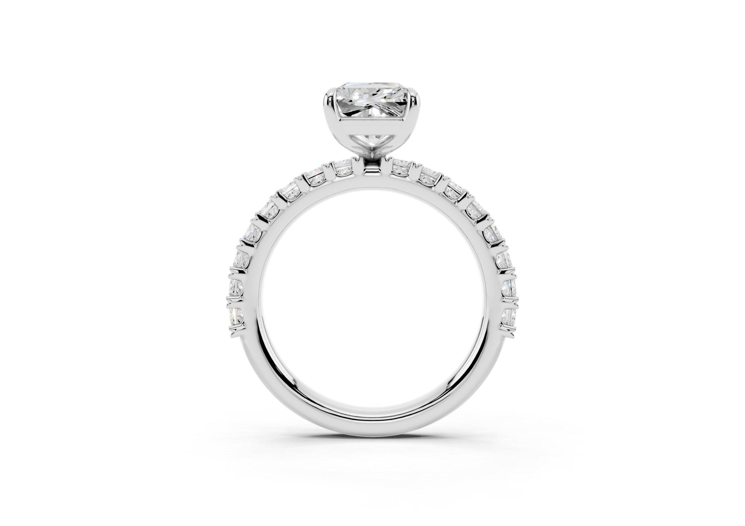 A radiant-cut solitaire takes center stage in this sophisticated design, set on a band lined with meticulously matched round diamonds. The bold geometry of the centerpiece contrasts beautifully with the soft brilliance of the band, creating a ring that speaks of elegance, strength, and timeless devotion. Ideal for those who appreciate modern structure with classic sparkle.