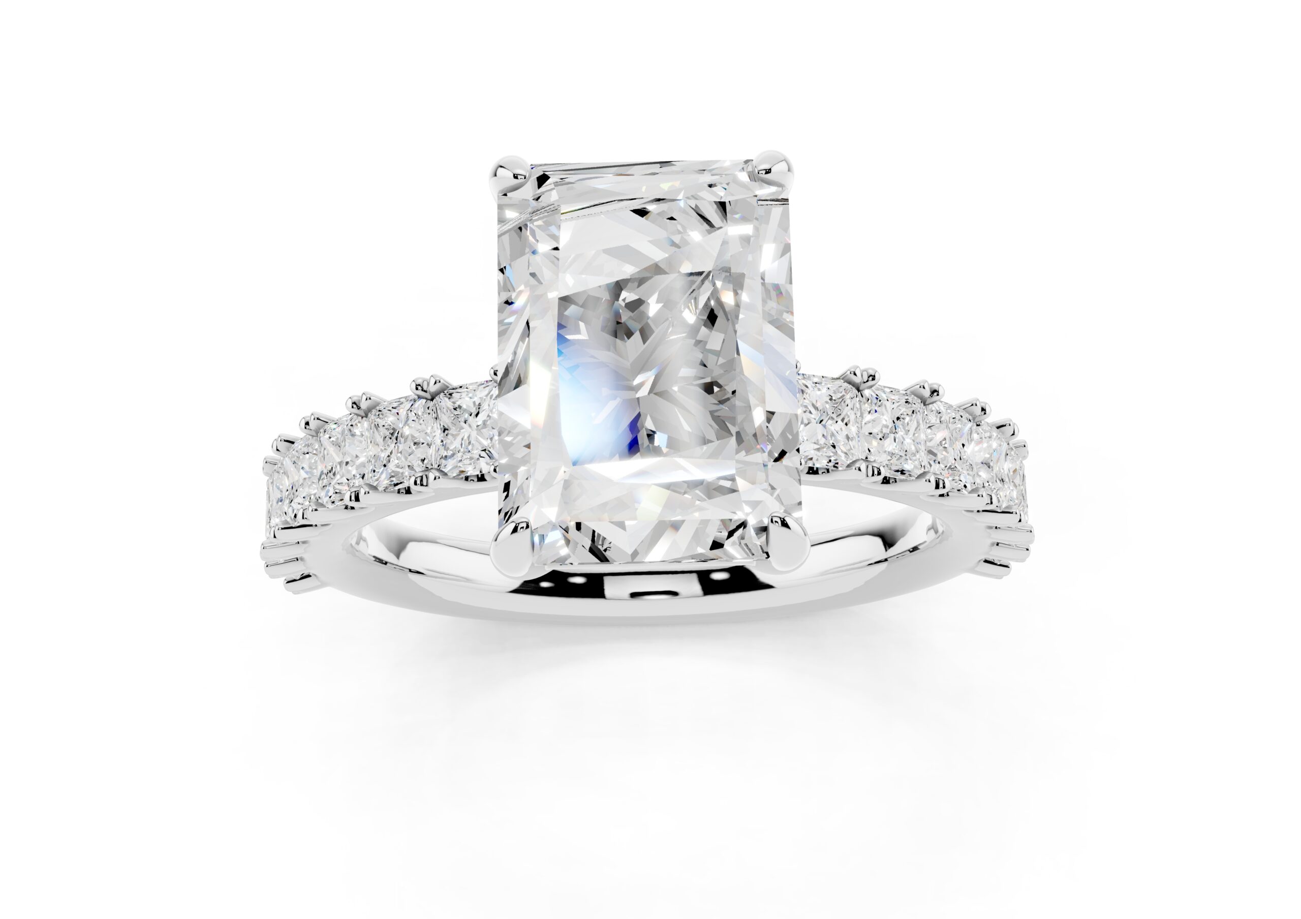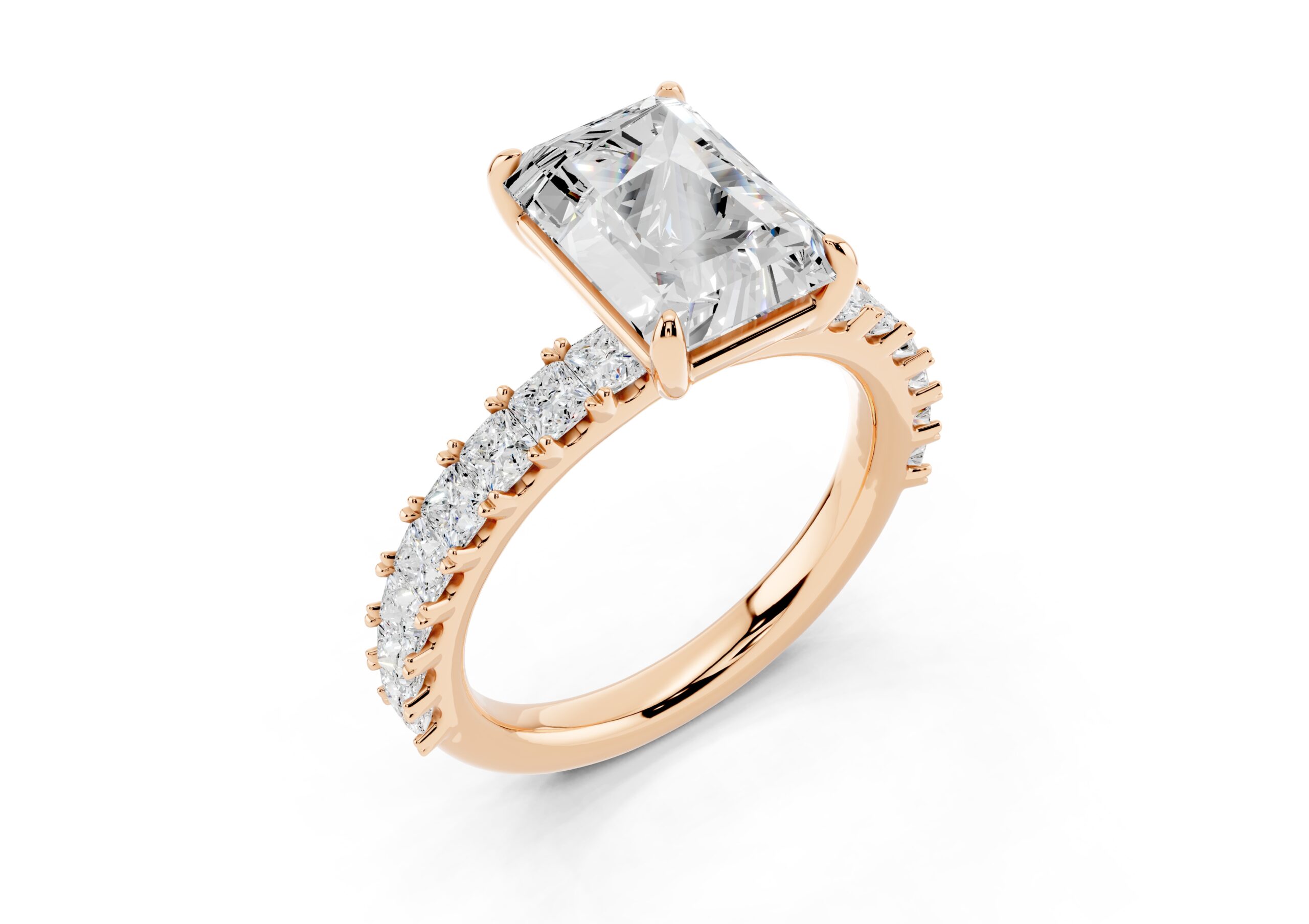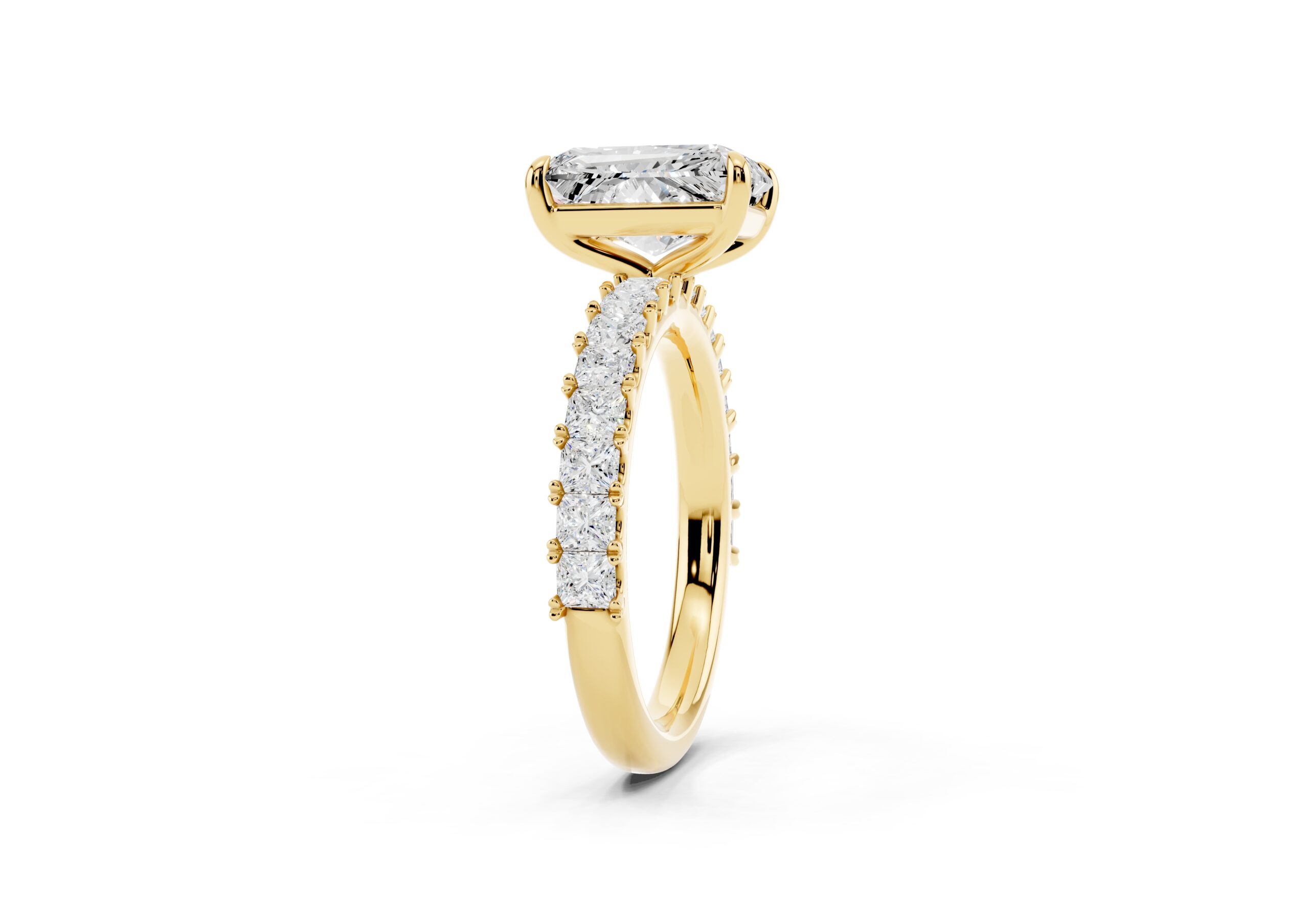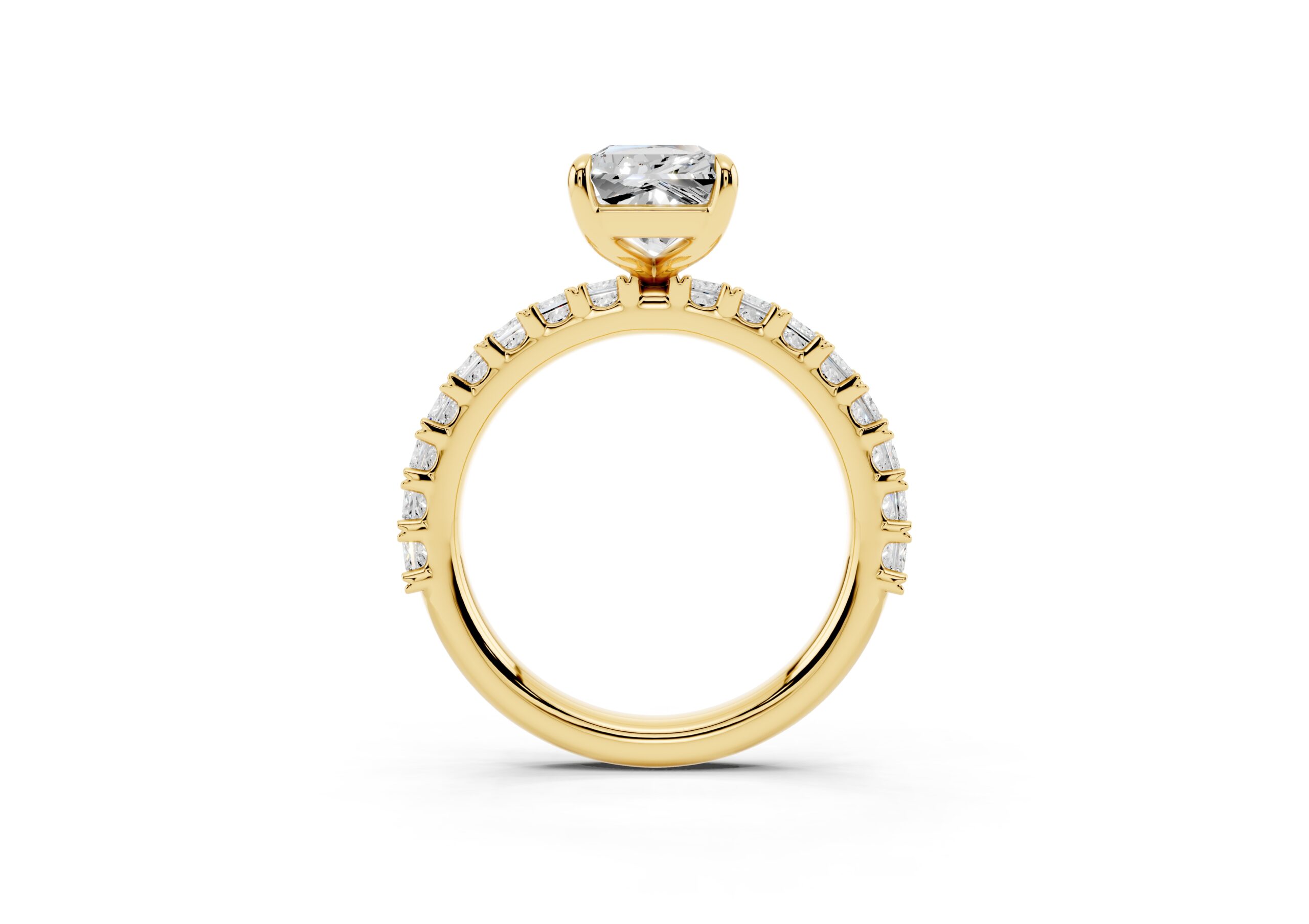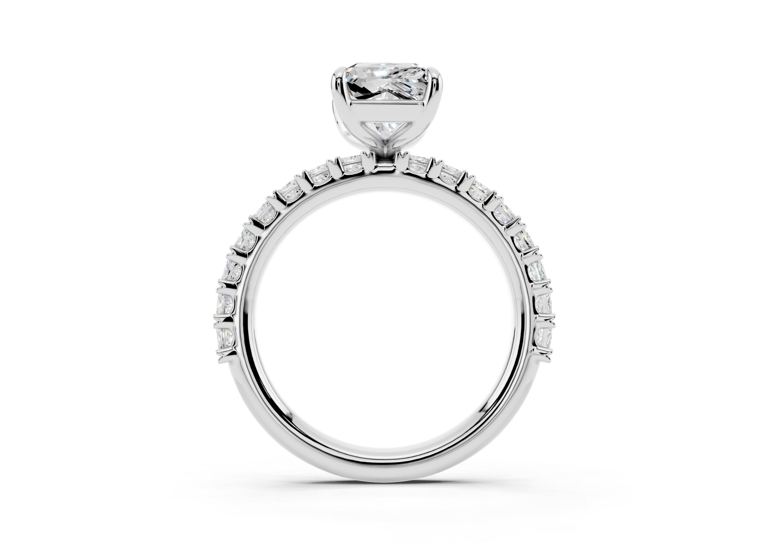 A radiant-cut solitaire takes center stage in this sophisticated design, set on a band lined with meticulously matched round diamonds. The bold geometry of the centerpiece contrasts beautifully with the soft brilliance of the band, creating a ring that speaks of elegance, strength, and timeless devotion. Ideal for those who appreciate modern structure with classic sparkle.