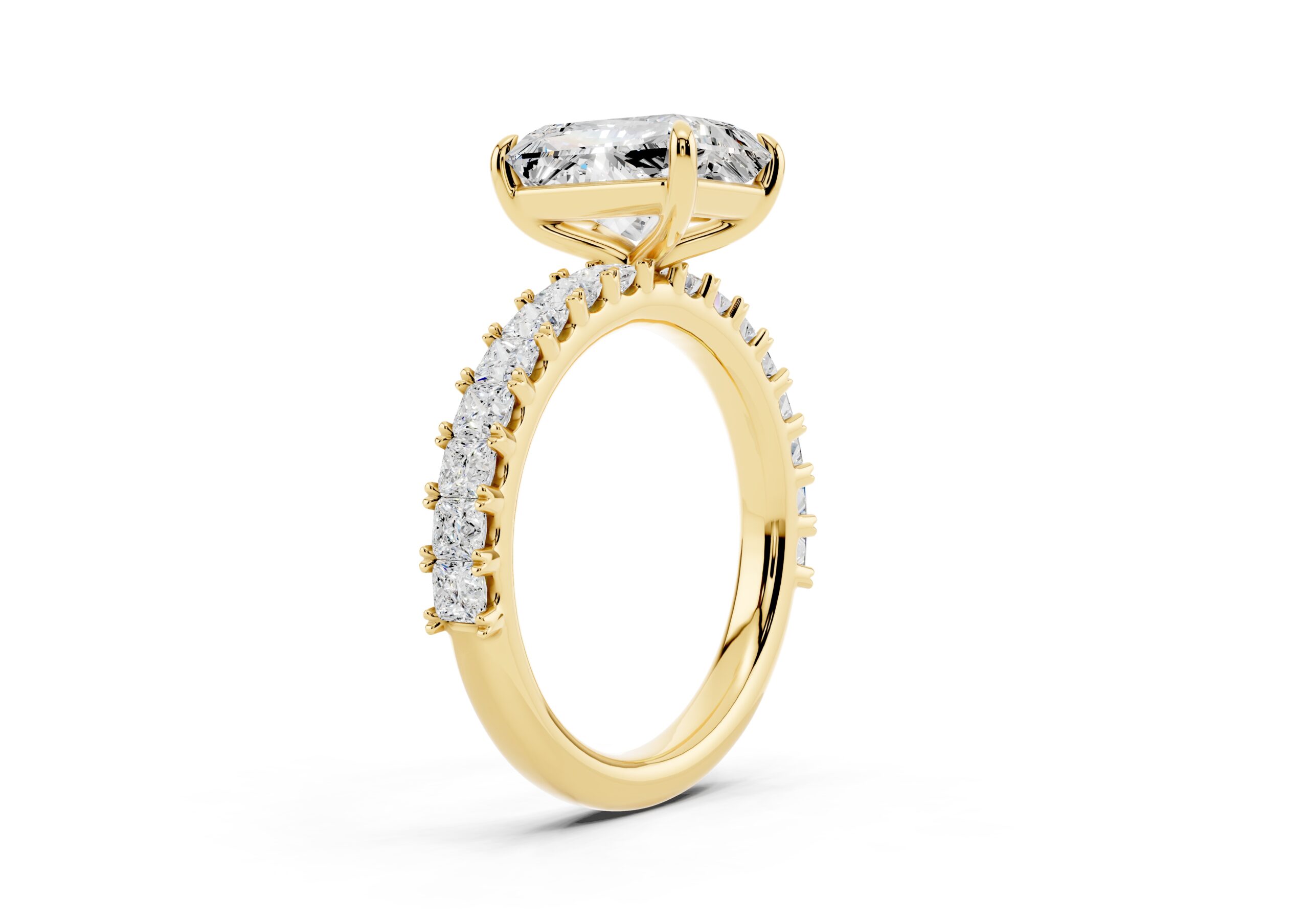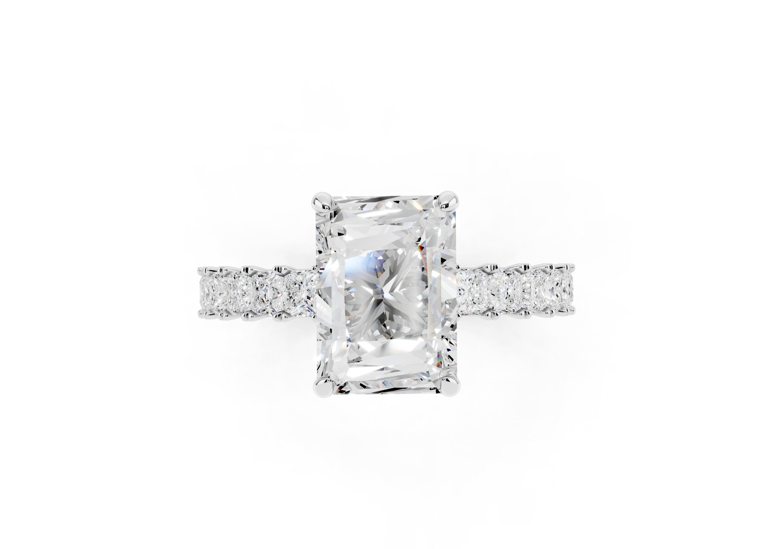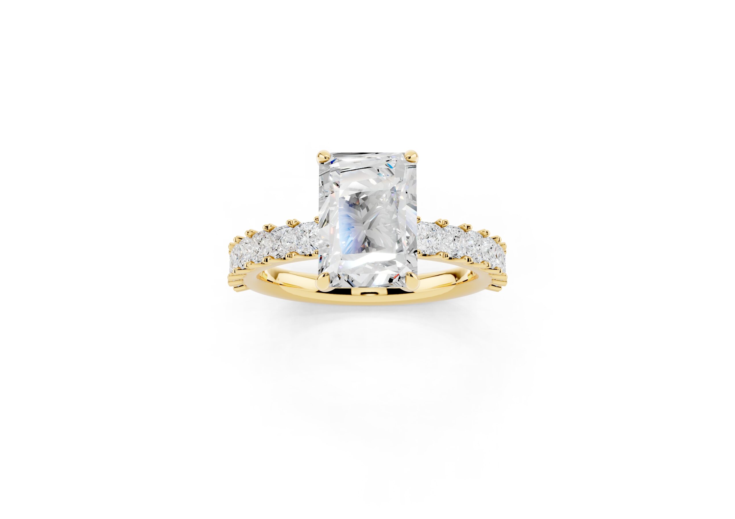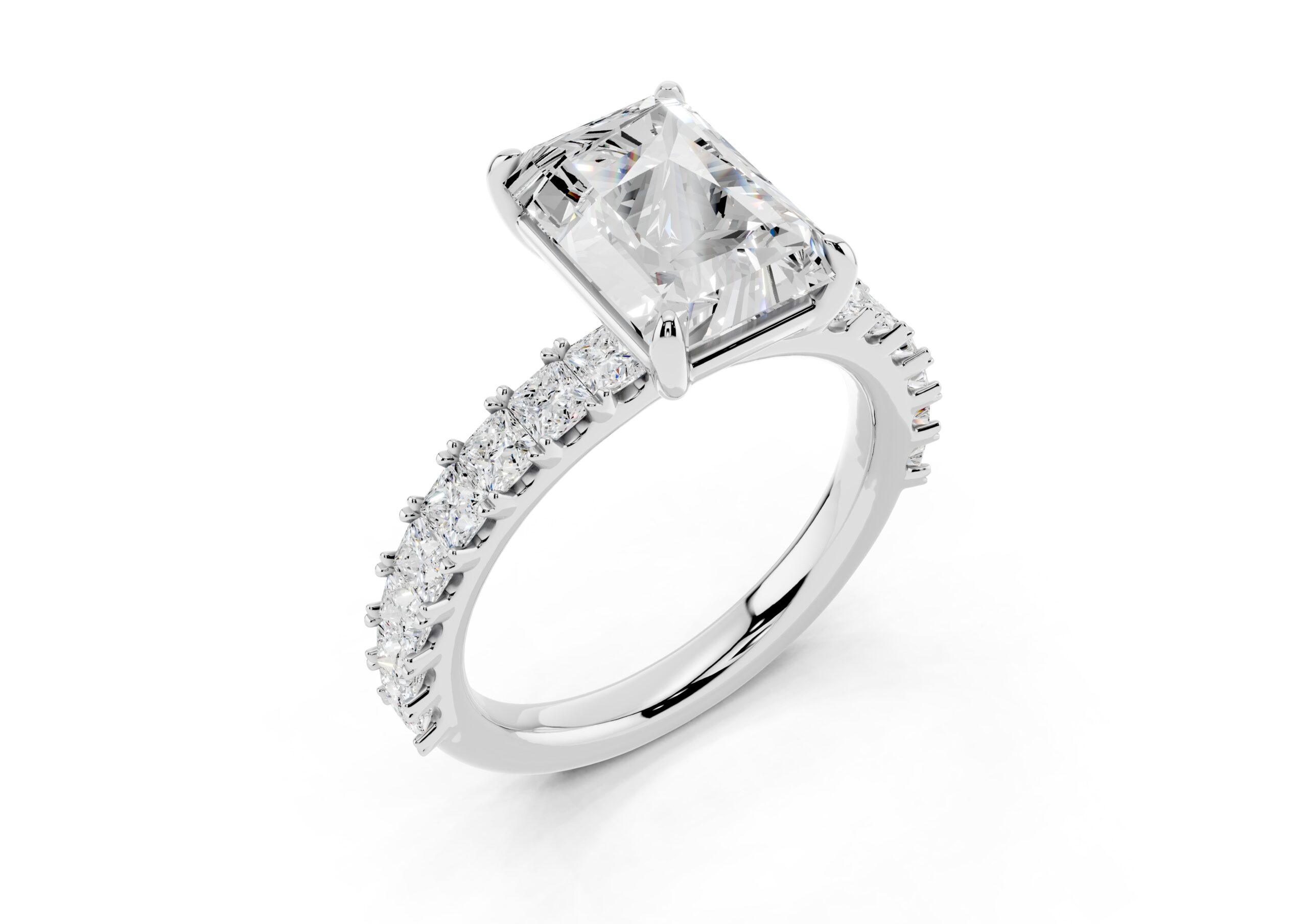 A radiant-cut solitaire takes center stage in this sophisticated design, set on a band lined with meticulously matched round diamonds. The bold geometry of the centerpiece contrasts beautifully with the soft brilliance of the band, creating a ring that speaks of elegance, strength, and timeless devotion. Ideal for those who appreciate modern structure with classic sparkle.