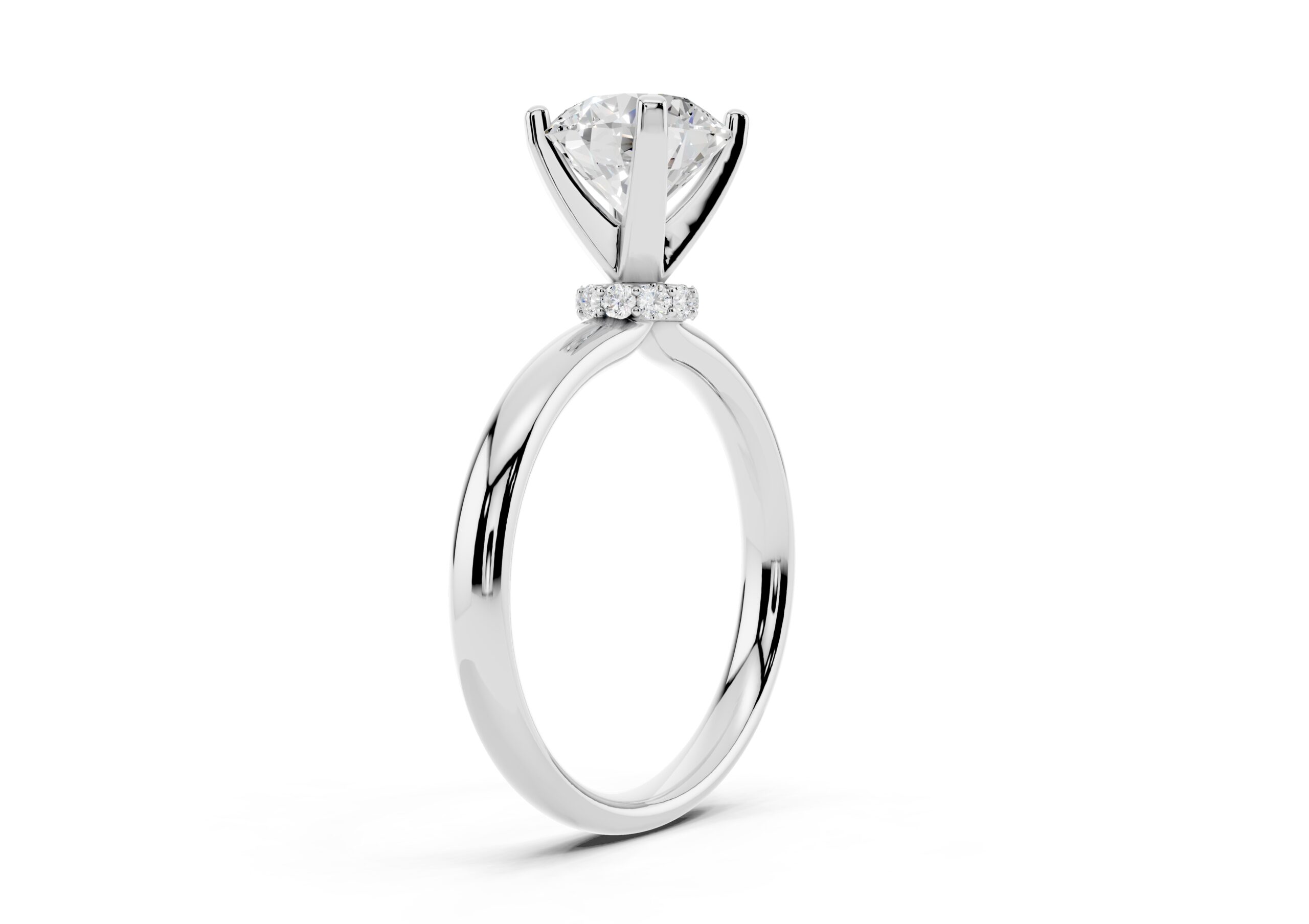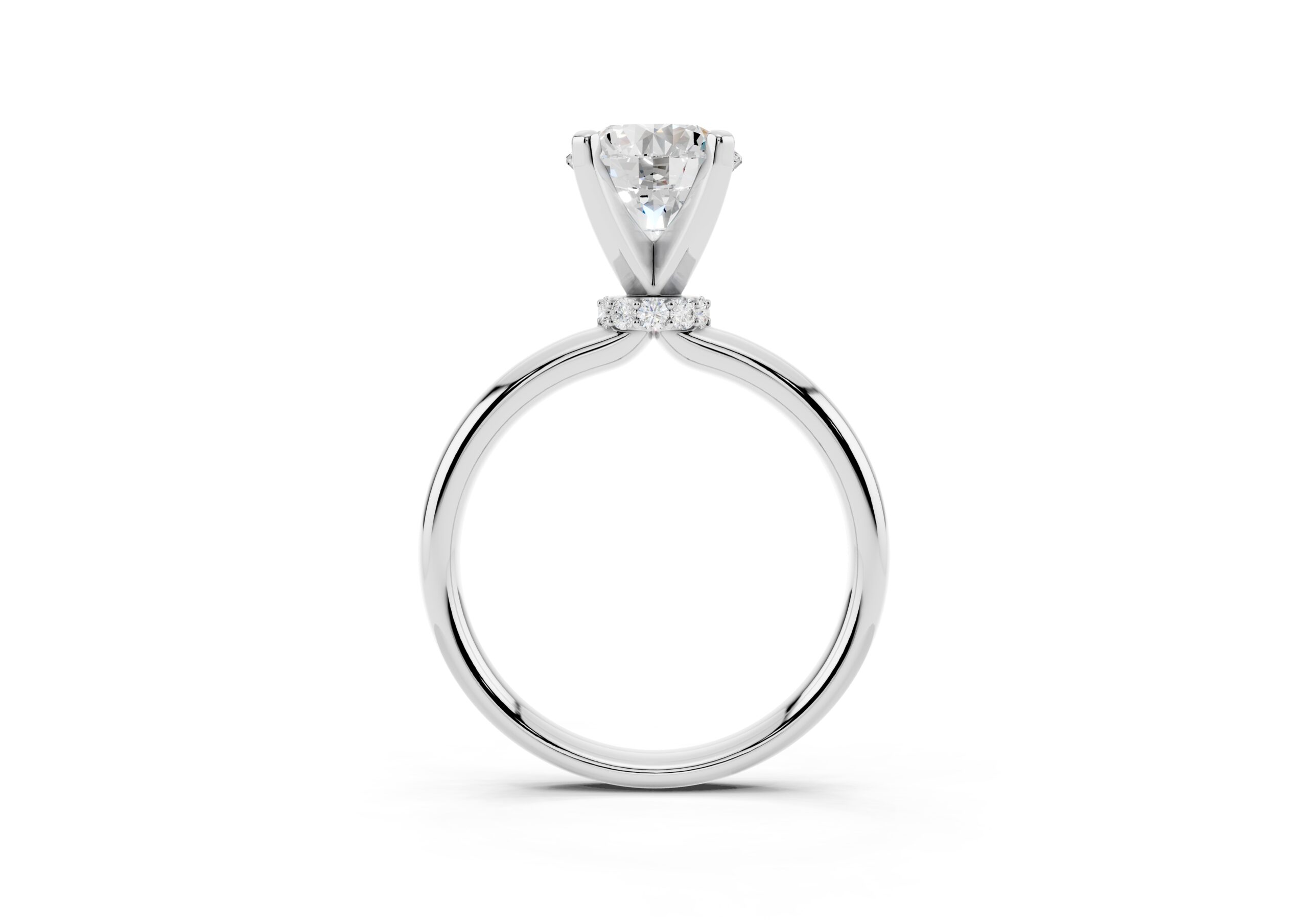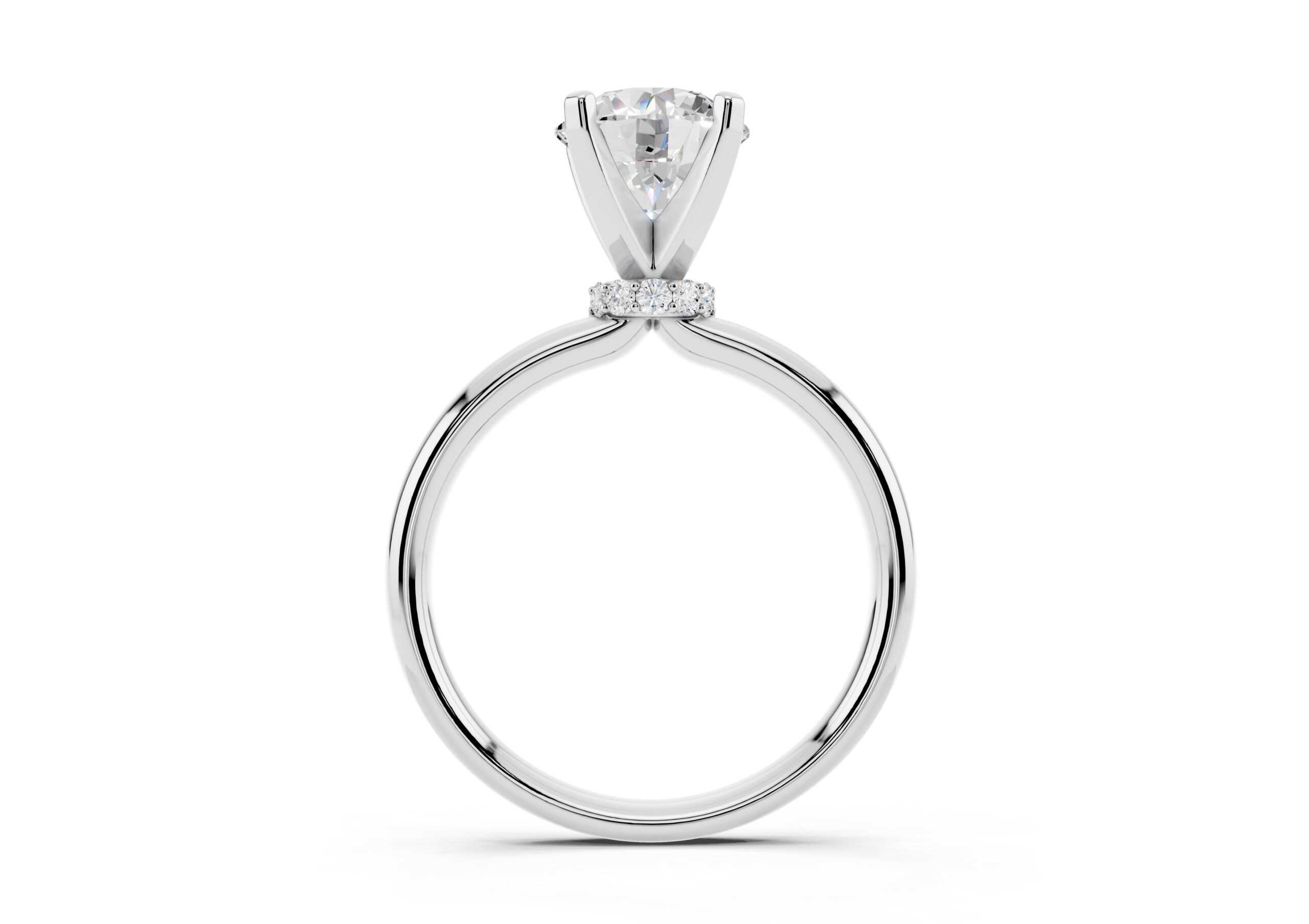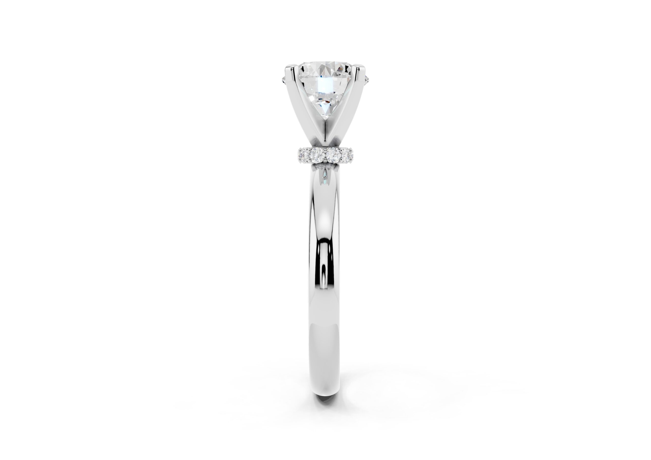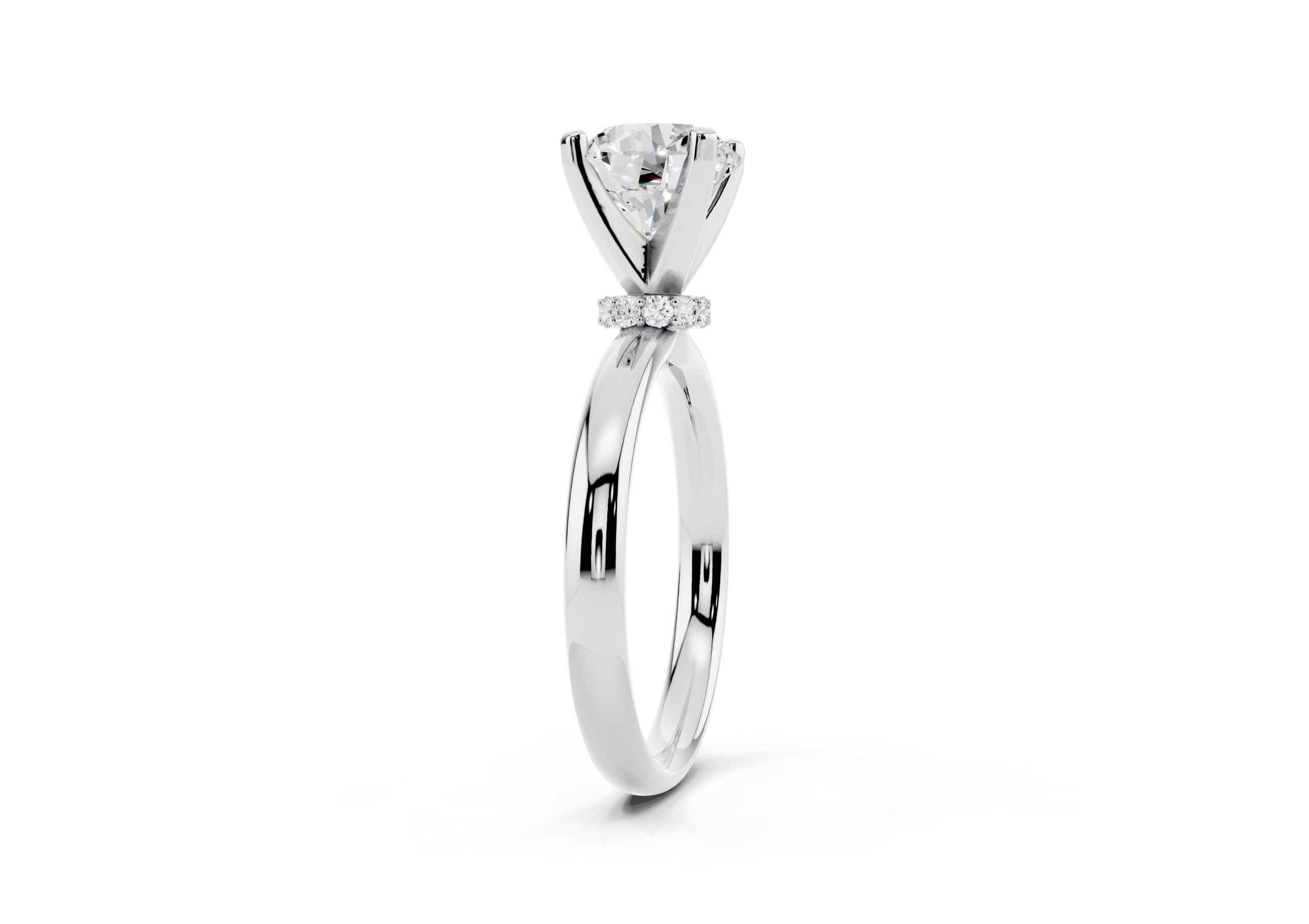 Elevated in its simplicity, the Ribbon Solitaire — White Edition — is a study in sculptural grace. The slender band curves gently like a ribbon, lifting a round brilliant diamond in a clean four-prong setting. Nestled just below, a hidden halo of pavé-set diamonds adds an intimate burst of shimmer that catches light with every movement. It’s a ring that feels as effortless as it is unforgettable.