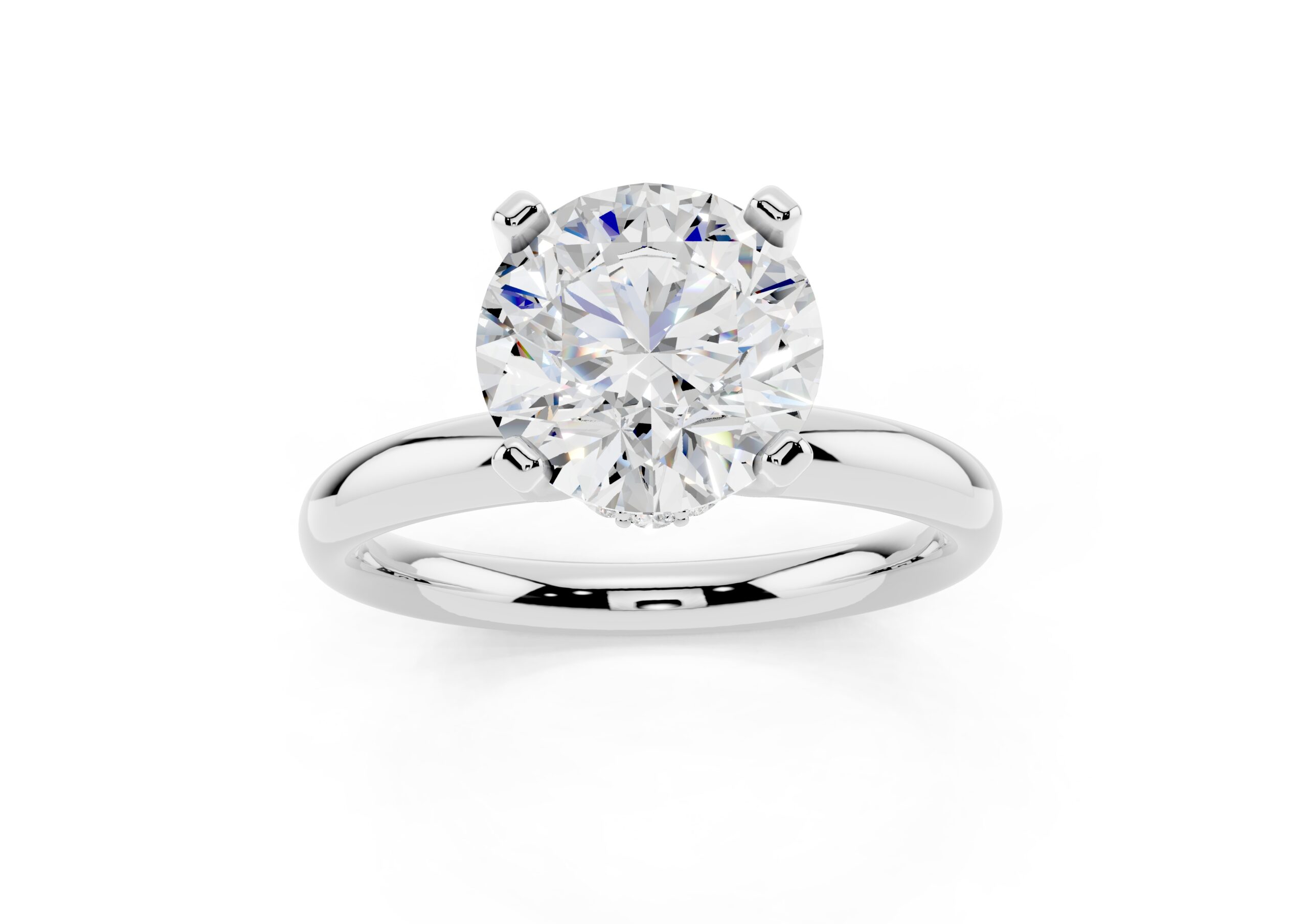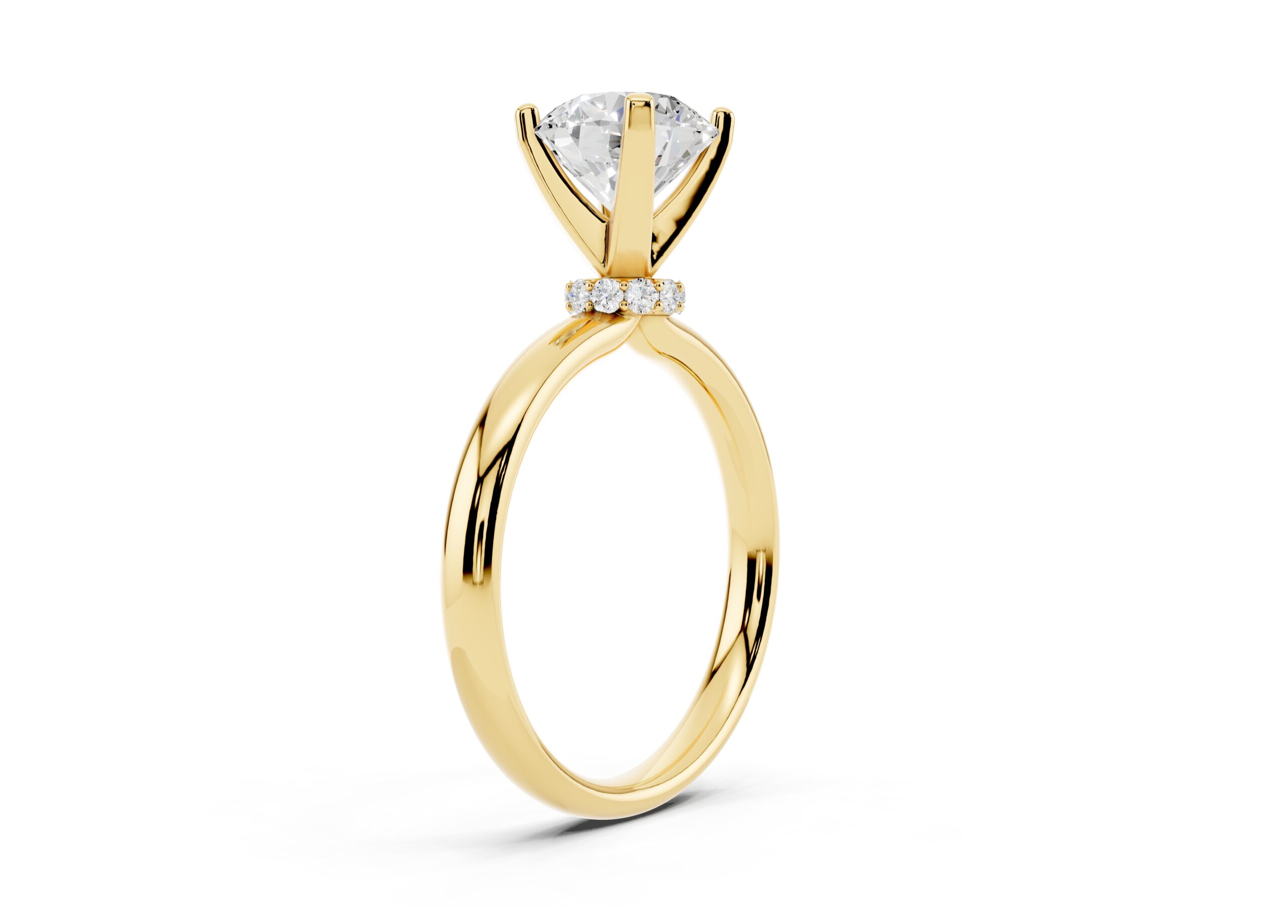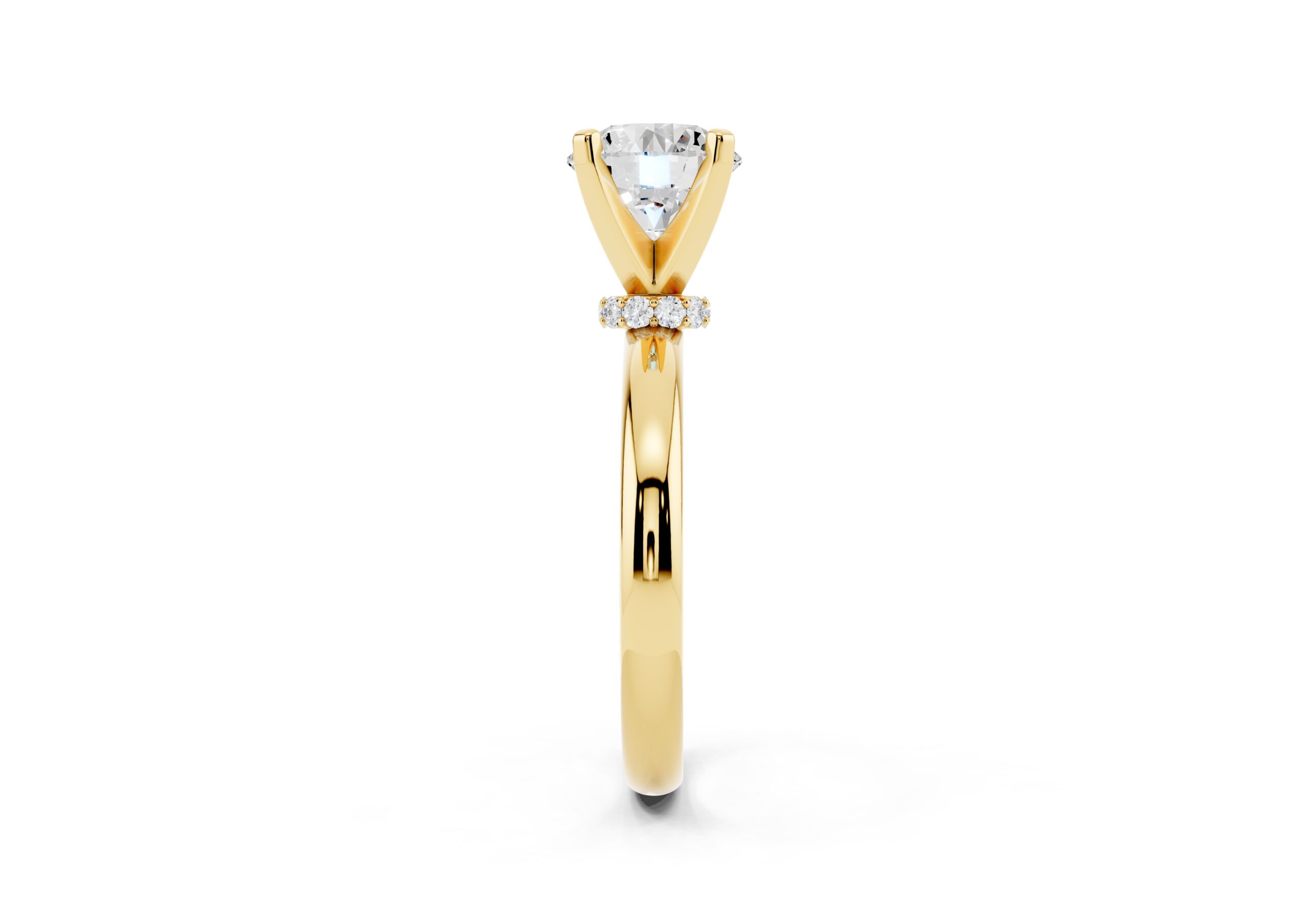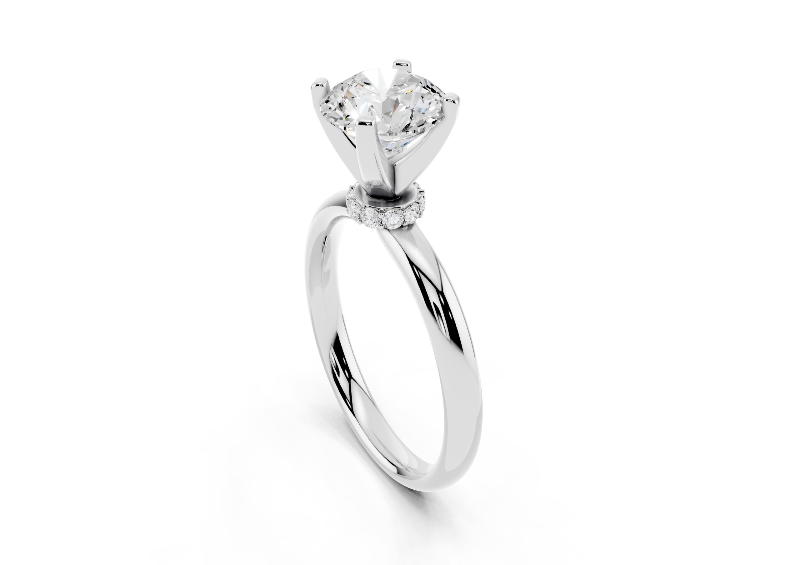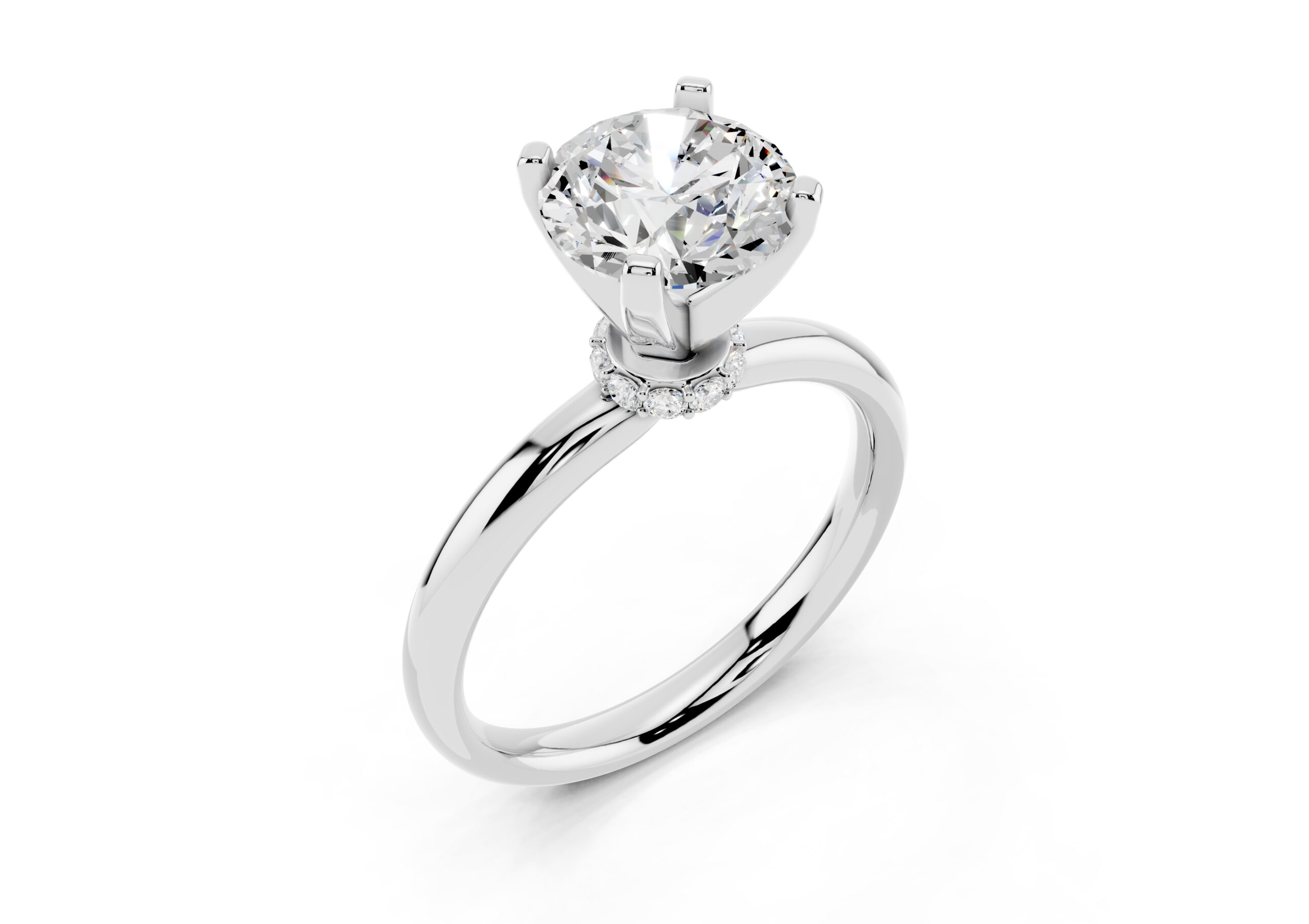 Elevated in its simplicity, the Ribbon Solitaire — White Edition — is a study in sculptural grace. The slender band curves gently like a ribbon, lifting a round brilliant diamond in a clean four-prong setting. Nestled just below, a hidden halo of pavé-set diamonds adds an intimate burst of shimmer that catches light with every movement. It’s a ring that feels as effortless as it is unforgettable.
