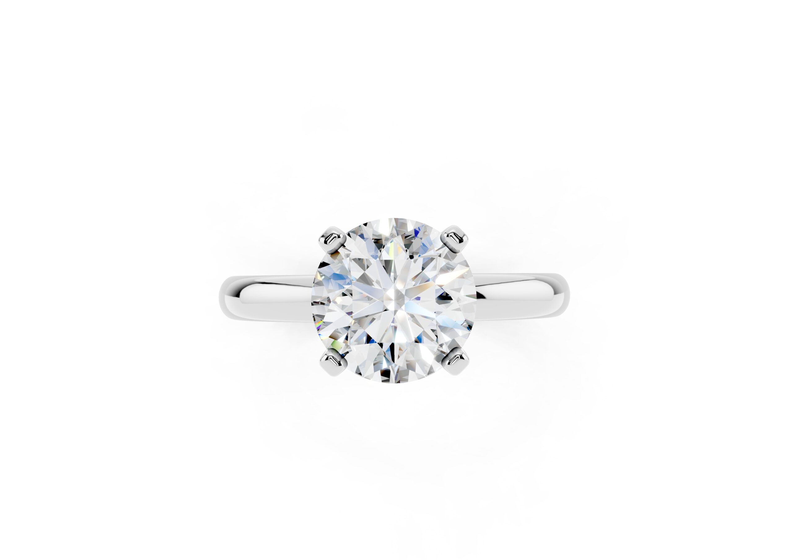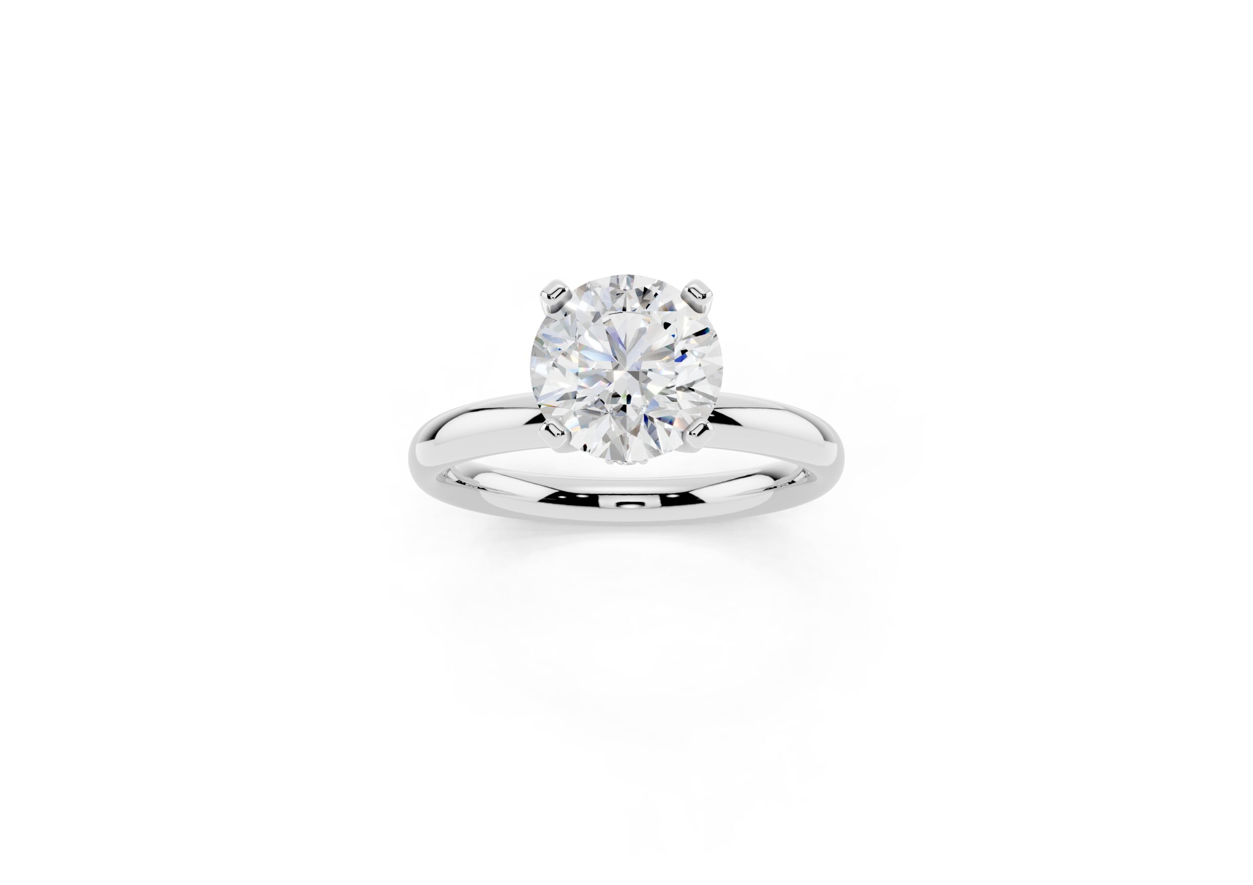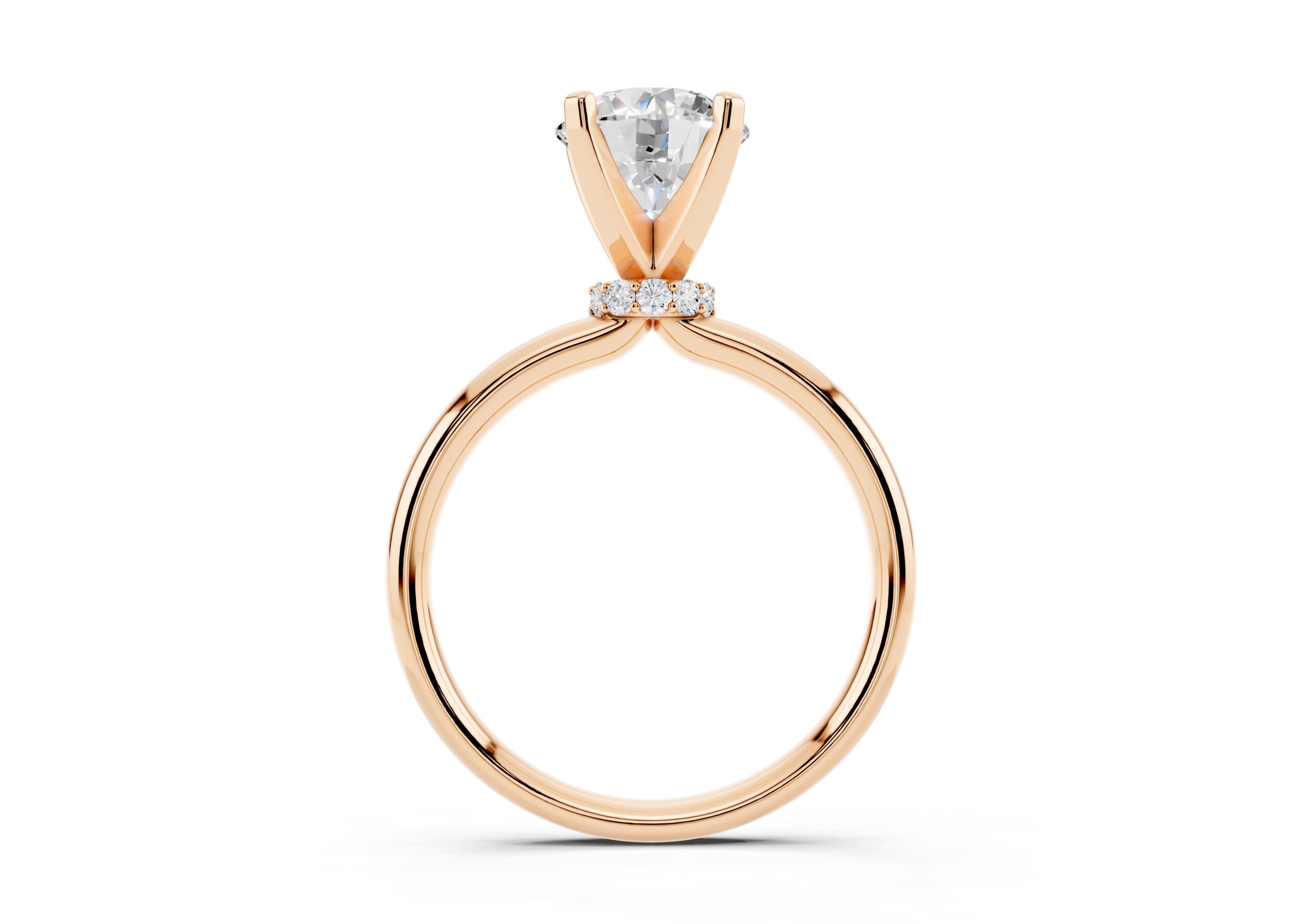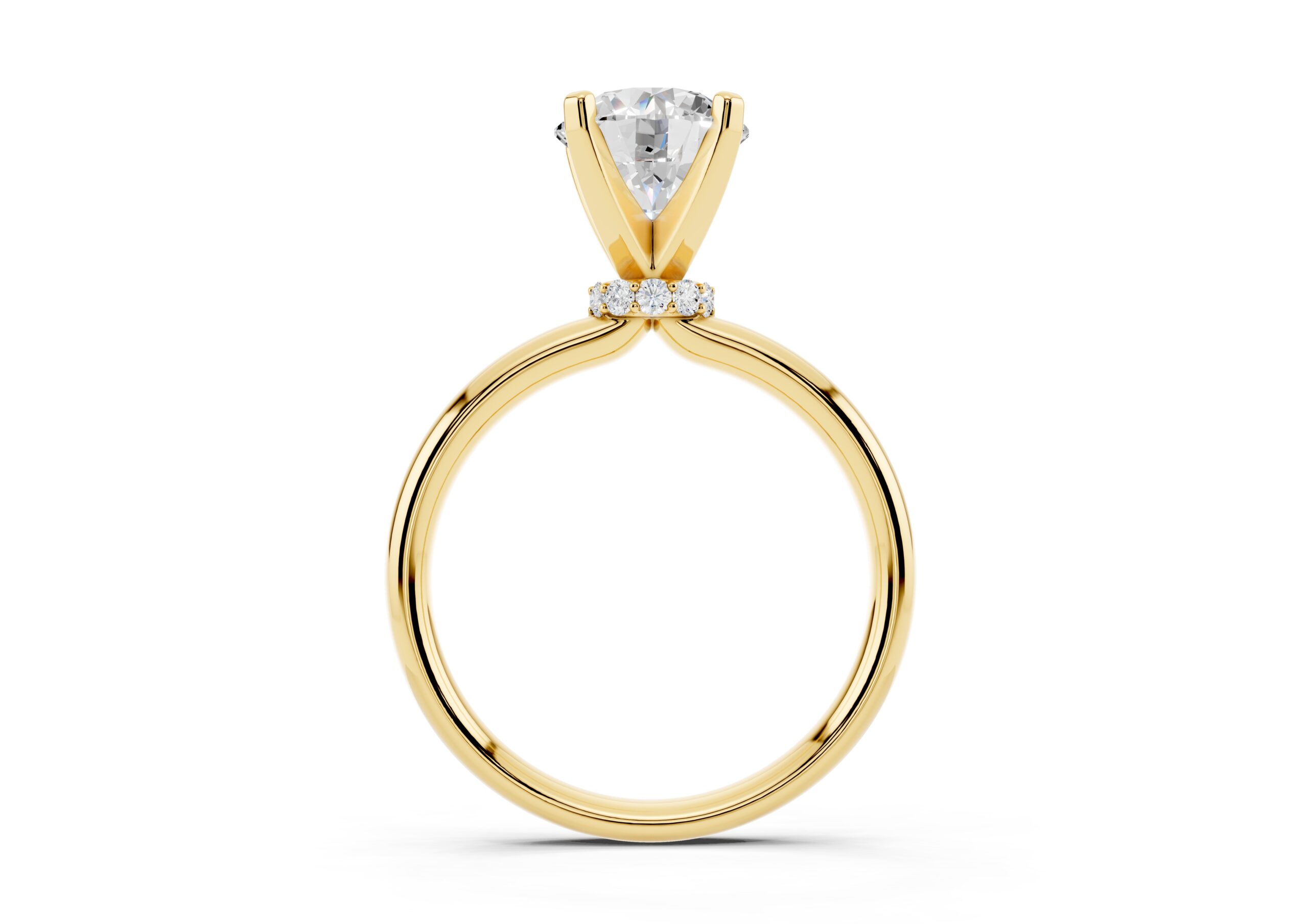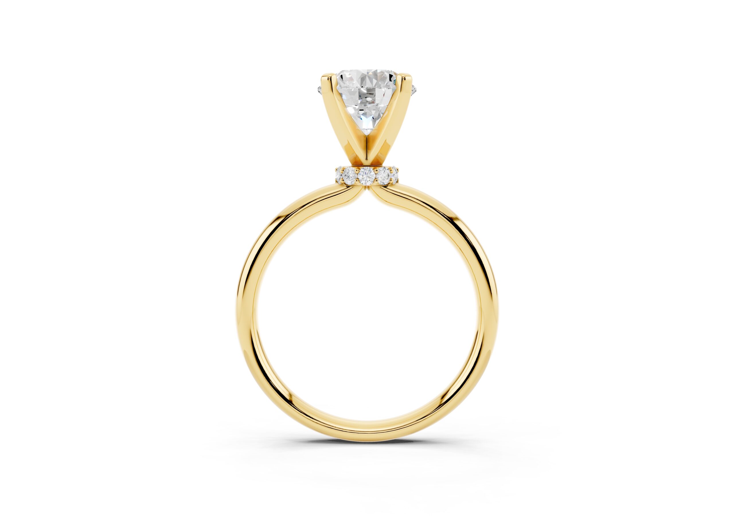 Elevated in its simplicity, the Ribbon Solitaire — White Edition — is a study in sculptural grace. The slender band curves gently like a ribbon, lifting a round brilliant diamond in a clean four-prong setting. Nestled just below, a hidden halo of pavé-set diamonds adds an intimate burst of shimmer that catches light with every movement. It’s a ring that feels as effortless as it is unforgettable.
