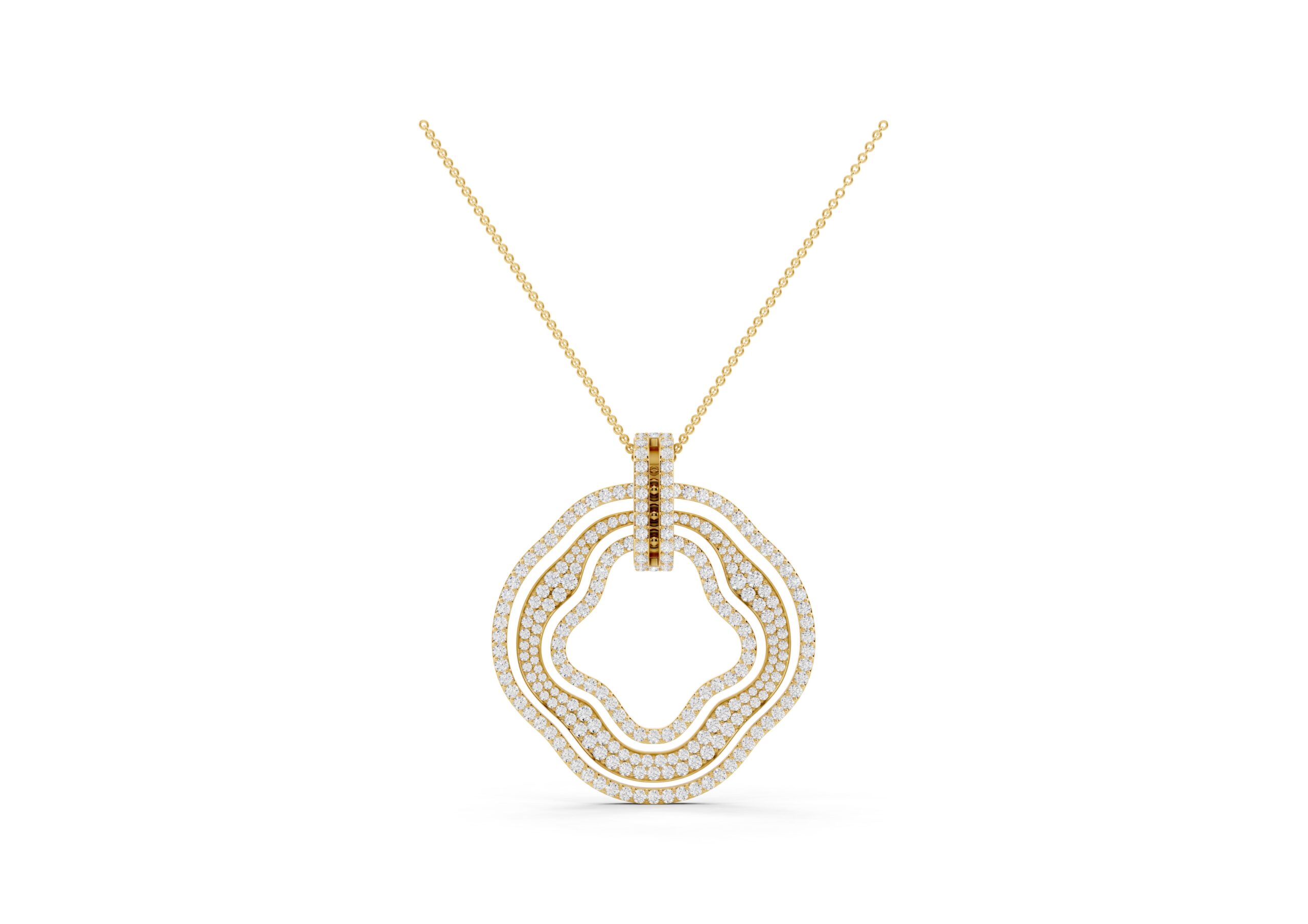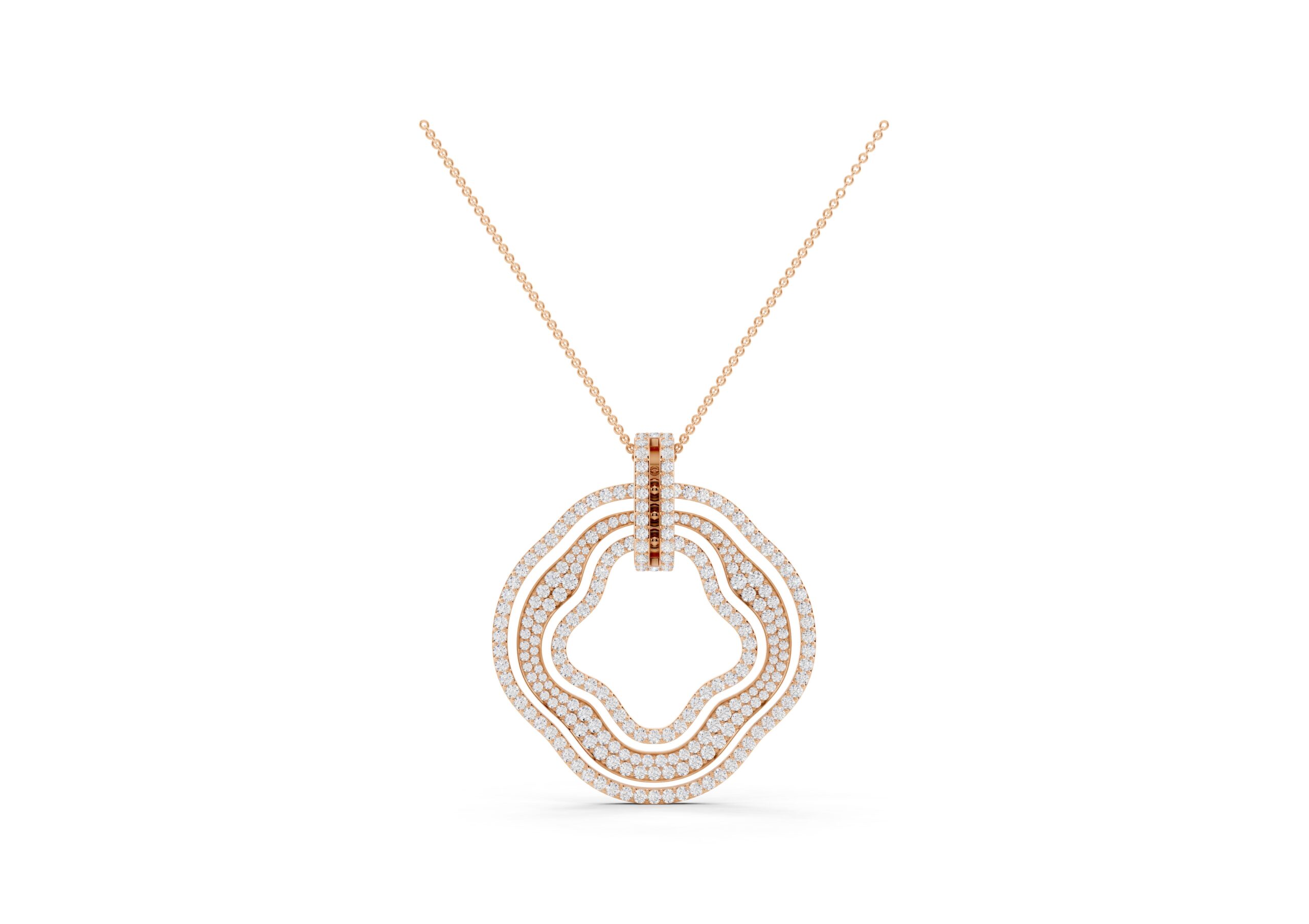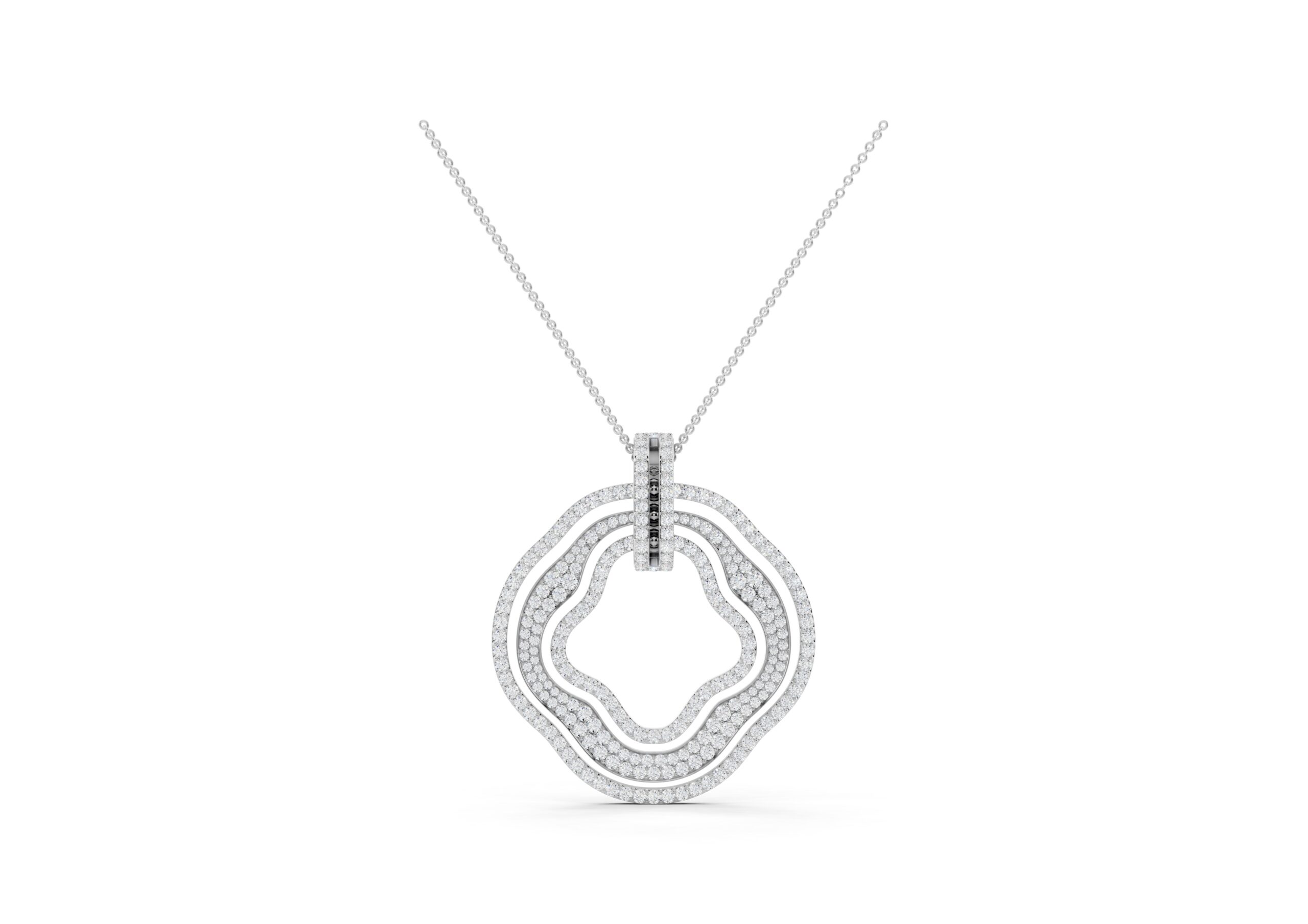 This pendant showcases a modern, abstract design featuring concentric, free-form rings, each encrusted with pavé-set stones for maximum sparkle. The rings are connected by a vertical bar detail, adding a structural element to the organic shape. It’s a statement piece that blends contemporary artistry with luxurious embellishment.