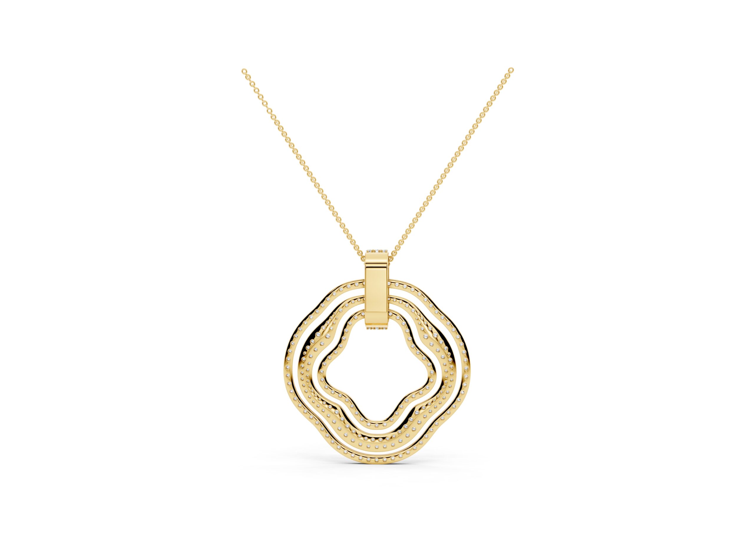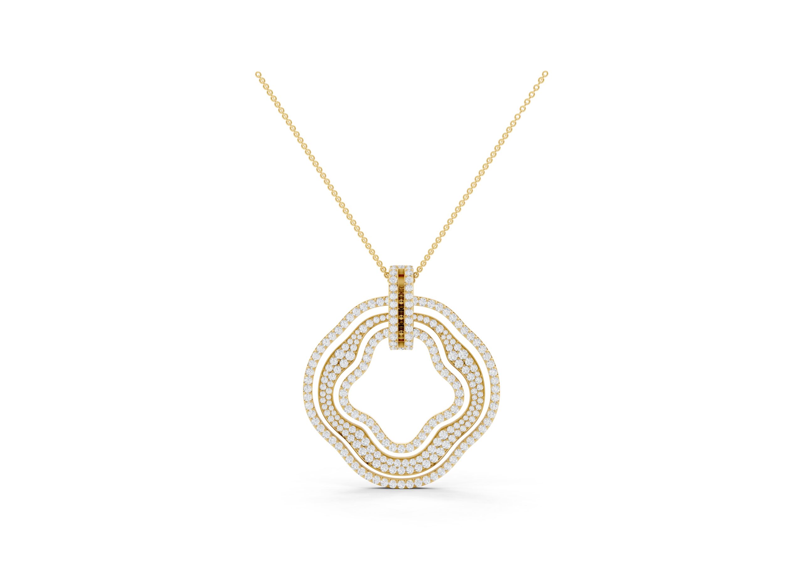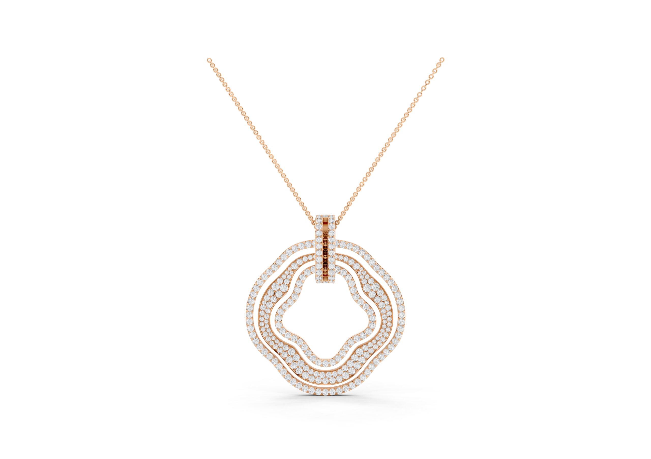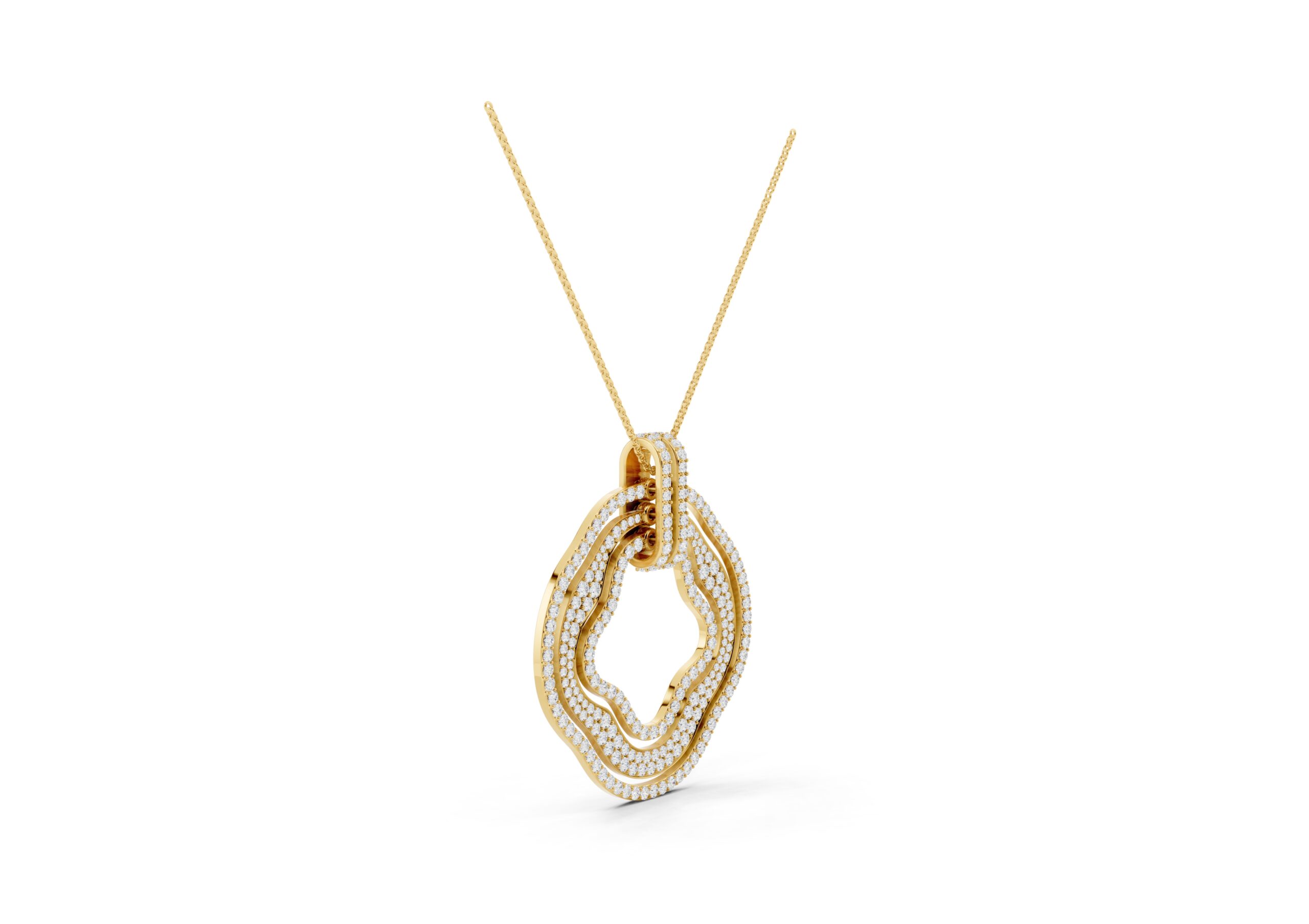 This pendant showcases a modern, abstract design featuring concentric, free-form rings, each encrusted with pavé-set stones for maximum sparkle. The rings are connected by a vertical bar detail, adding a structural element to the organic shape. It’s a statement piece that blends contemporary artistry with luxurious embellishment.